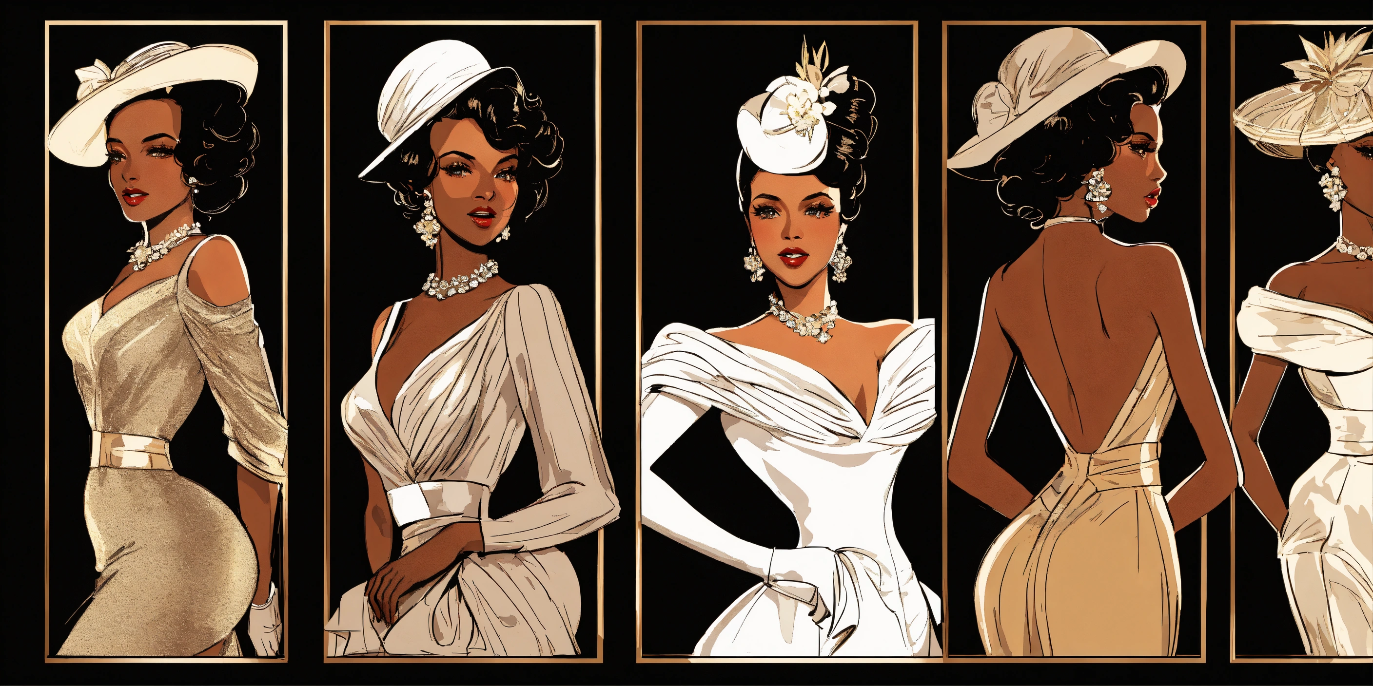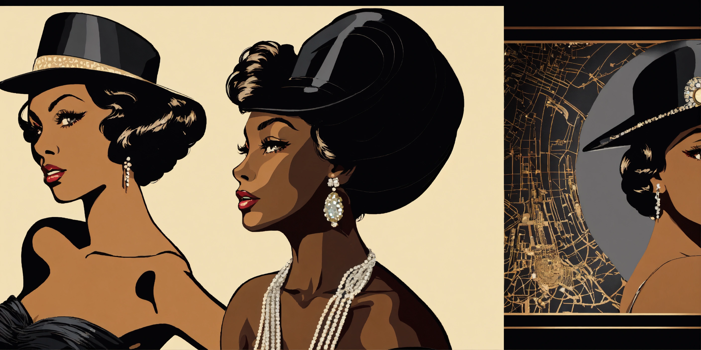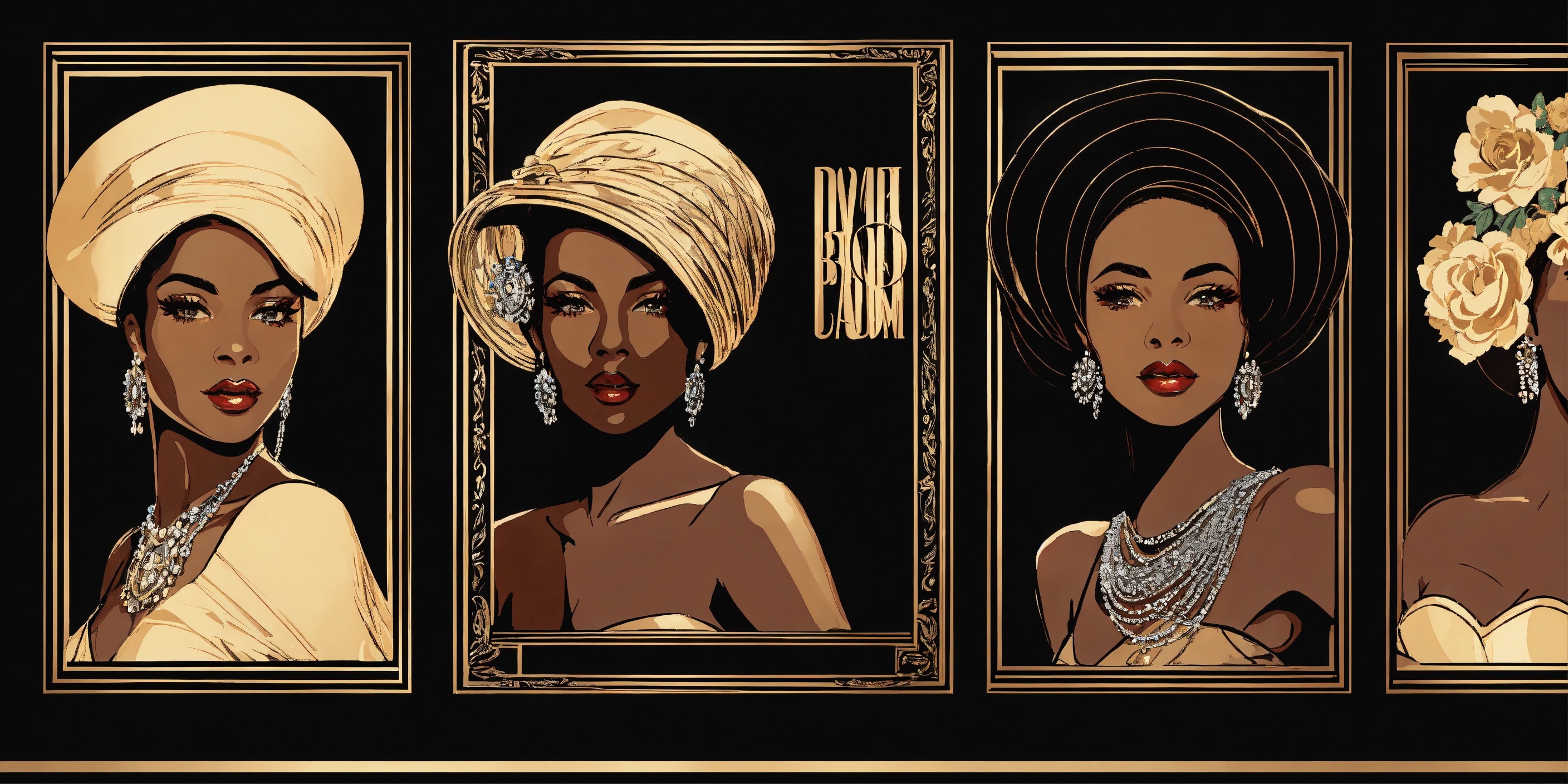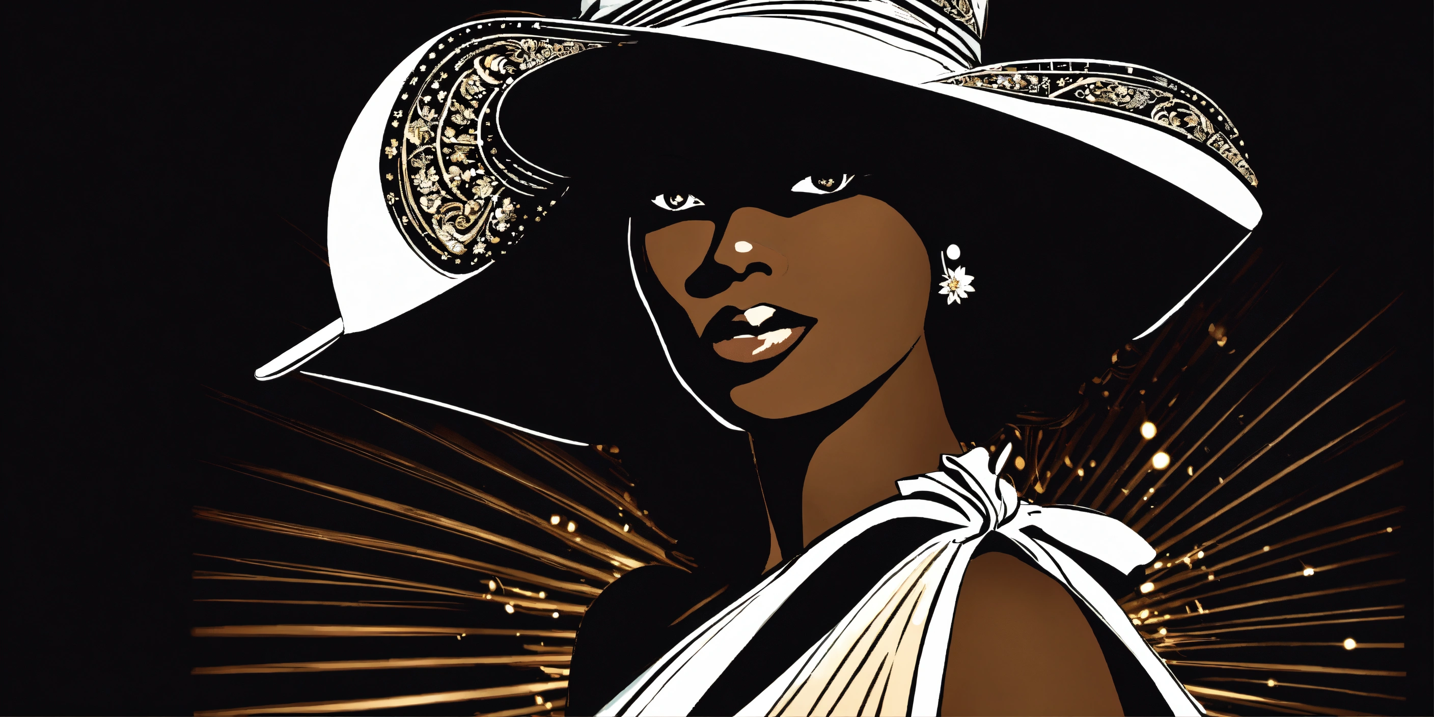 Vintage hollywood glamour black woman, old hollywood movie star attire and accessories, classic and glamorous, vintage spotlight lighting — t-shirt design graphic, vector, contour, black background.