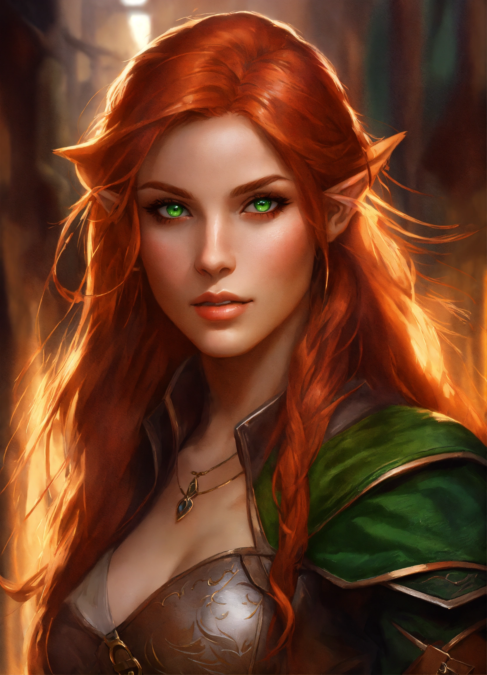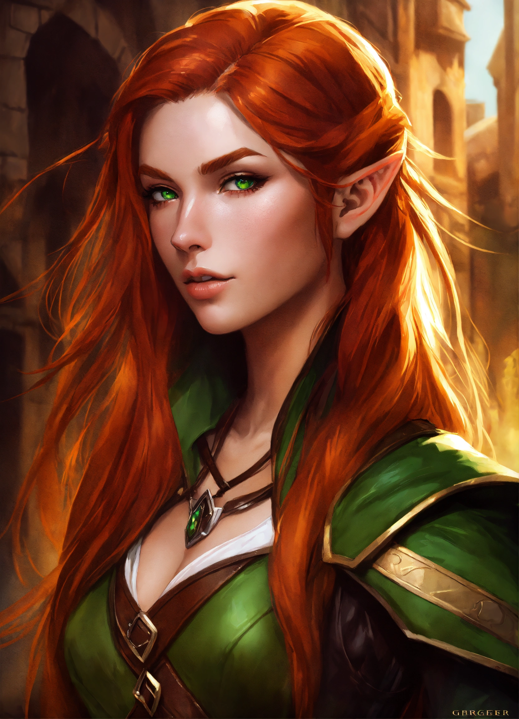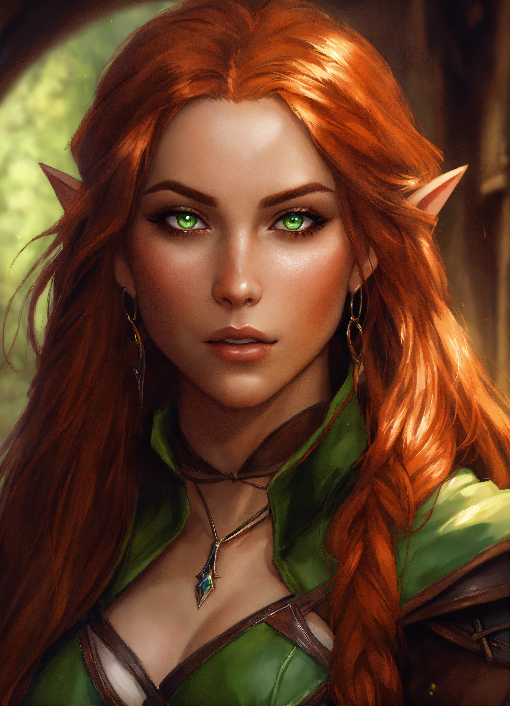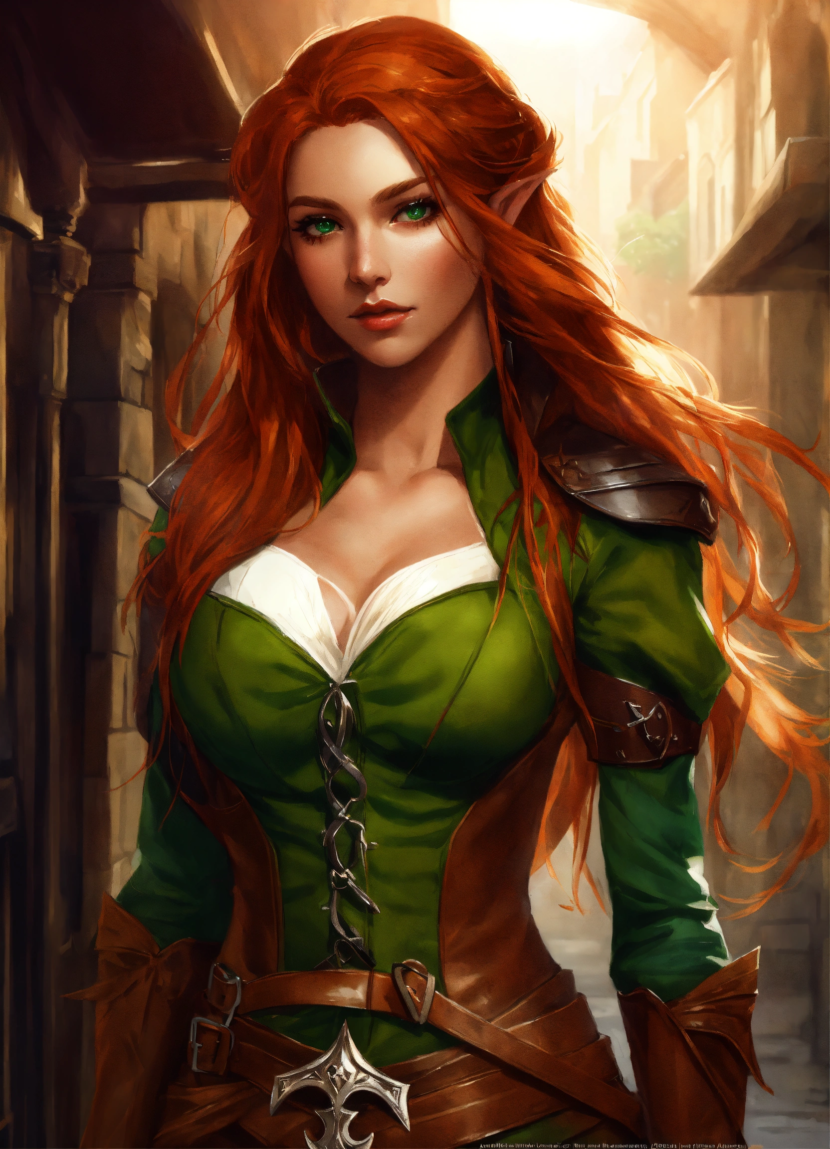 Portrait of a beautiful red haired elf rogue, long hair, concept art, dungeons and dragons, fantasy, in an alley, symmetrical face, attractive elf, green eyes, enchanting aura, digital art, wearing brown leather corset, assassin, medieval fantasy, art by artgerm, brown leathers, long elf ears, no shoulder guards