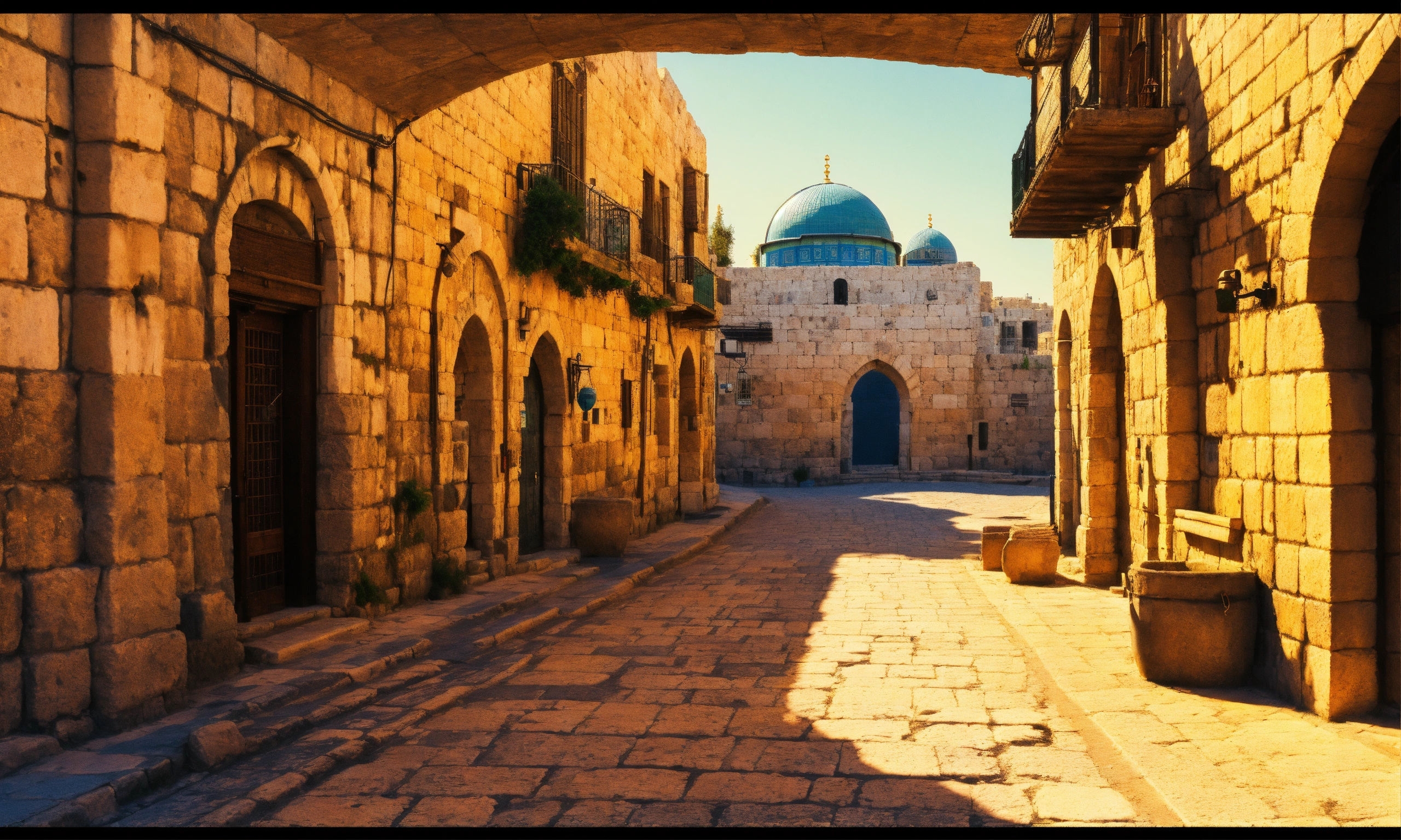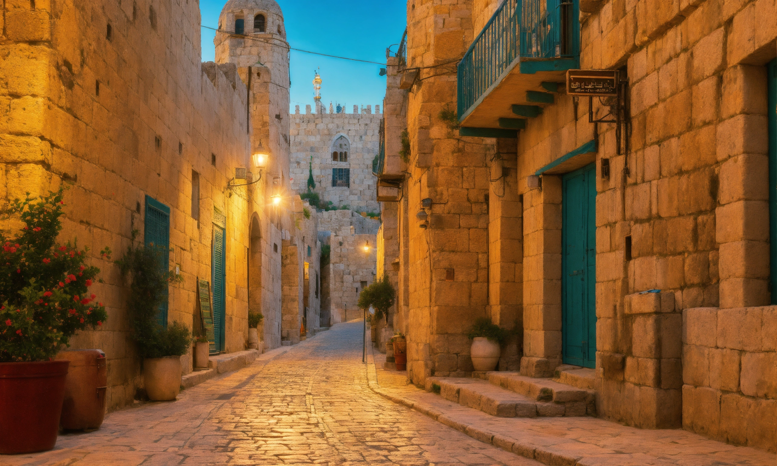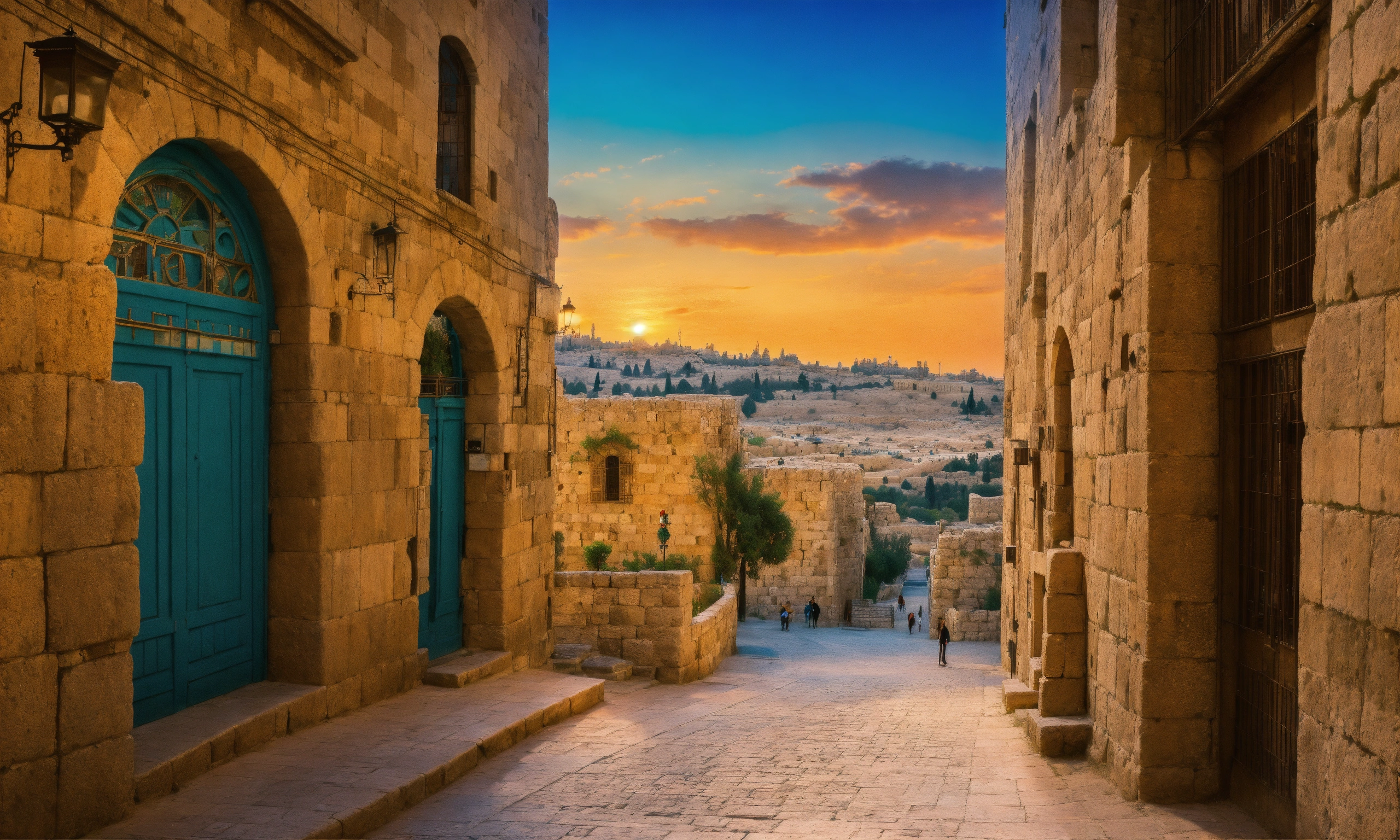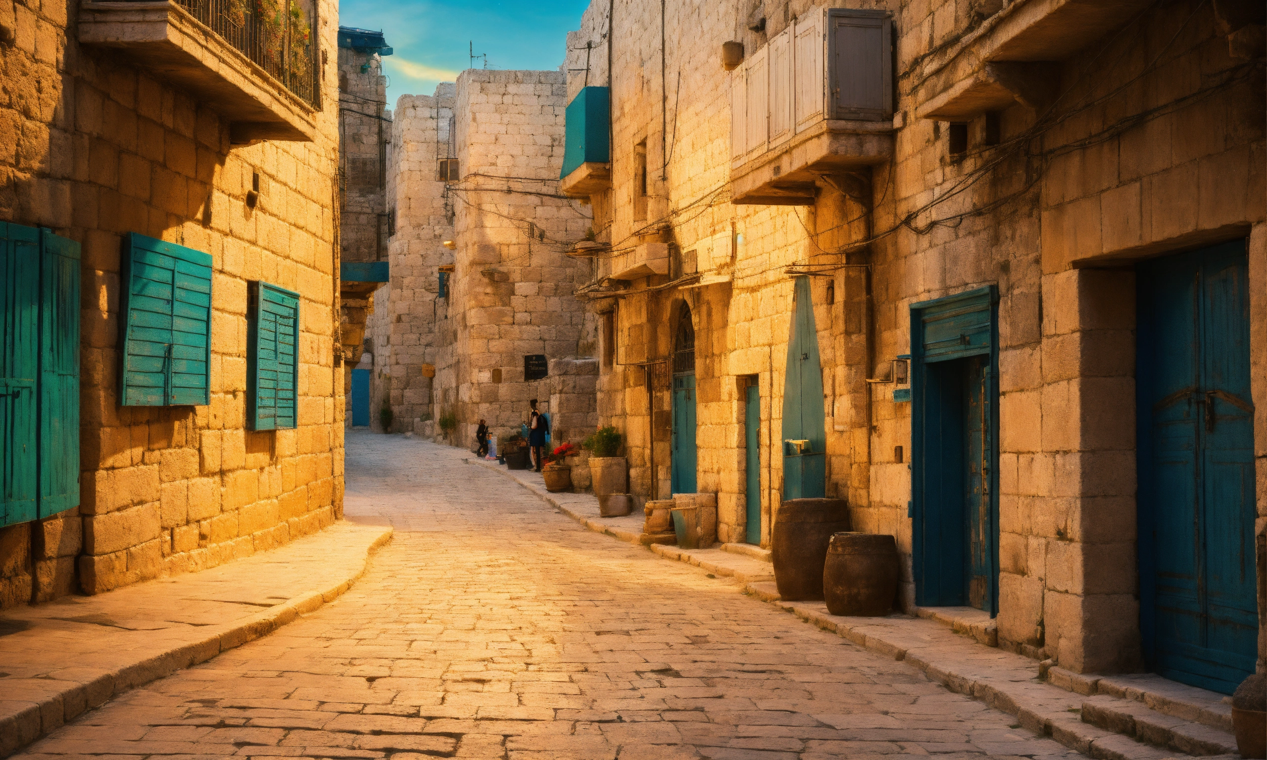 Jerusalem, 70 a.d., city street, street level view, close in view, vivid colors, picture quality; 16k resolution. evening time. blue sky with some teal.