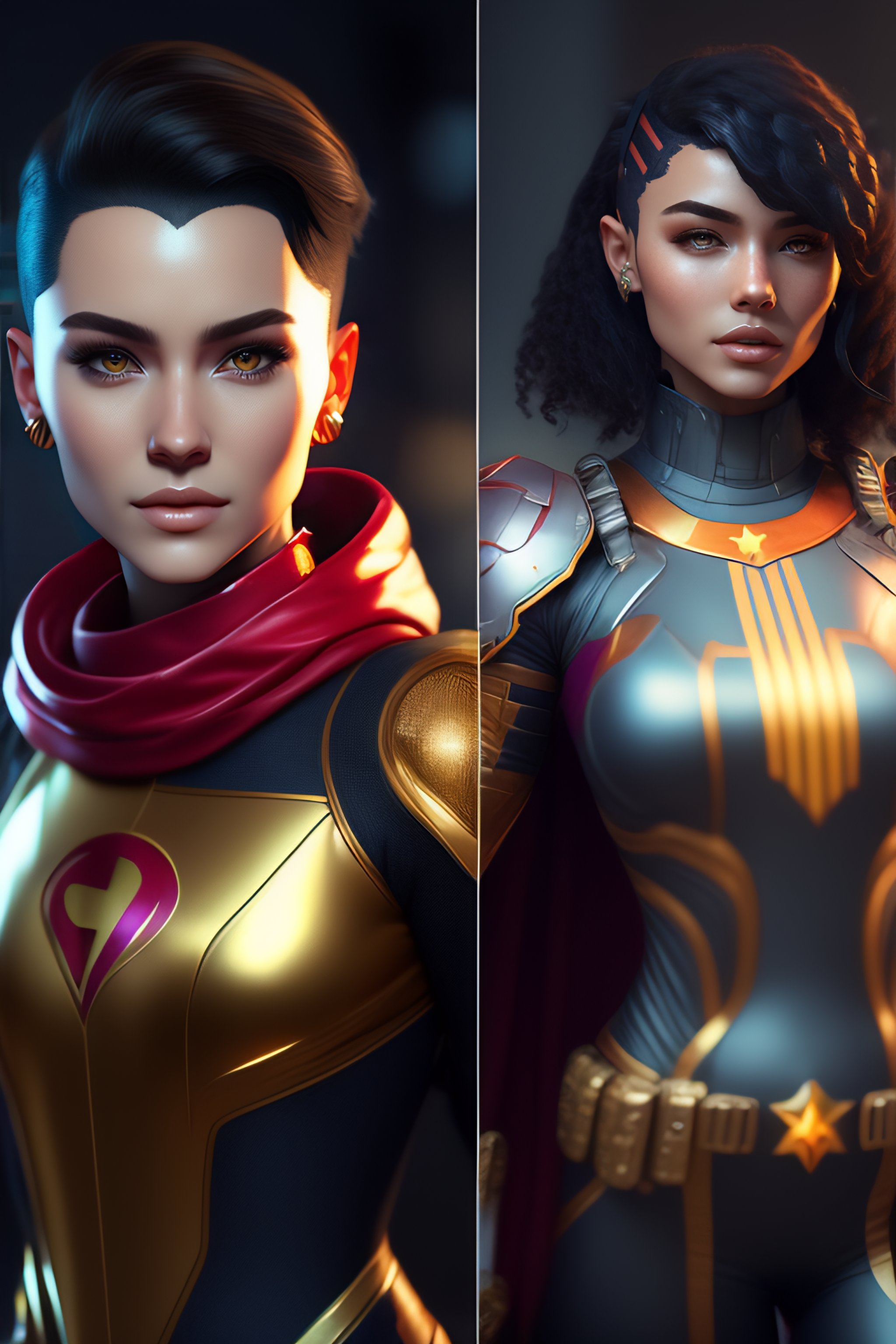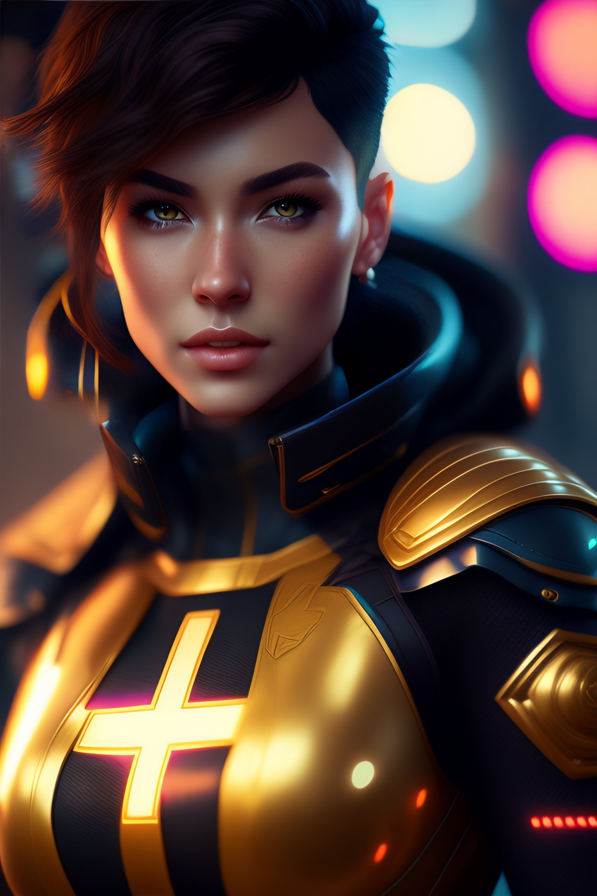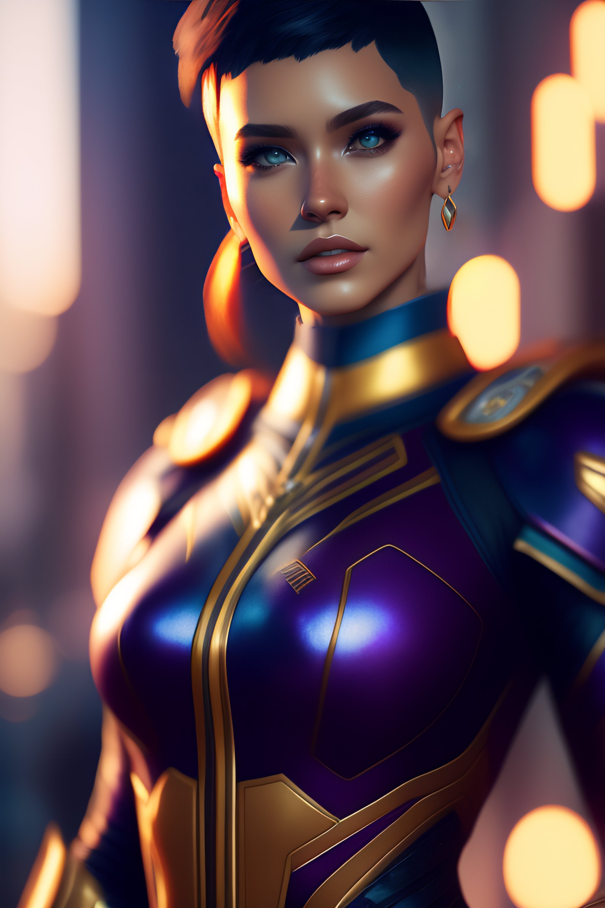 Superhero clothes with short hair girl, battle status, hyper detailed, digital art, cyberpunk style, cybercinematic lighting, studio quality, smooth render, unreal engine 5 rendered, octane rendered, art style by klimt and nixeu and ian sprigger and wlop and krenz cushart