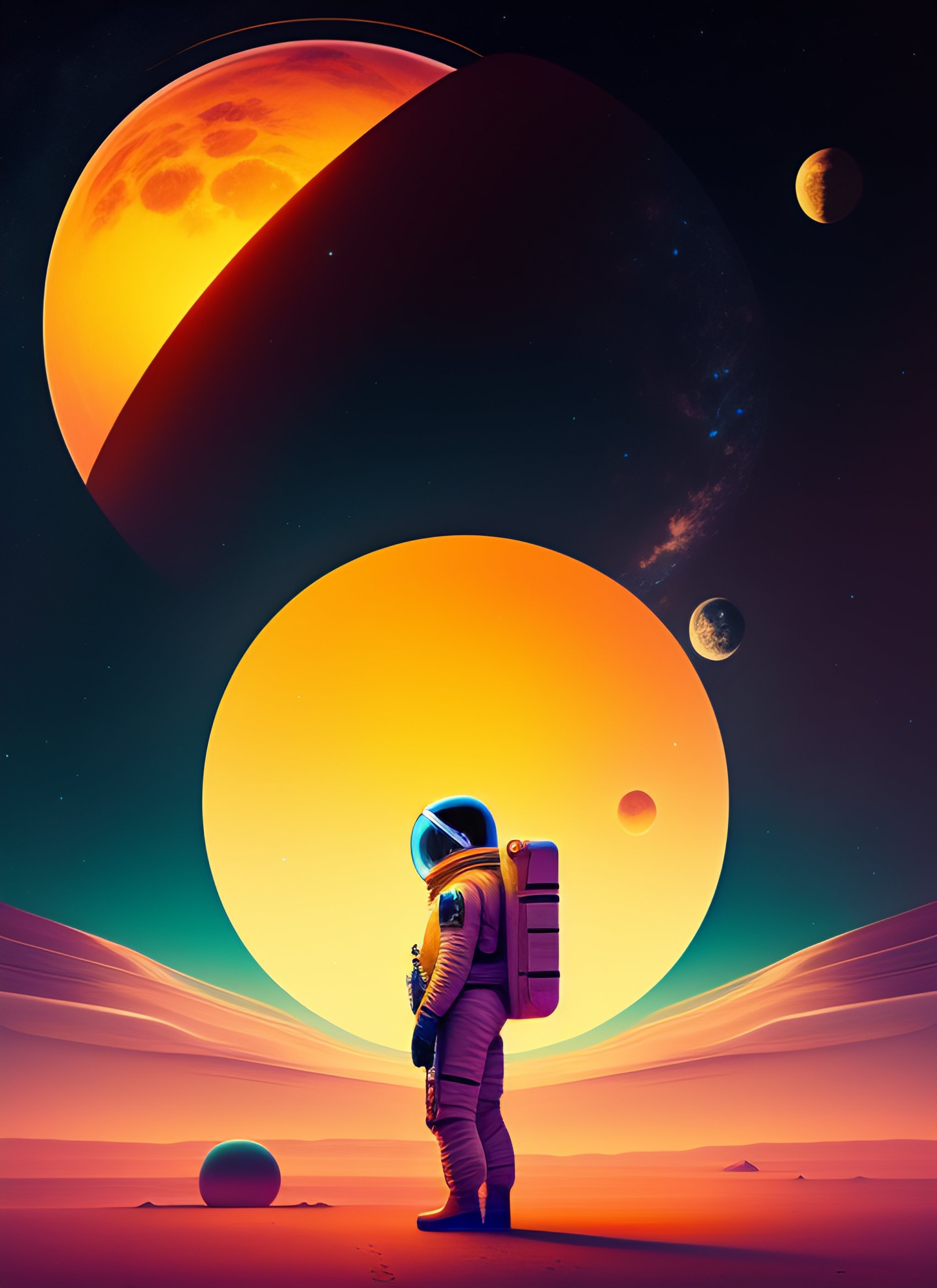 Portrait a lost astronaut in jupiter, epic scene, displaying in the background the moon and other planets and stars, kilian eng vibrant colours, dynamic lighting, digital art, winning award masterpiece, fantastically beautiful, illustration, aesthetically, trending on artstation, art by zdzisław beksiński x jean michel basquiat