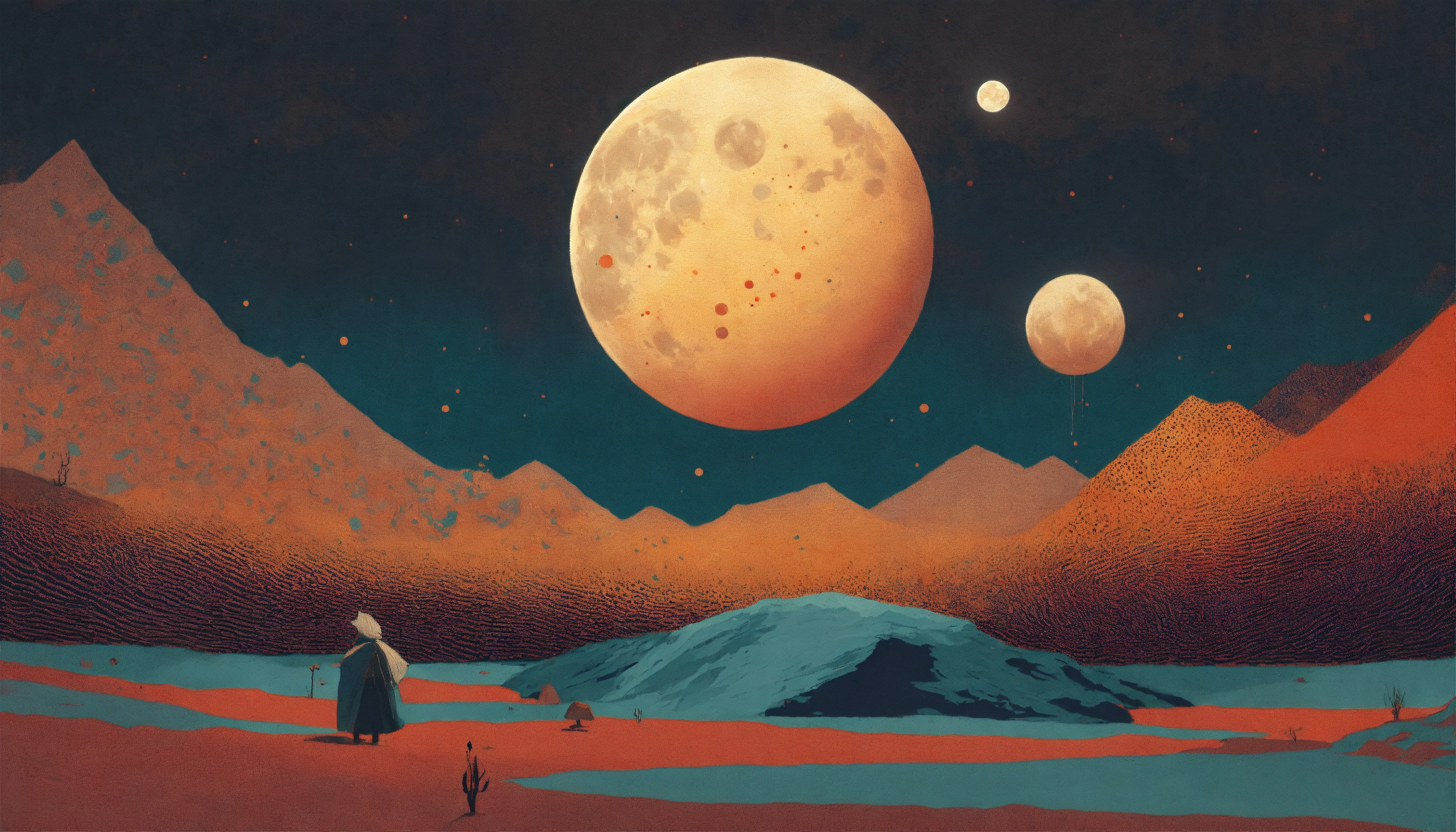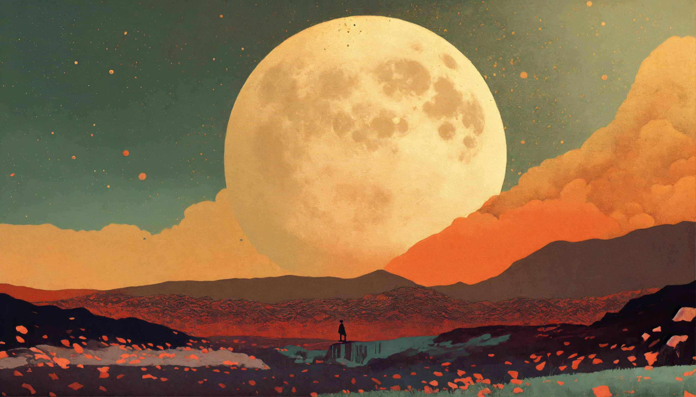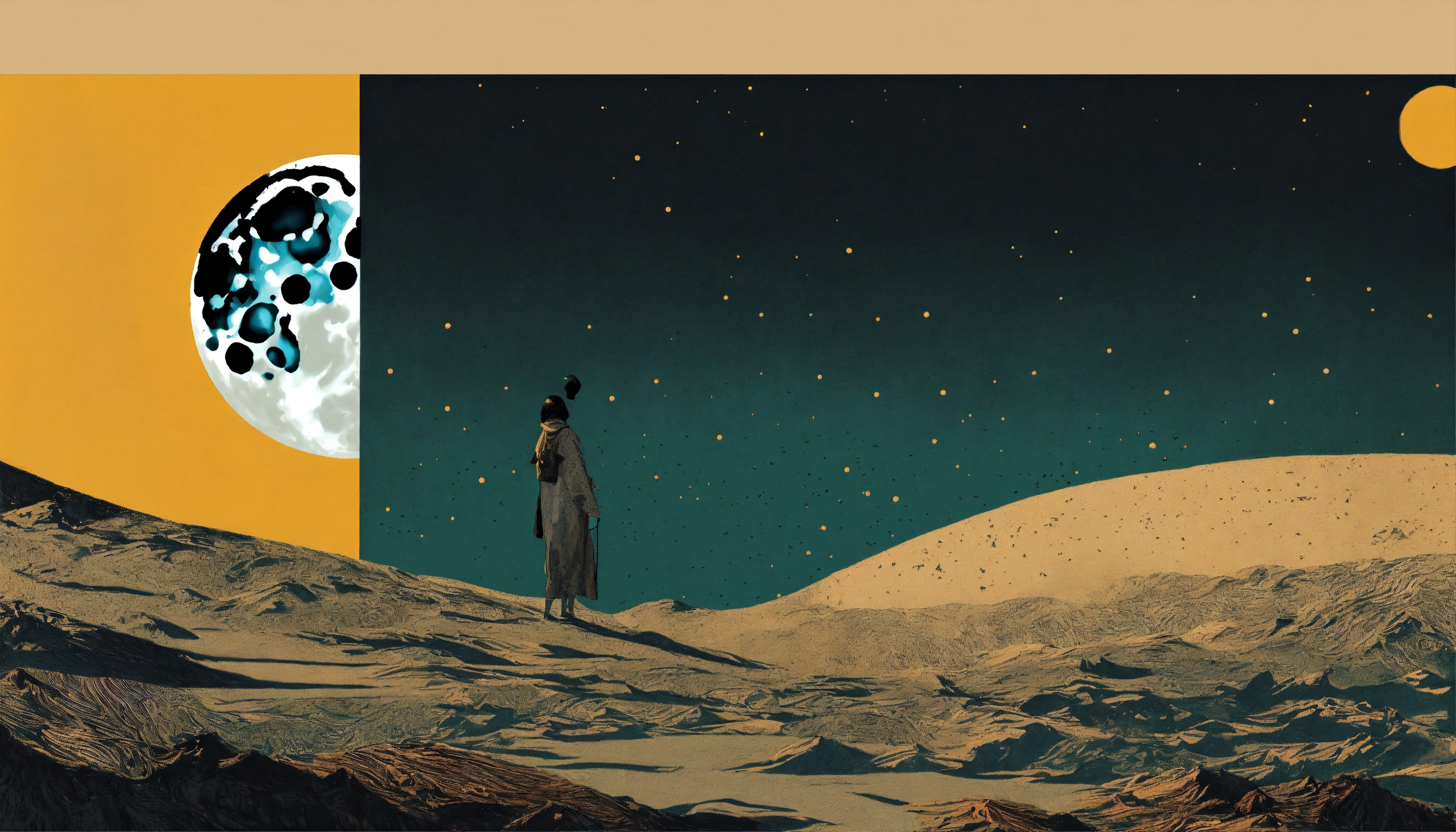 Moon profile + halftone pattern + editorial illustration of the memento morti + higly textured, genre defining mixed media collage painting + fringe absurdism + award winning halftone pattern illustration + simple flowing shapes + subtle shadows + paper texture + minimalist color scheme + inspired by zdzisław beksiński.