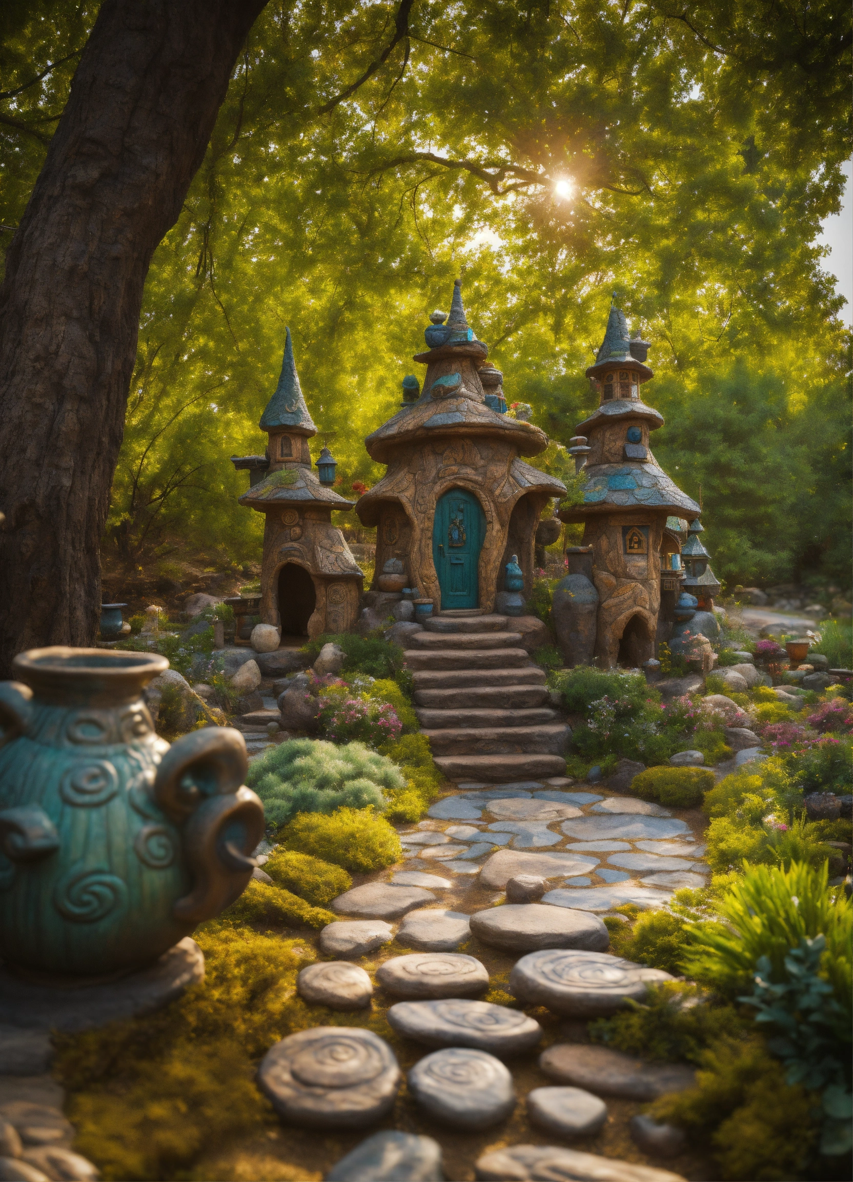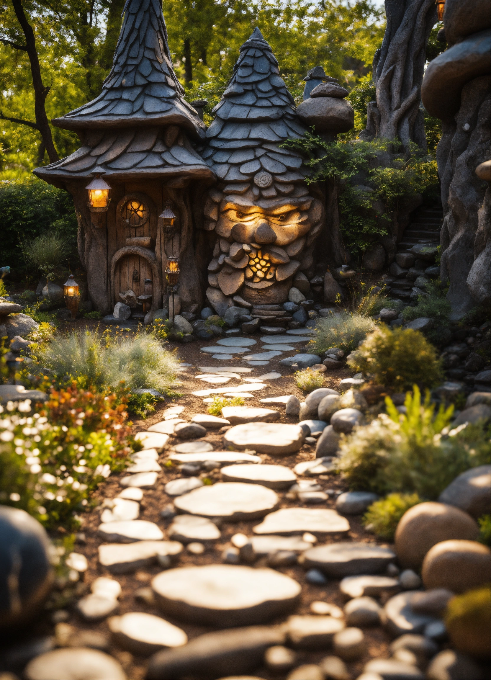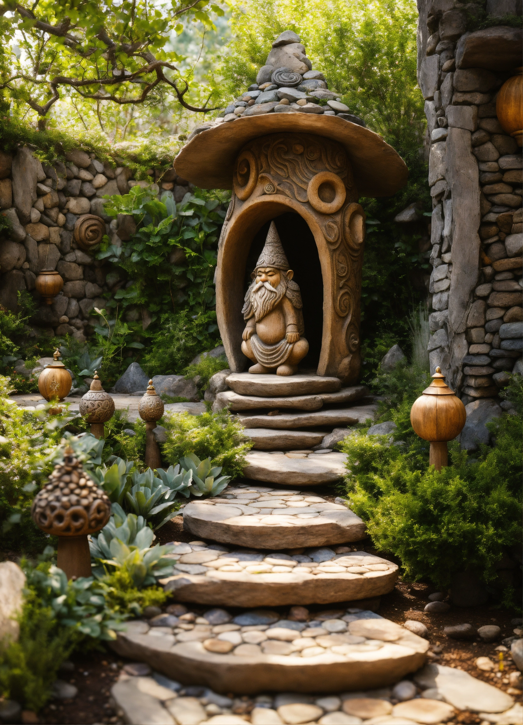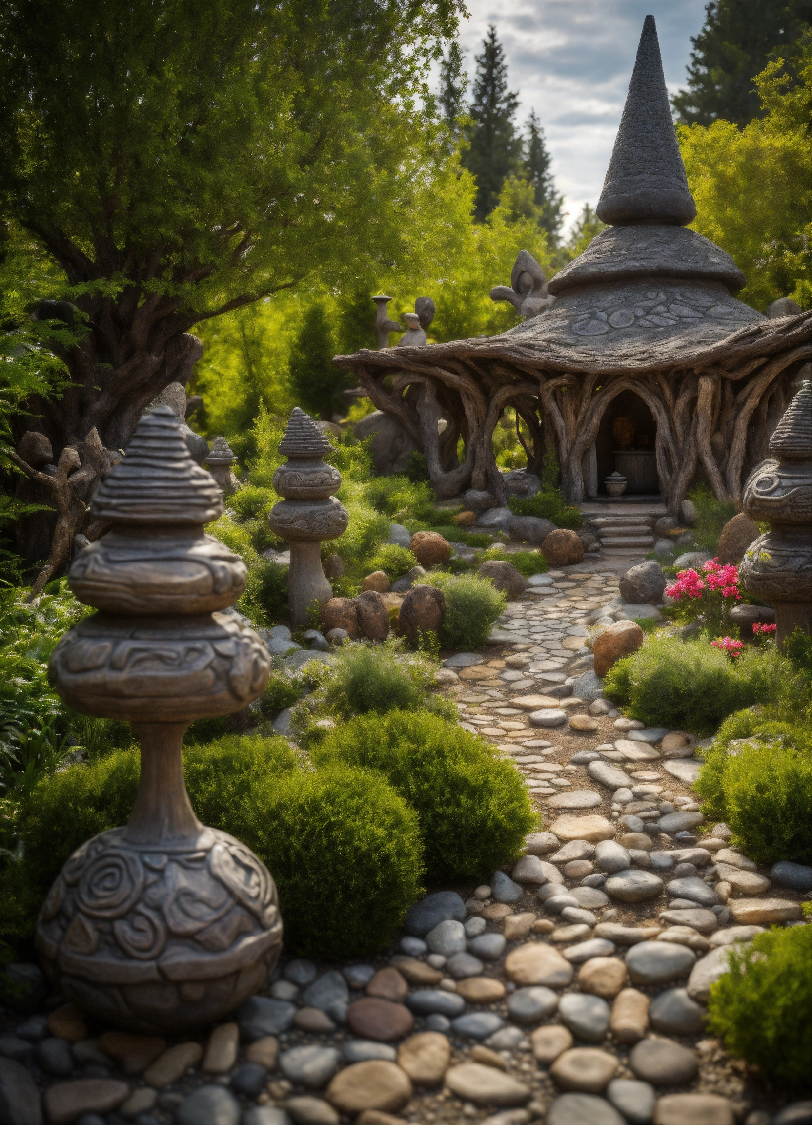 An ancient spiritual gnomes stone pathway rock garden.sculptured . style of alex grey, giger.unreal engine.totem sculptures.swirling patterned stone pathway courtyard.wood.stone.driftwood.statues. artistic sculpture.lanterns.air bnb tiny house