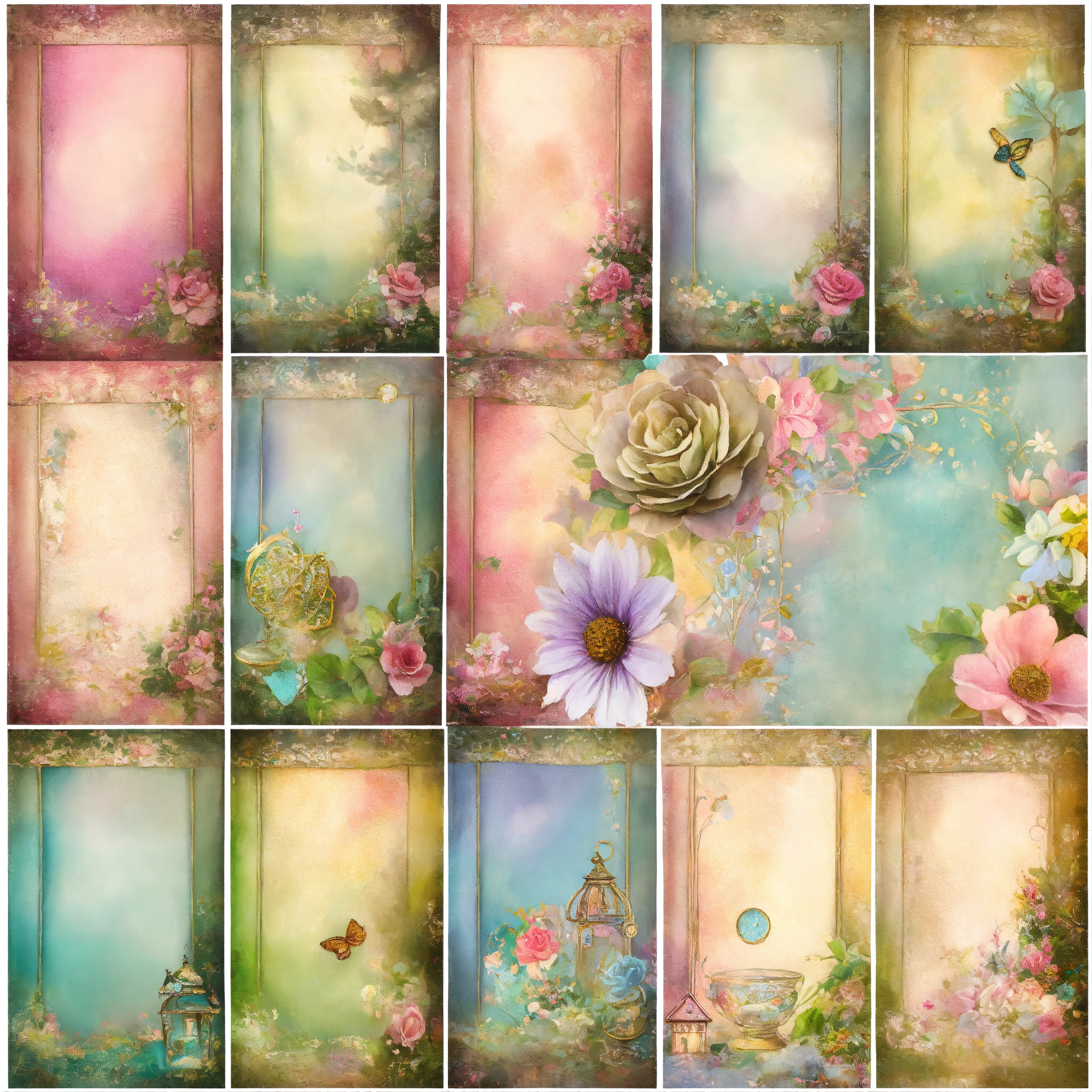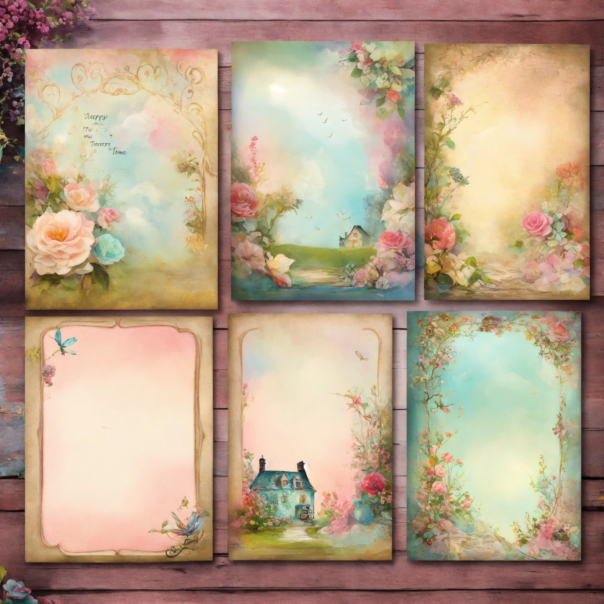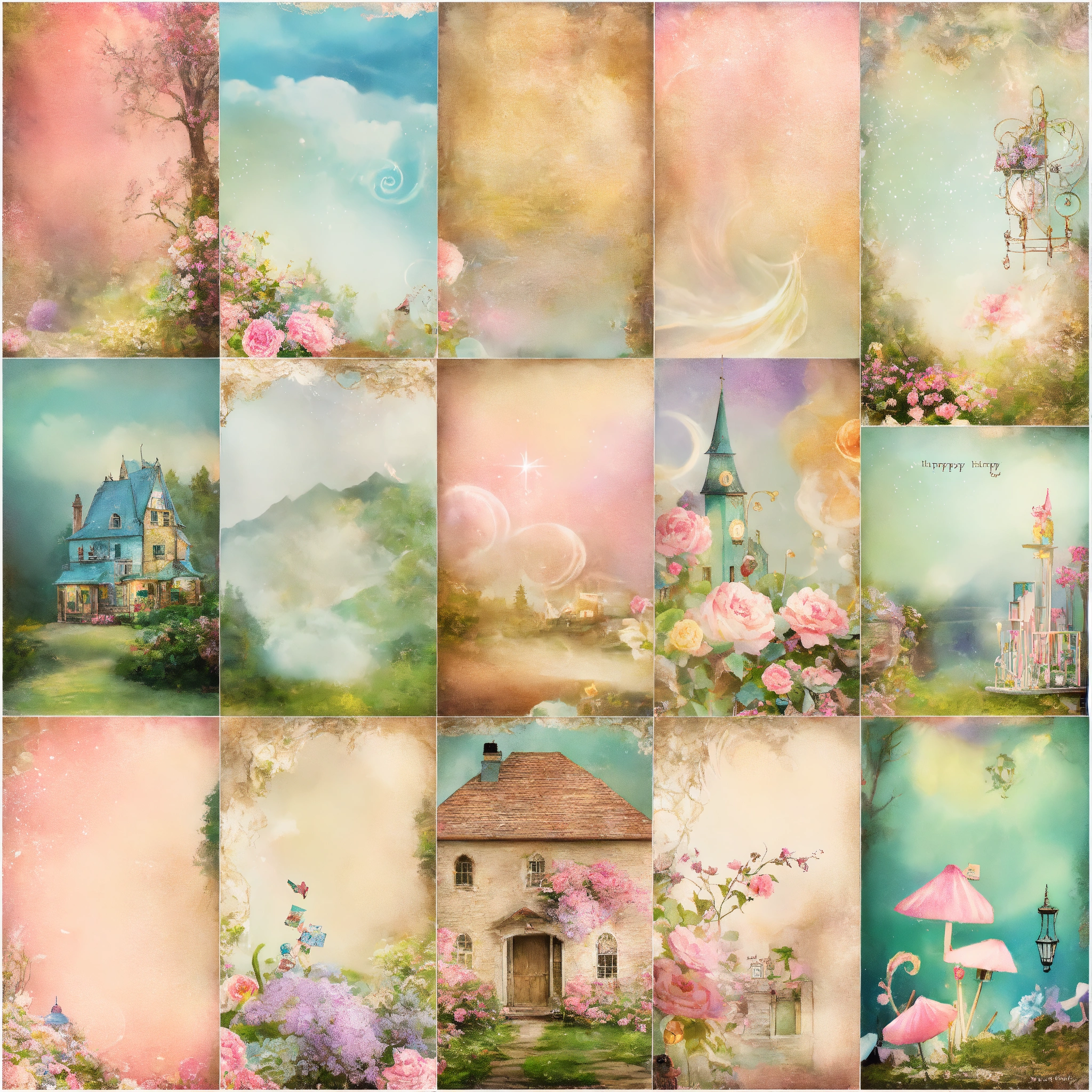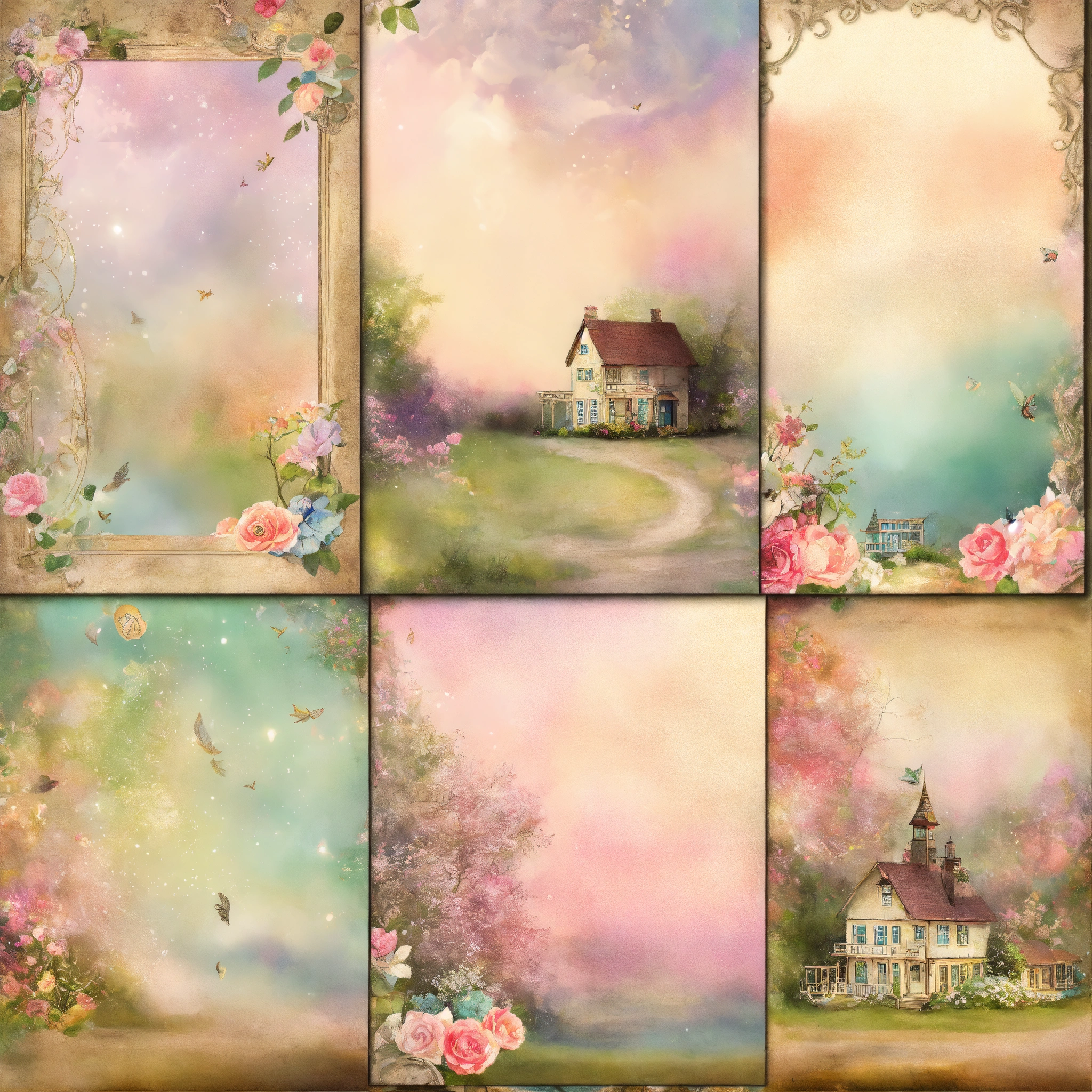 Shabby chic dreamy mist pastel junk journals fantasy magical fairytale happy time, happy place, new home, new house, house sold, housesale, journaling paper printable collage sheet swirling magical fairytale abstract art style