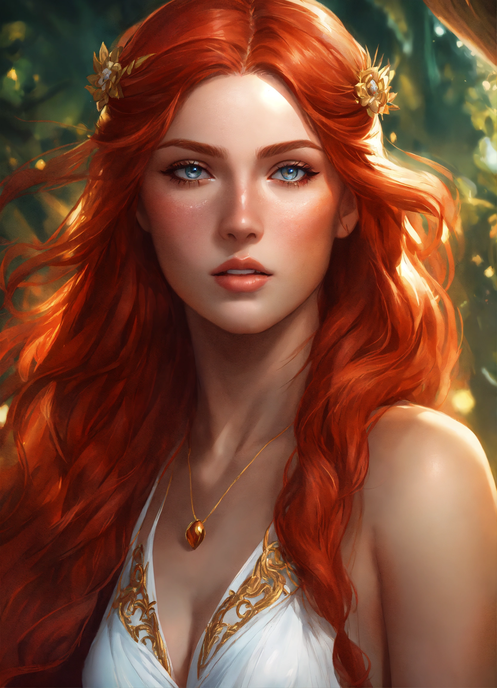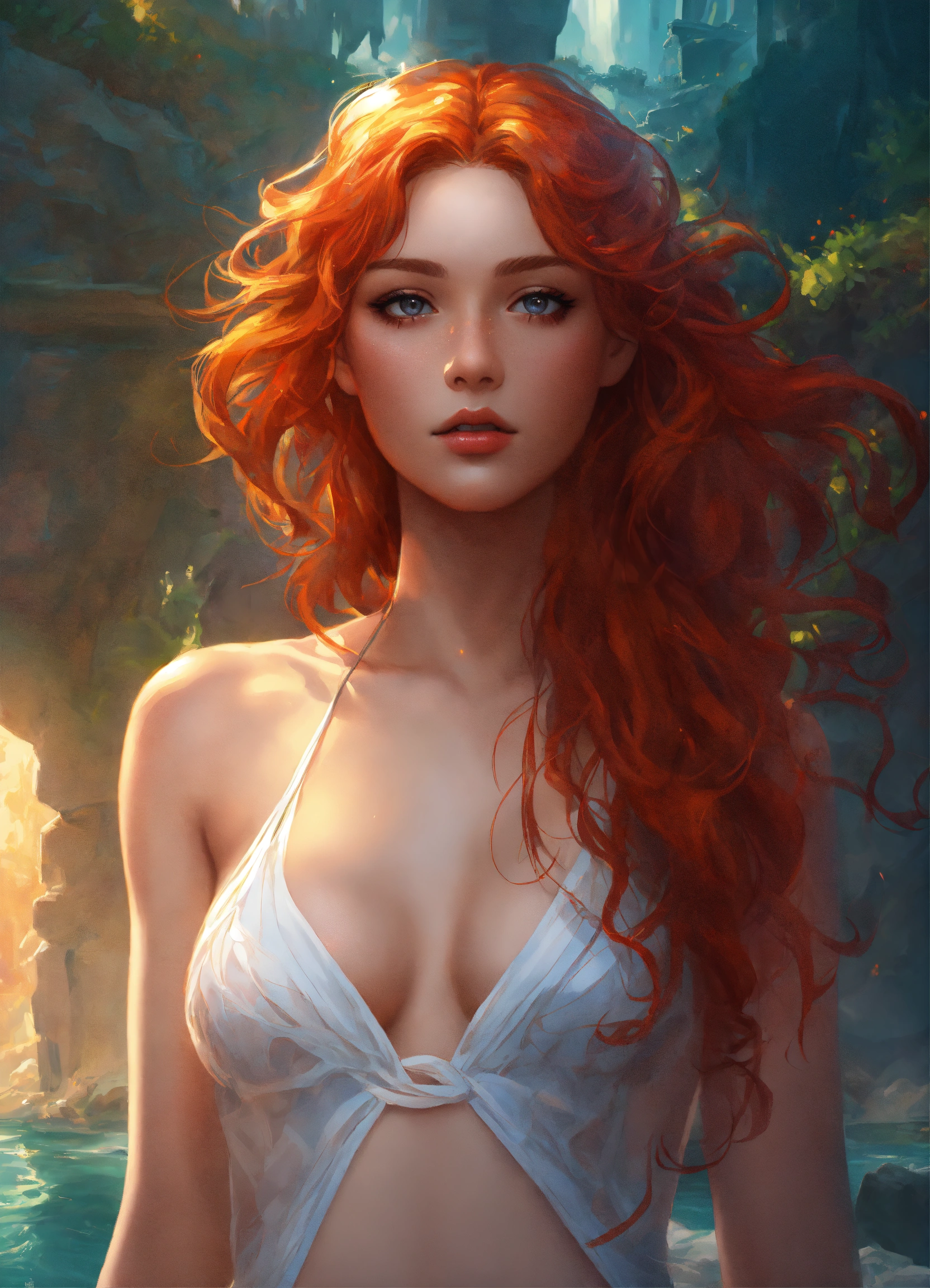 Ultra realistic illustration of mythological greek goddess with red hair, beautiful girl in magical white swimsuit, detailed face, fantasy art, artgerm style, illustration, epic, fantasy, tangled, hyperdetailed, artstation, concept art, smooth, sharp focus, trace rays, full height