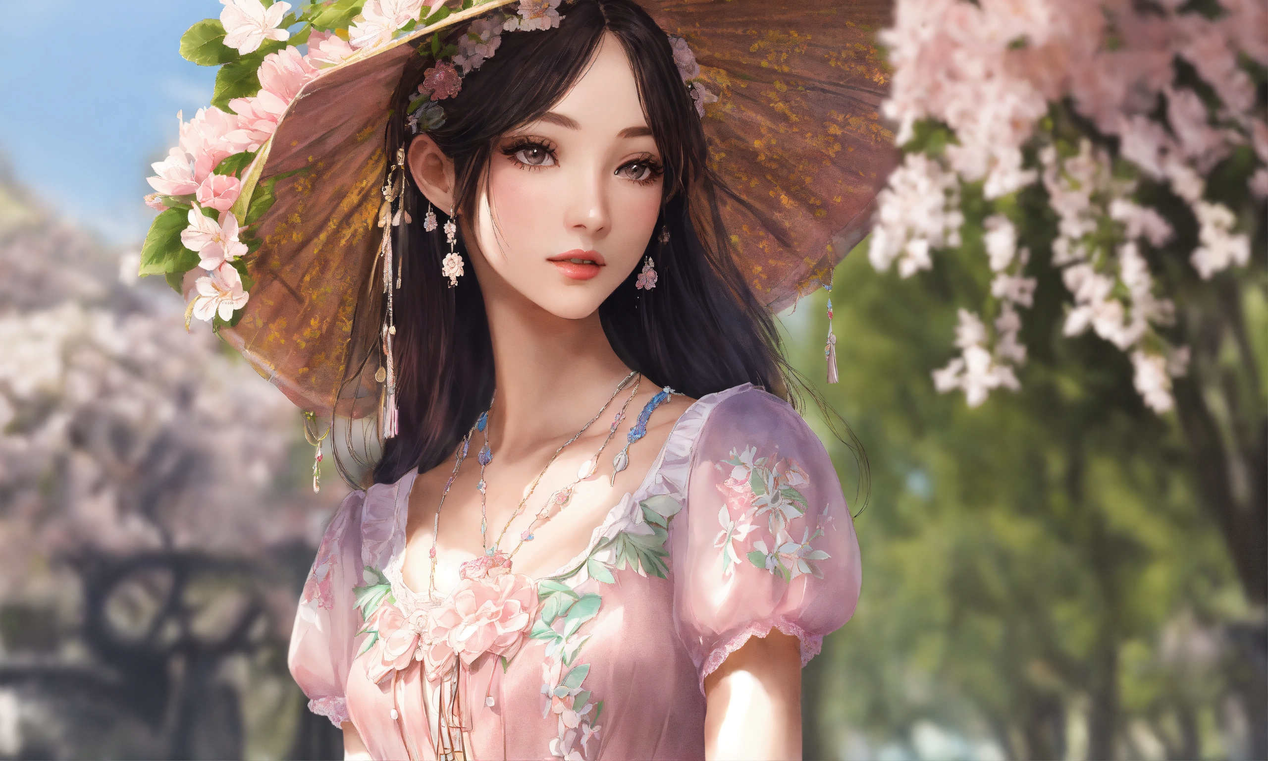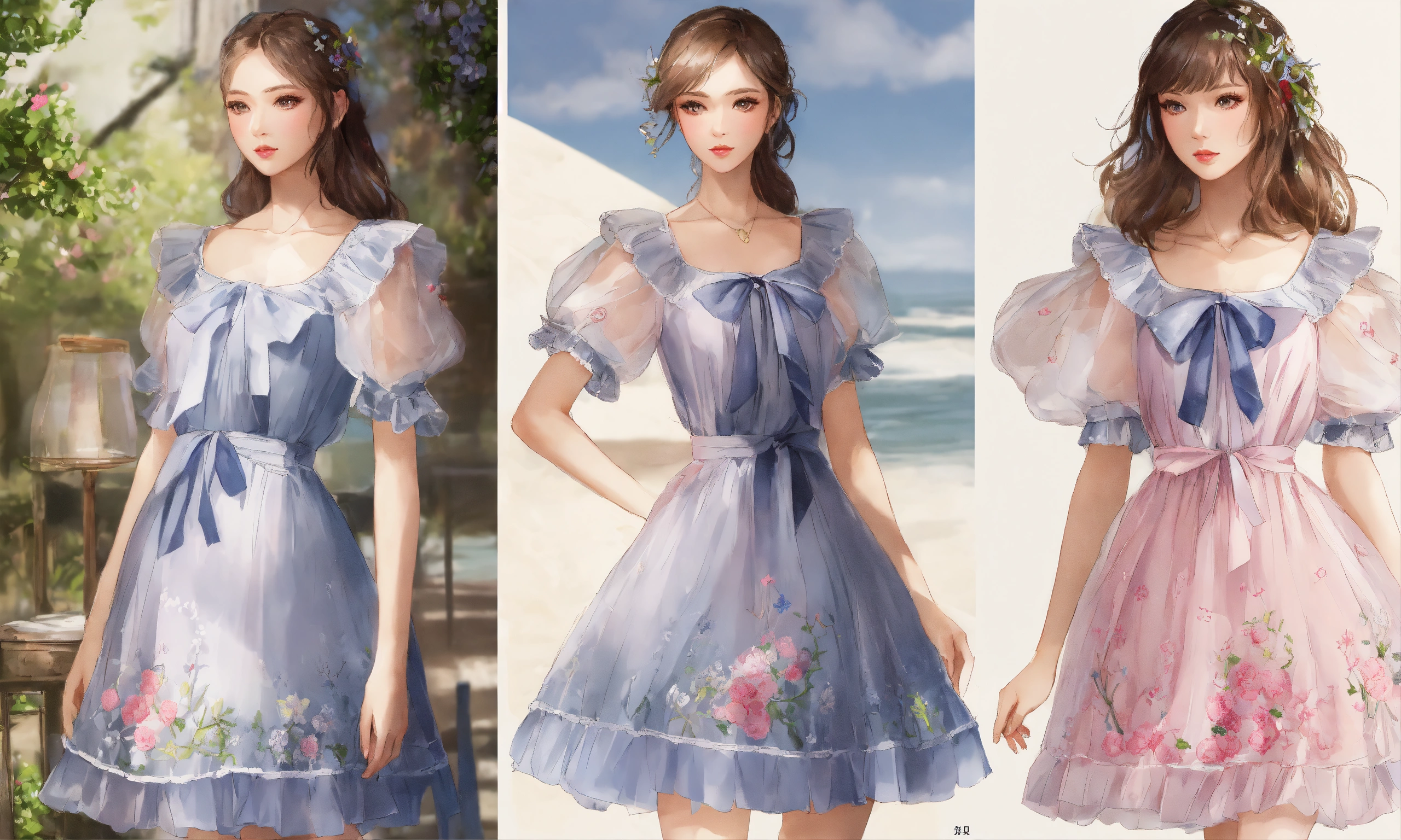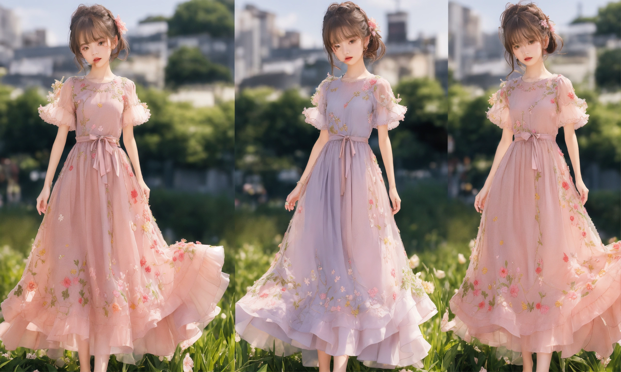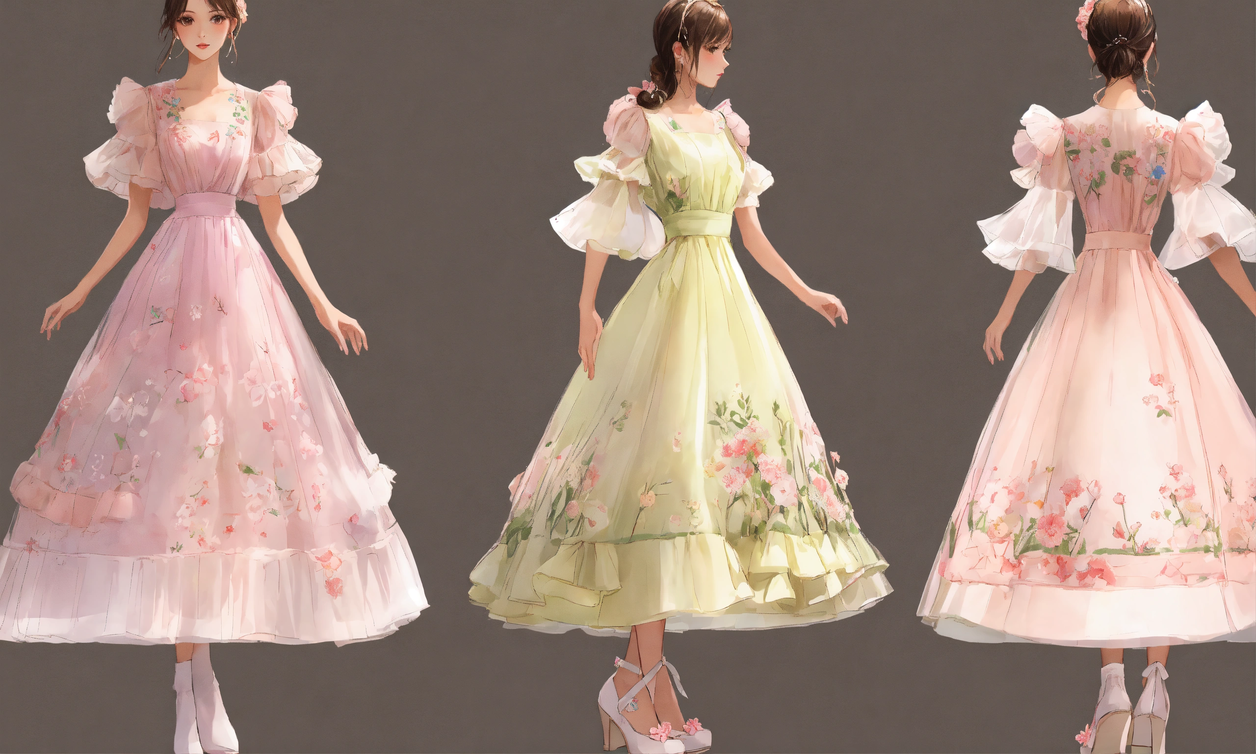 Illustrate a pretty spring dress knee length, with short embroidered sleeves and a flowy skirt. illustrate dress with organdy, embroidery, and ruffles. 2023 fashion. photorealistic full-length. fashion plate harajuku