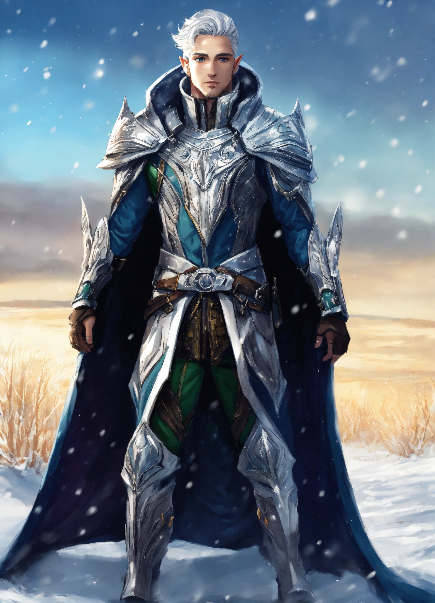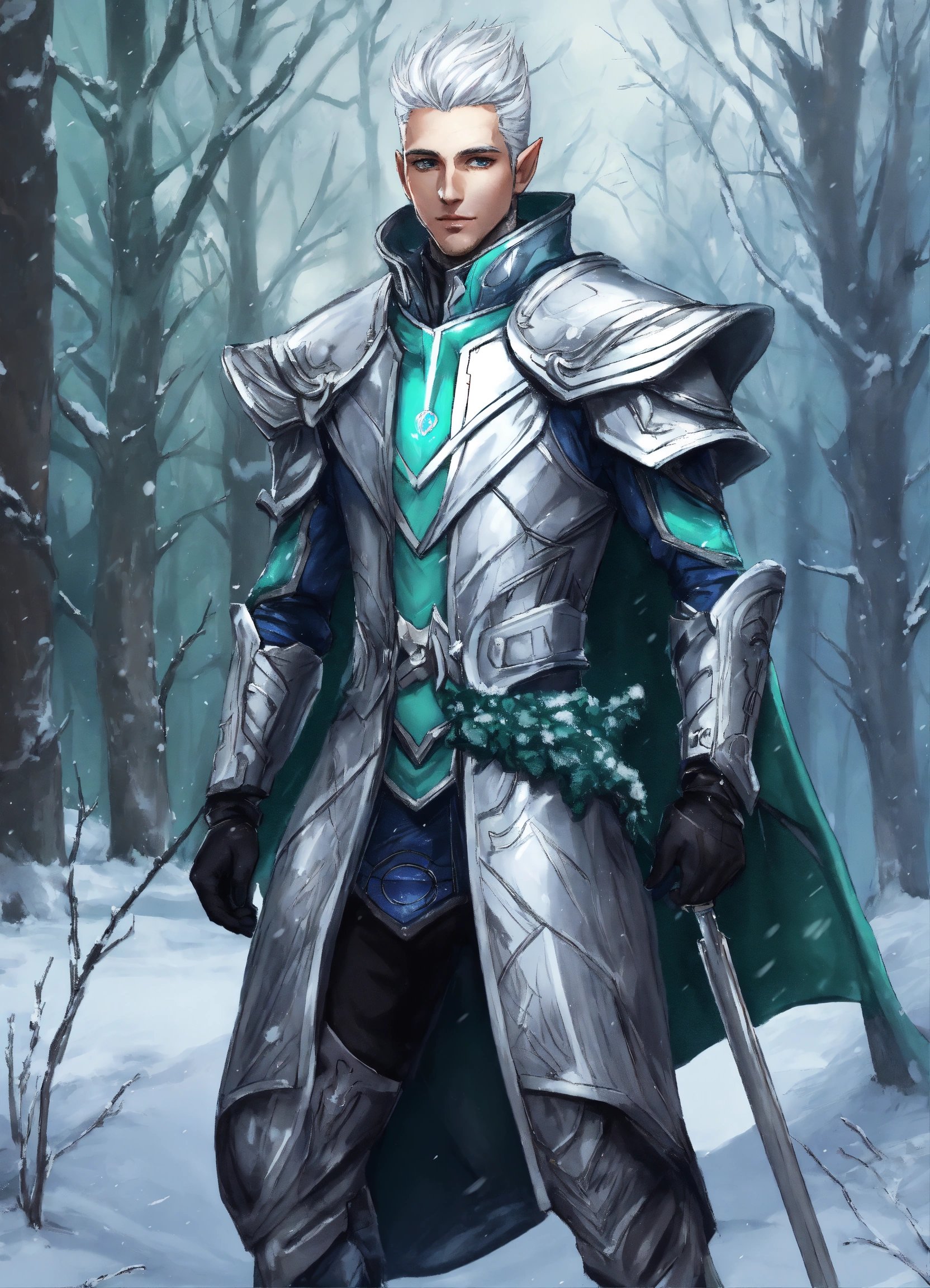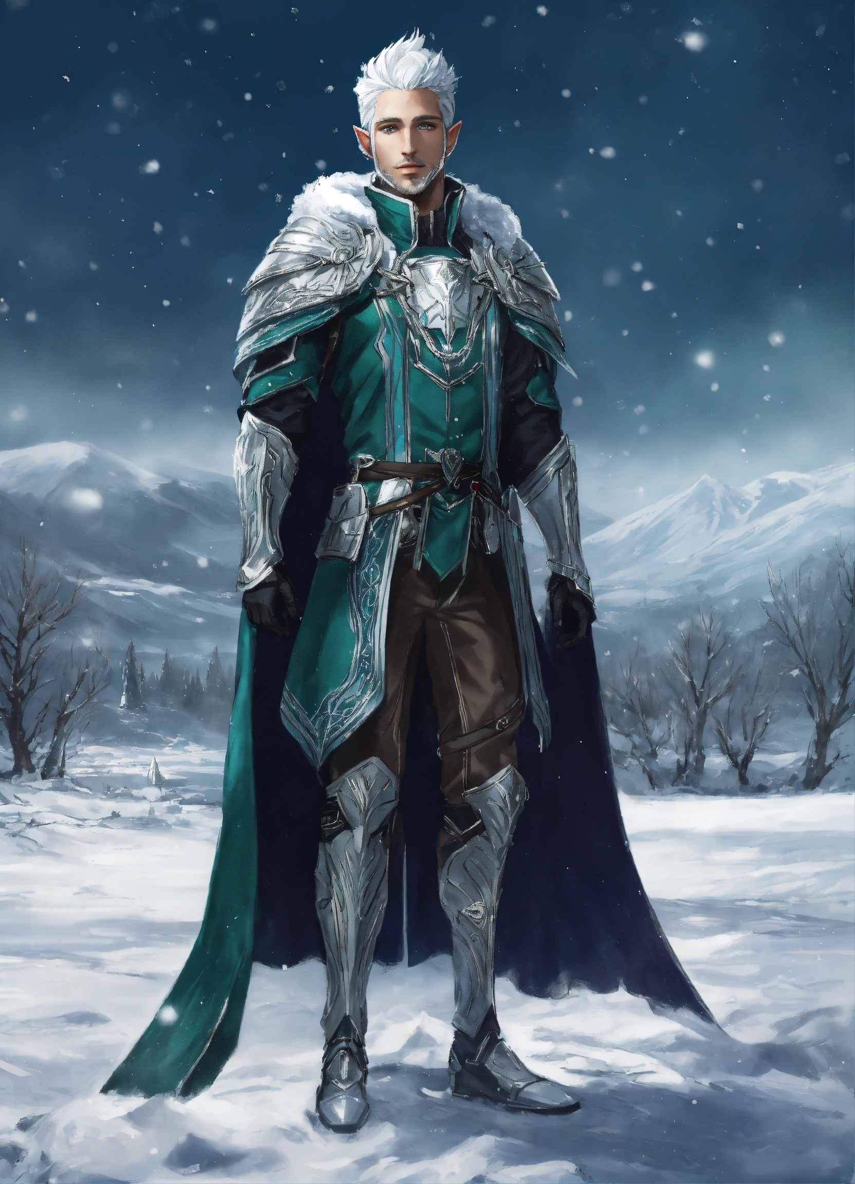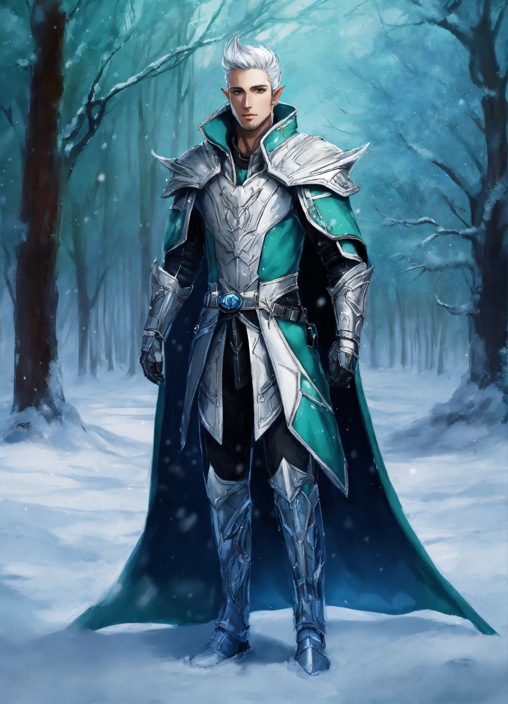 Full body drawing of a sci fi high elf, royalty, futuristic, mint cybernetic royal coat, elf, male, handsome, silver hair, 36 years old, standing in a snow covered field in winter