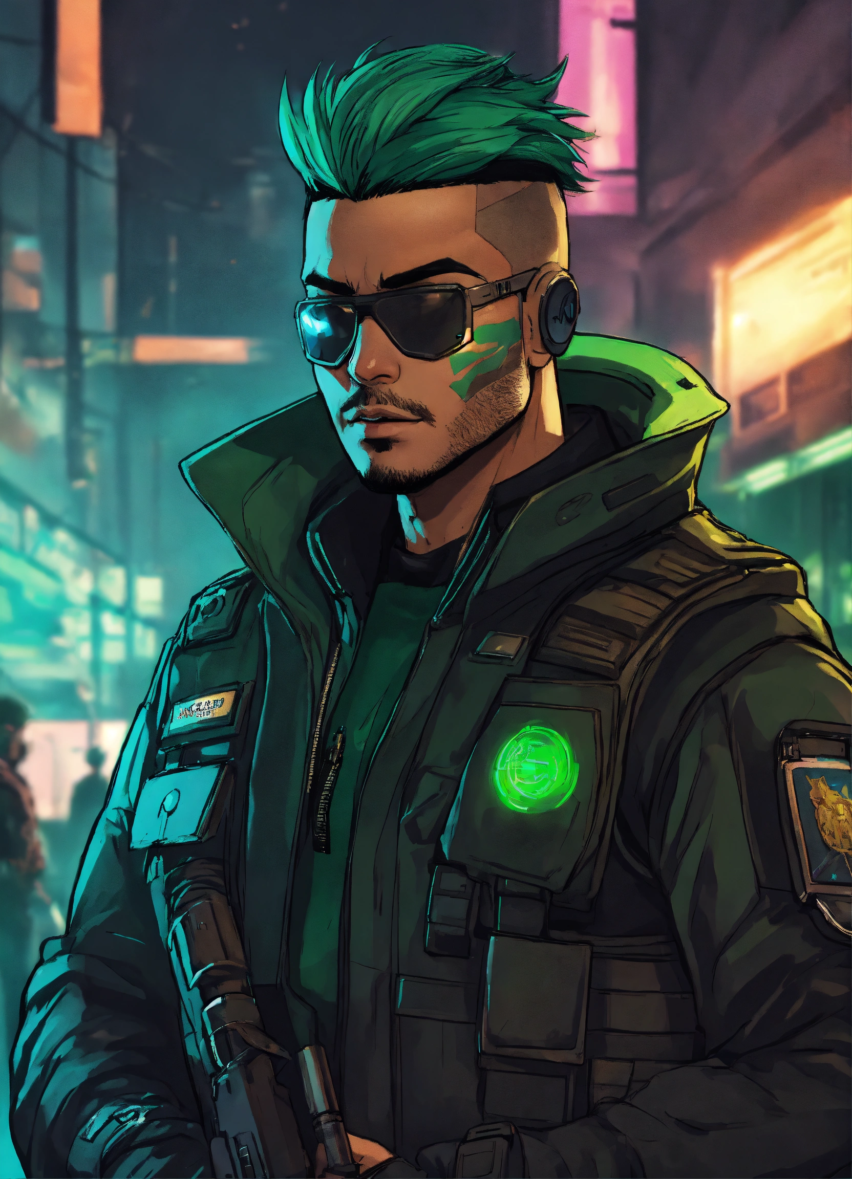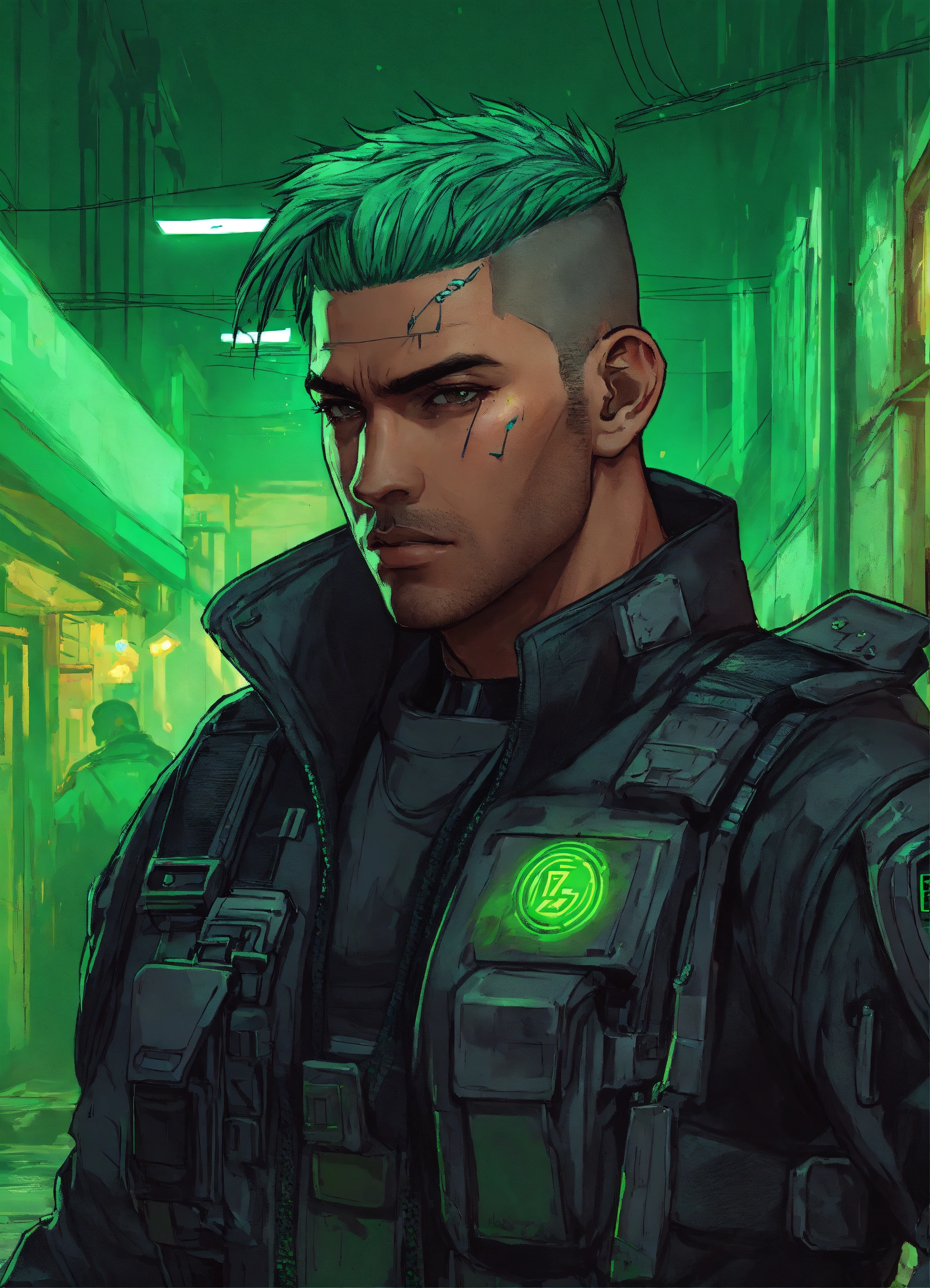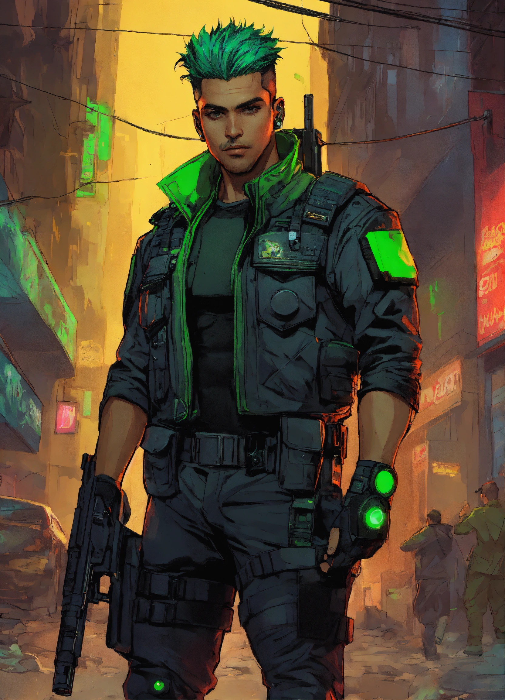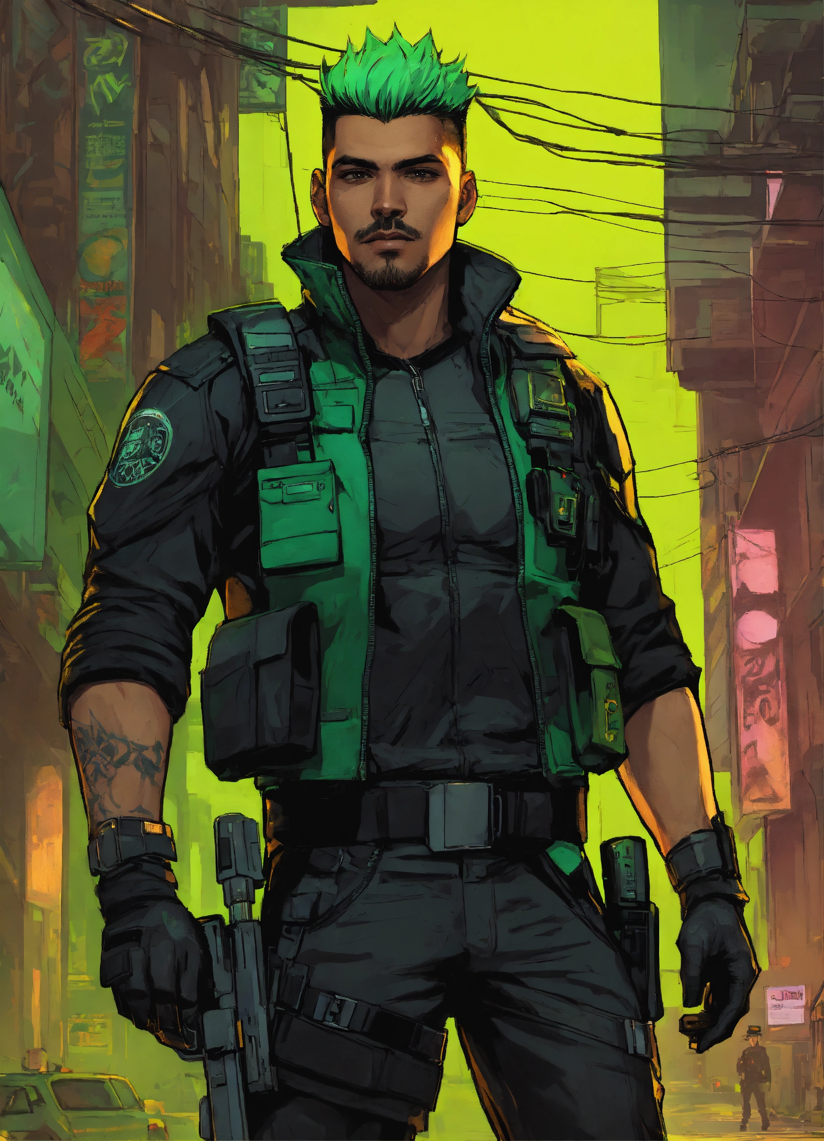 Cyberpunk male hispanic cyberpunk cop in a black uniform with green hair in an ally gritty realistic comic book style