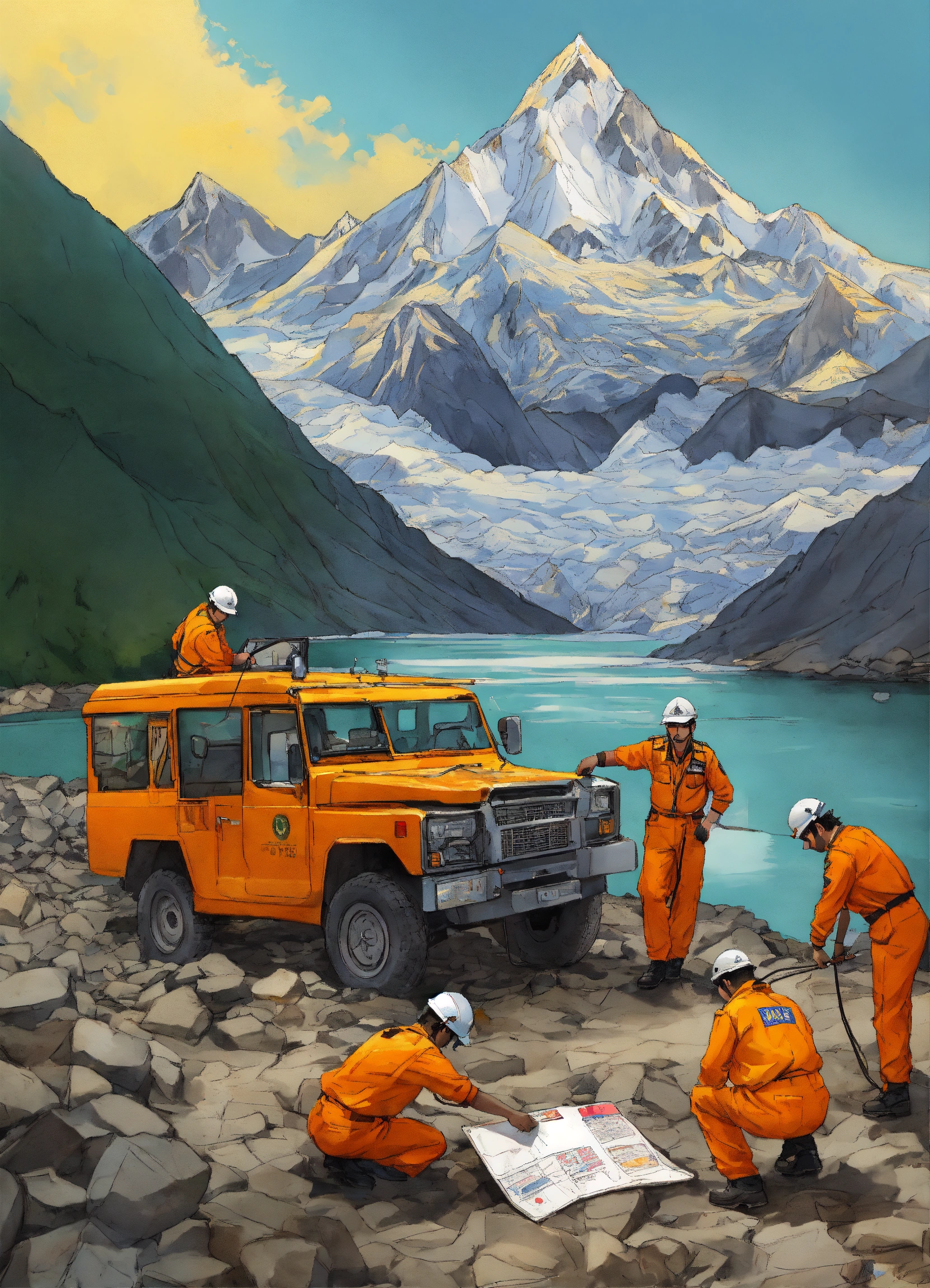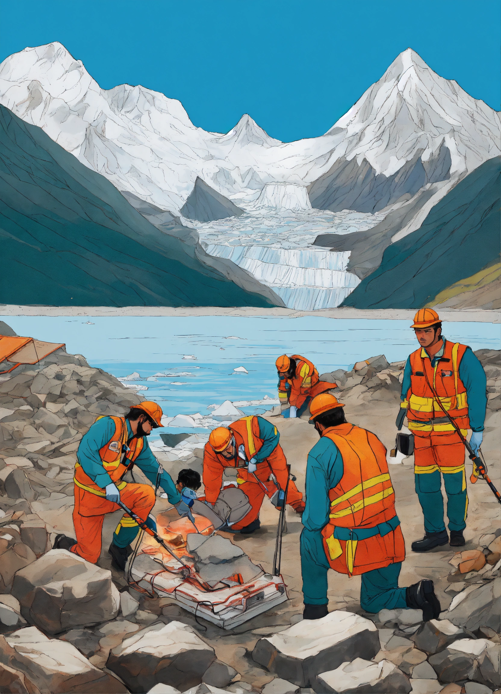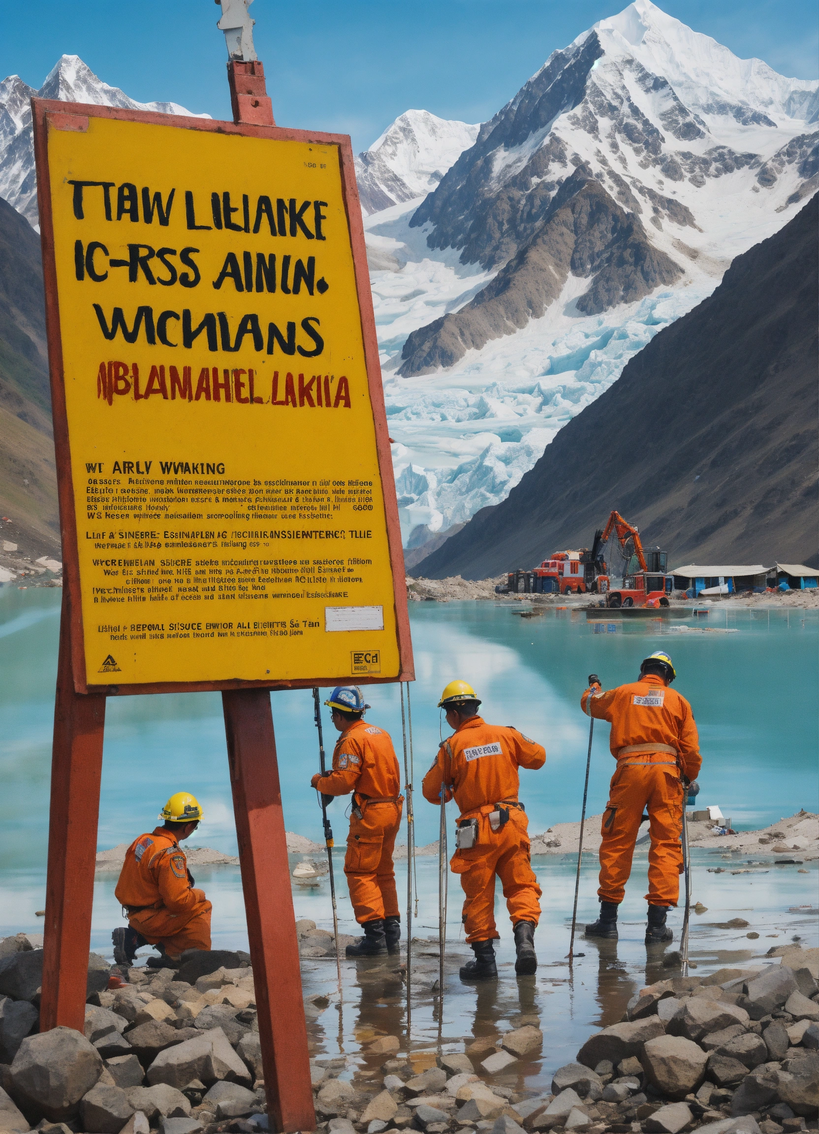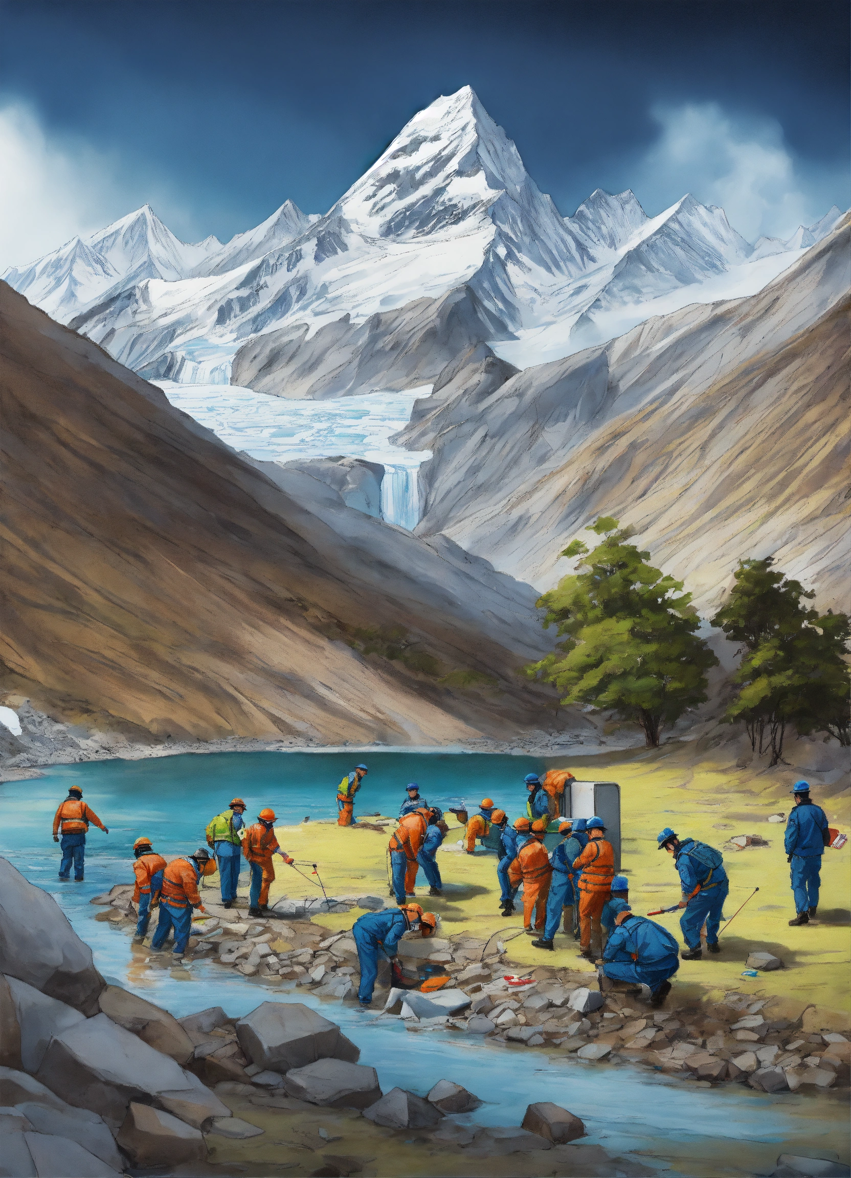 A hand drawn painting of a team of rescue officers, engineers an scientists installing early warning sign (ews) devices near a glacial lake in the himalayan mountain range to ensure that the if the lake ever is about to break its banks, they will be signed early so that they can prevent the devastation and destruction caused by flash floods just like the one which devastated a hill town of sikkim in india where 76 peopled killed and more than 60, 000 people in rescue camps sharp, highly detailed, vibrant, vivid
