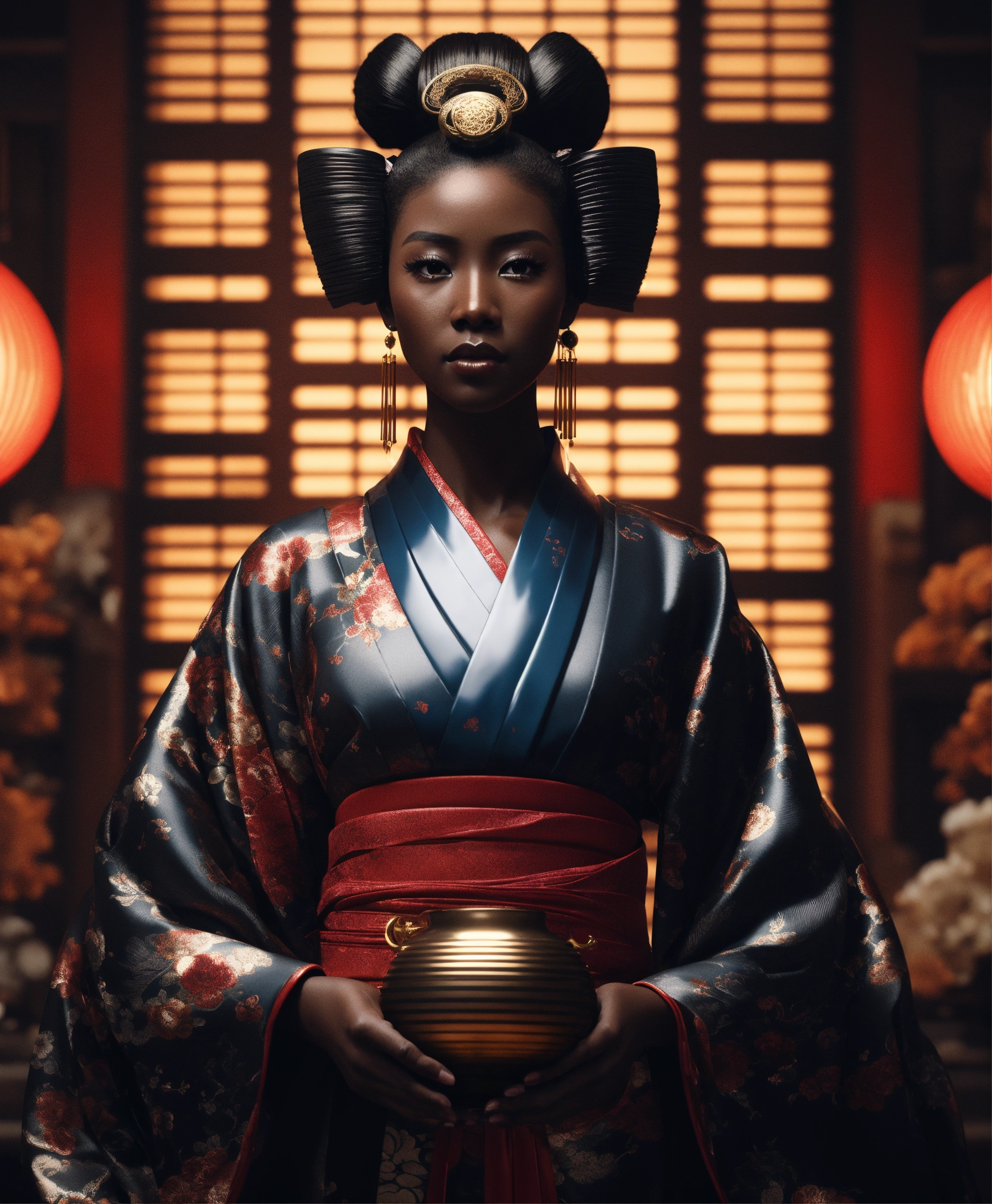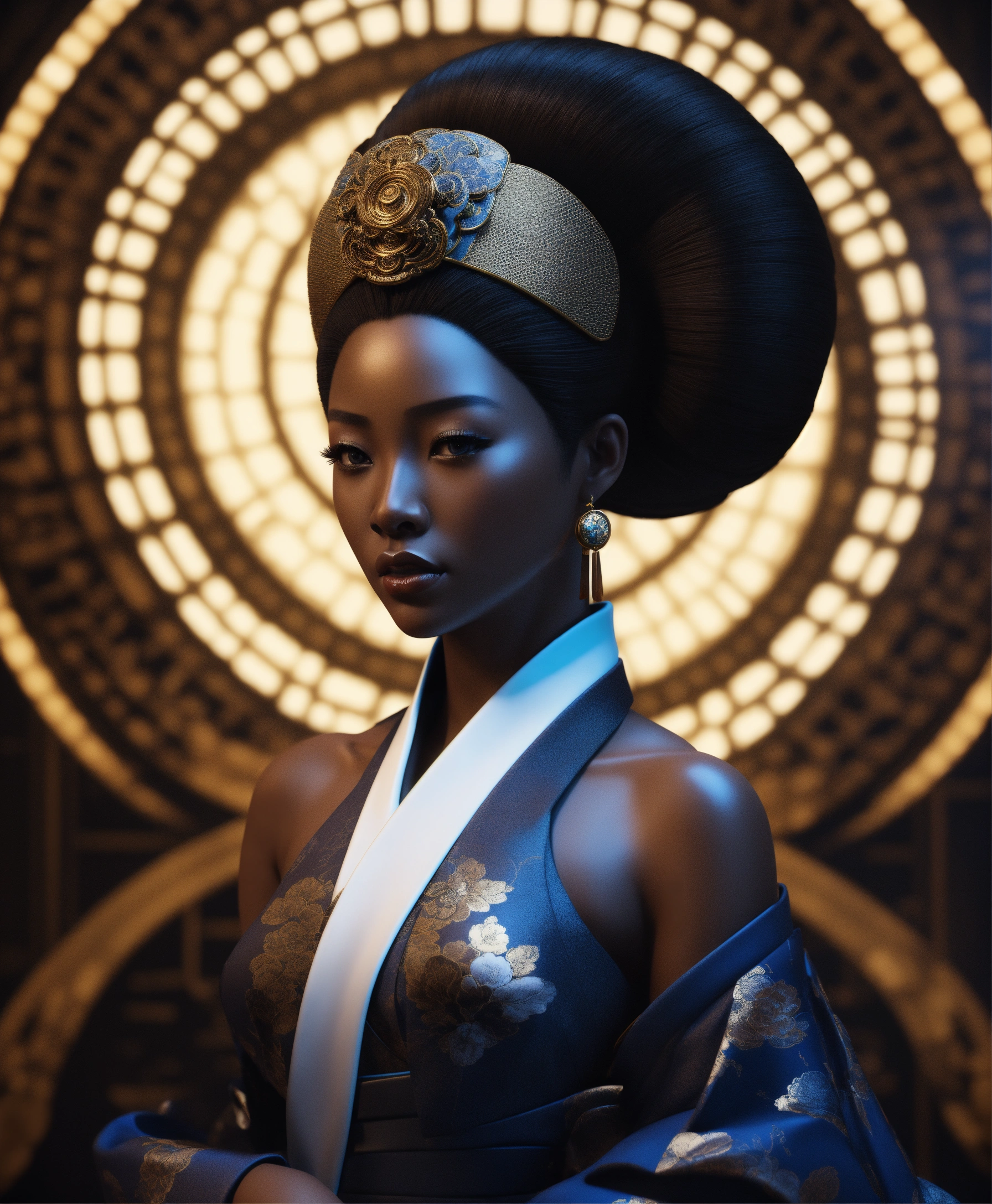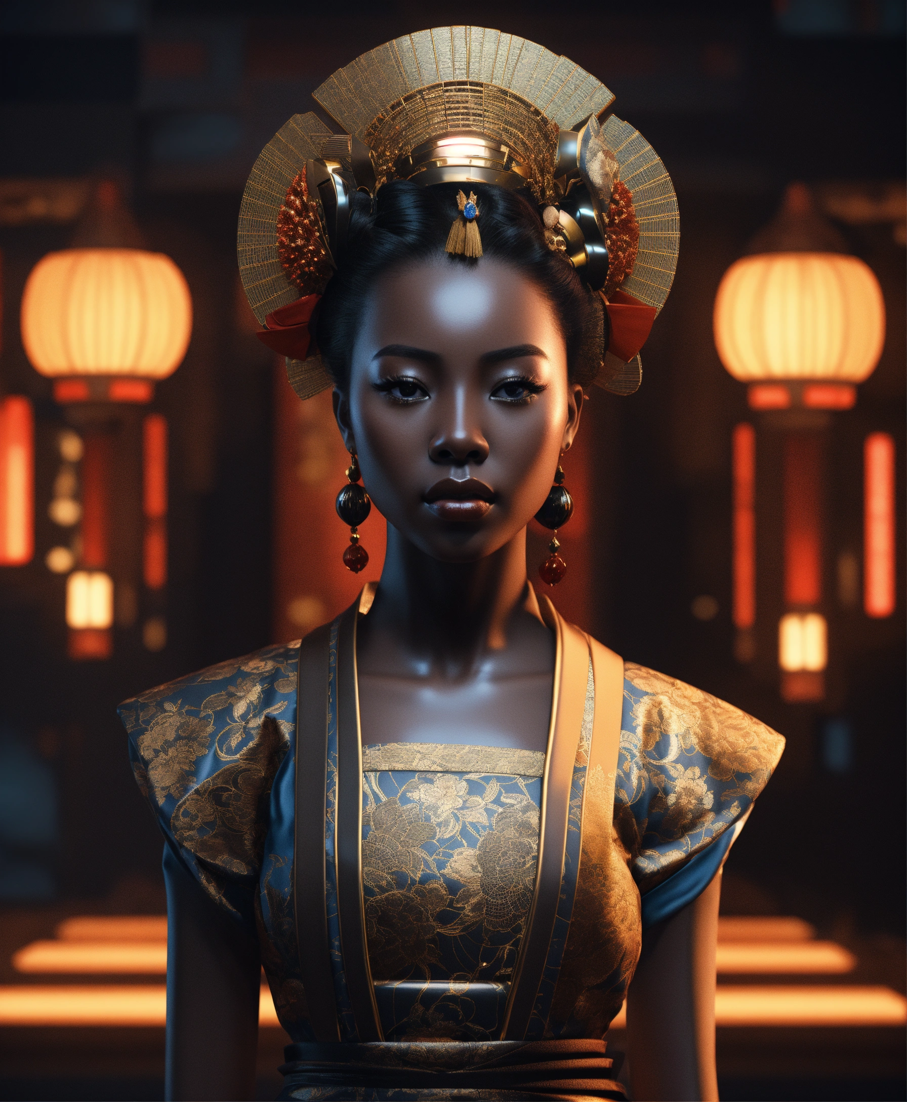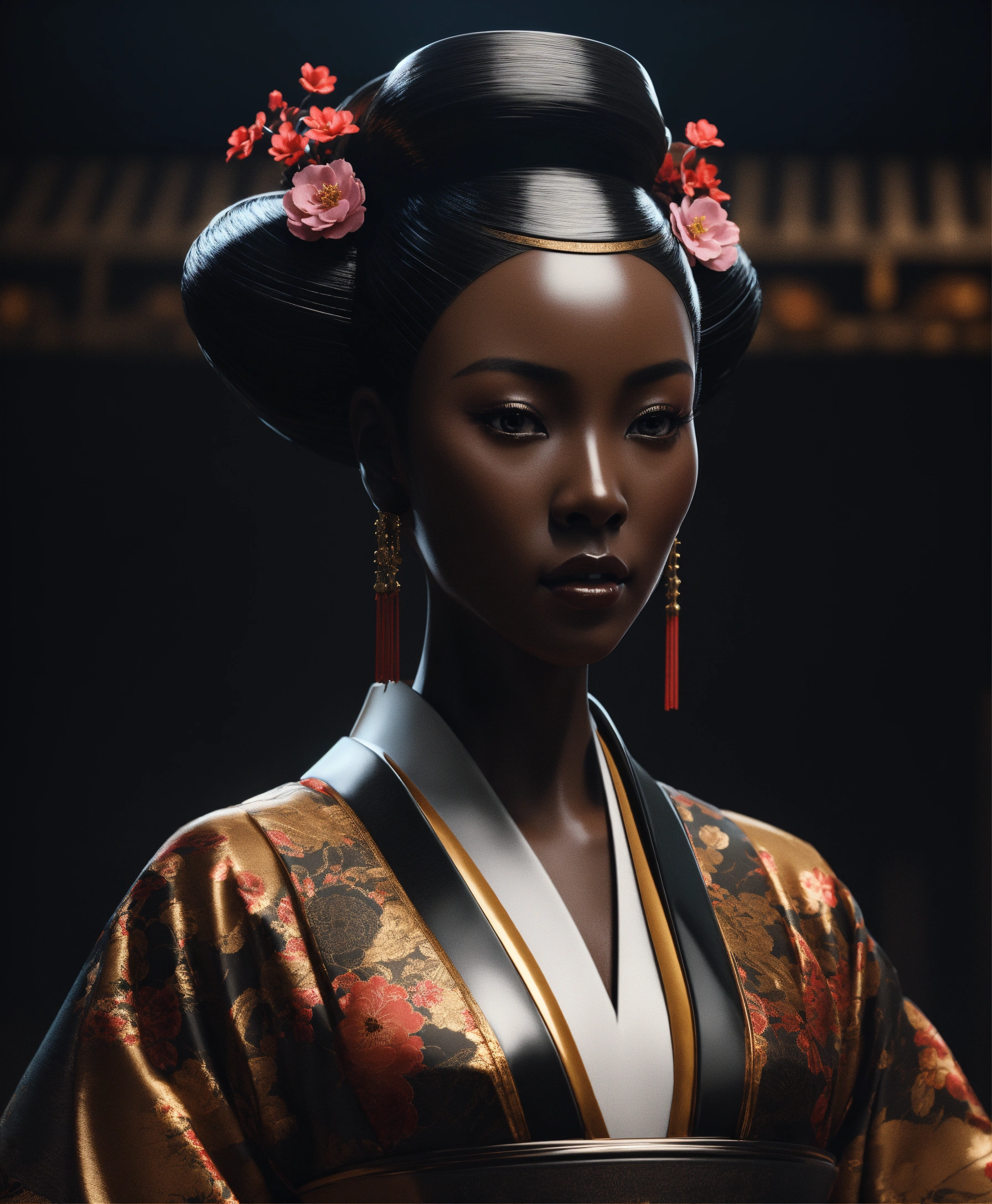 A futuristic dark skinned black woman geisha porcelain ciborg that represents goddess of the artificial intelligence, looking straight ahead, photorealistic render, 3ds max + v - ray, center composition, elegant, vfx, unreal engine 5, octane render, extremely contrast, extremely sharp lines, black background