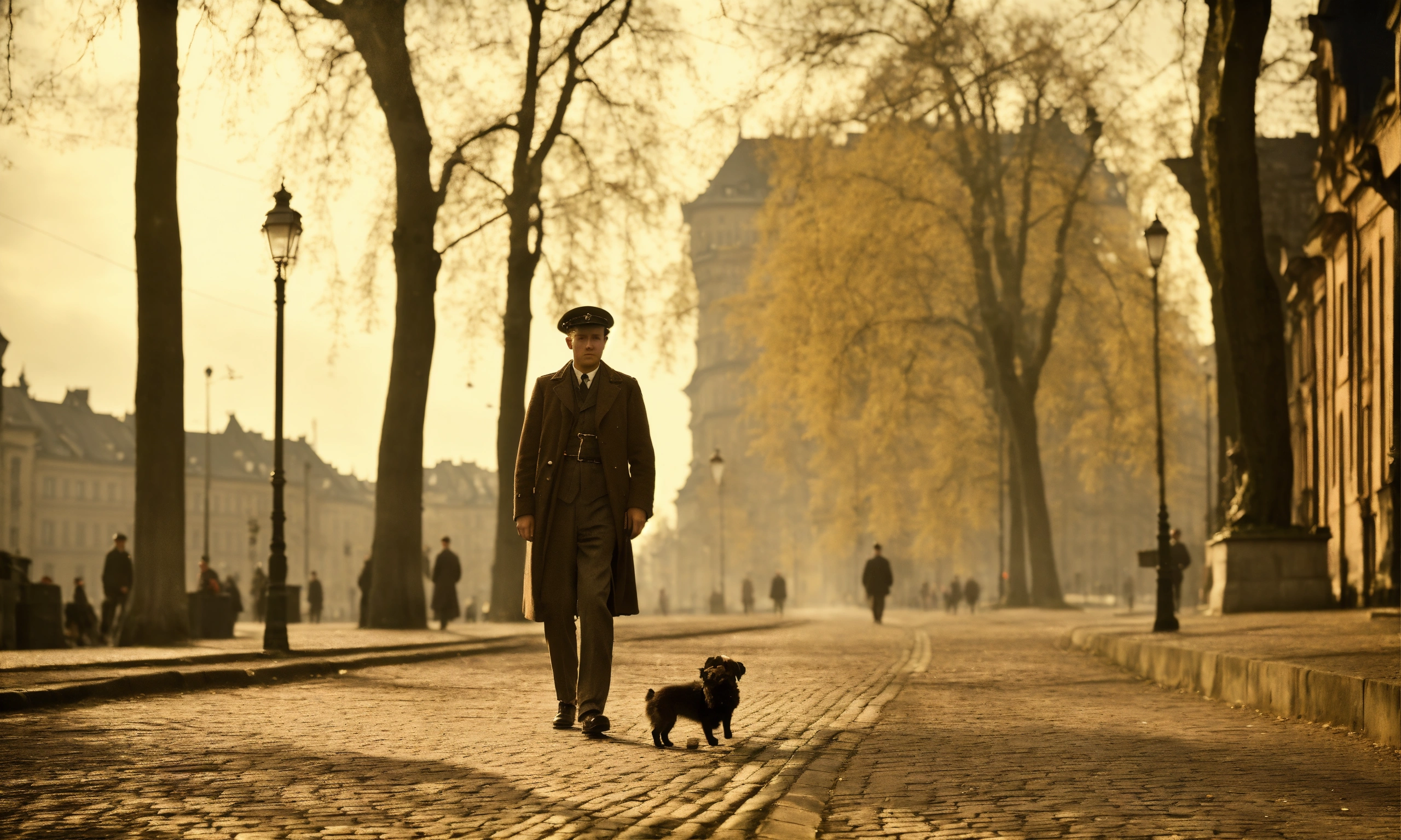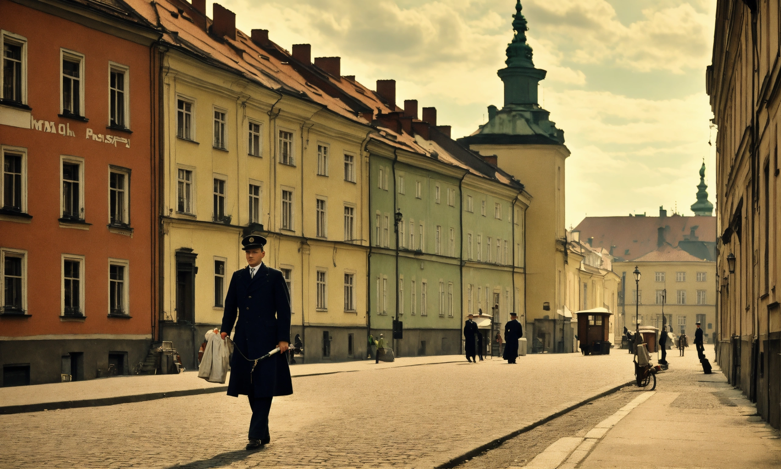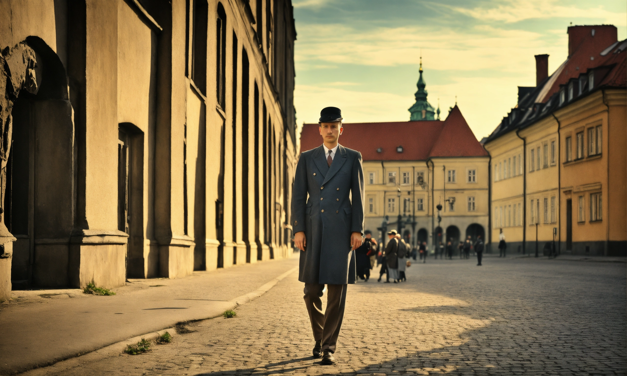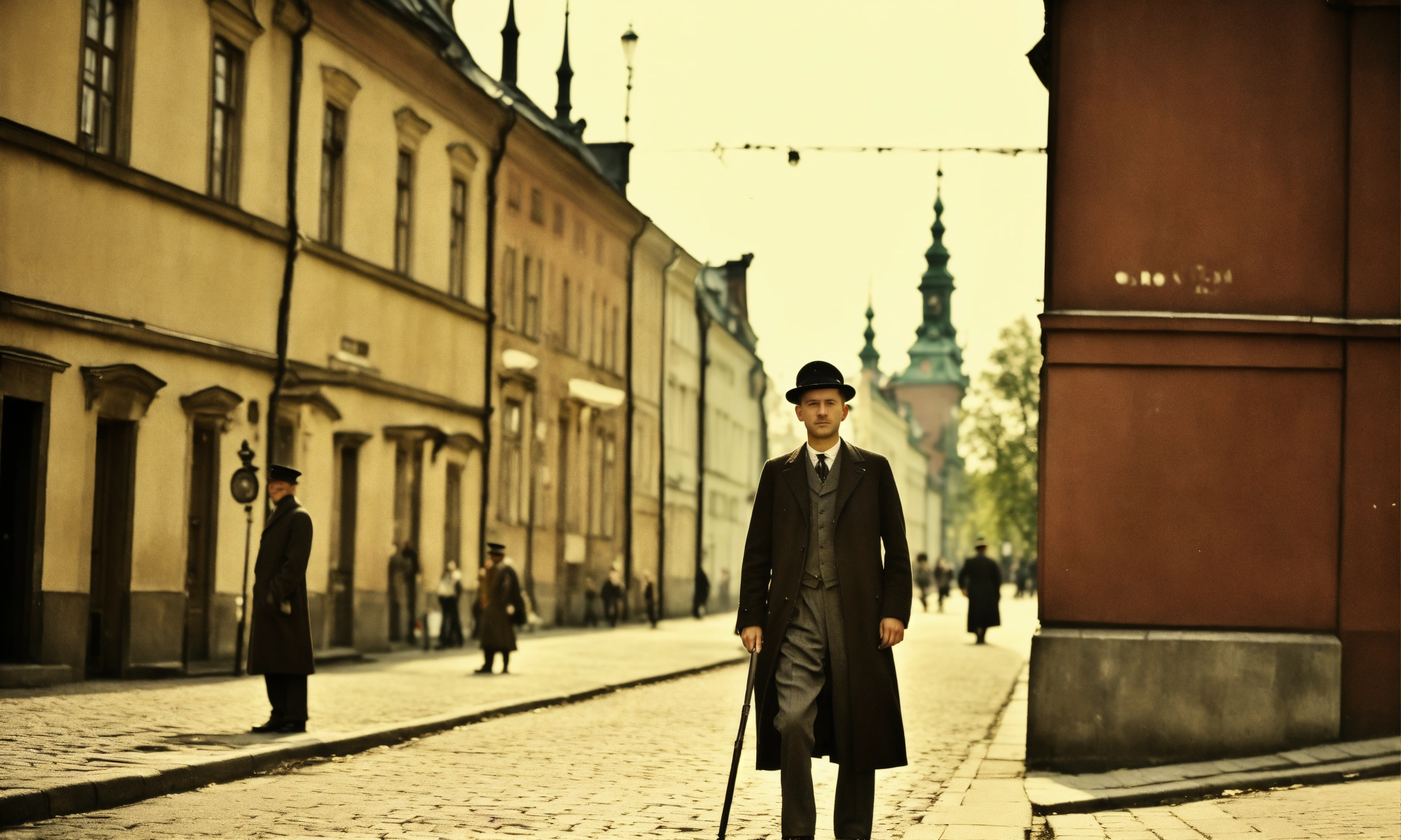 Poland poor man age 30, 1920-1930 on streen in warshaw. retro style photo full height. without people. focus camera on face man. season summer, keep in mind that the street must be without people, retro style photo. warshaw street without people, warshaw the royal castle
