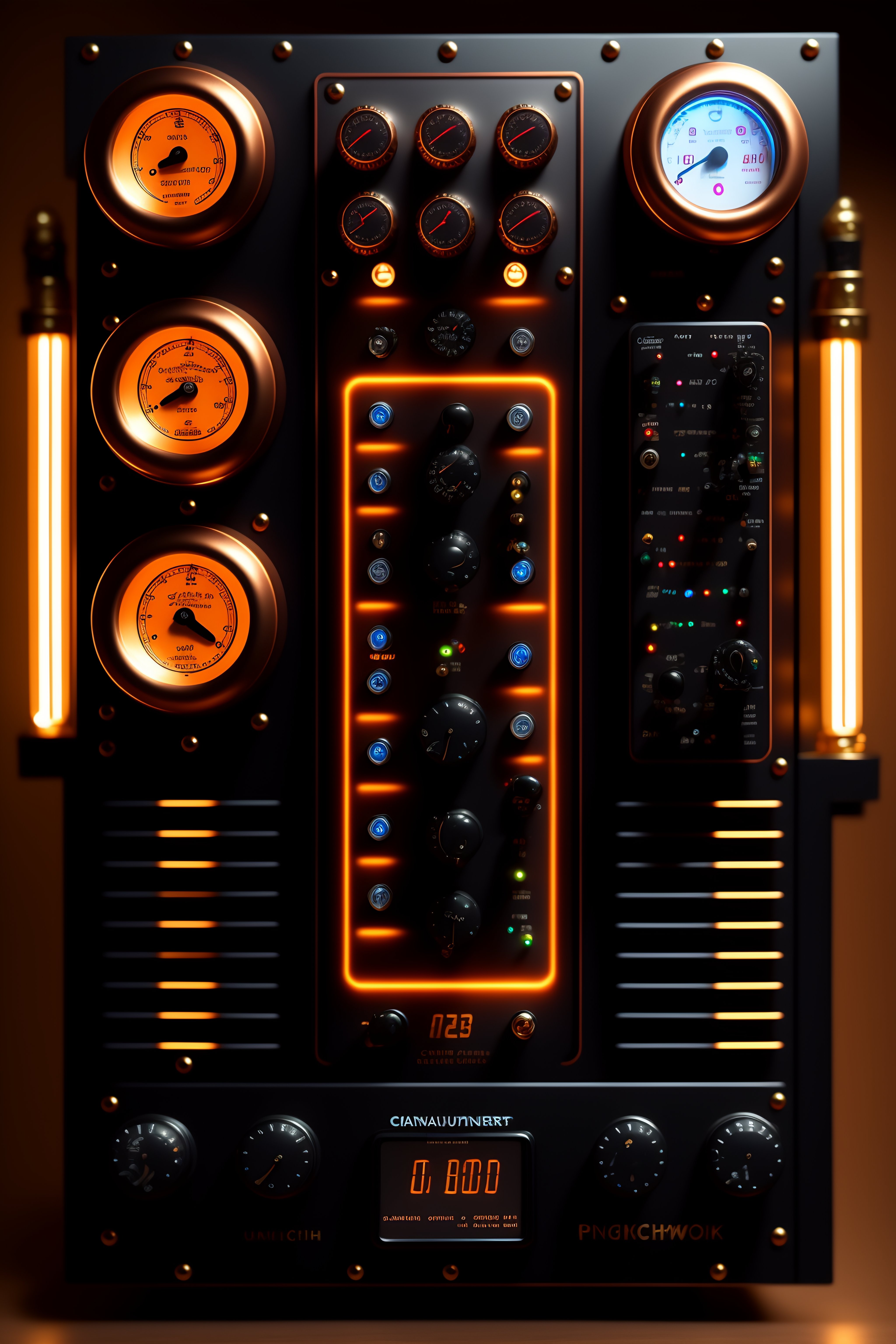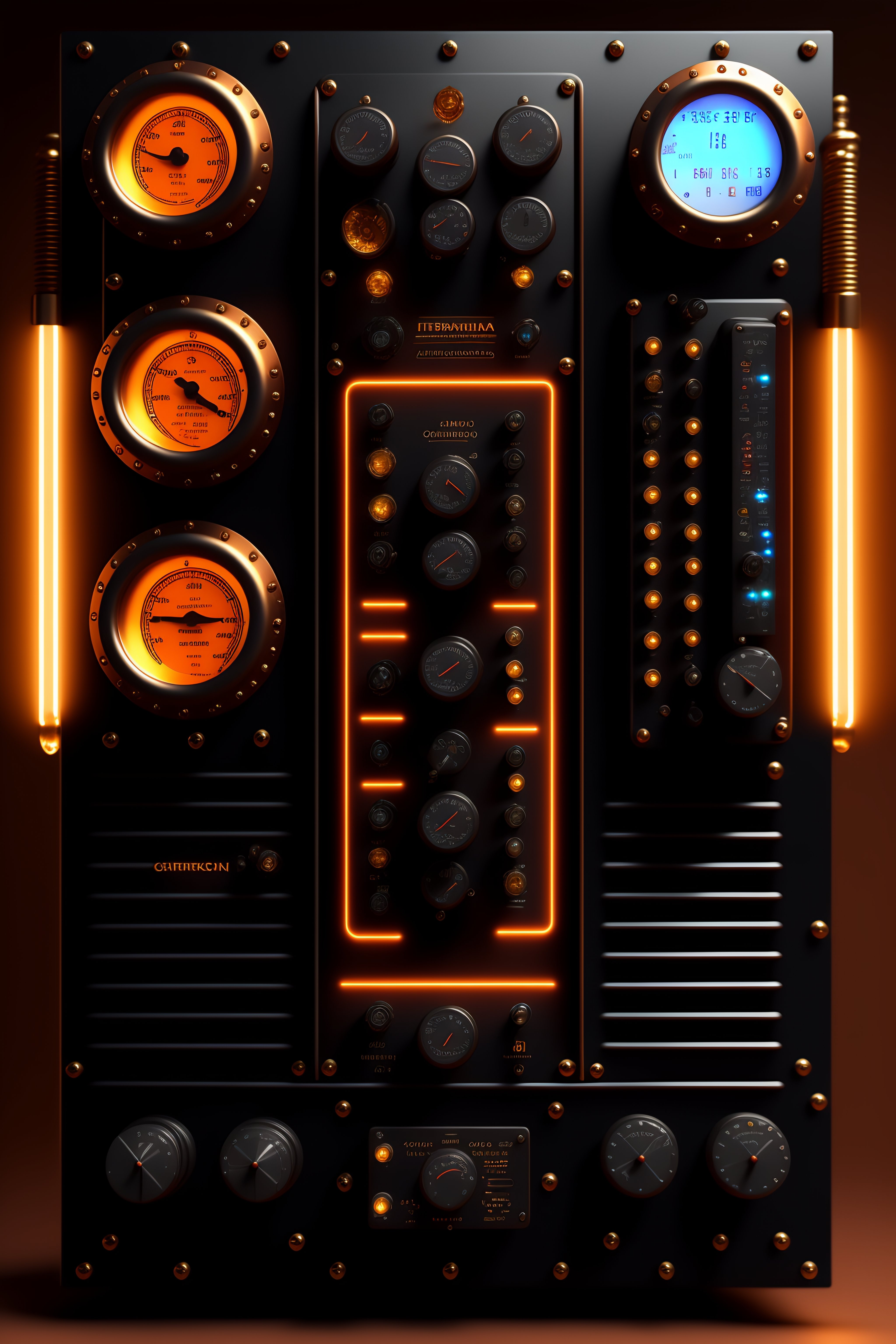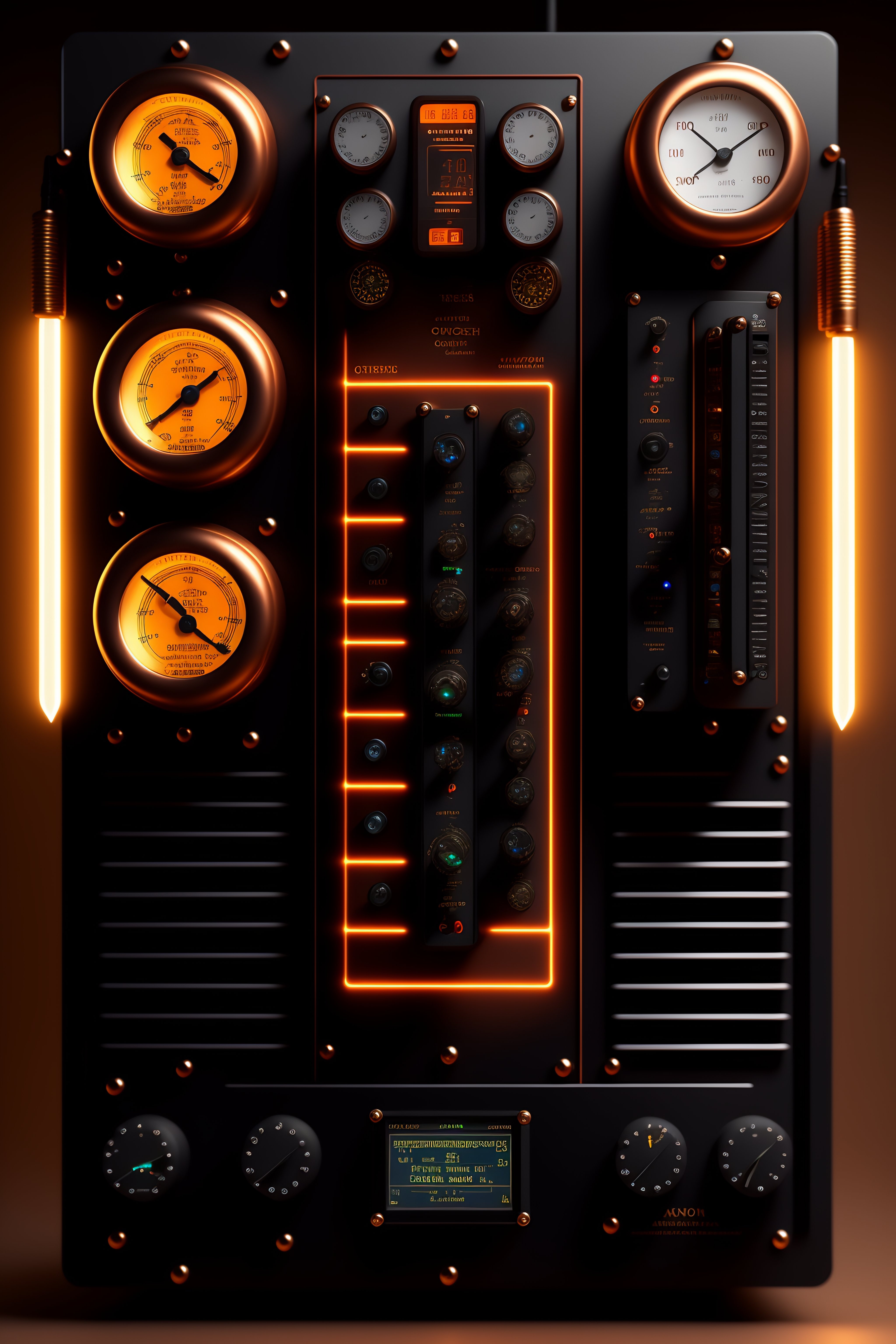 Steampunk front view of a chaotic control panel with monitors