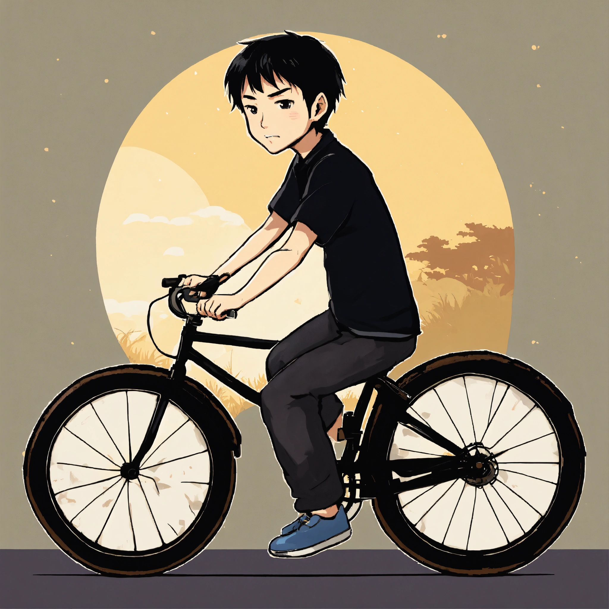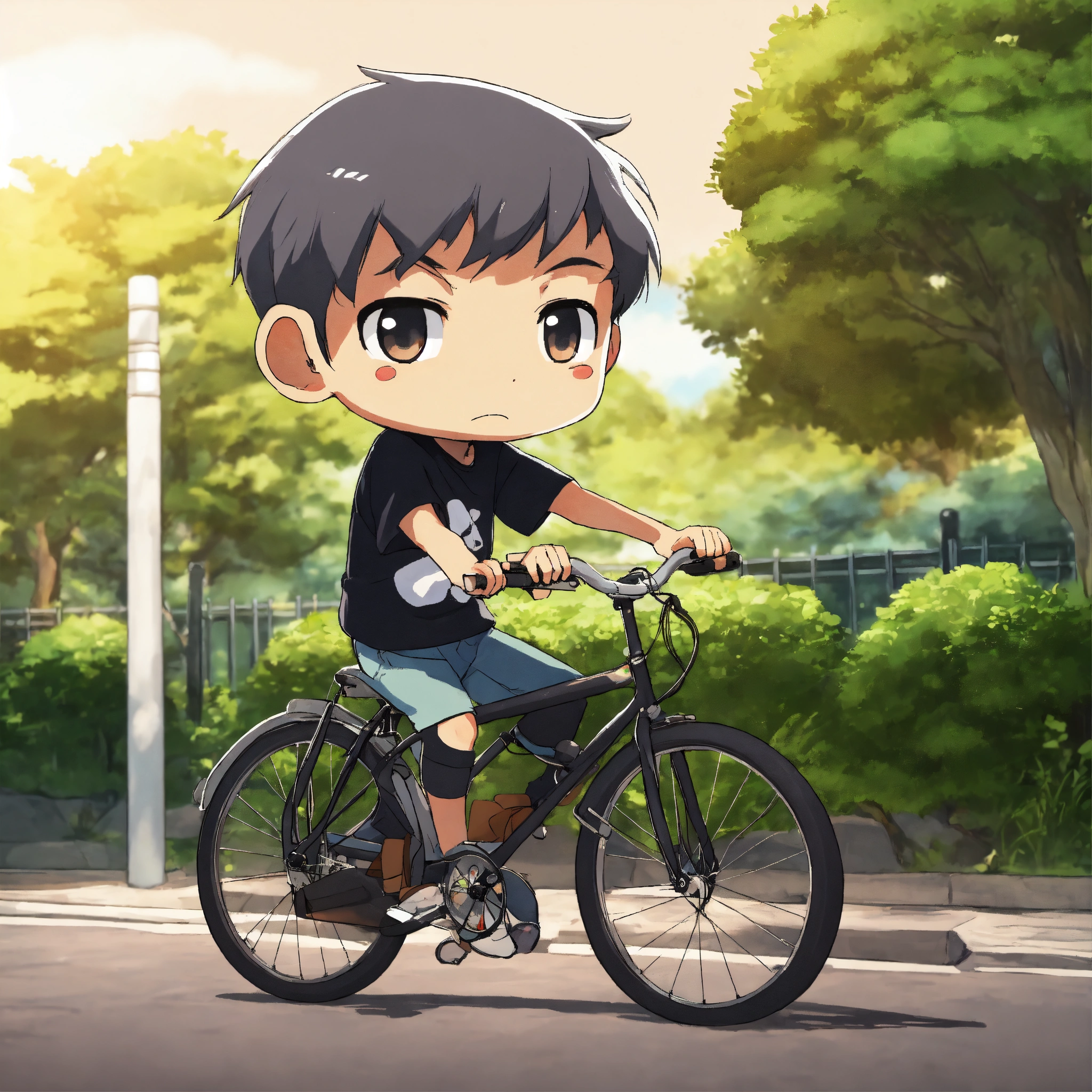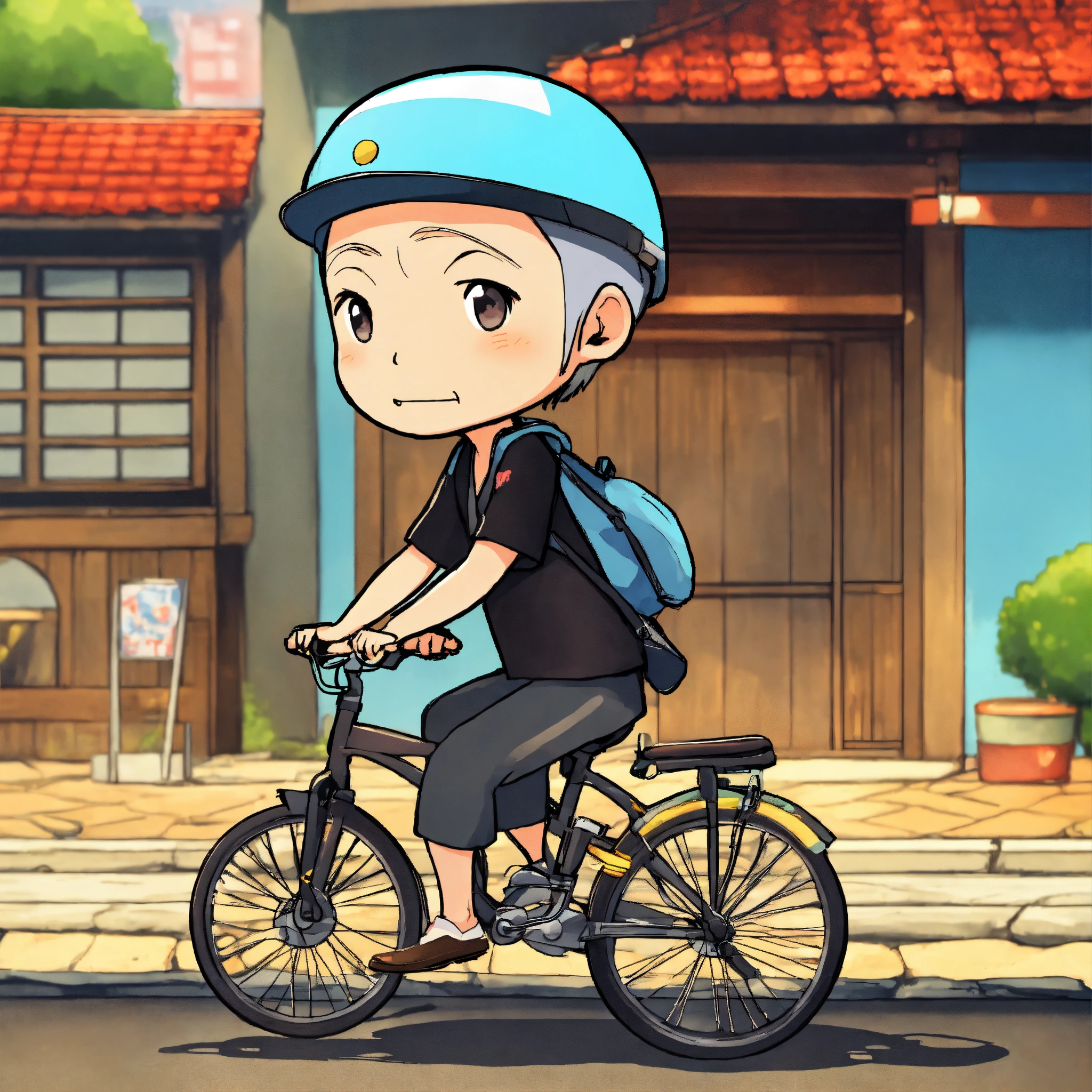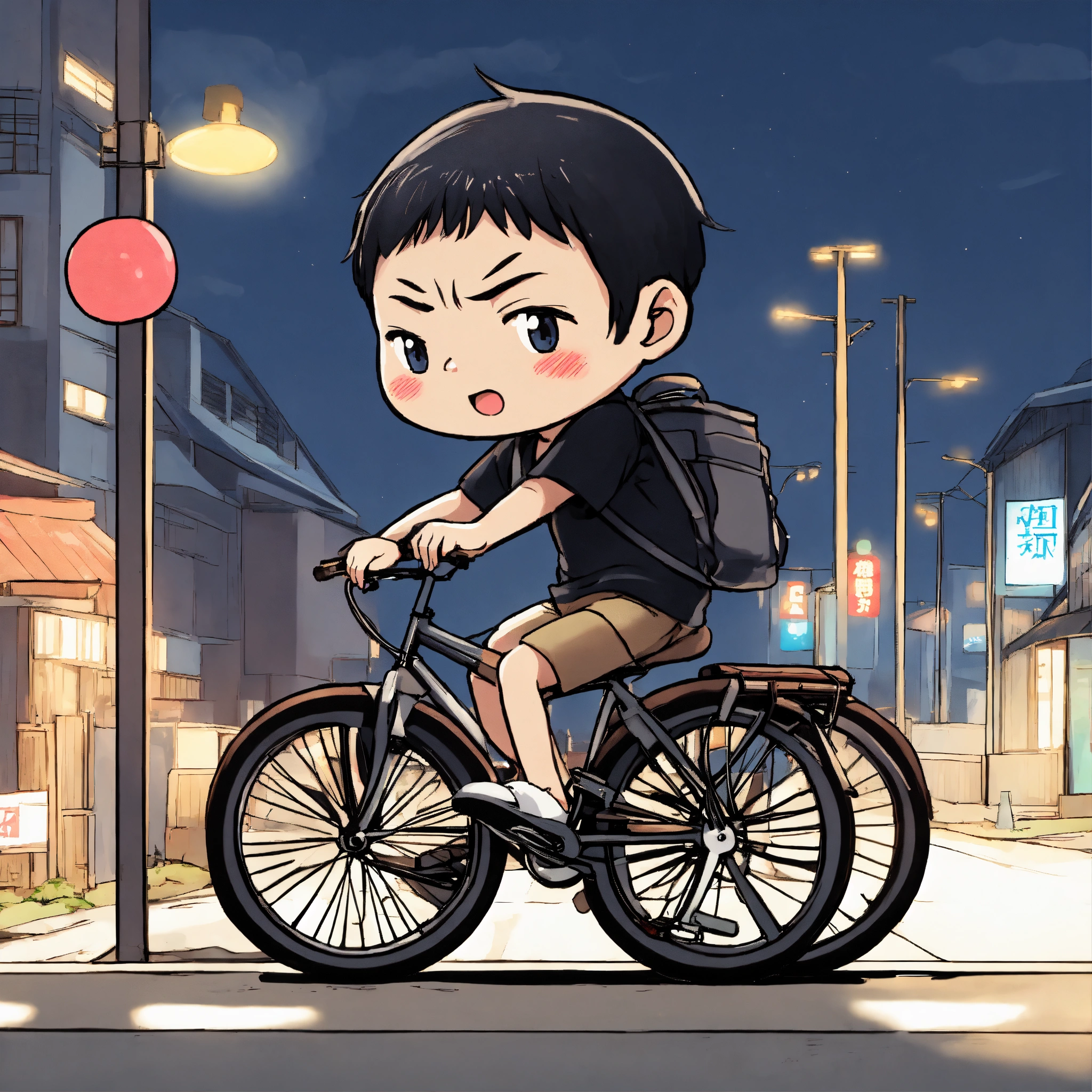 Poor japanese man, ride on the bicycle, black t-shirt, chibi character, anime style, 50 years old, short hair
