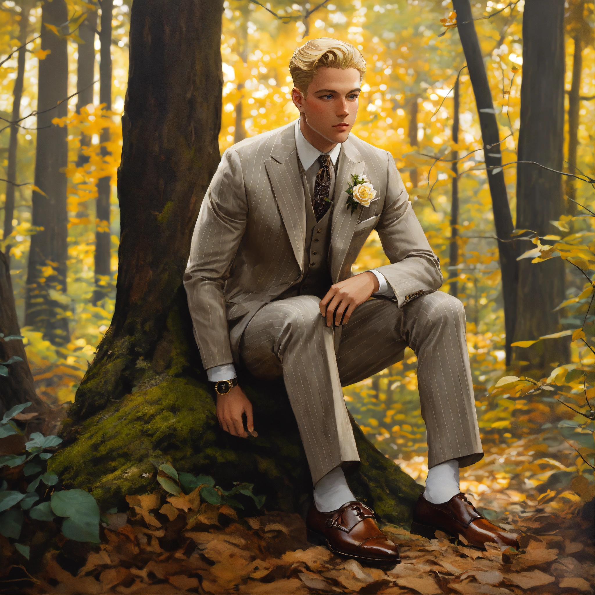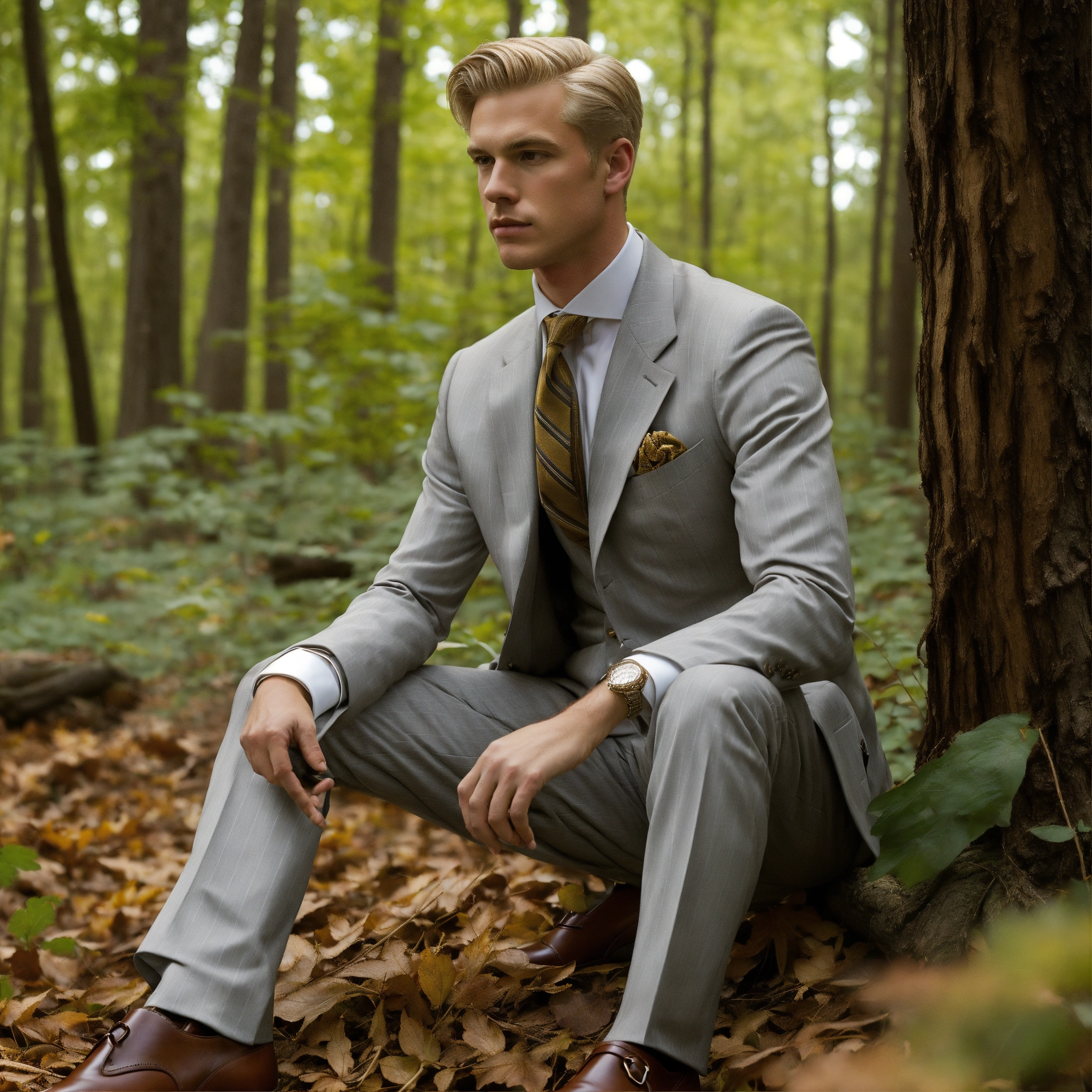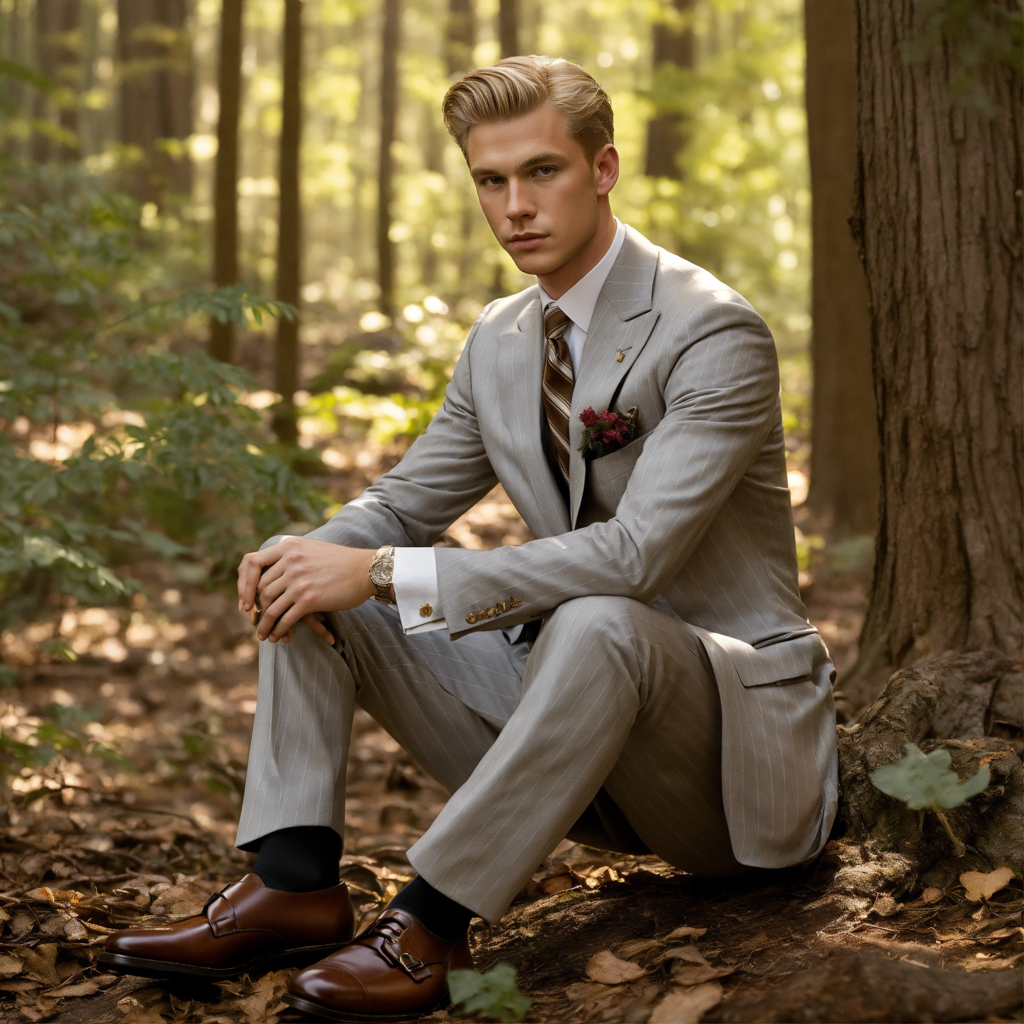 A blonde male aristocrat in light grey pinstripe suit, club tie, big brown monkstrap shoes, crouching in the woods, leyendecker style