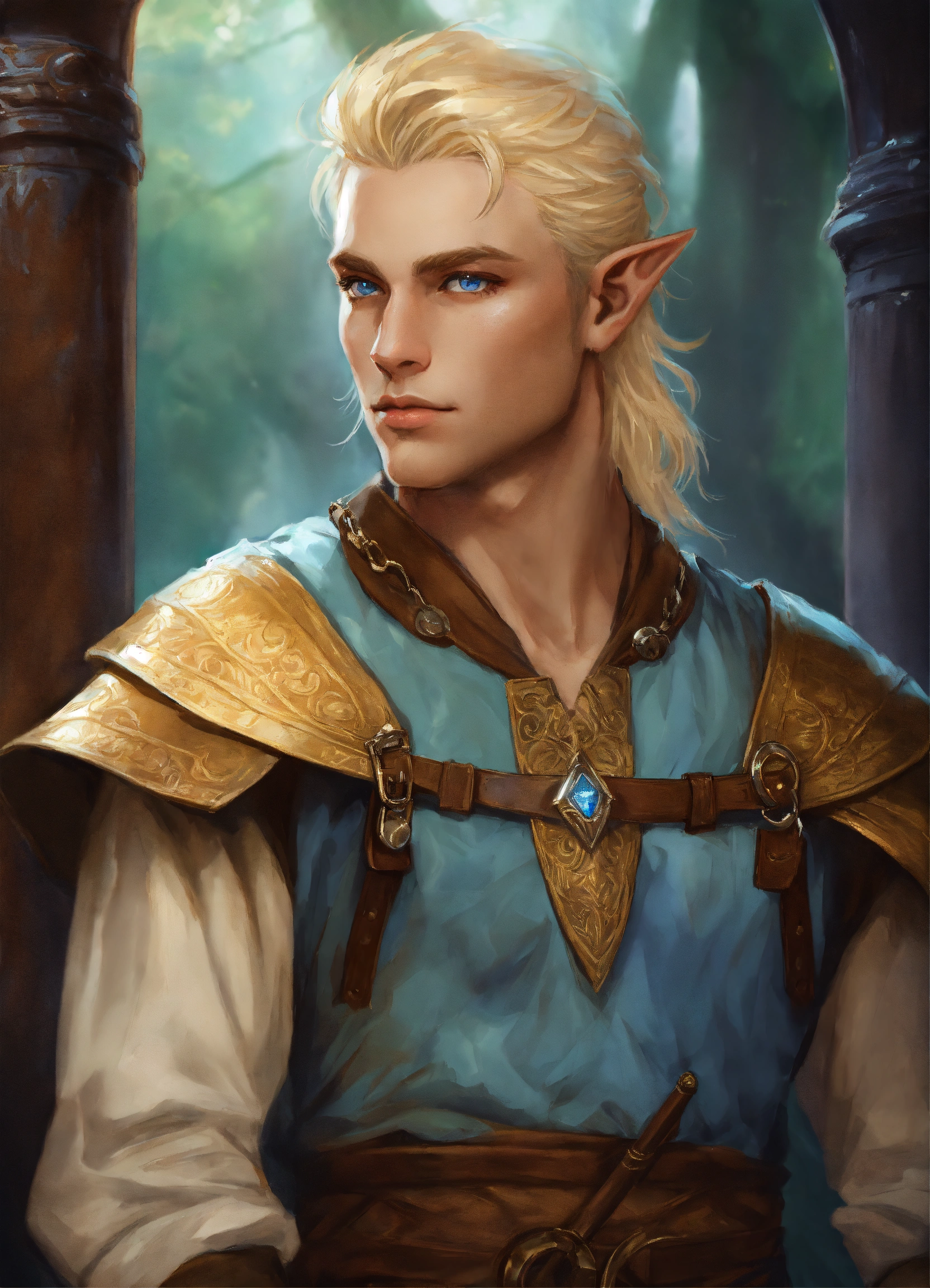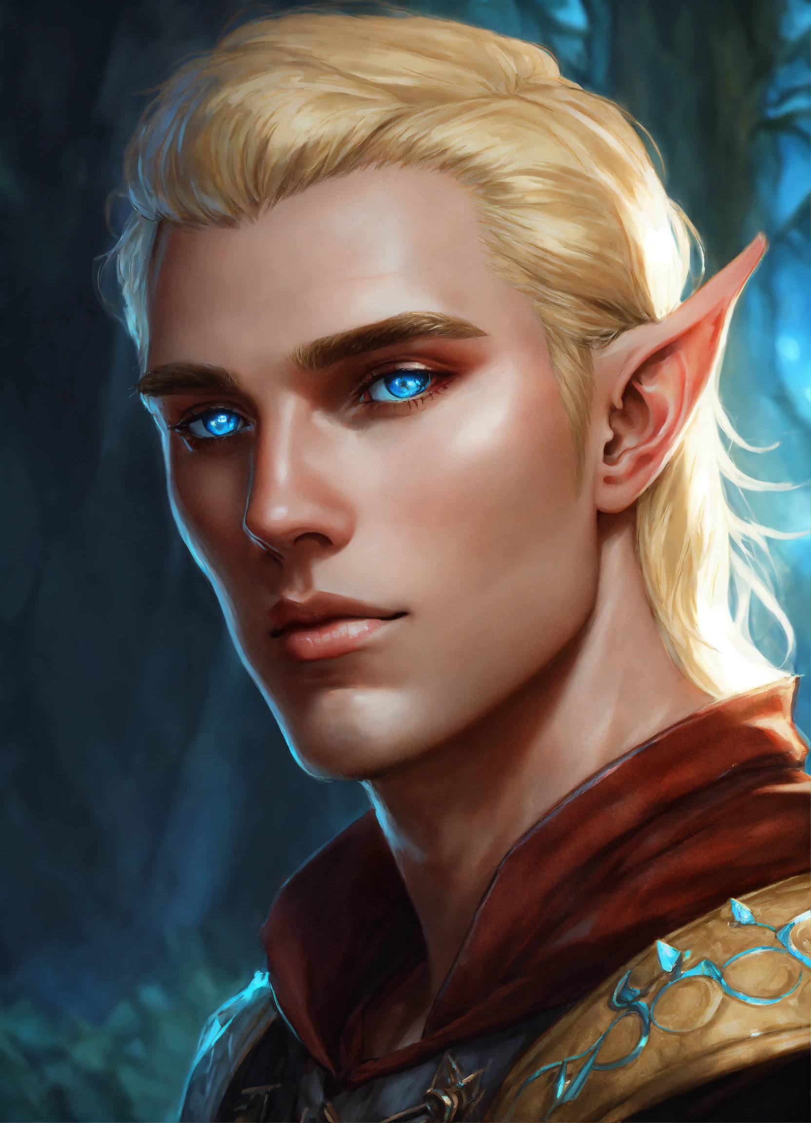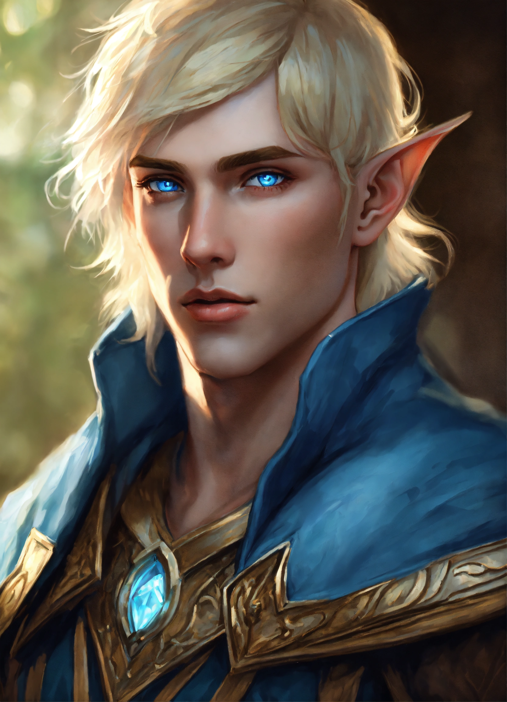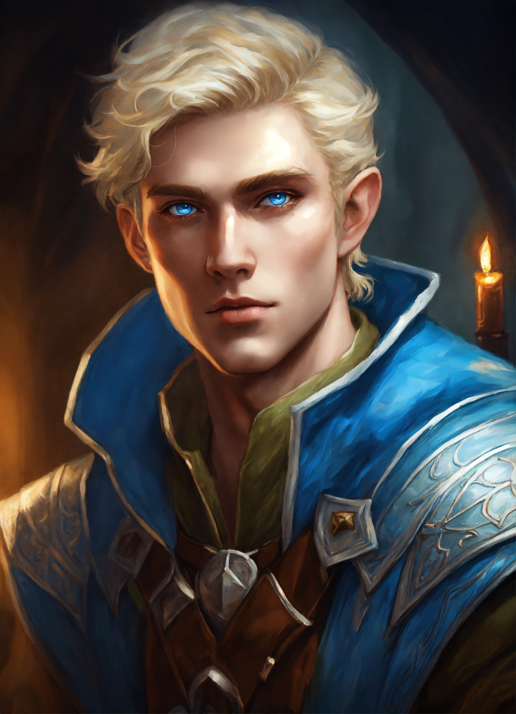 Cocky blonde half elf man with light blue eyes realistic art fantasy dungeons and dragons
