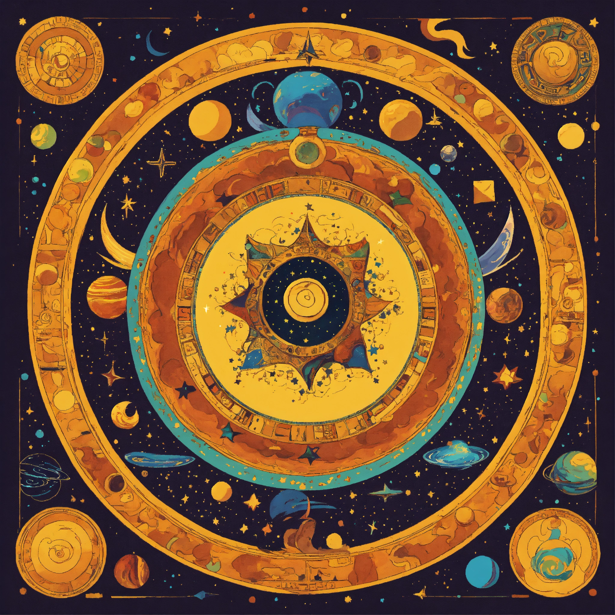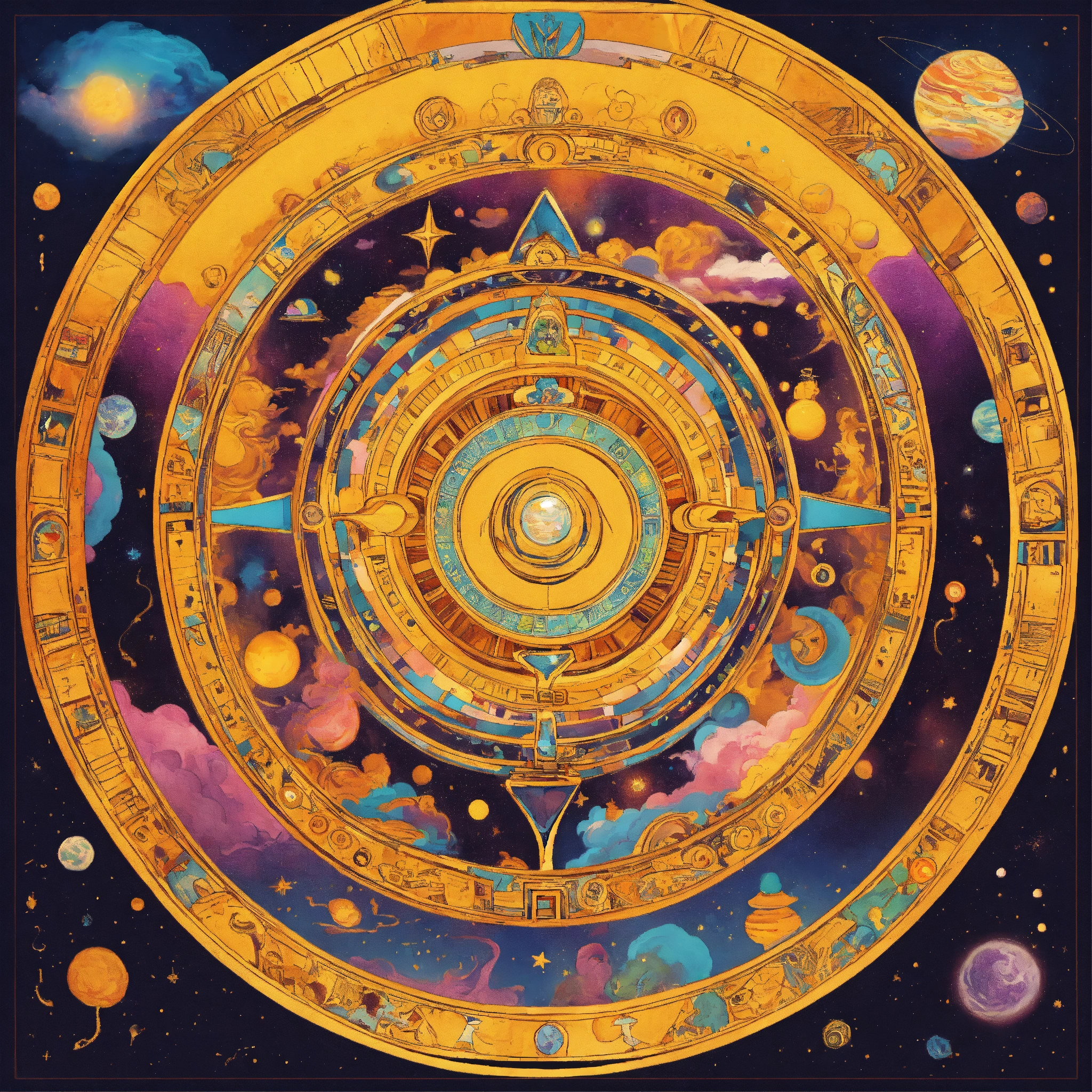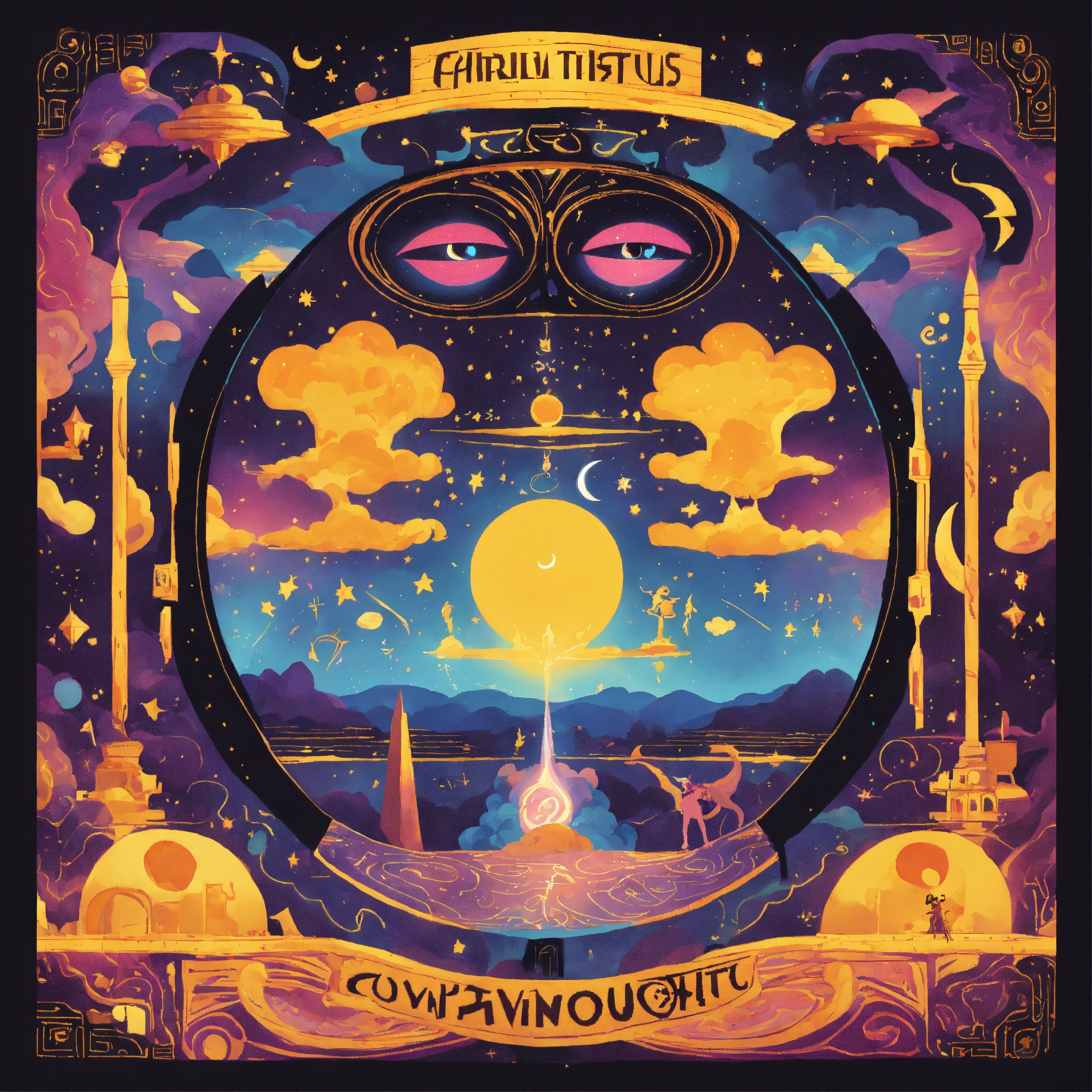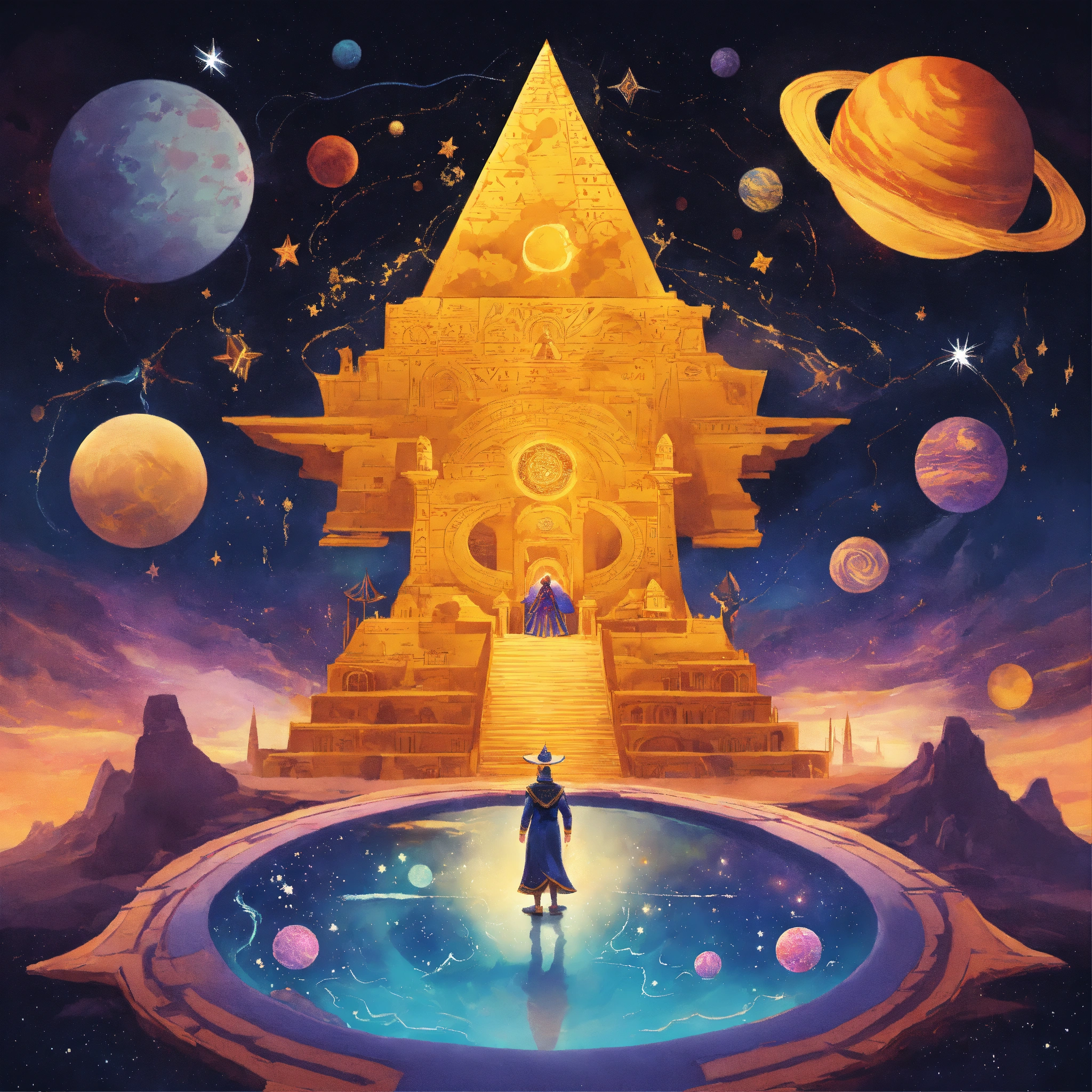 Create a vibrant, cartoon-style poster depicting a whimsical, vast cosmic void brimming with yellow and black nebulous mists and twinkling cartoonish stars. in the center, a pharaoh with a comical pose of deep thought. around him, several stylized portals swirl with bright colors and whimsical patterns, each acting as a gateway to a different, fantastical cartoon dimension.