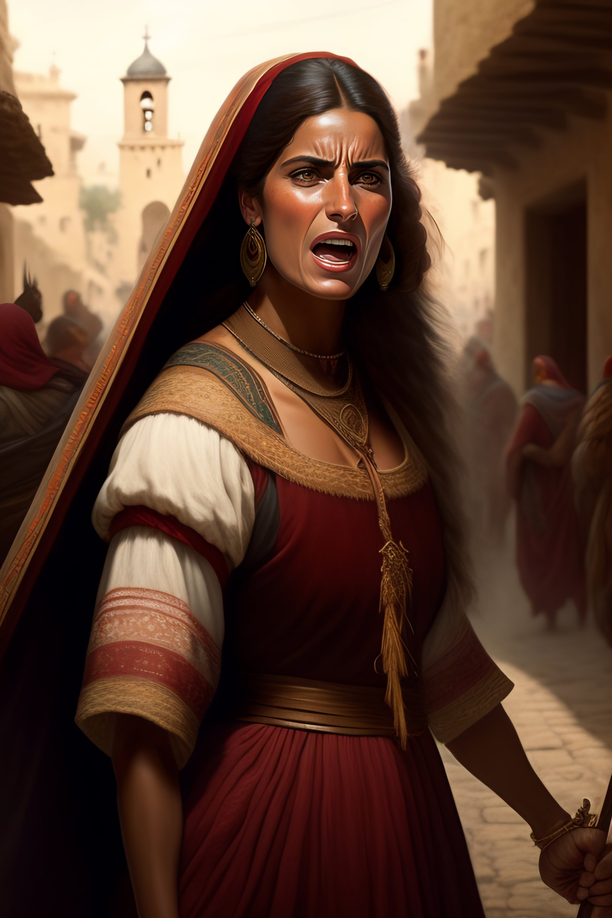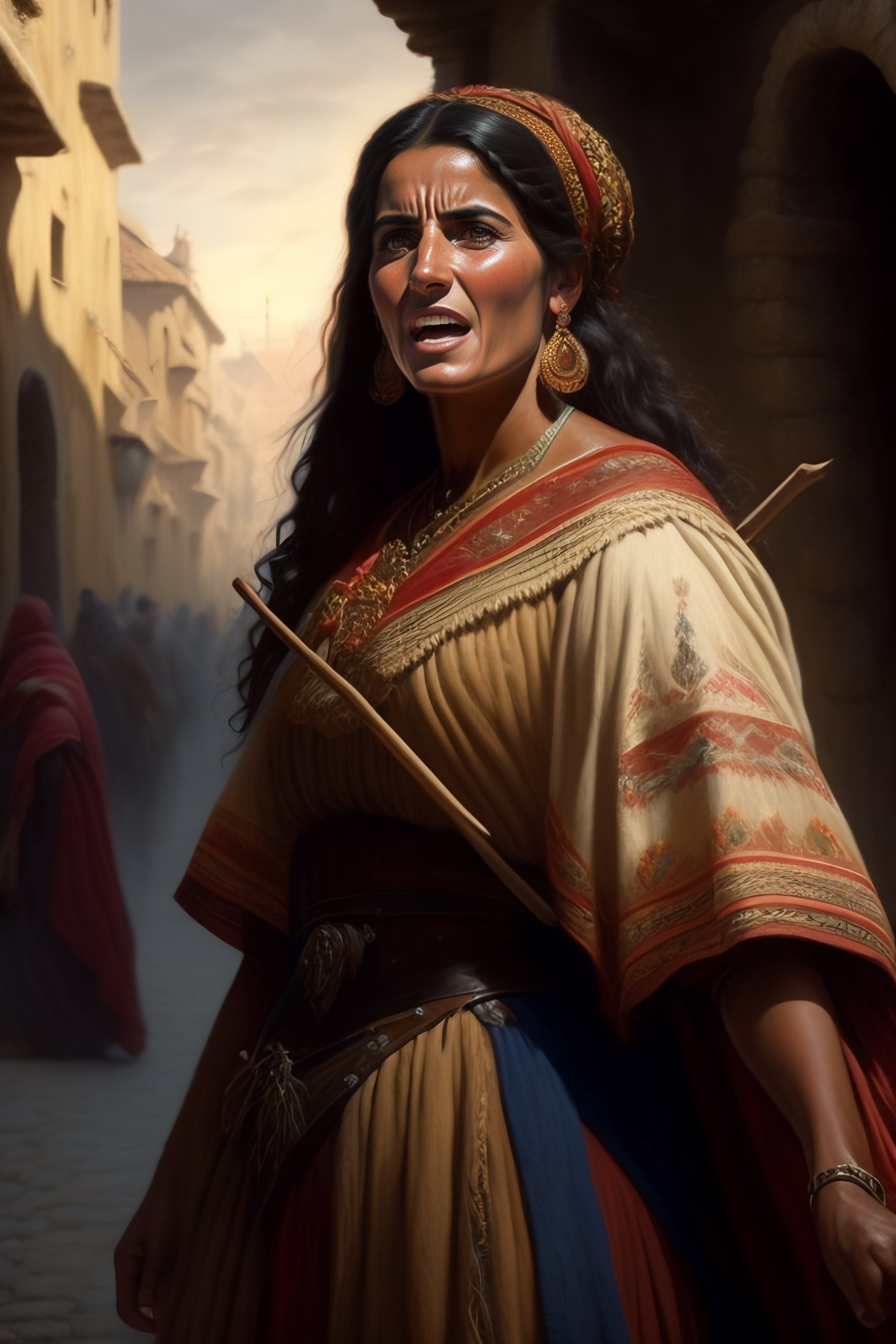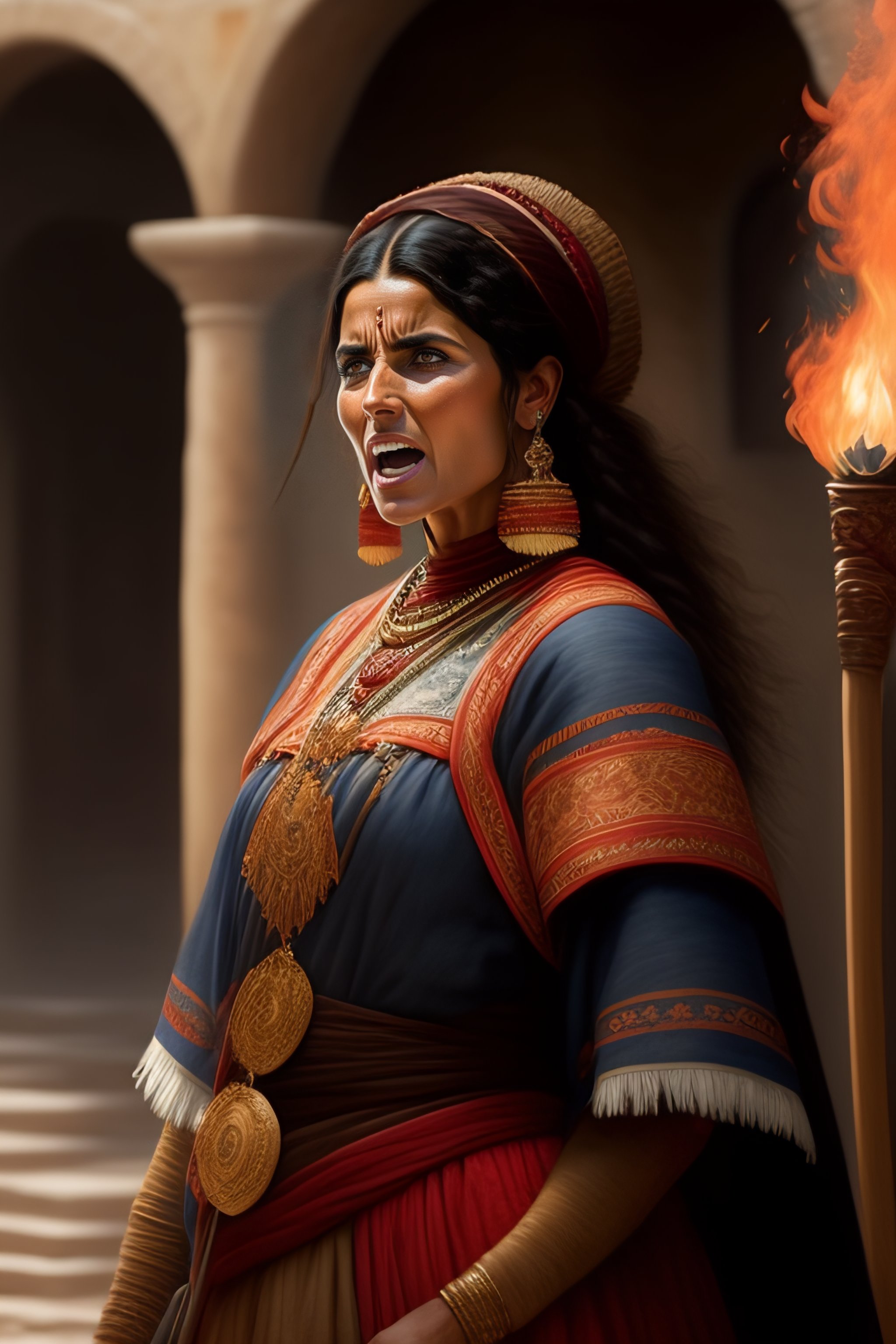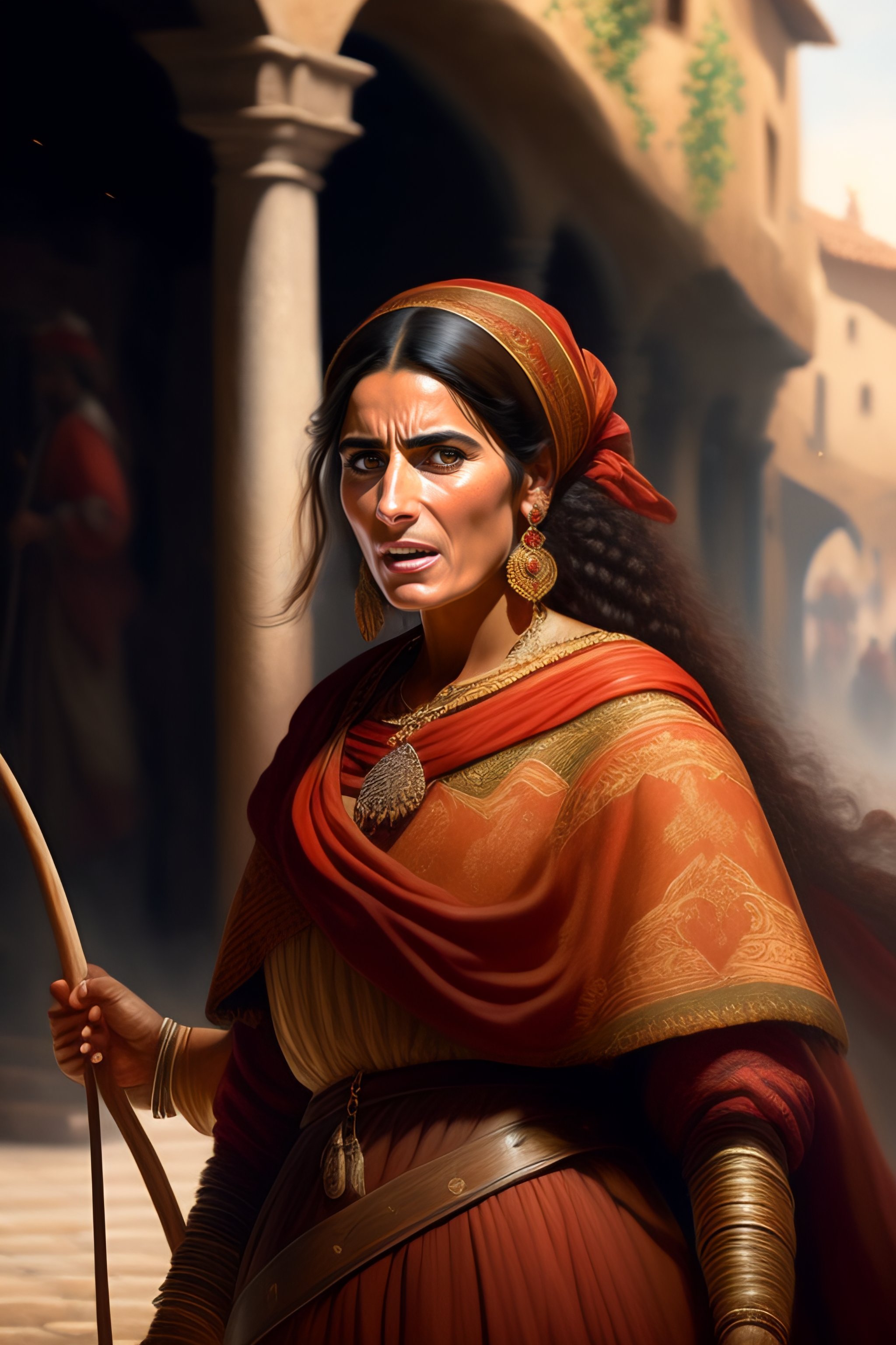 Portrait of a spanish peasant woman shouting, wearing aragonese regional dress, vaturra, with a bayoneted stickt in her hand, detailed face, in the background the streets of an ancient city in flames, highly detailed, cinematic lighting, digital art painting by greg rutkowski
