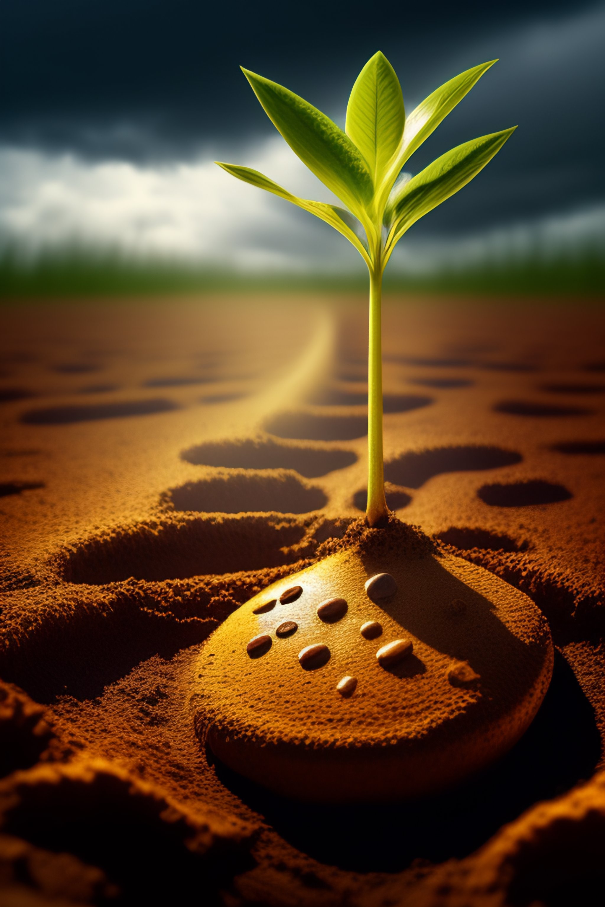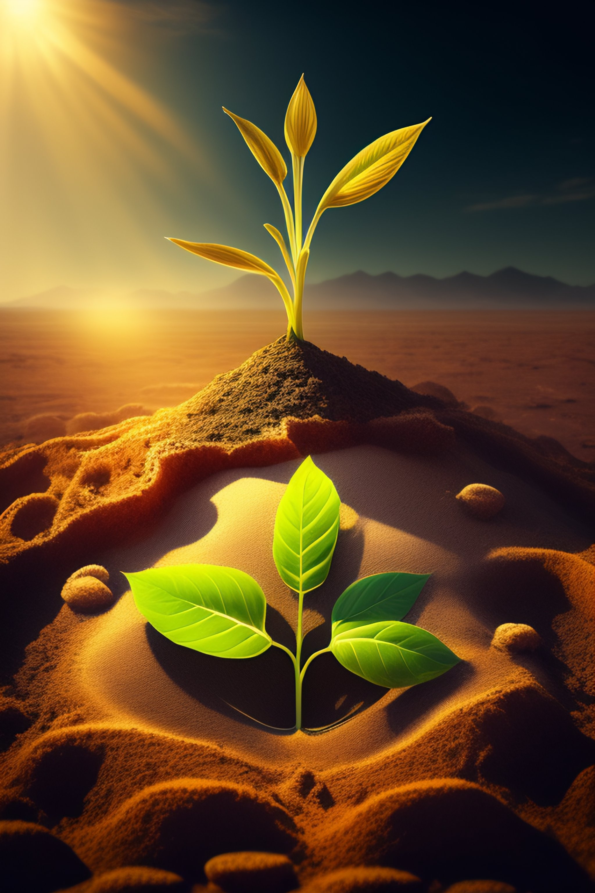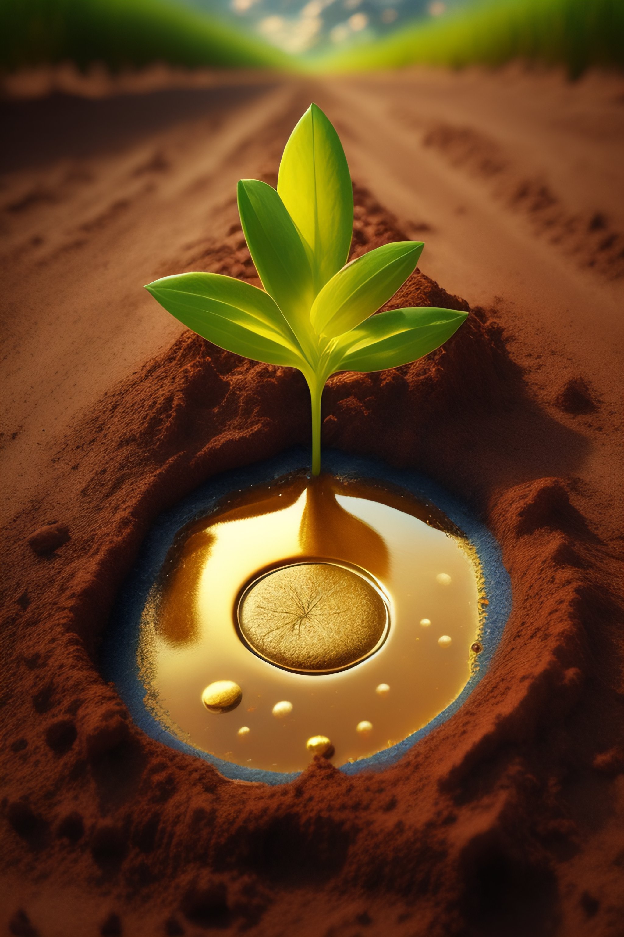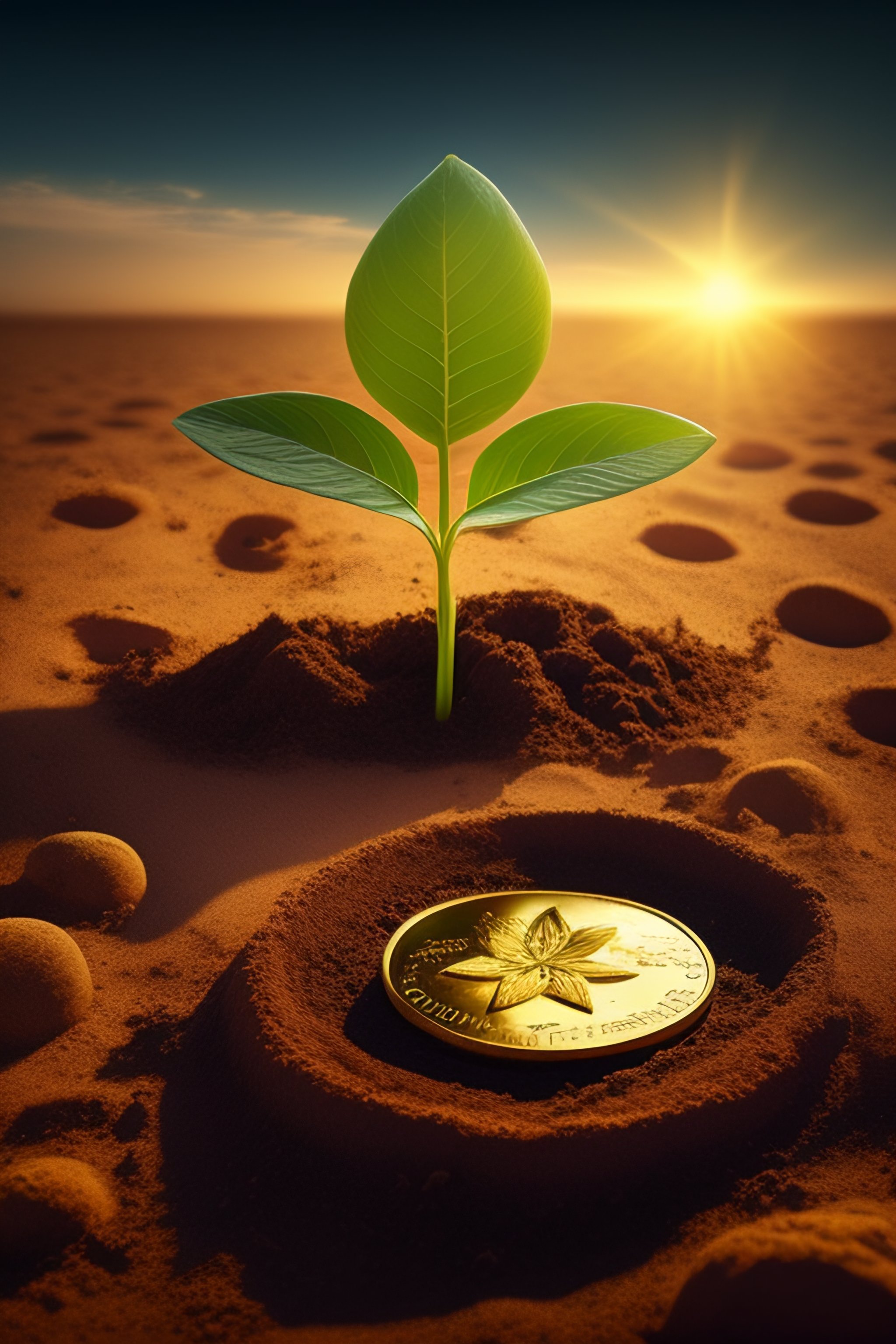 A christian image of a plant sprouting through the mud, a couple gold coins laying nearby, rays of god beaming down, faith, kindness, goodness, simpleness, true wealth