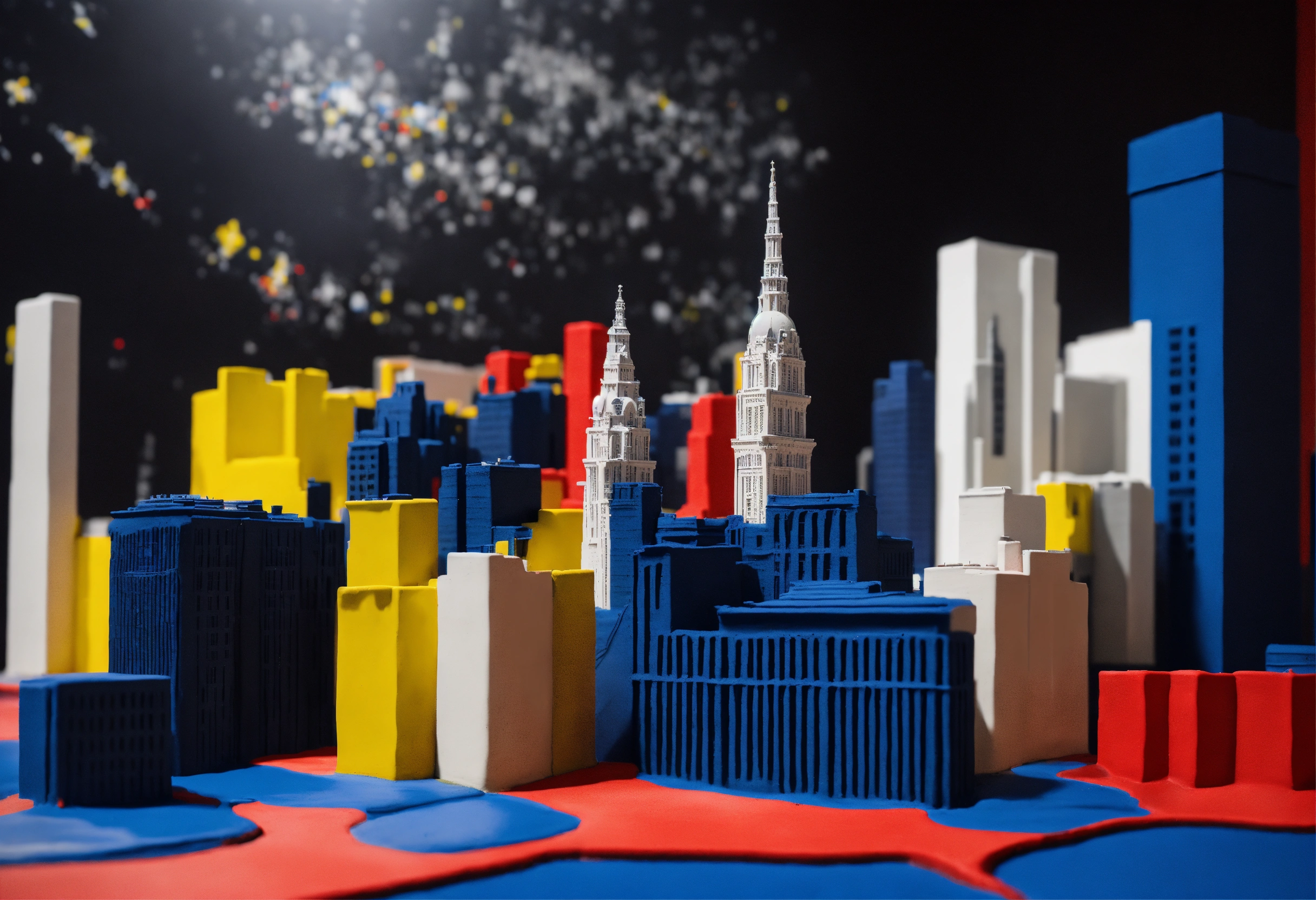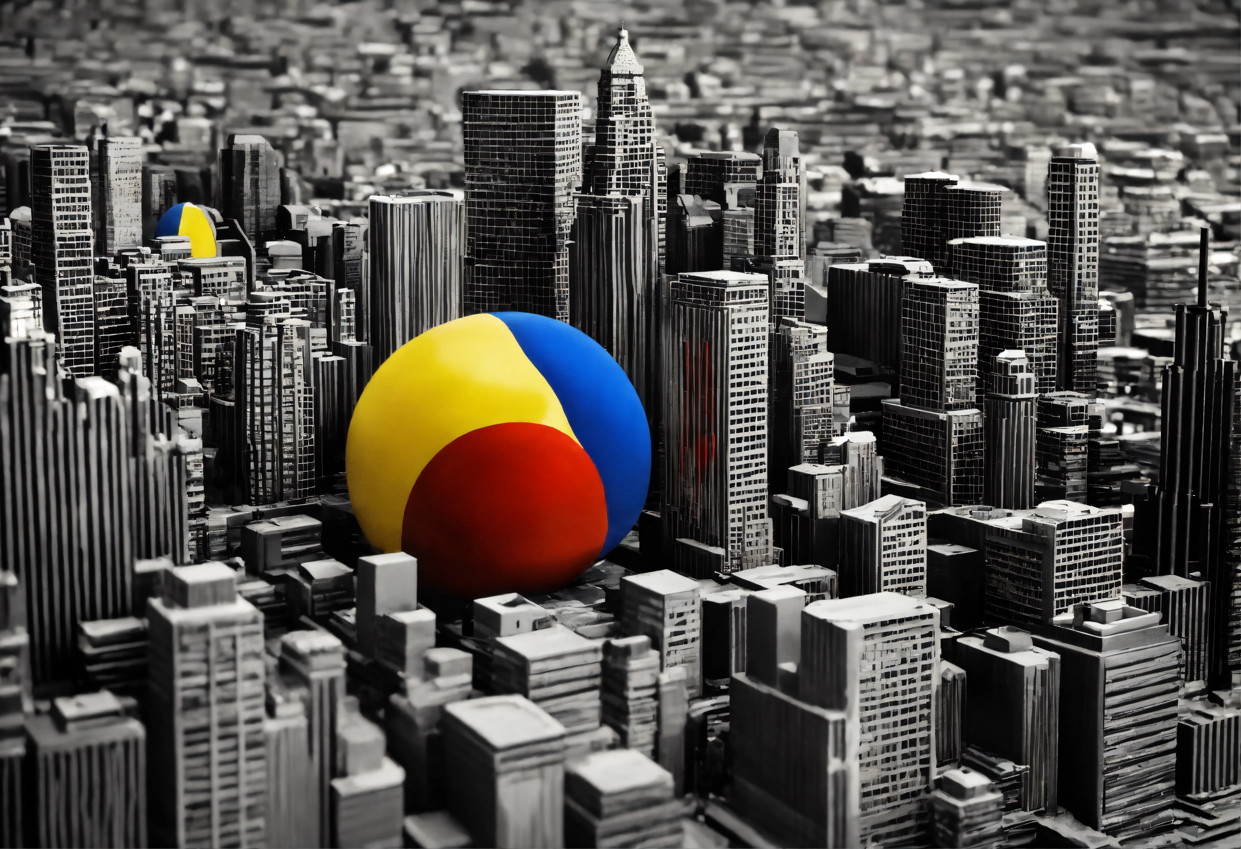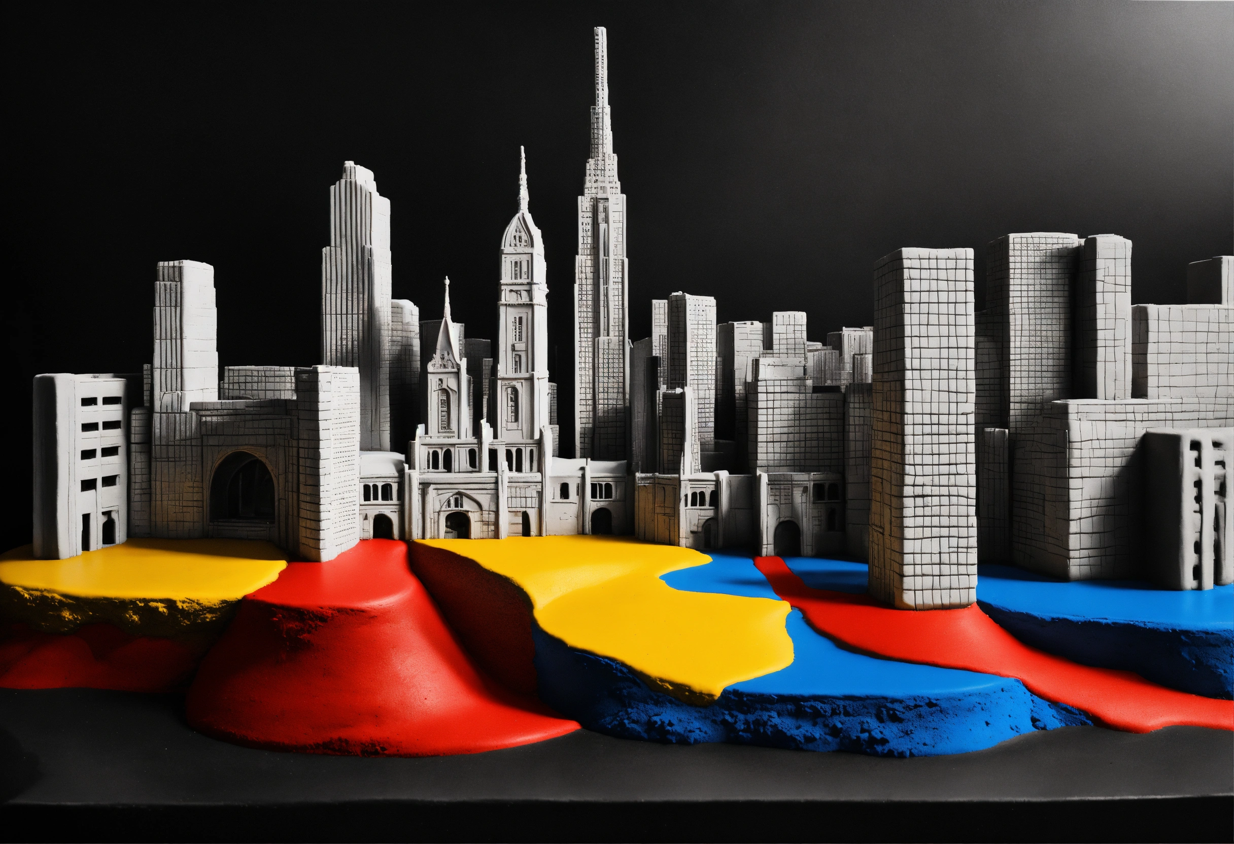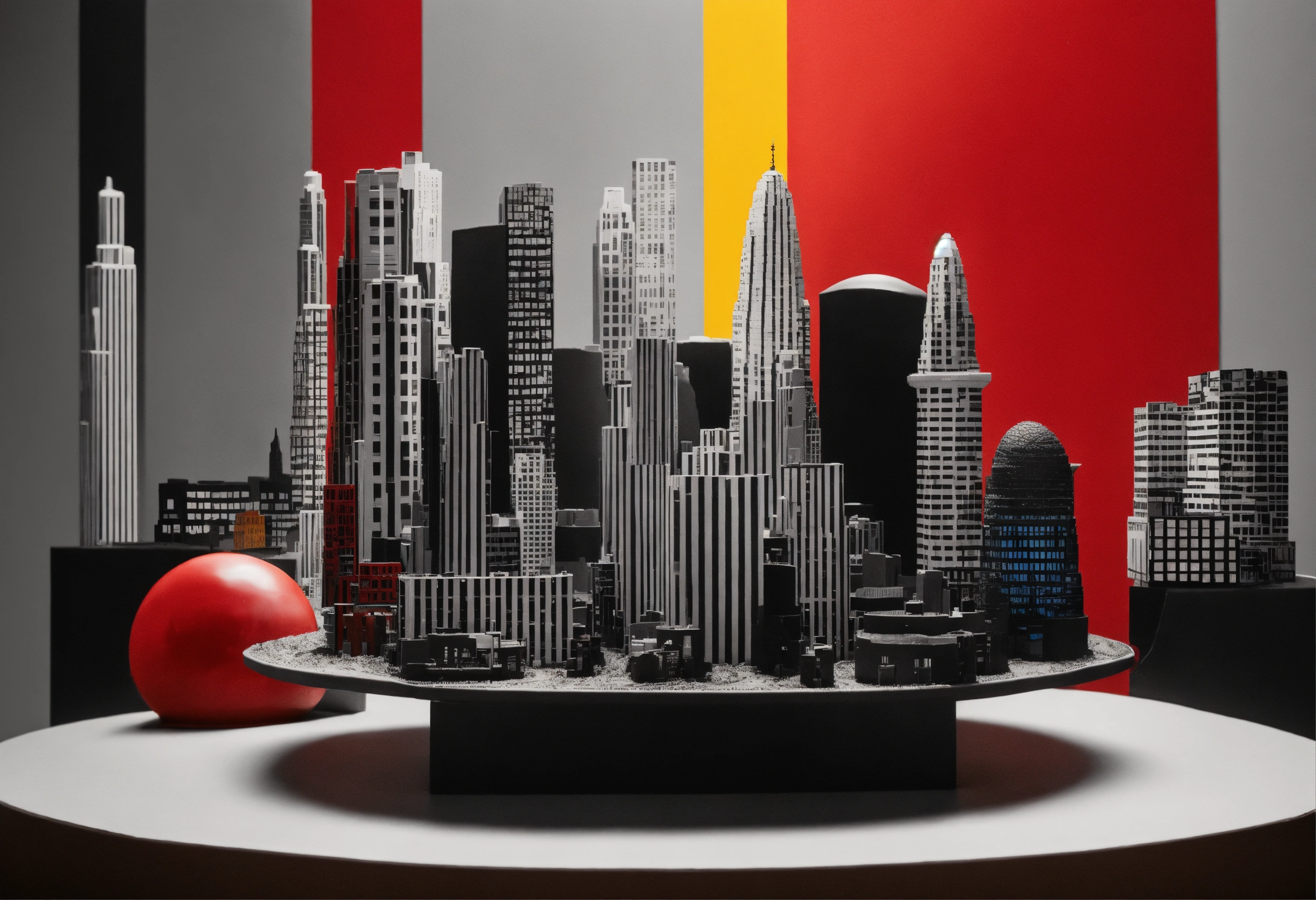 Black and white, primary colors, 3d abstract modeling clay city skyline, gentleman photography, dreamworld, immersive inspired city skyline, inside and out spheric, rené magritte inspiration.