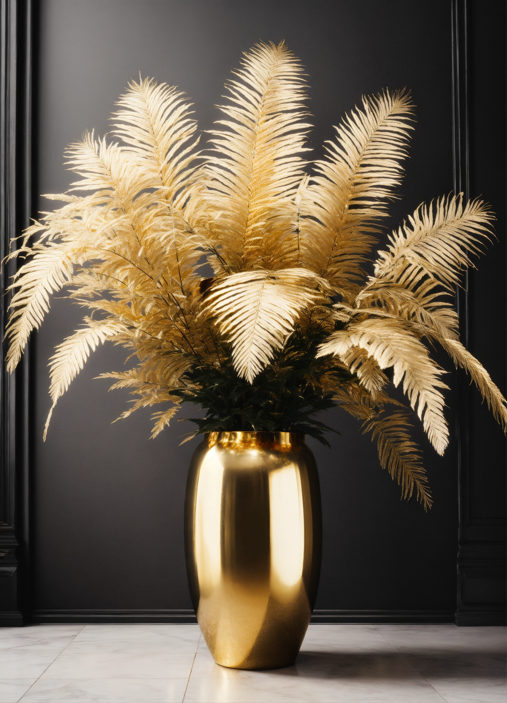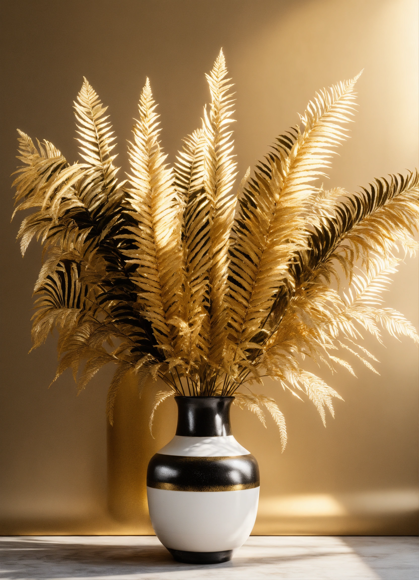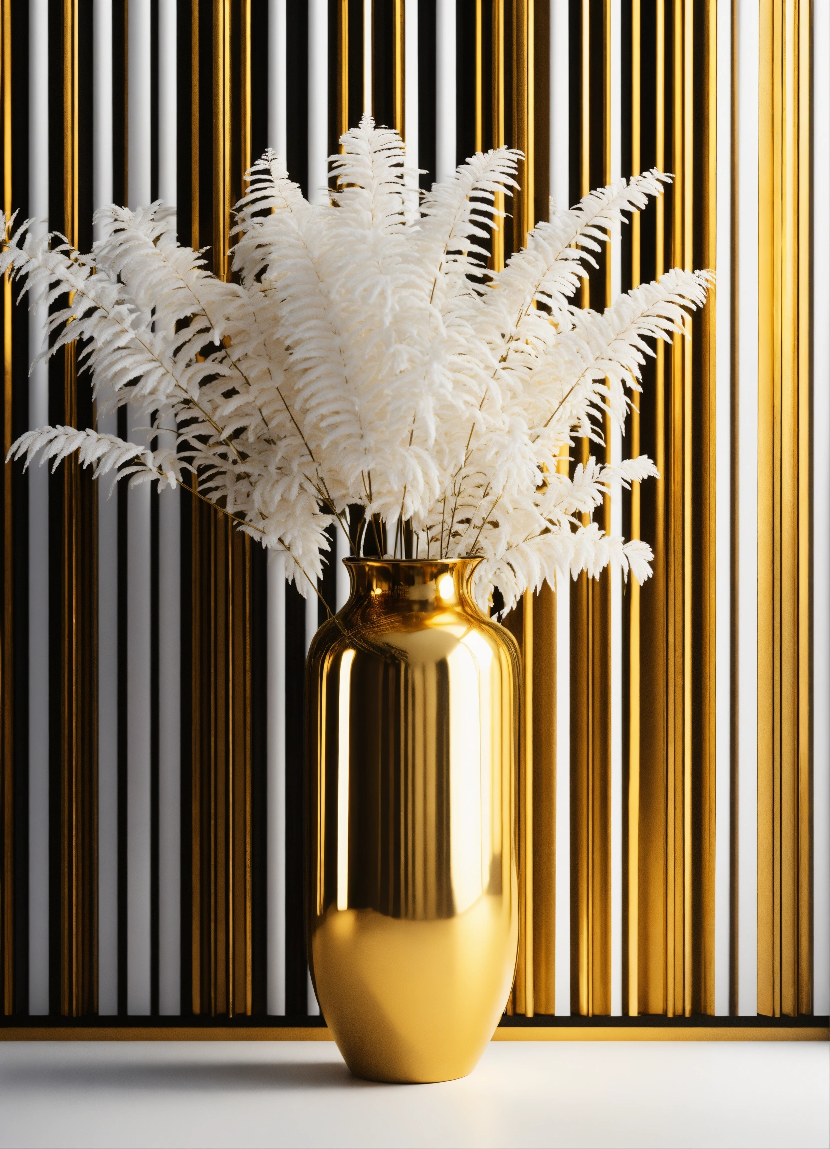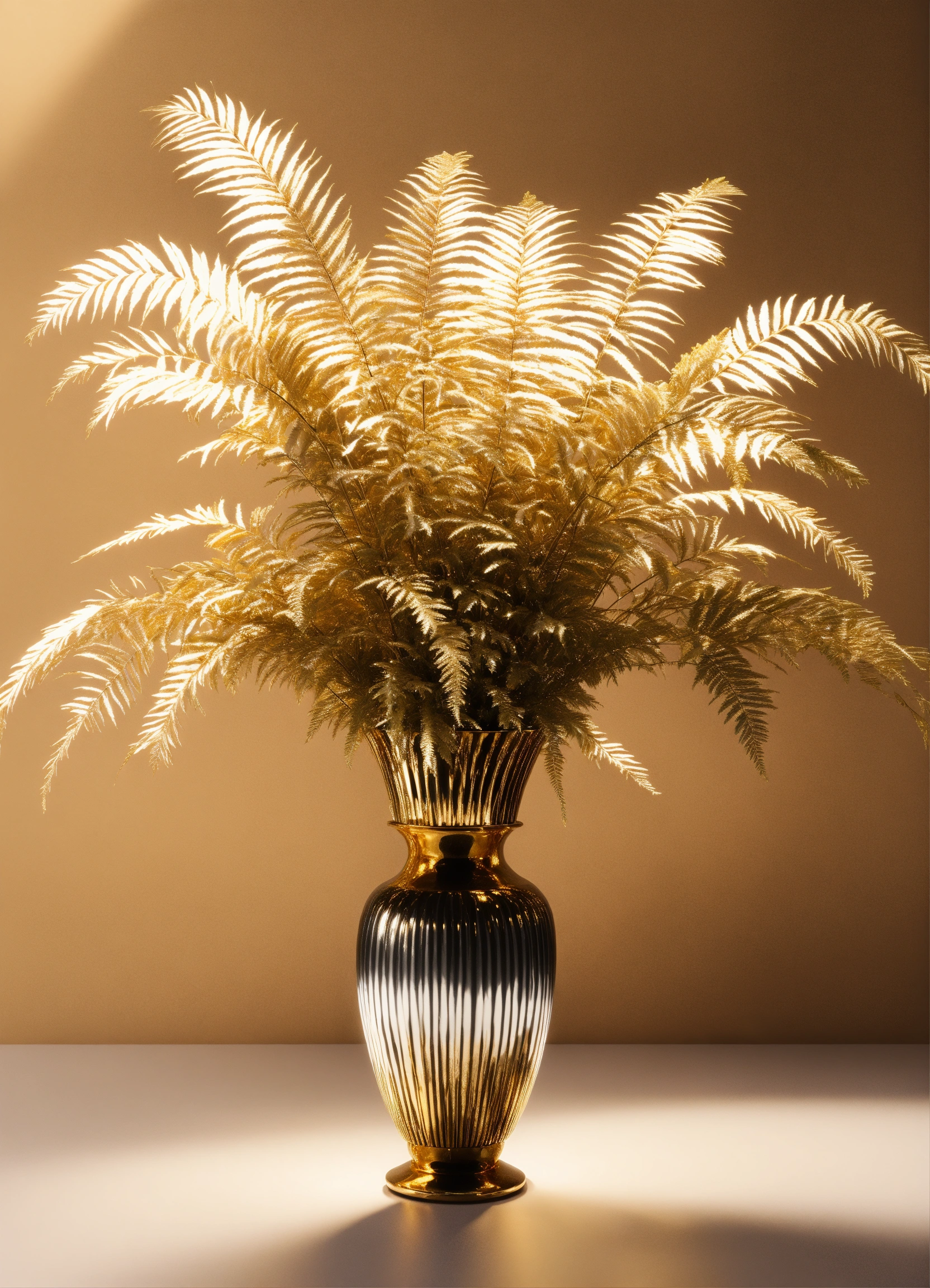 Tall fluffy white ferns in a gold and black vase - bright white background - 3d - 8k cinematic
