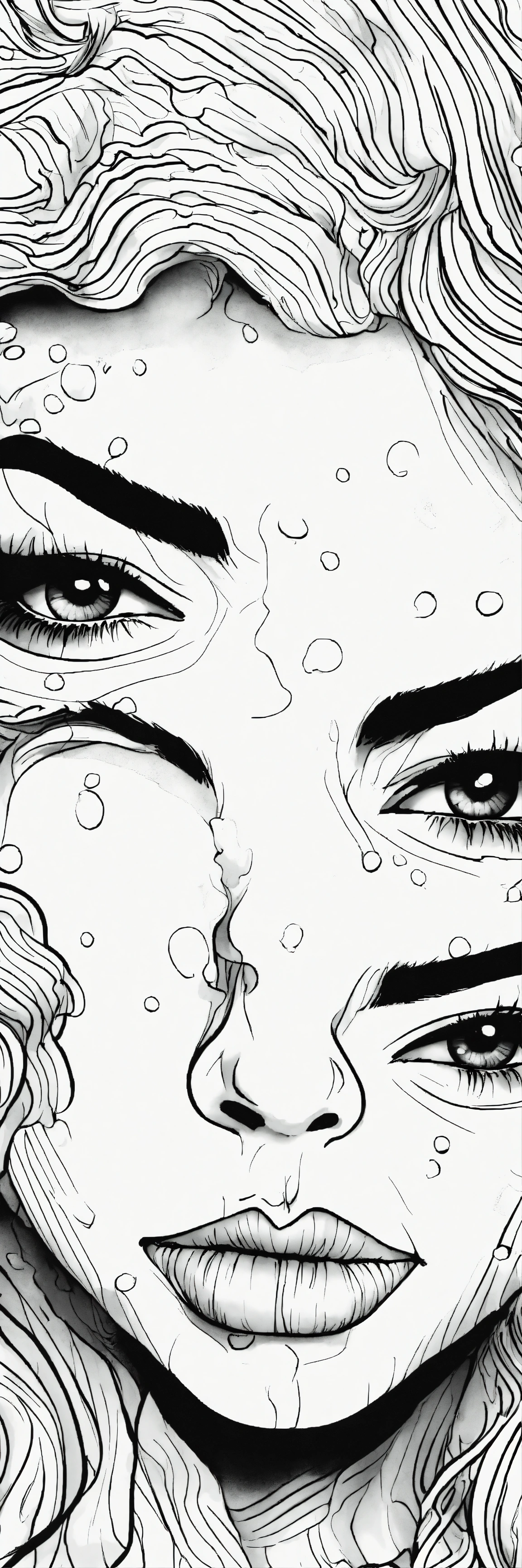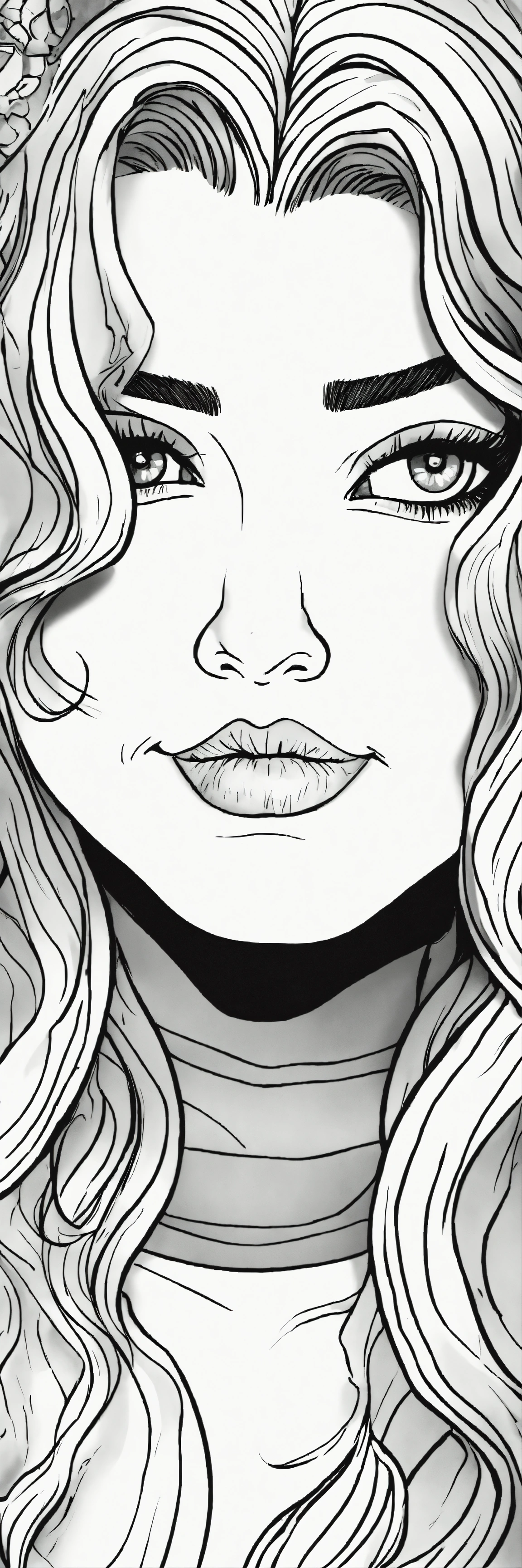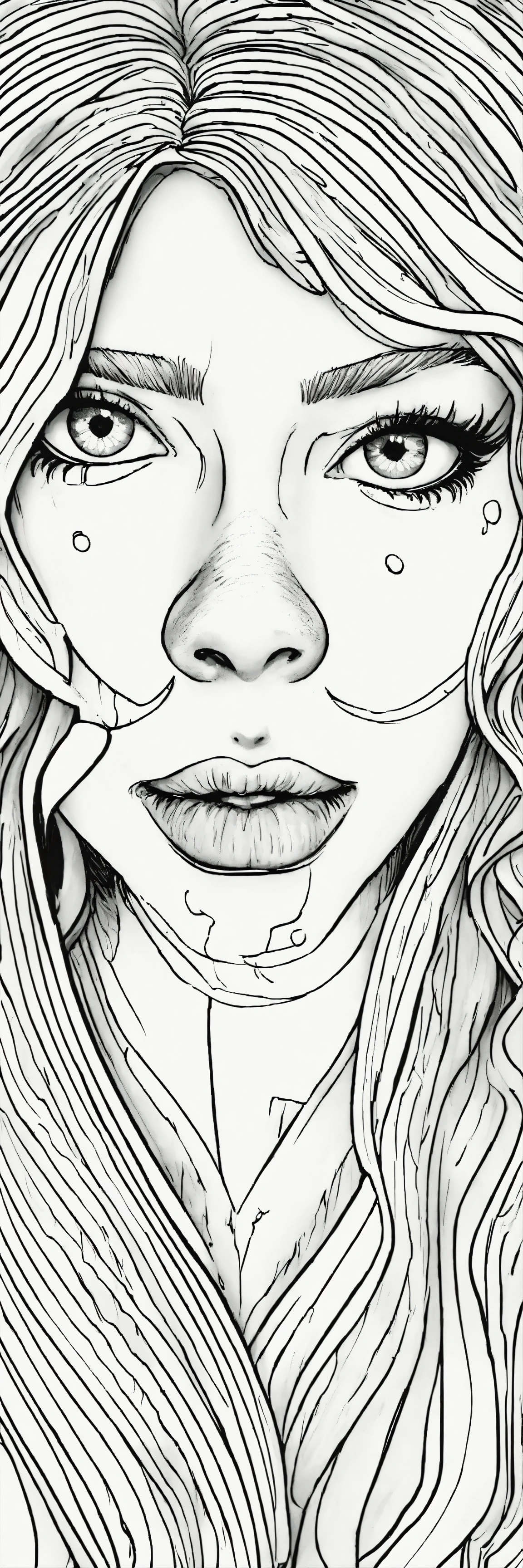Coloring page for adults, wavy lines, mad magazine female character idiot face, black and white, cartoon, white background