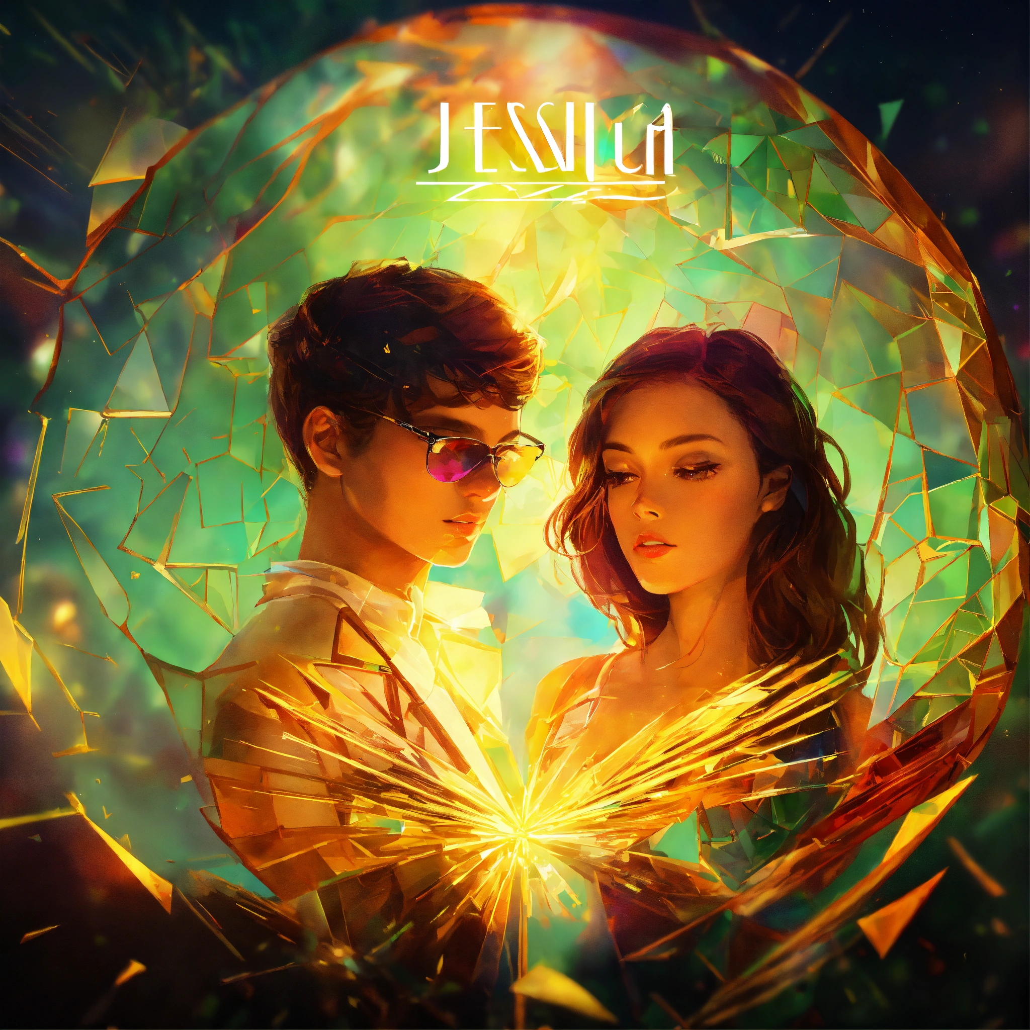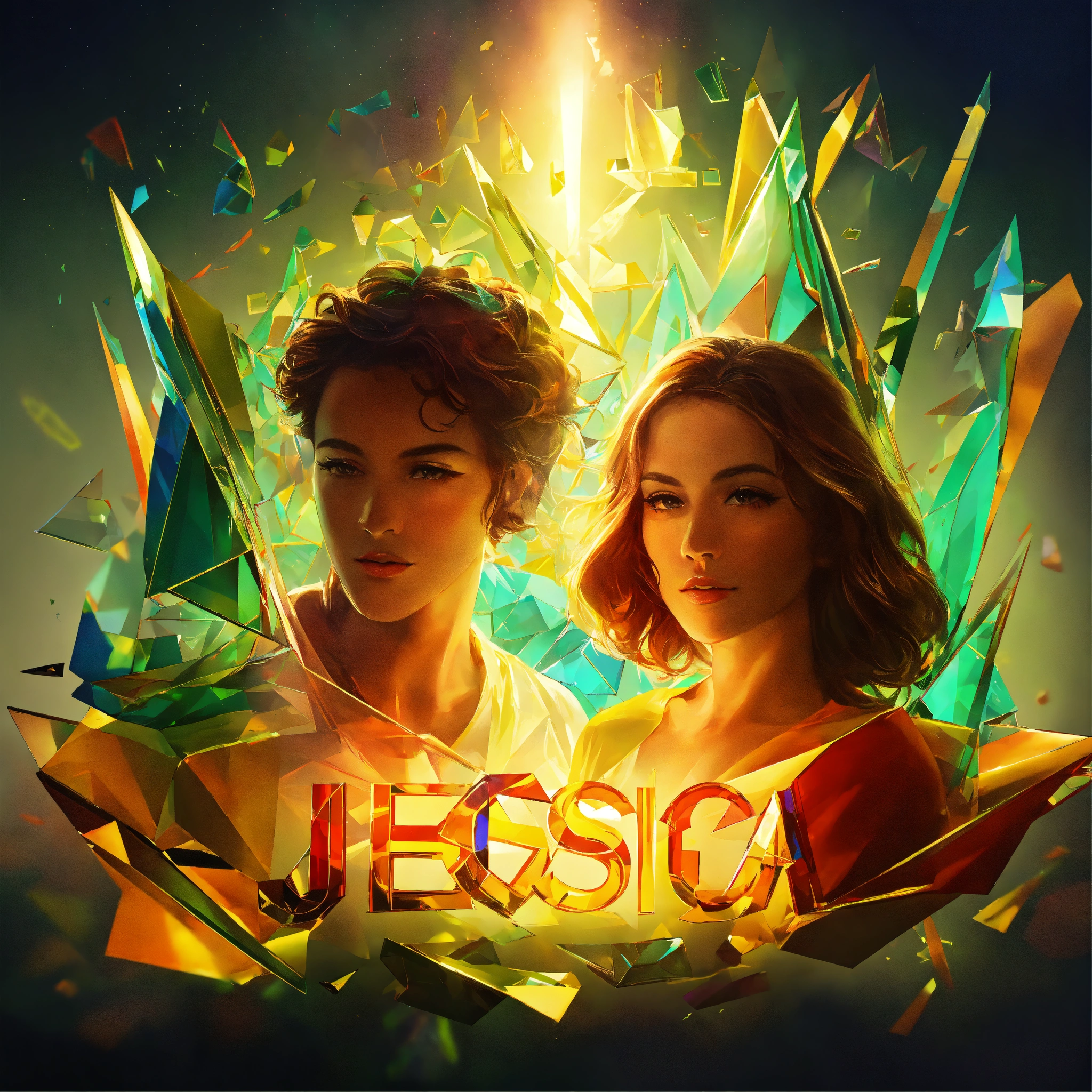 Give me an abstract and geometric image of the name, that looks well detailed "jessica" in vibrant colors, with a shattered glass effect that makes the letters appear to float in space.