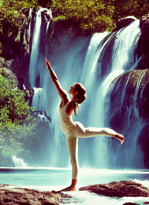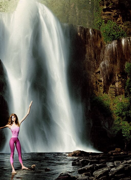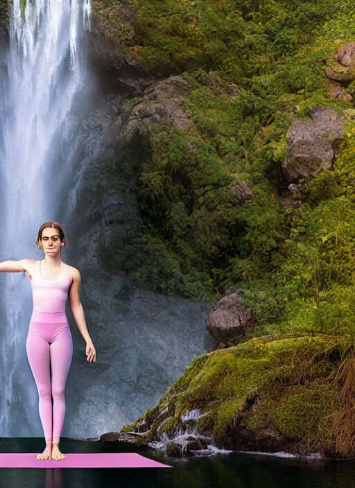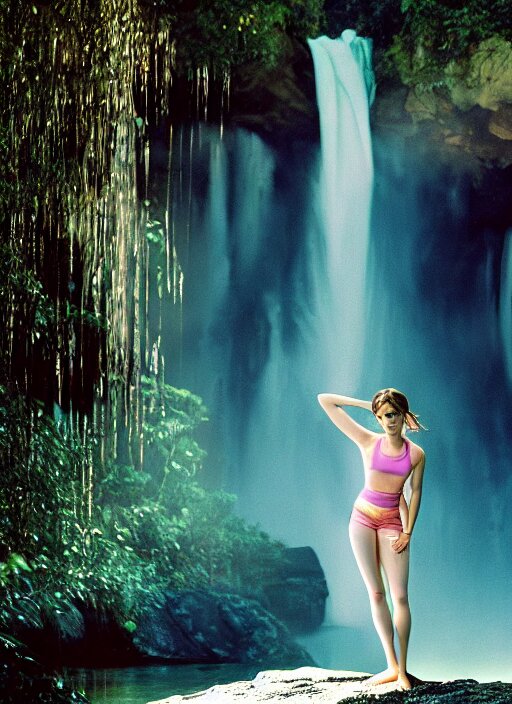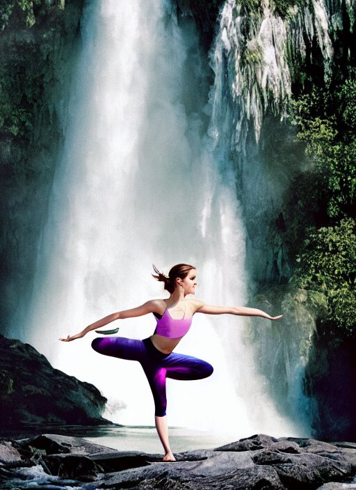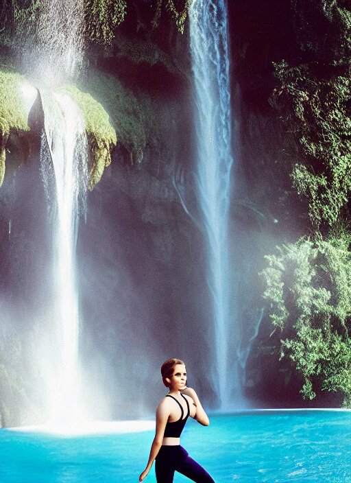 Portrait photograph of emma watson standing in a yoga pose wearing translucent clothes standing underneath a waterfall, natural light, photoreal, shot by david lachapelle