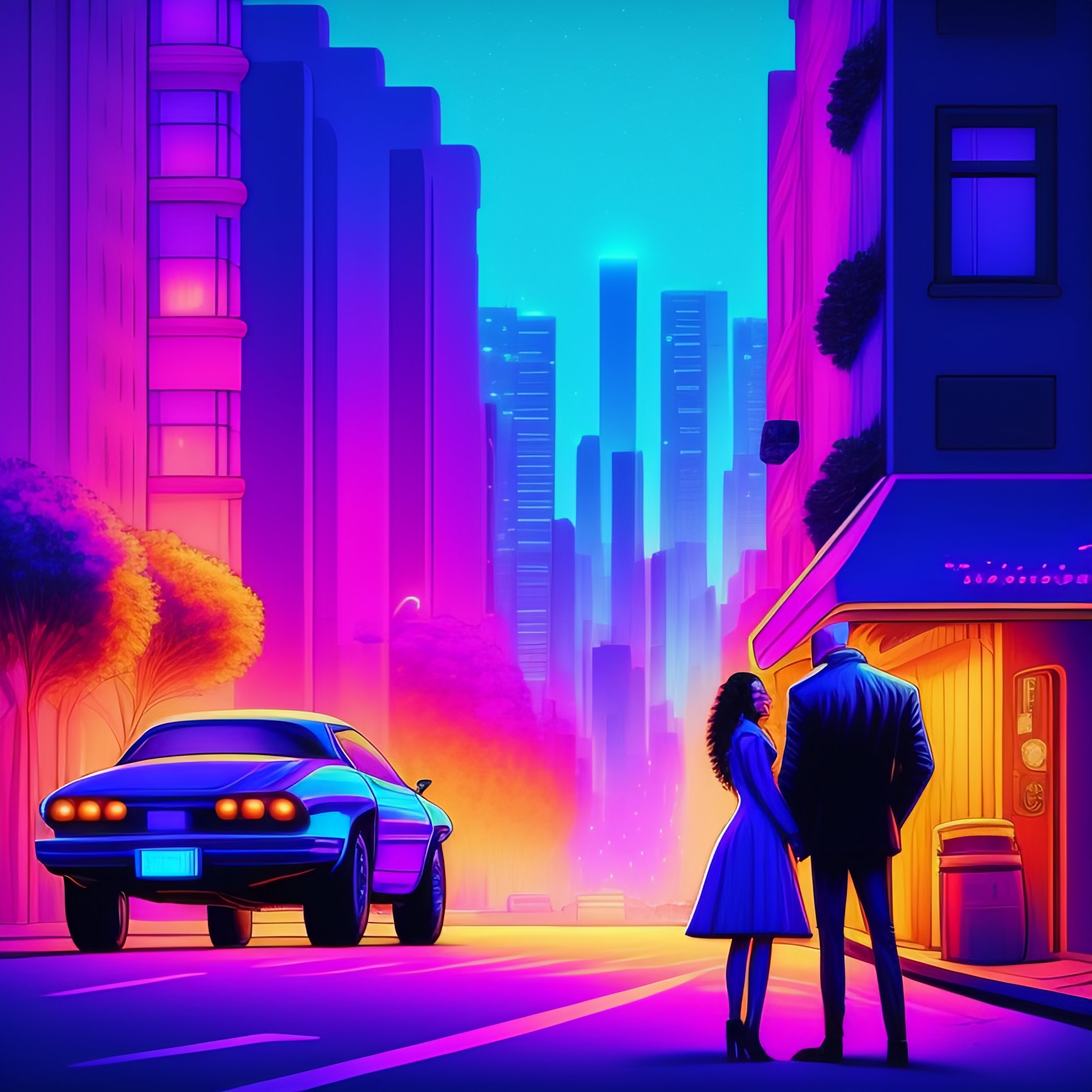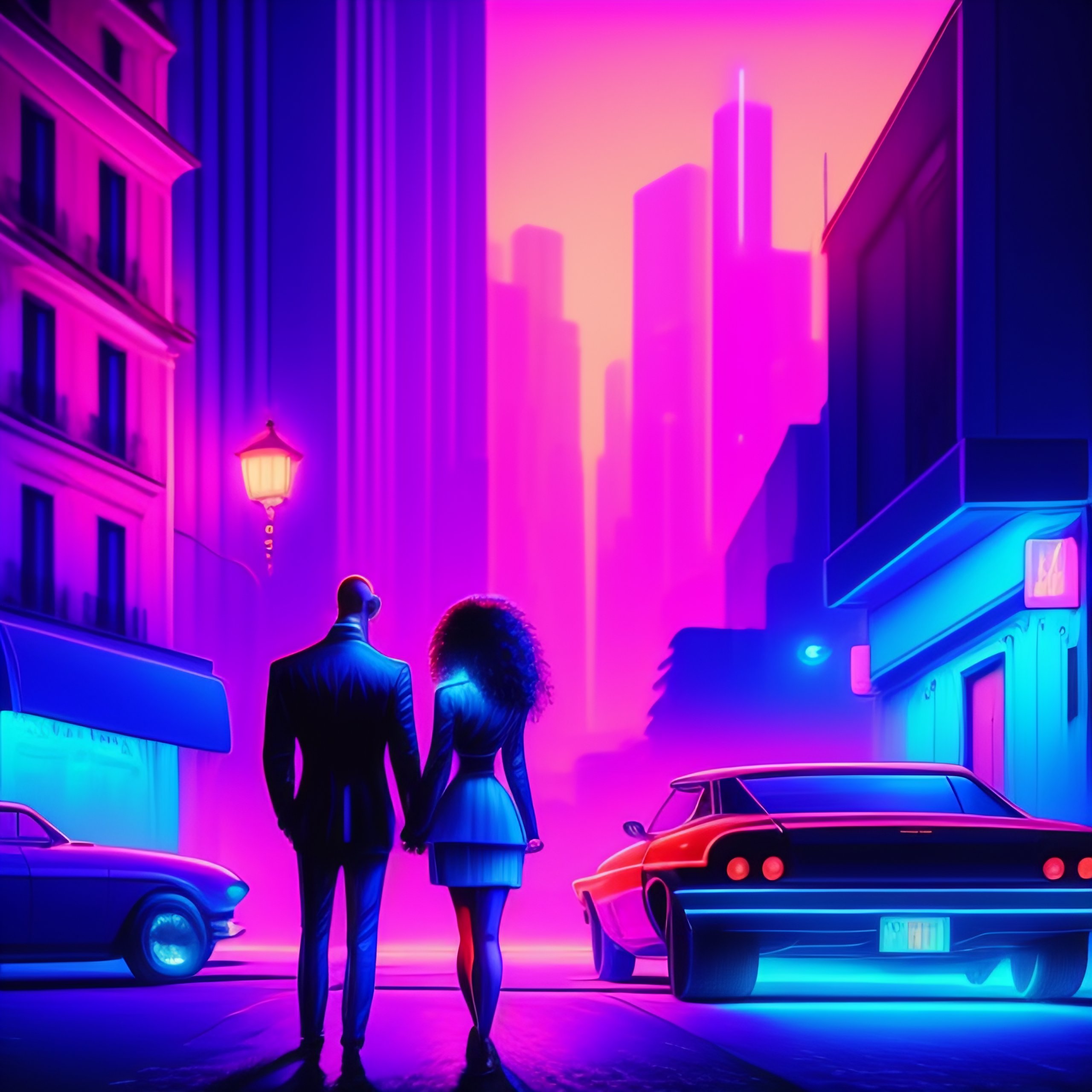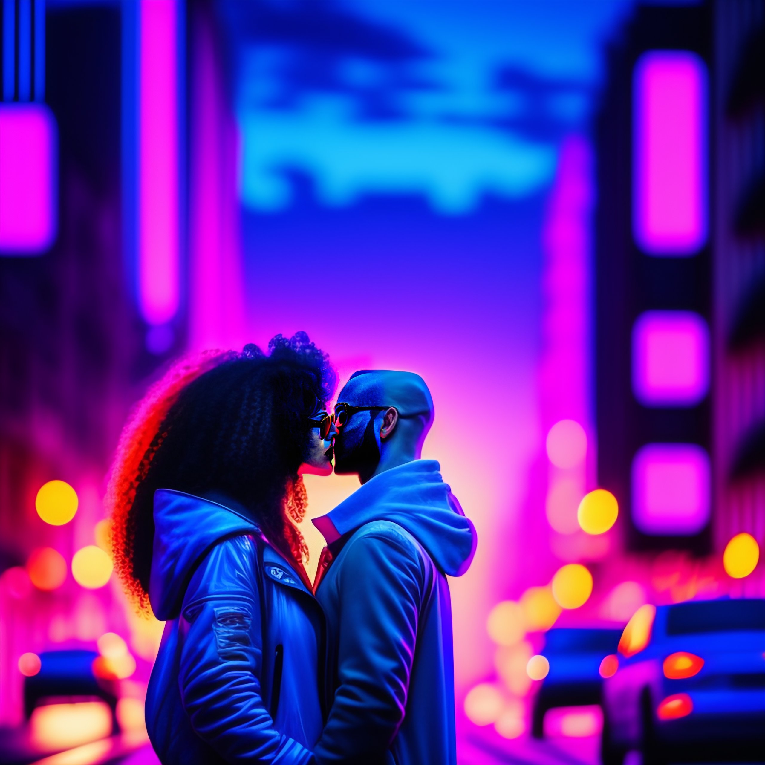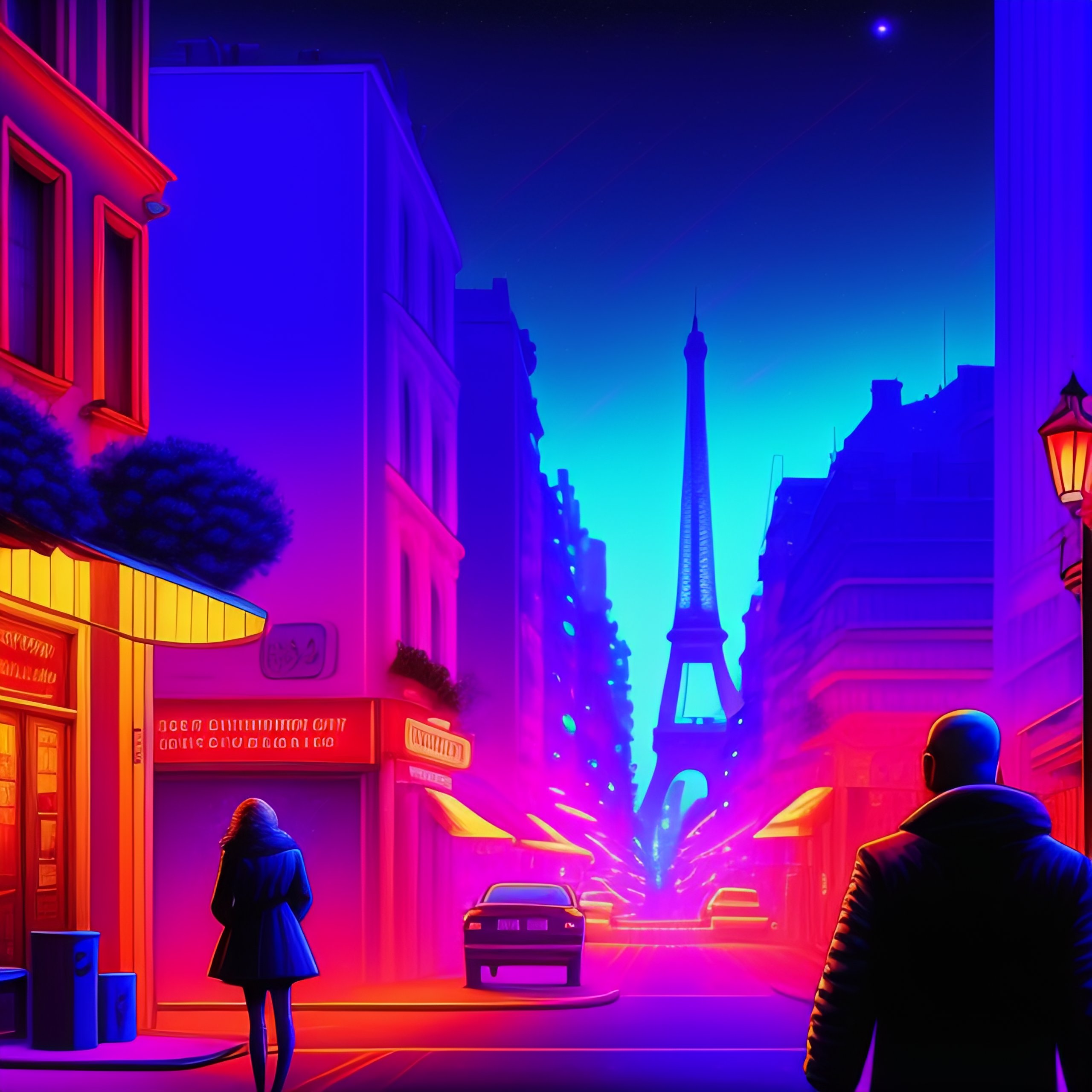 A street at night lit with blue and pink neon lights. we see a couple kissing in the middle of the street. the man is bald and has a beard and sunglasses. the woman is very beautiful and has long curly brown hair.the lights of paris are visible in the background. synthwave, comic strip atmosphere.