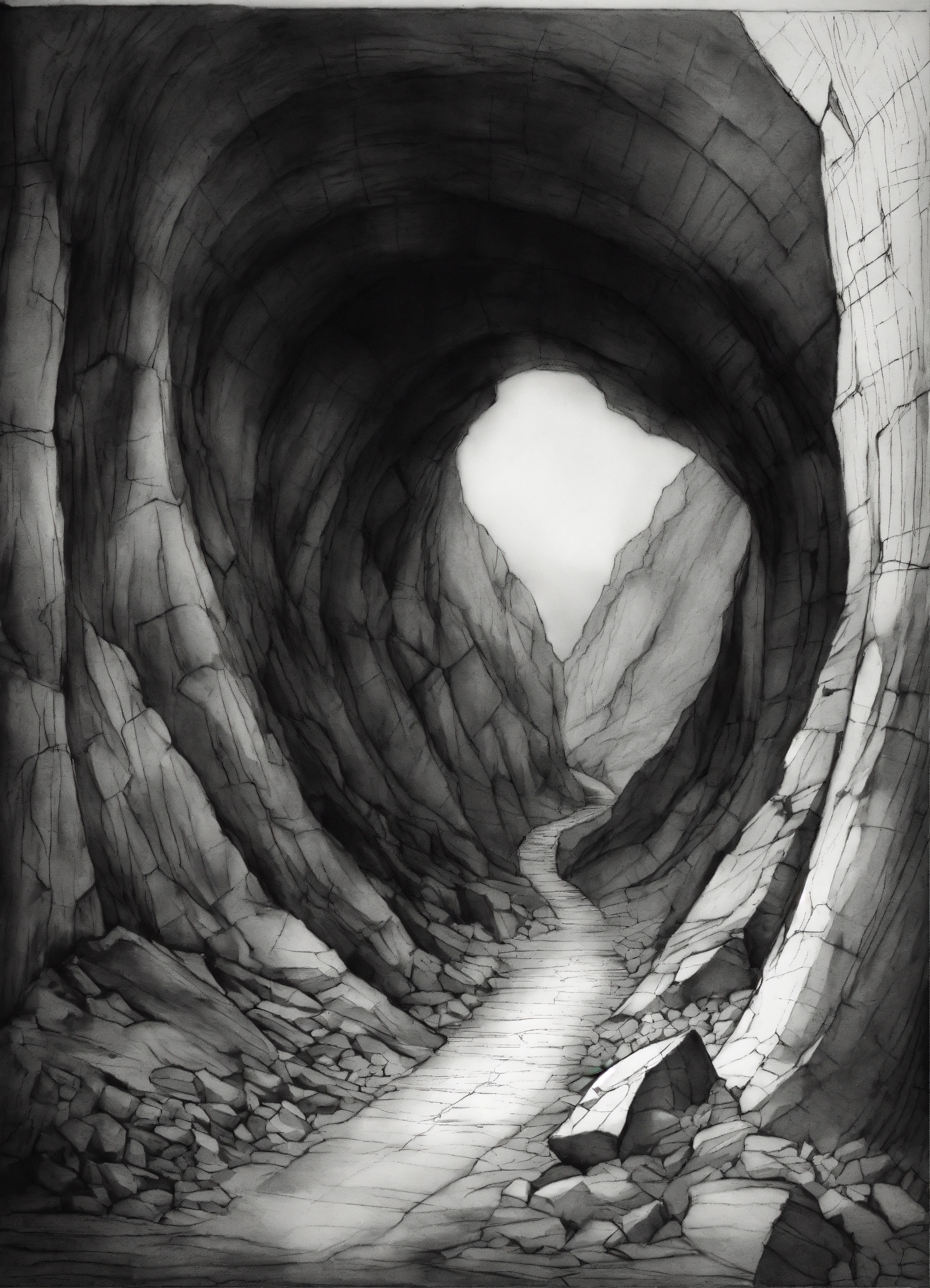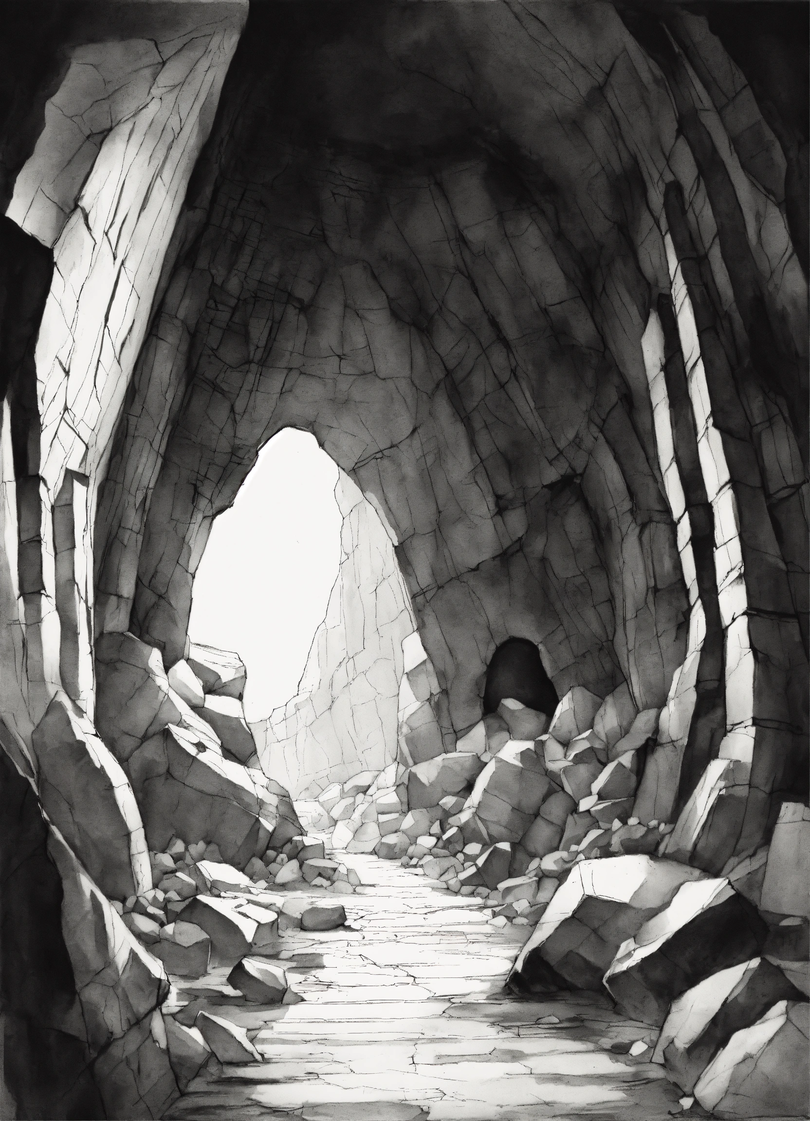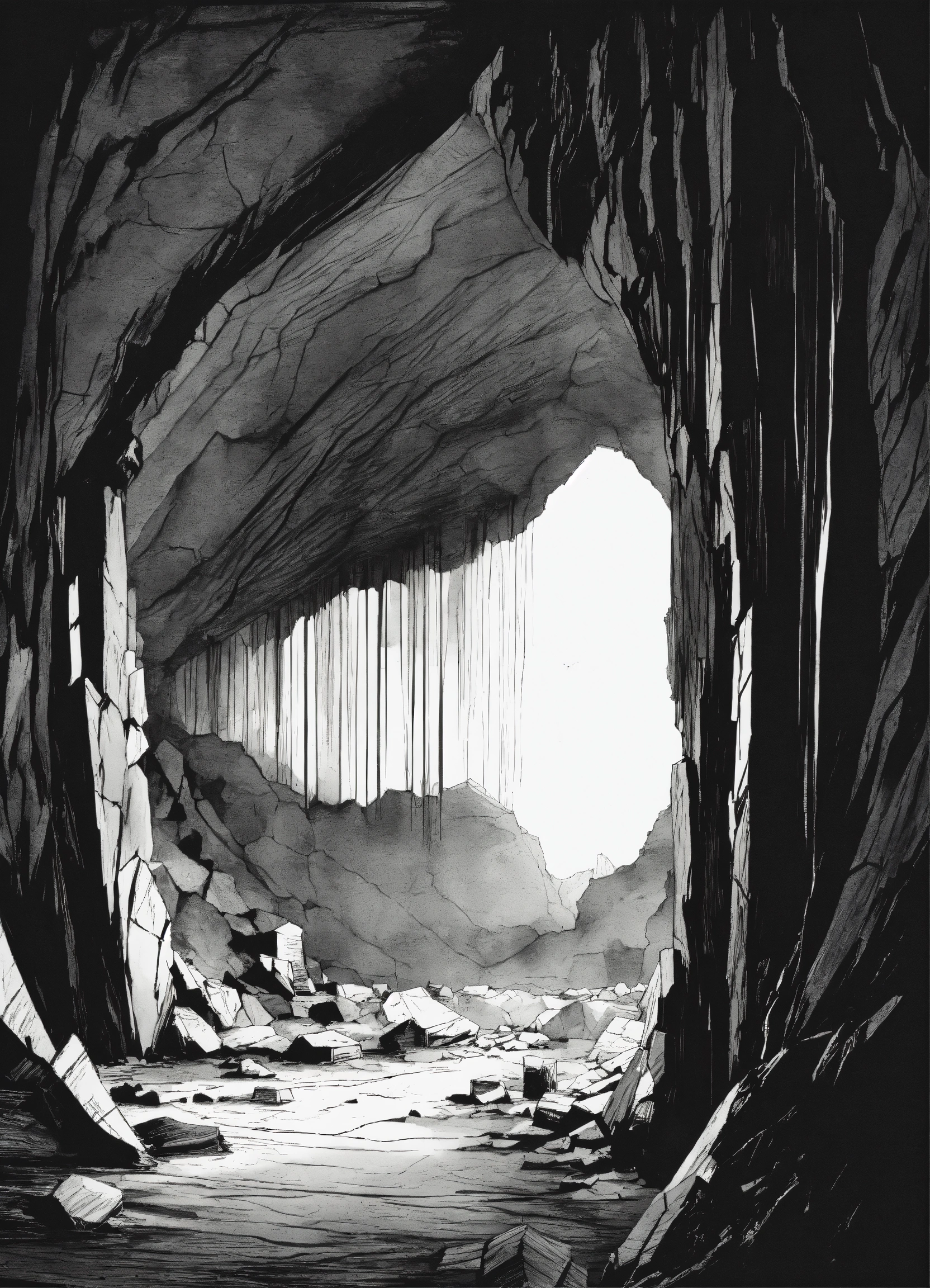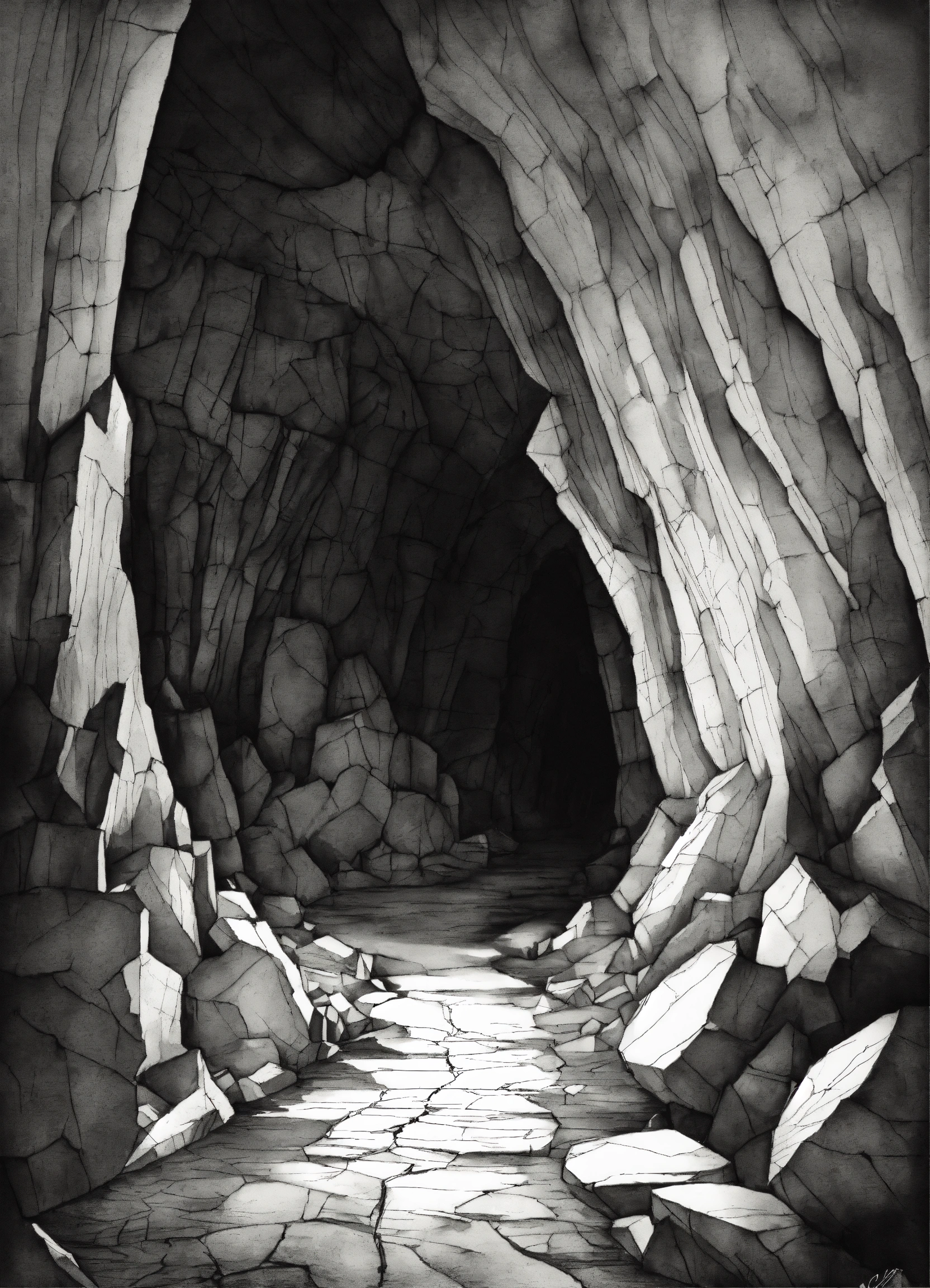 A black and white sketch of a cave with cracks