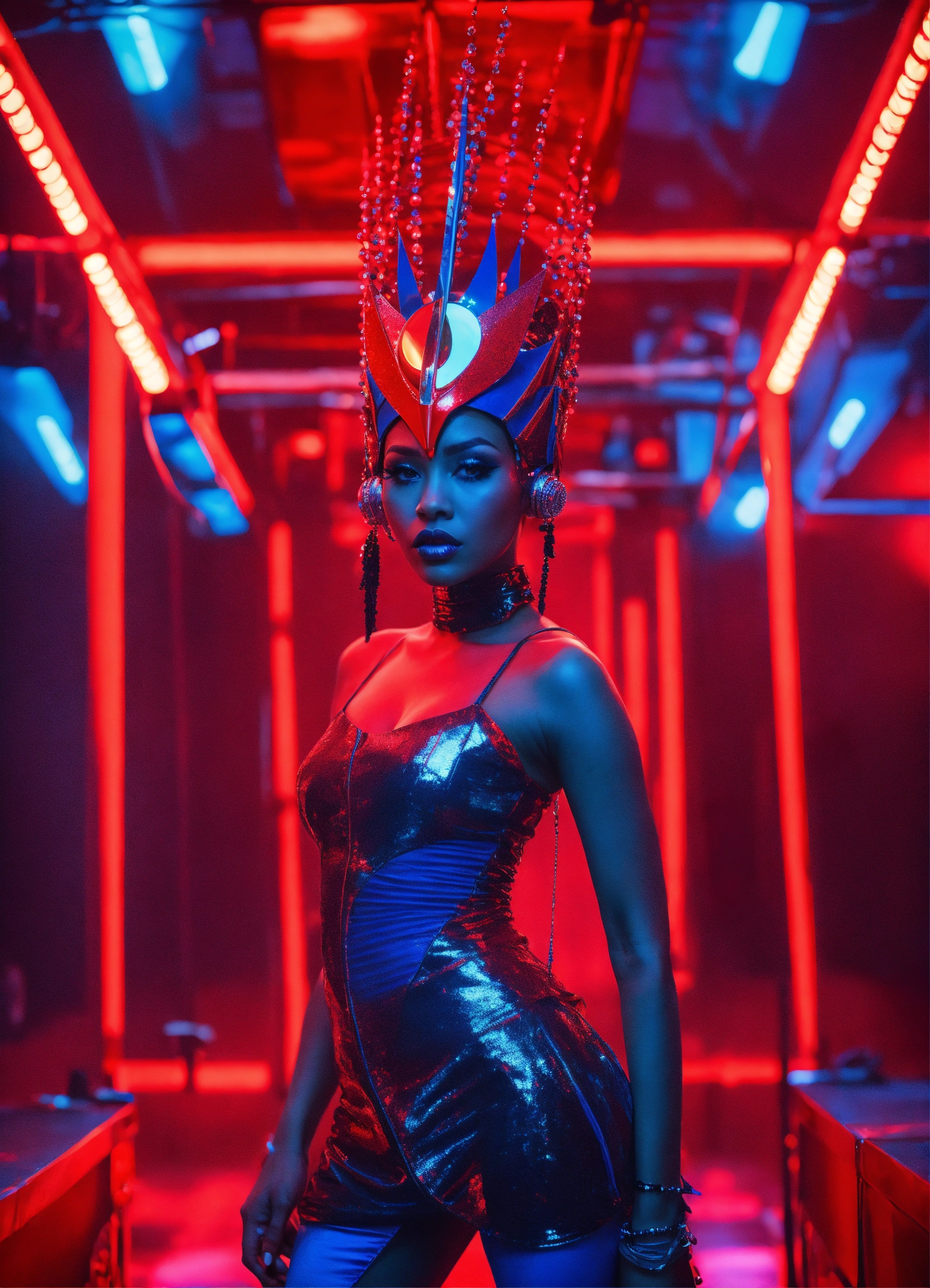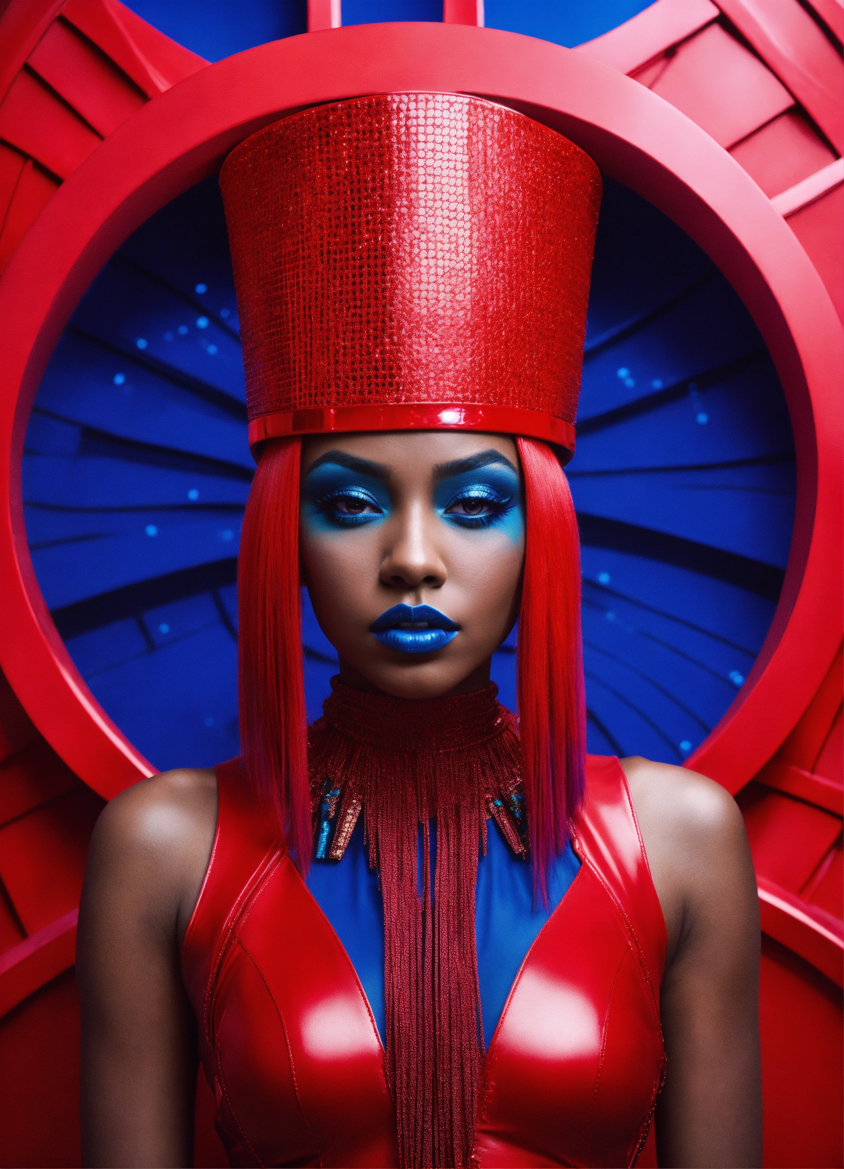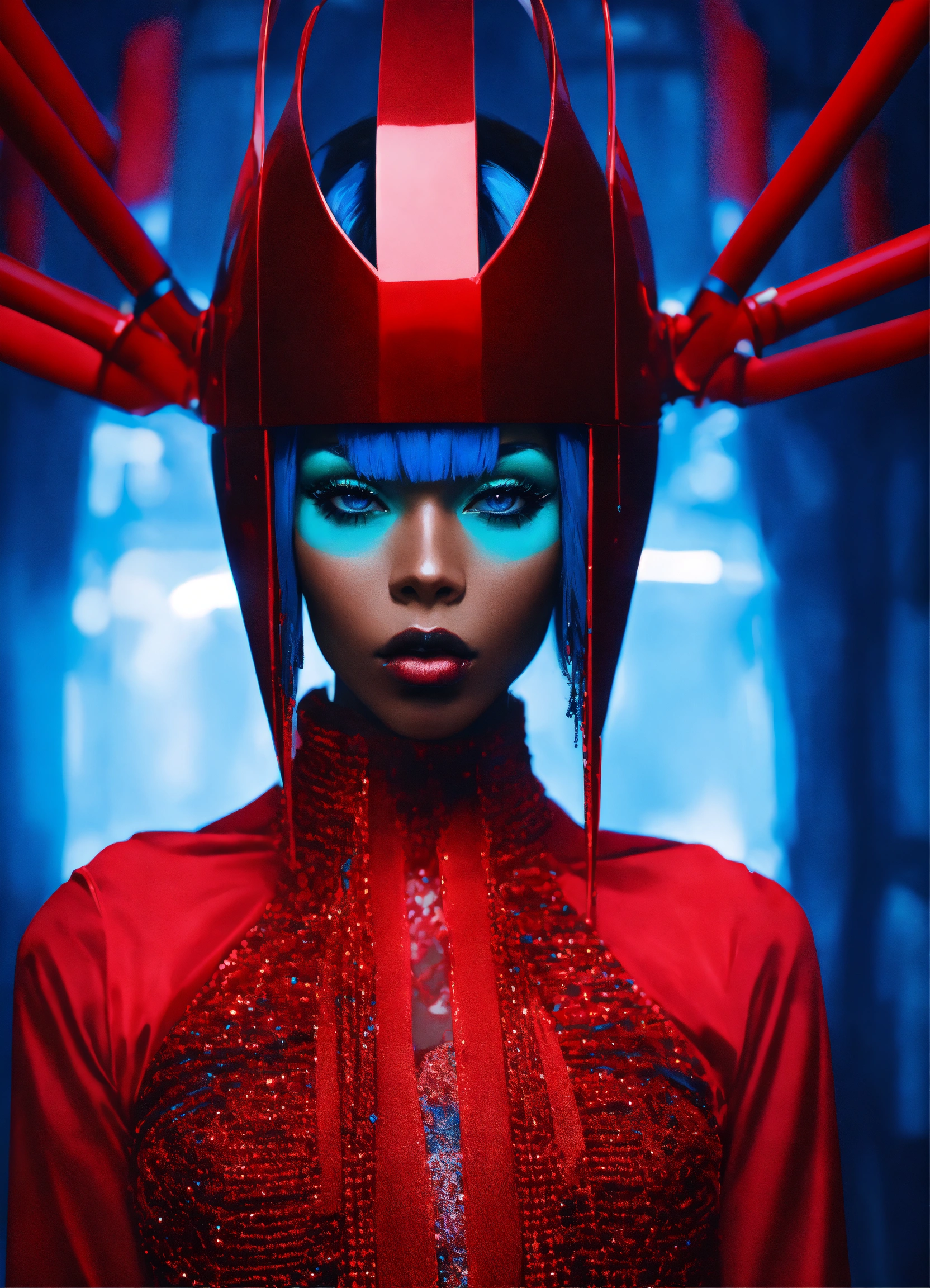 A beautiful blue haired size 9 black female pop artist all red sleek futuristic outfit, with huge headpiece center piece, clean makeup, with depth of field, fantastical edgy and regal themed outfit, captured in vivid colors, embodying the essence of fantasy, minimalist, film grain
