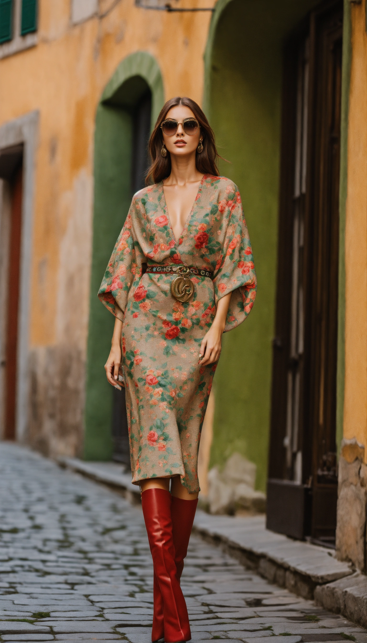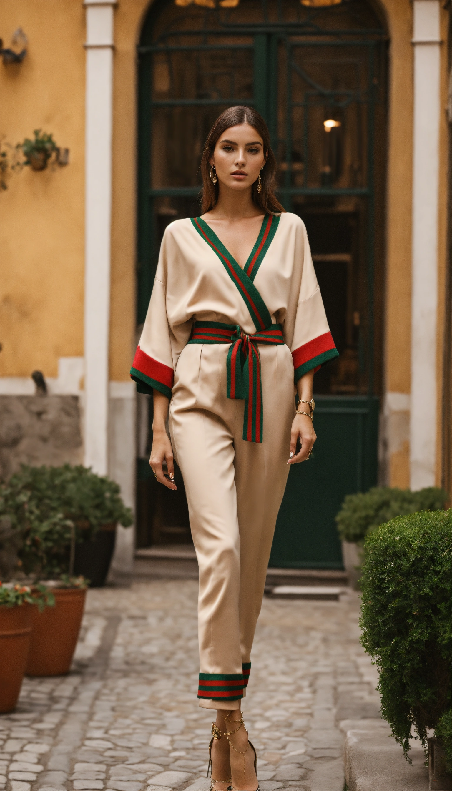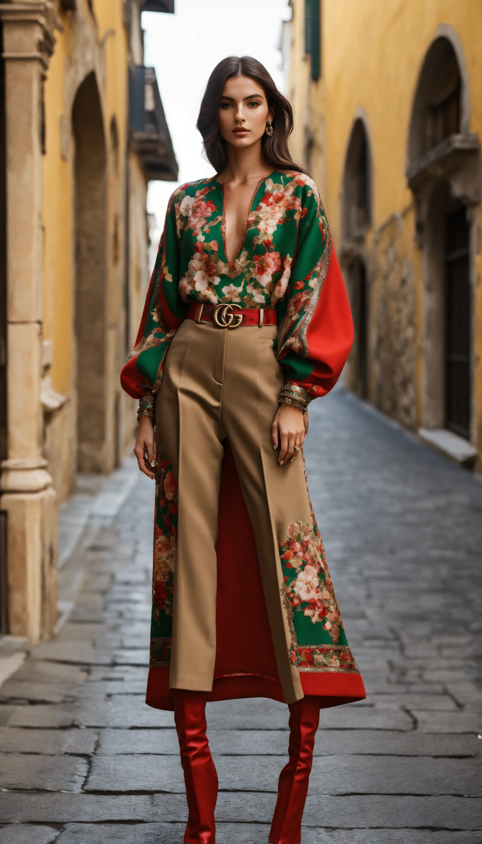 Ultra realistic full body photo of petite italian female model modeling upscale dolman sleeve gucci outfit in italy