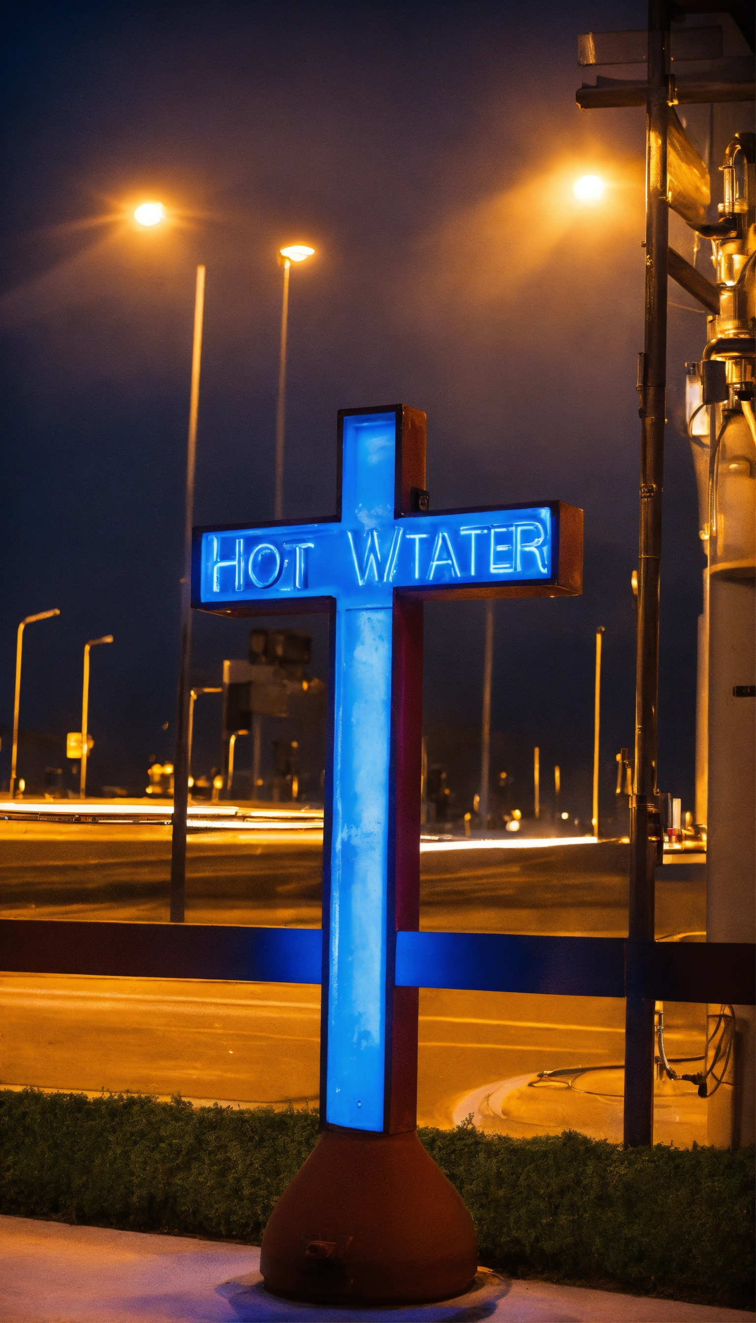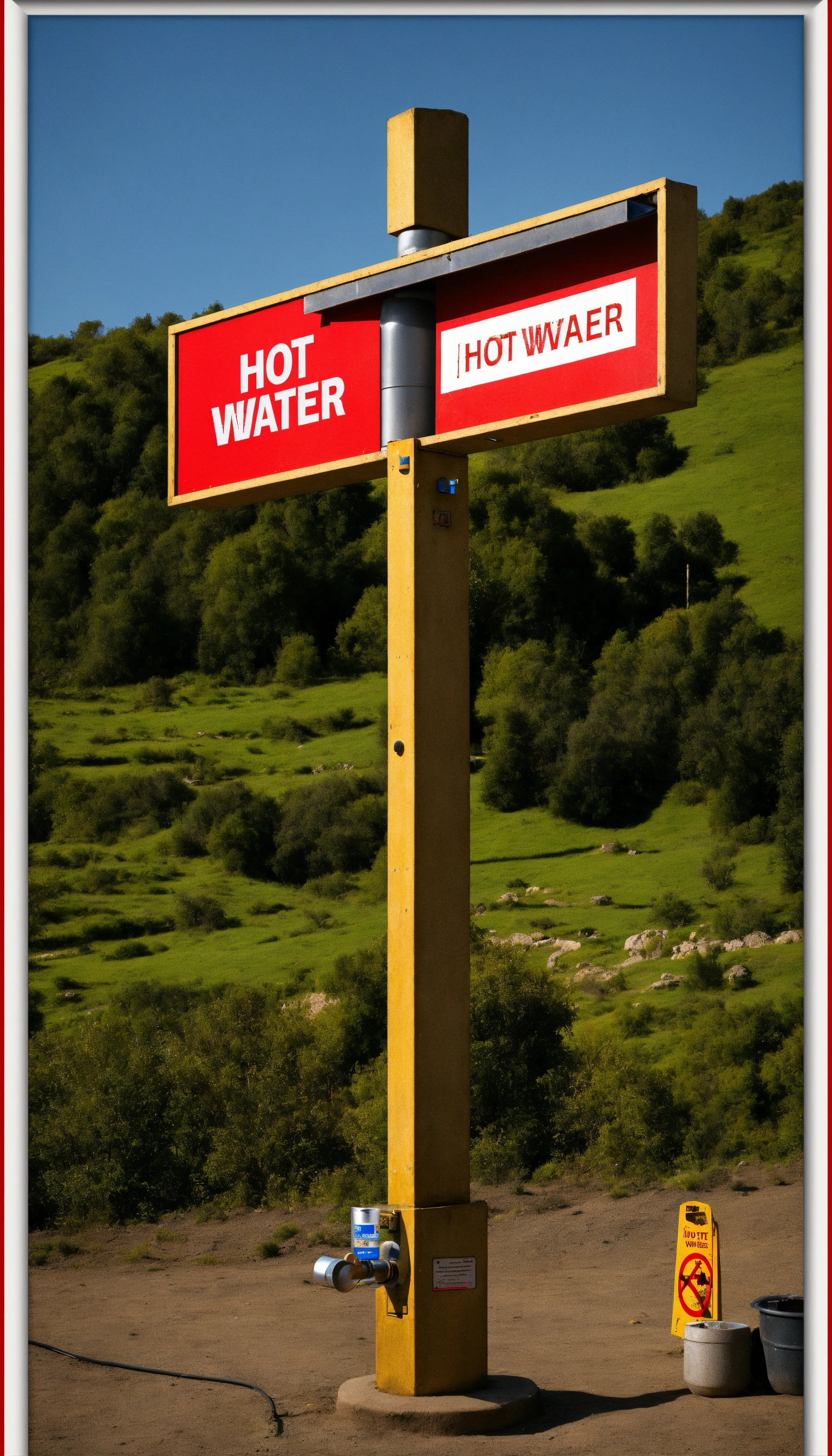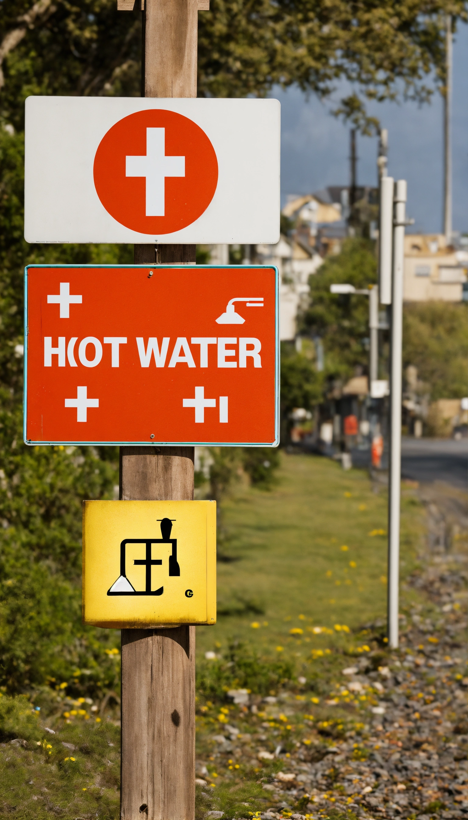 A sign saying hot water and a cross over it
