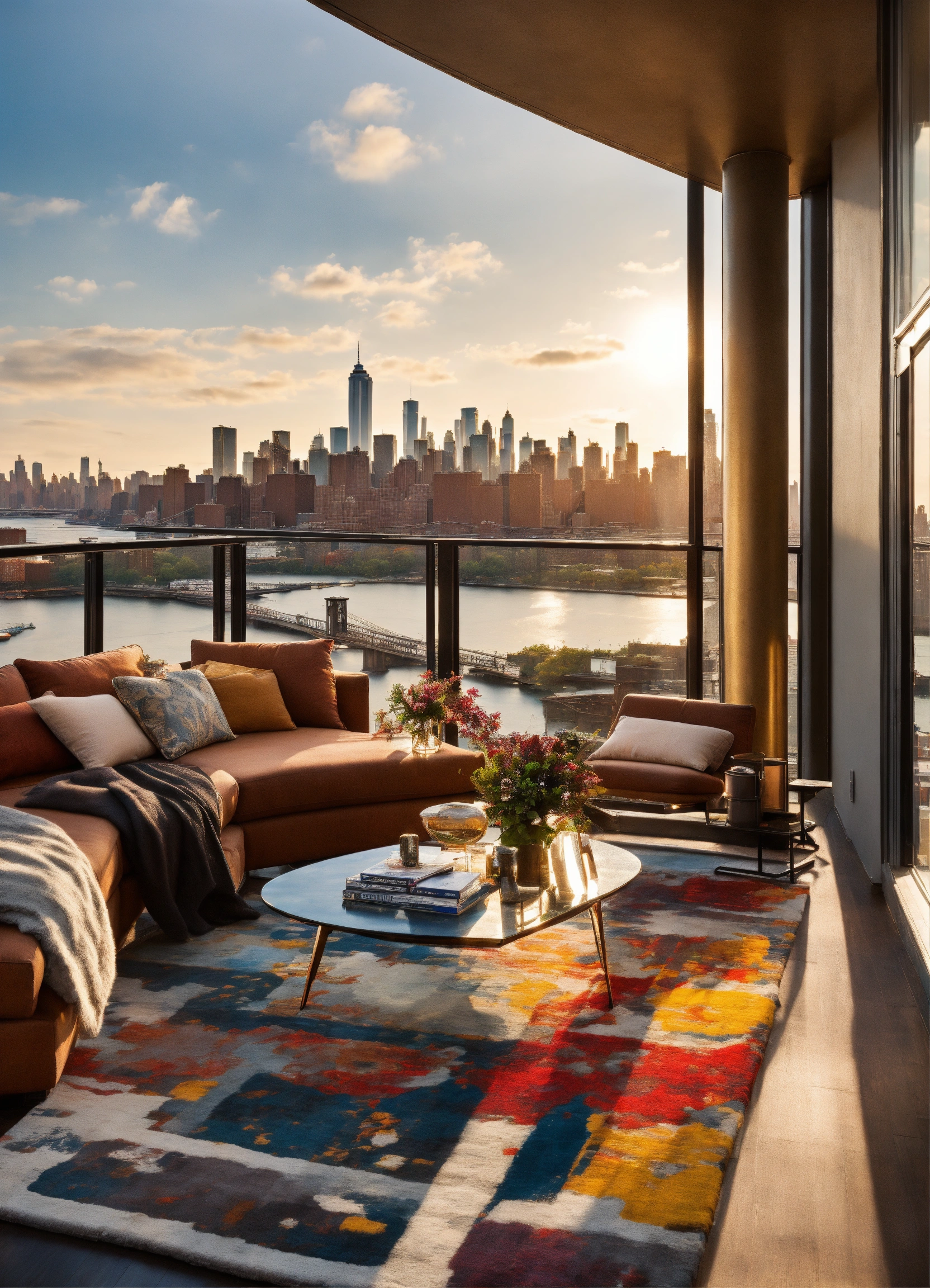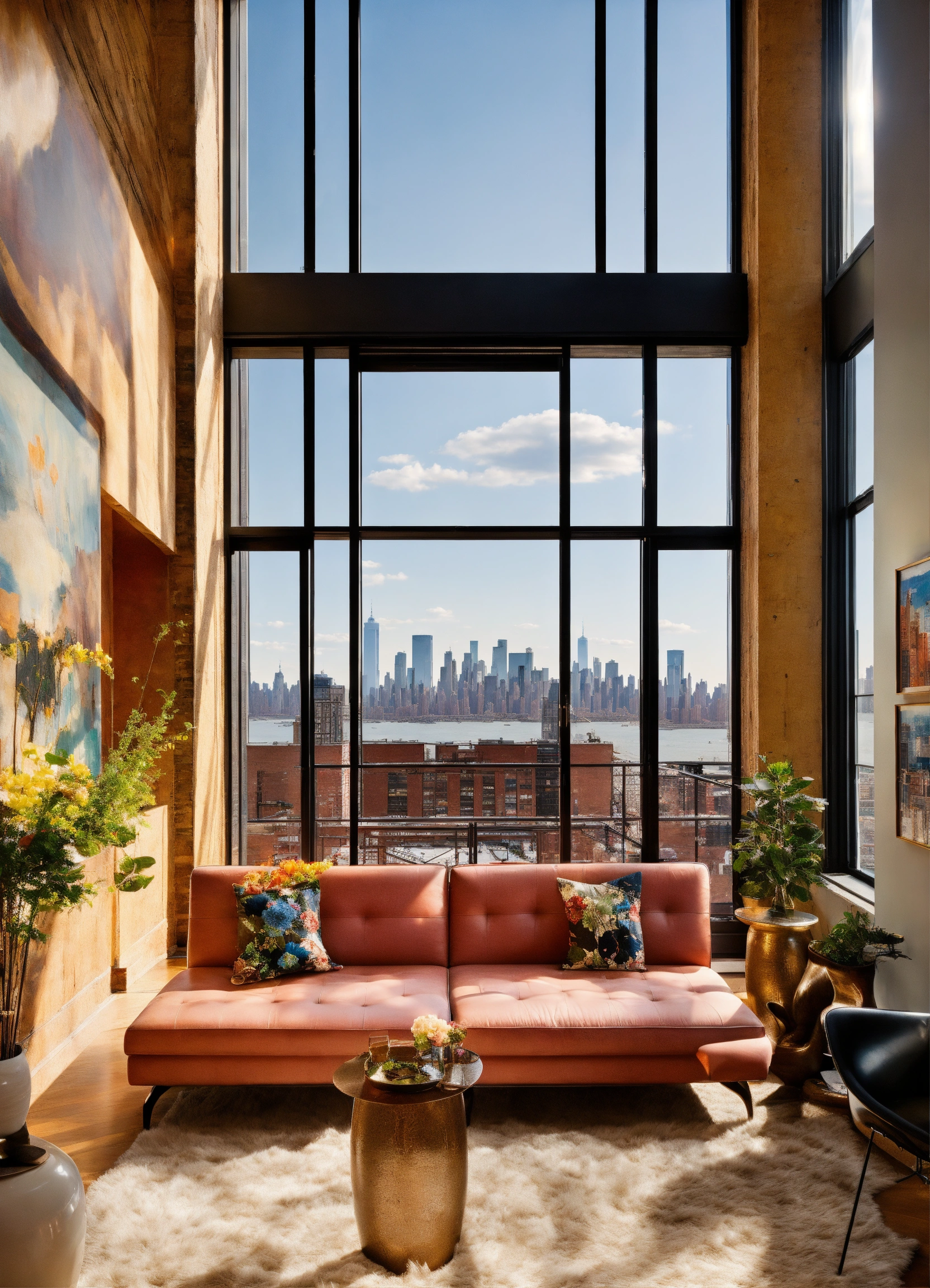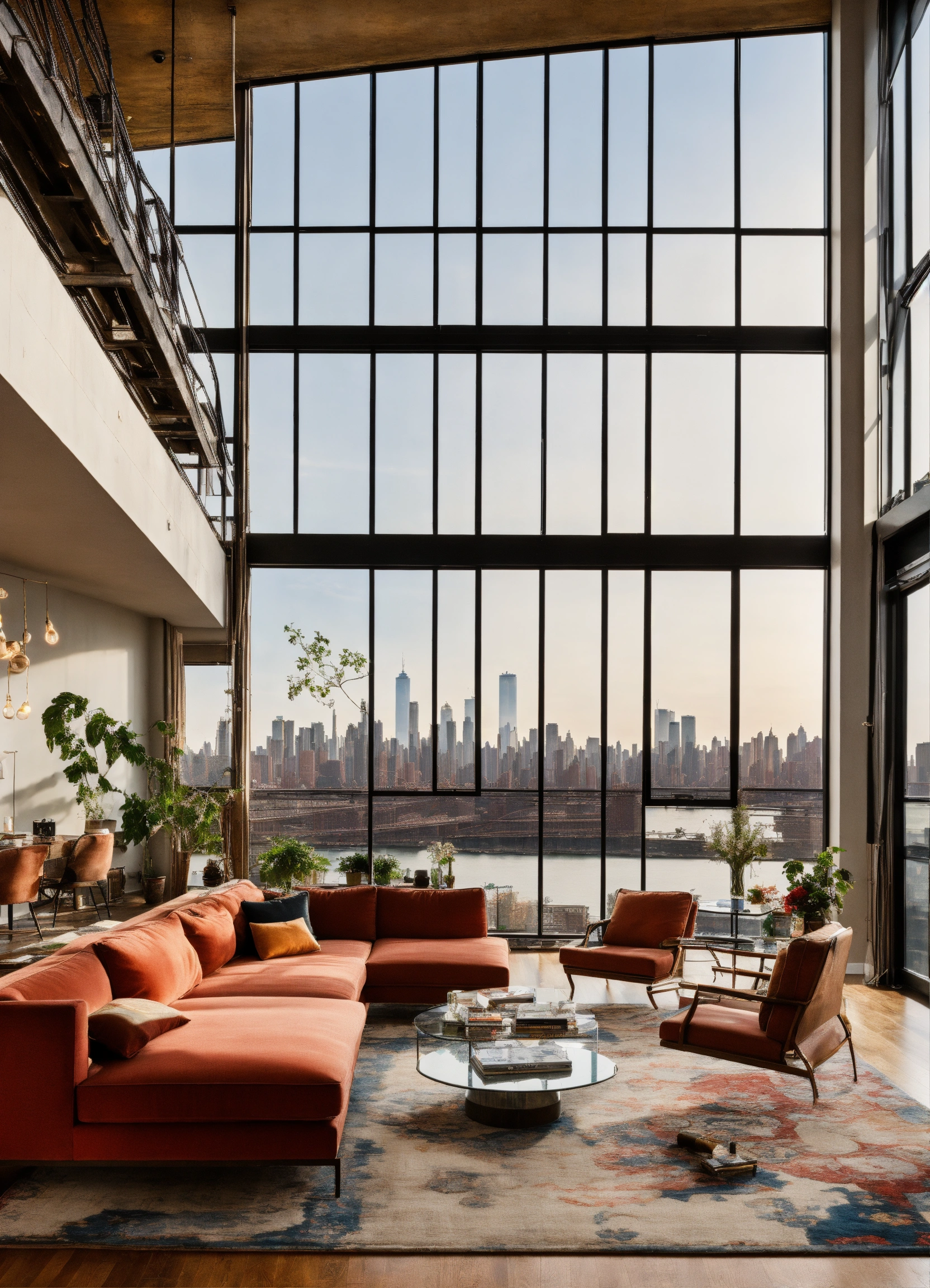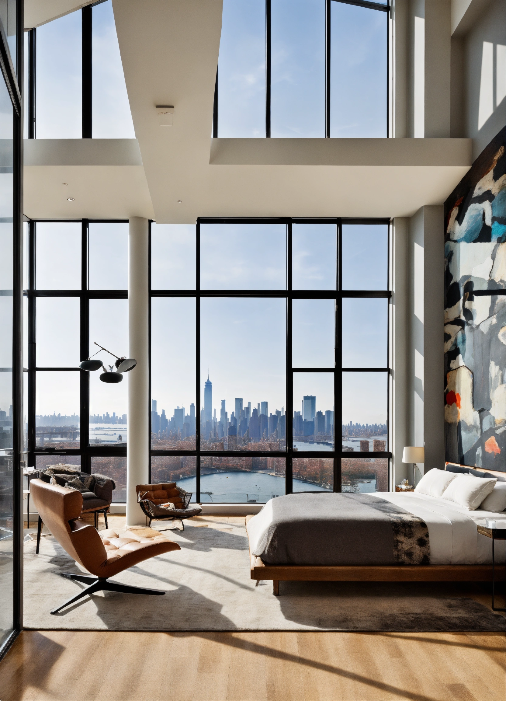 Luxury penthouse apartment in williamsburg brooklyn, panoramic views of bridges and skyline, floor to ceiling windows elegant decor bright artwork on walls