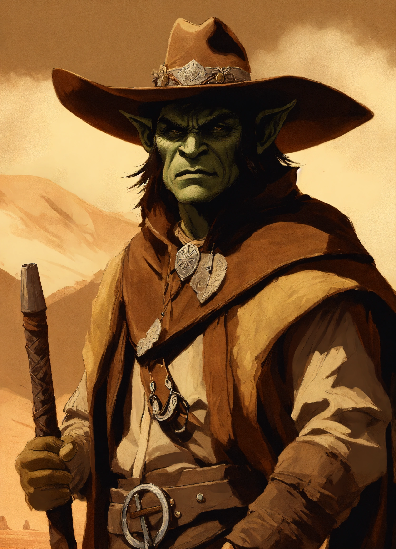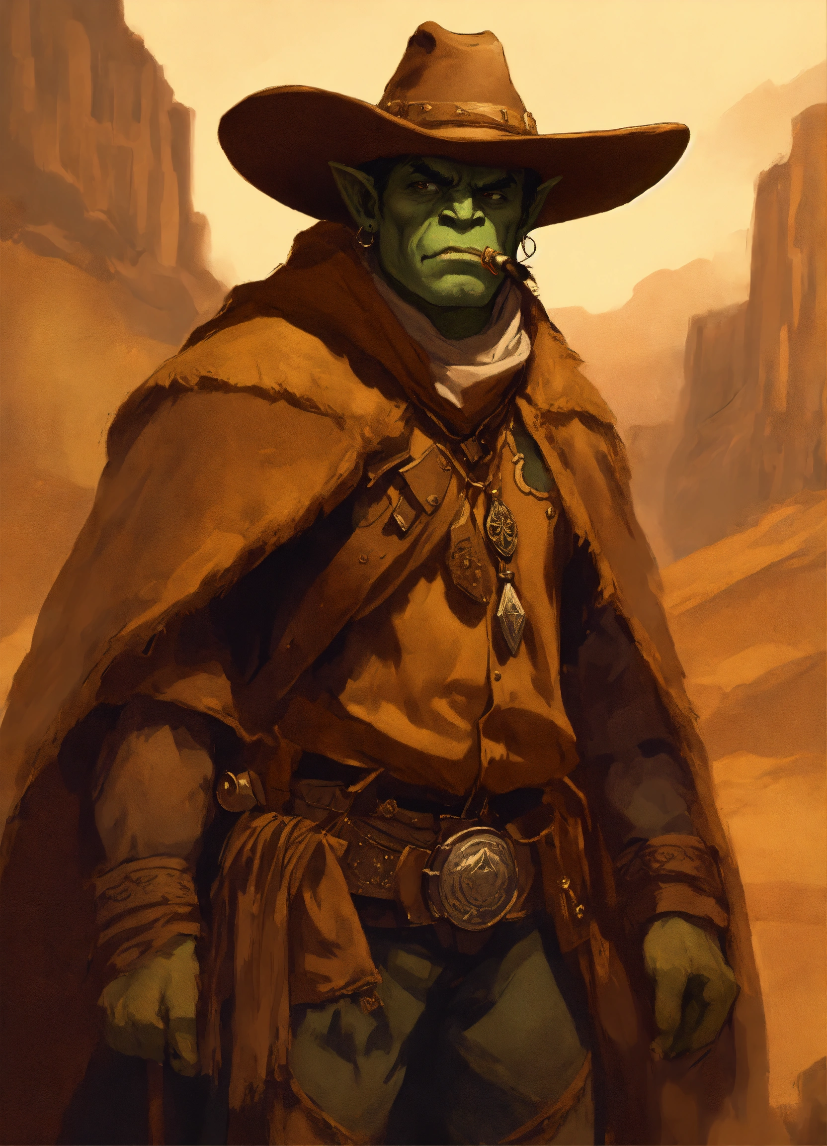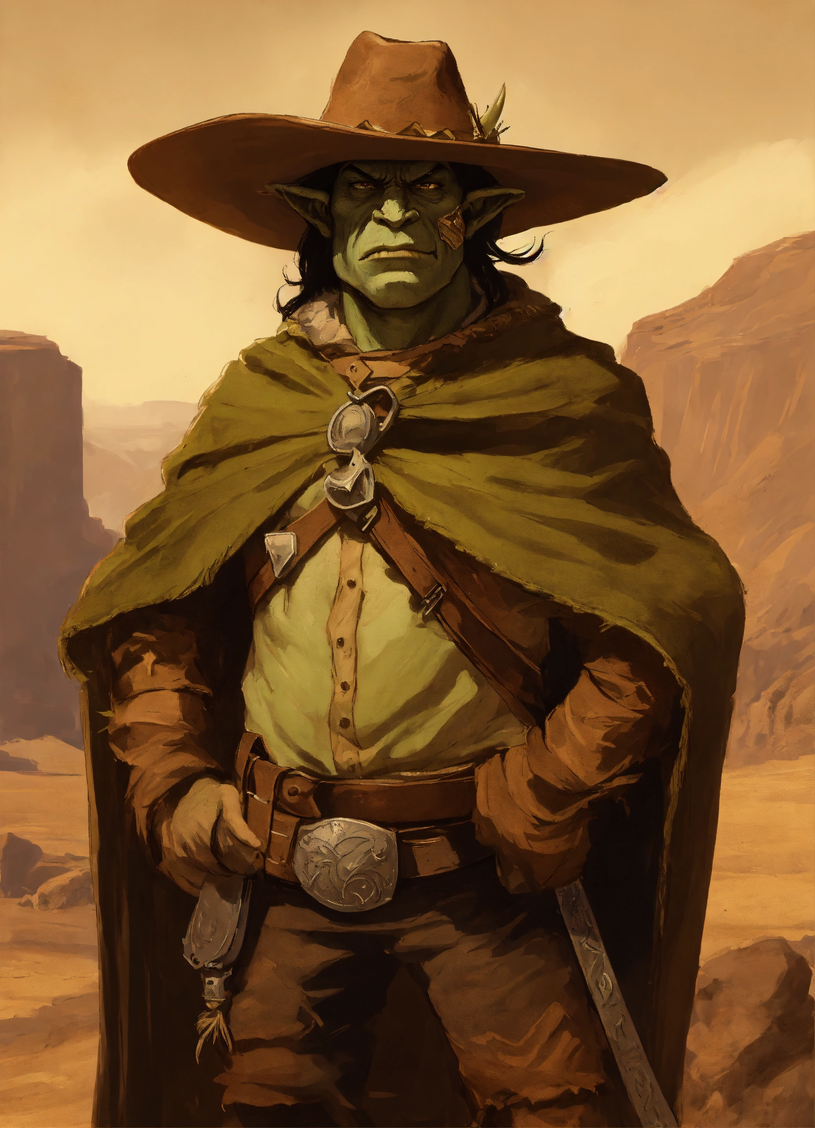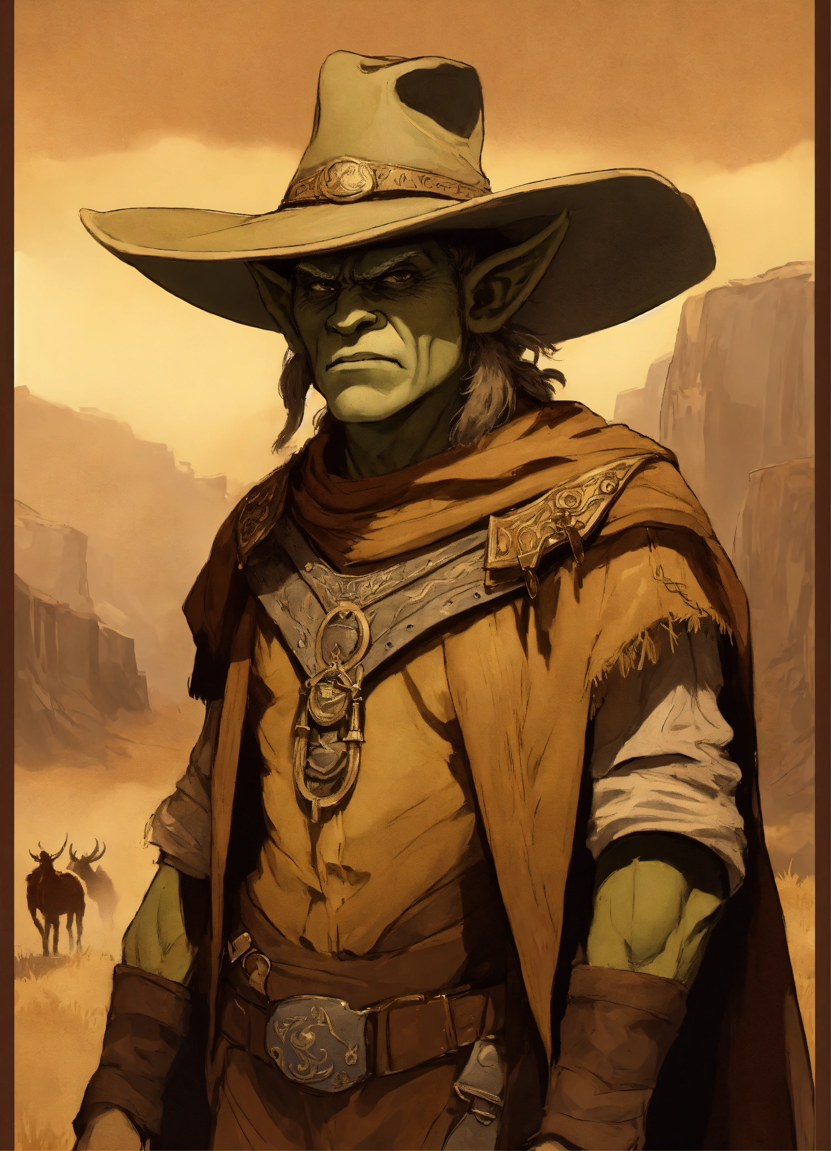 In the style of a old sepia western painting, an orc is wearing a poncho, he is wearing obvious and comical fake elf ears, he is wearing a wide brimmed cowboy hat, he’s dressed like a hero in a western, he has visible tusks, he has disguised himself as an elf