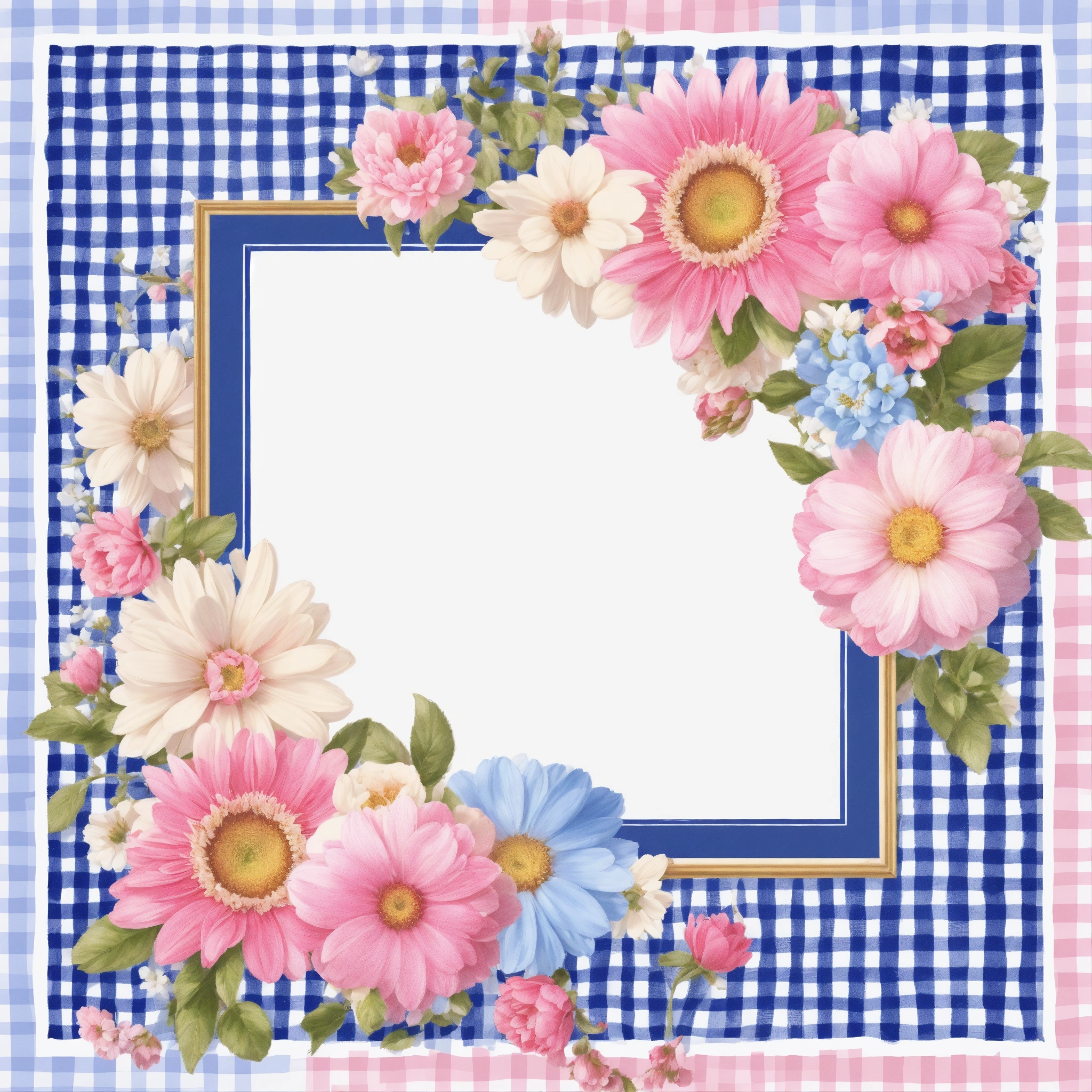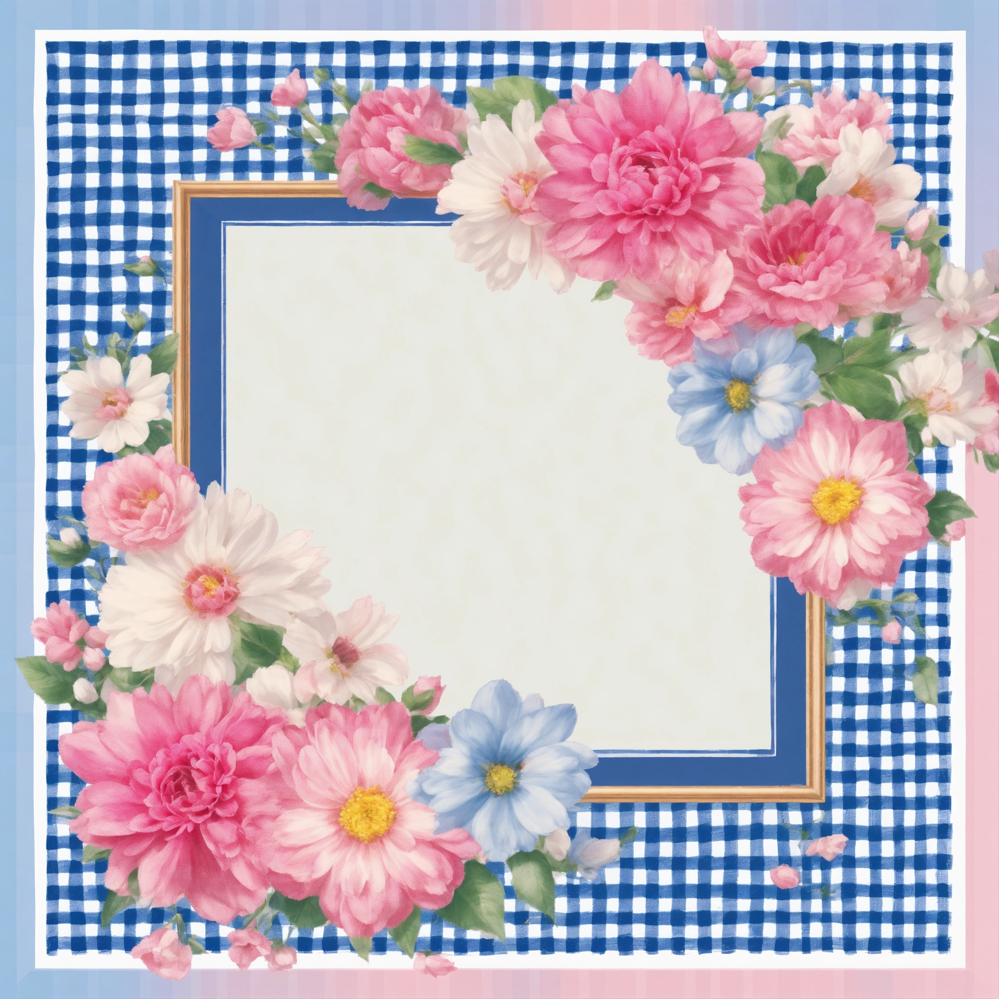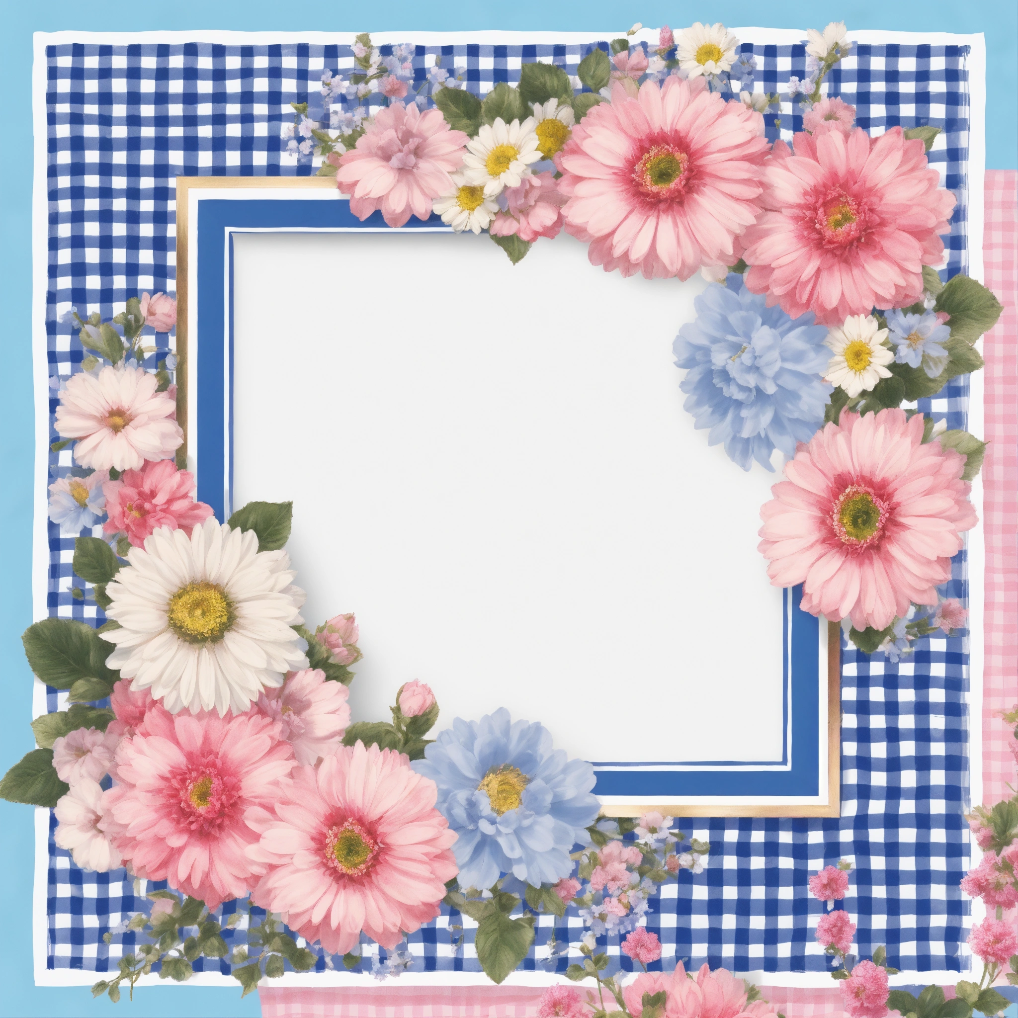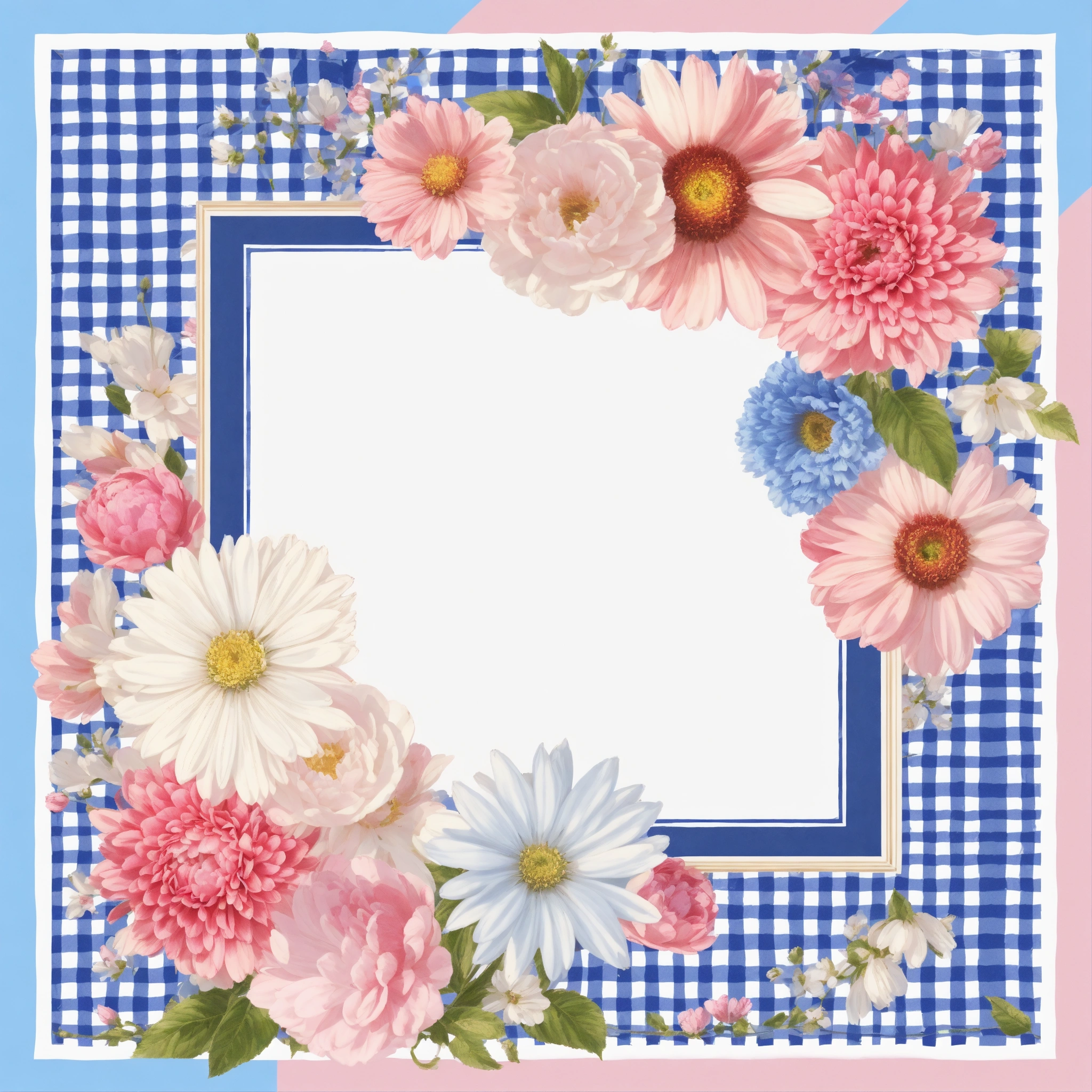 Imagine an illustration of a square with pretty blue, pink, and white flowers in the center. there is a small border of white and pink gingham as the frame. make it a seamless pattern. photo realistic 16k