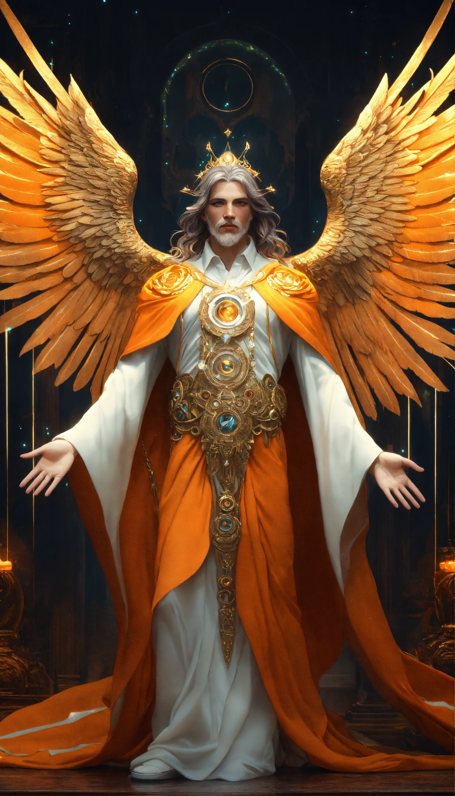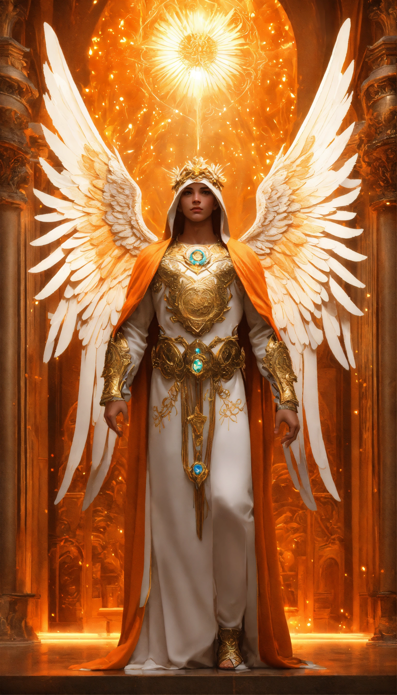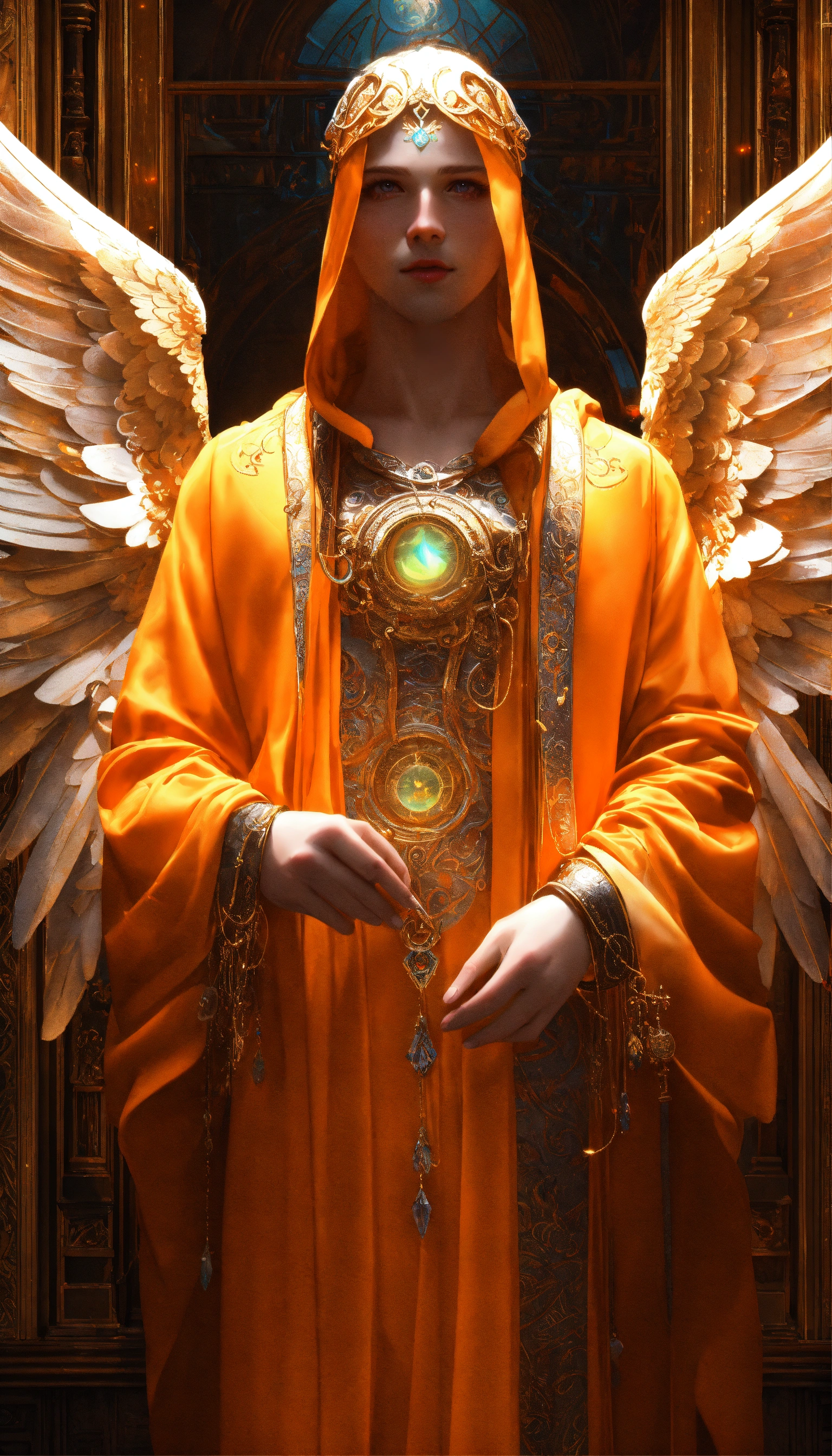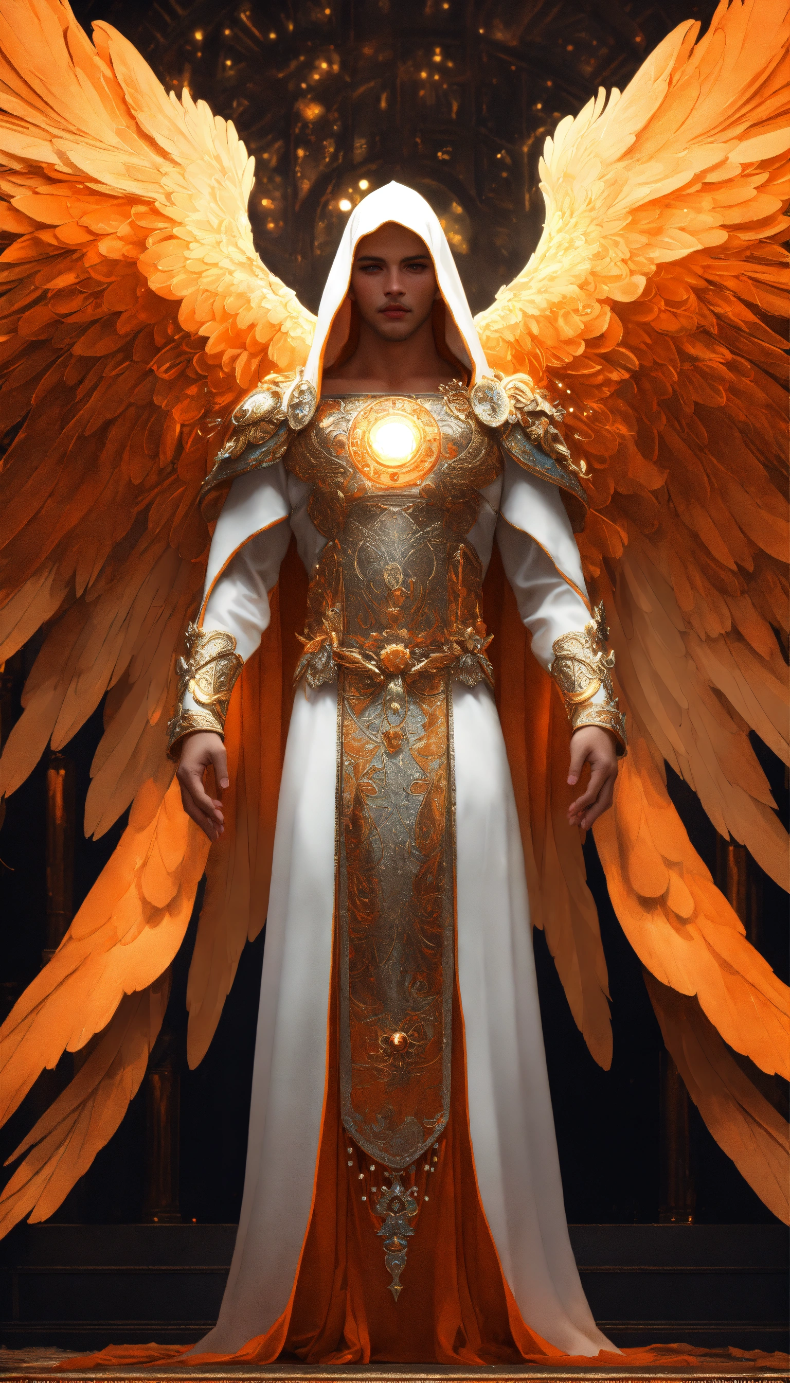 Text male angel, wings, intricate, highly detailed, photomanipulation, art station, real, 3d, orange wings with luminous white flashes, large and detailed wings, clear eyes and deep look, face perfect in beauty and detail, jewel in the third eye, orange robe with white and gold details, sacred, mystical, sharp focus, cinematic lighting, 8k, art by artgerm and greg rutkowski, alphonse mucha, cgsociety, high quality and resolution, hyper realistic
