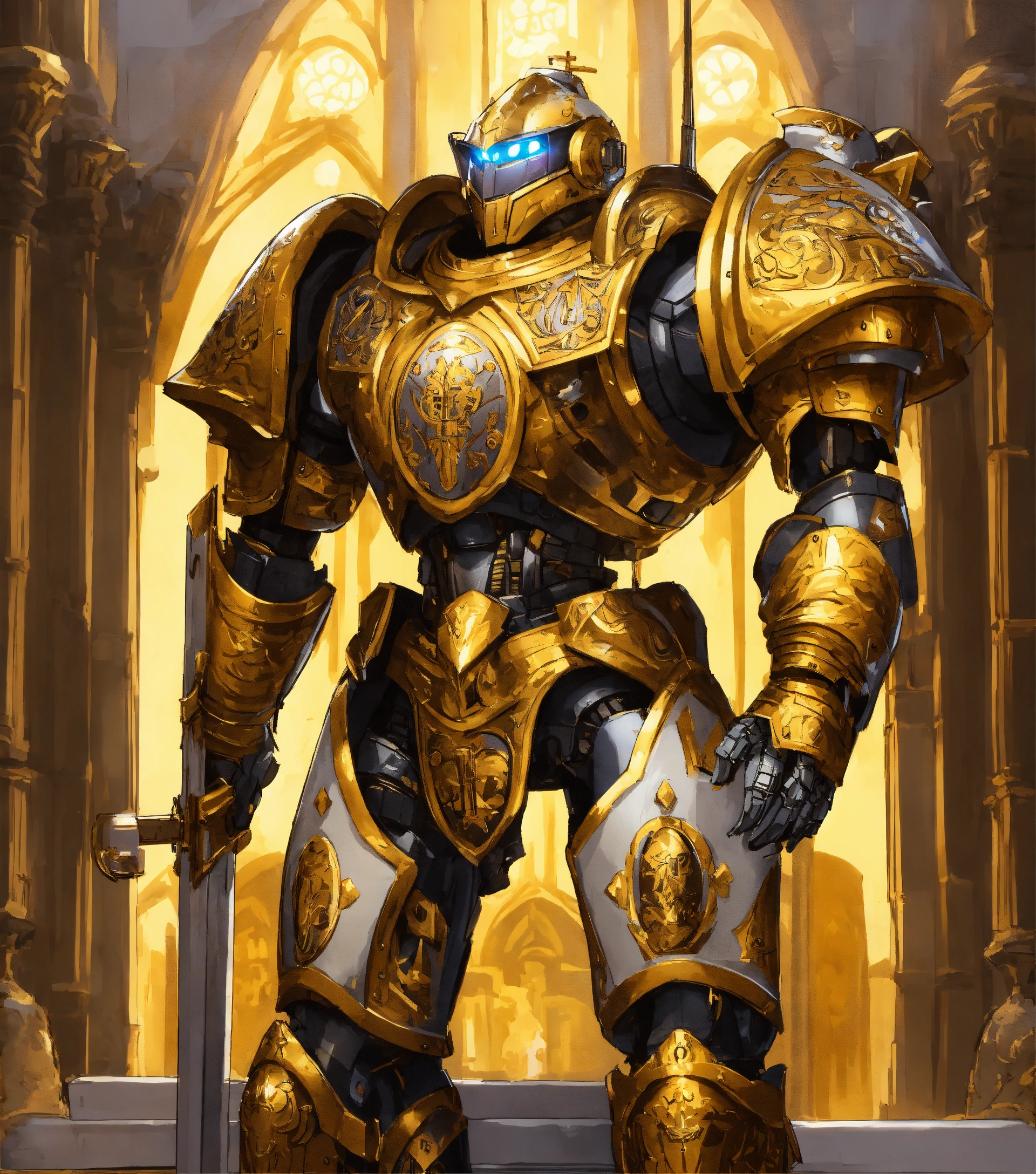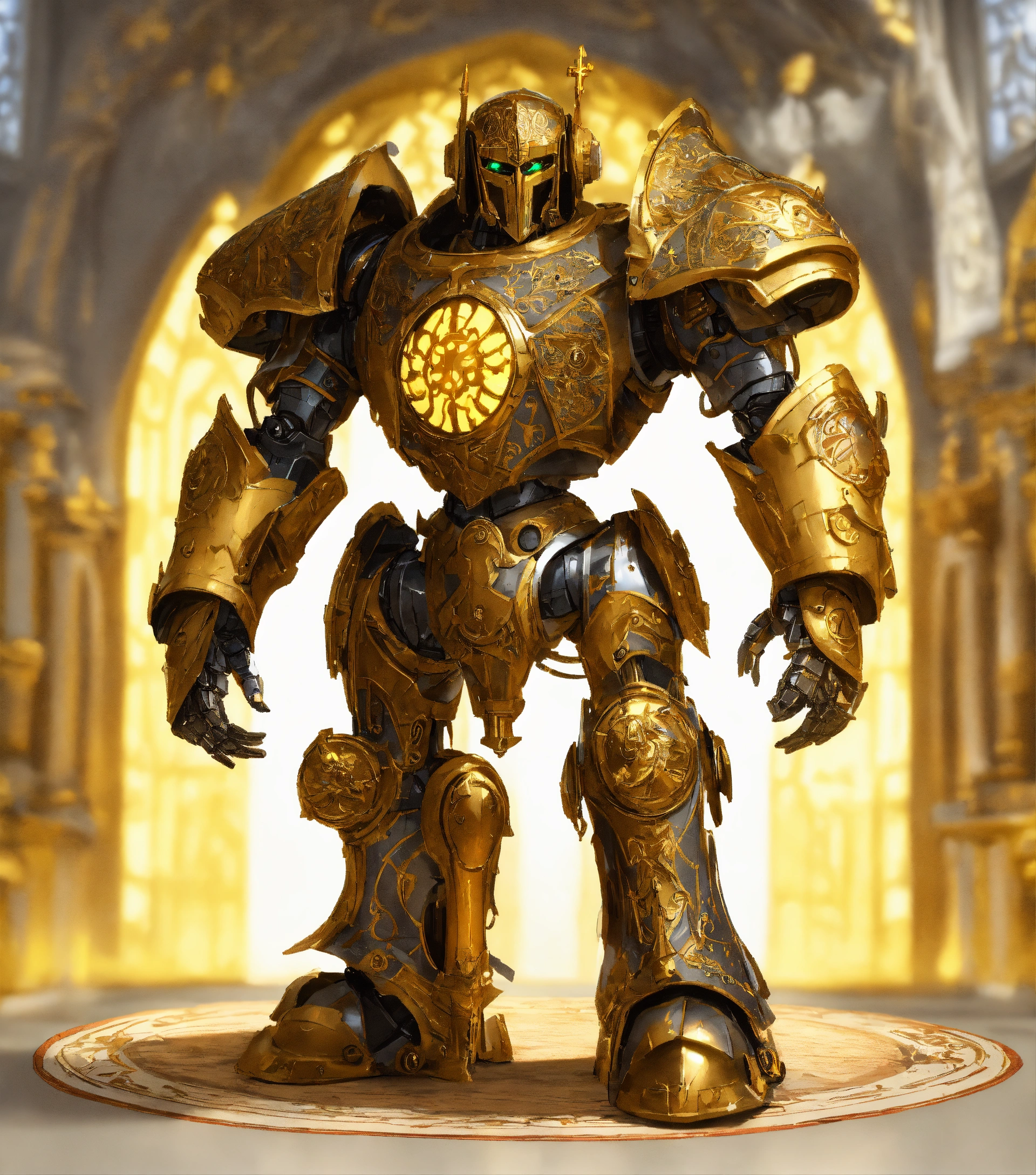 Drawing of a gilded and elaborately decorated steel armored warforged robot warrior with wooden accents holding a scroll, church organ built into his back, glowing yellow eyes, white background