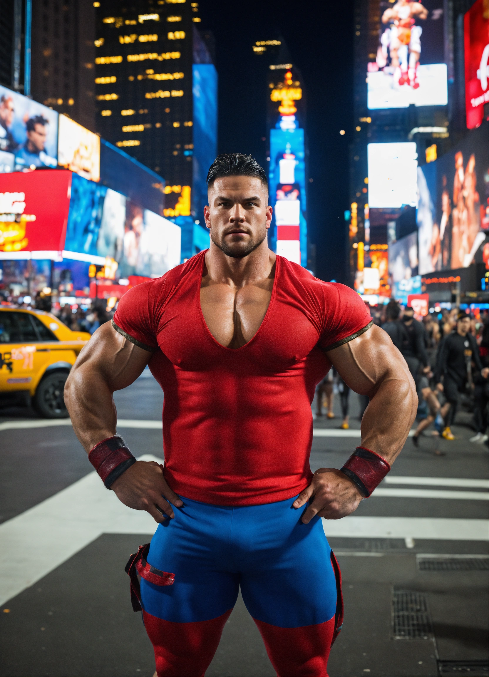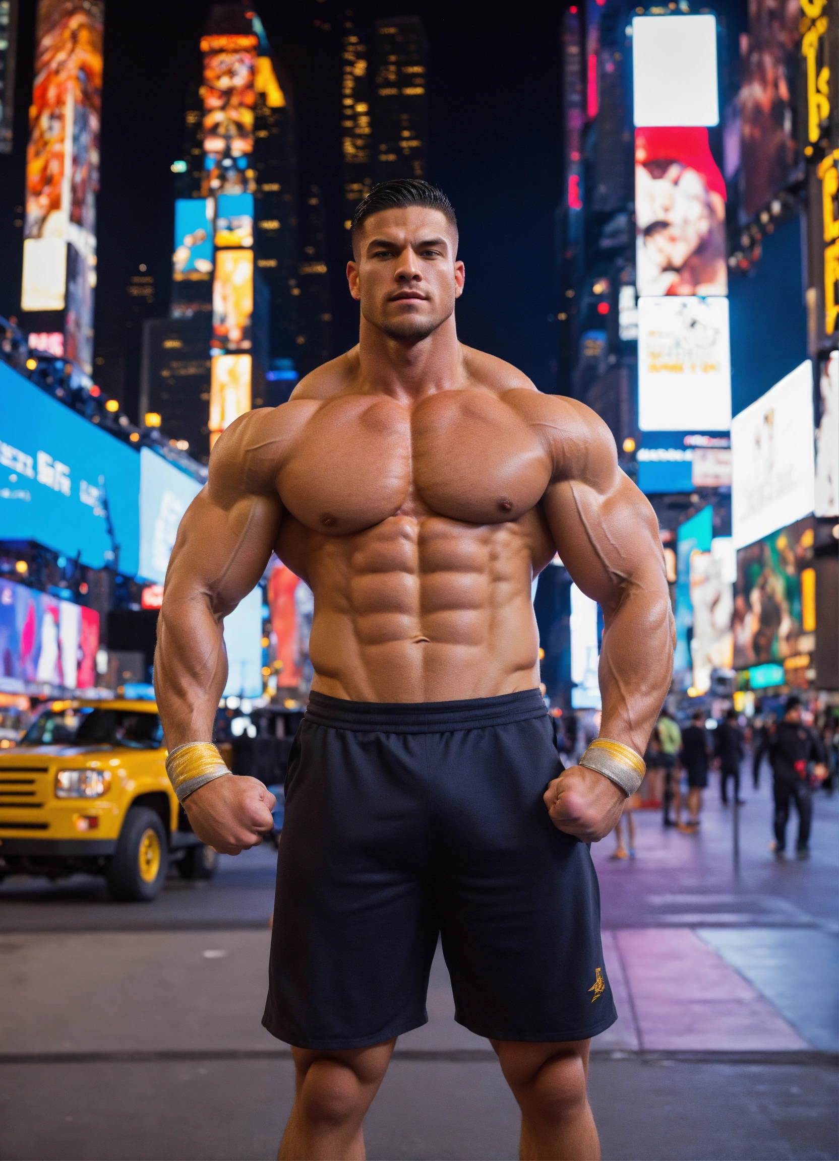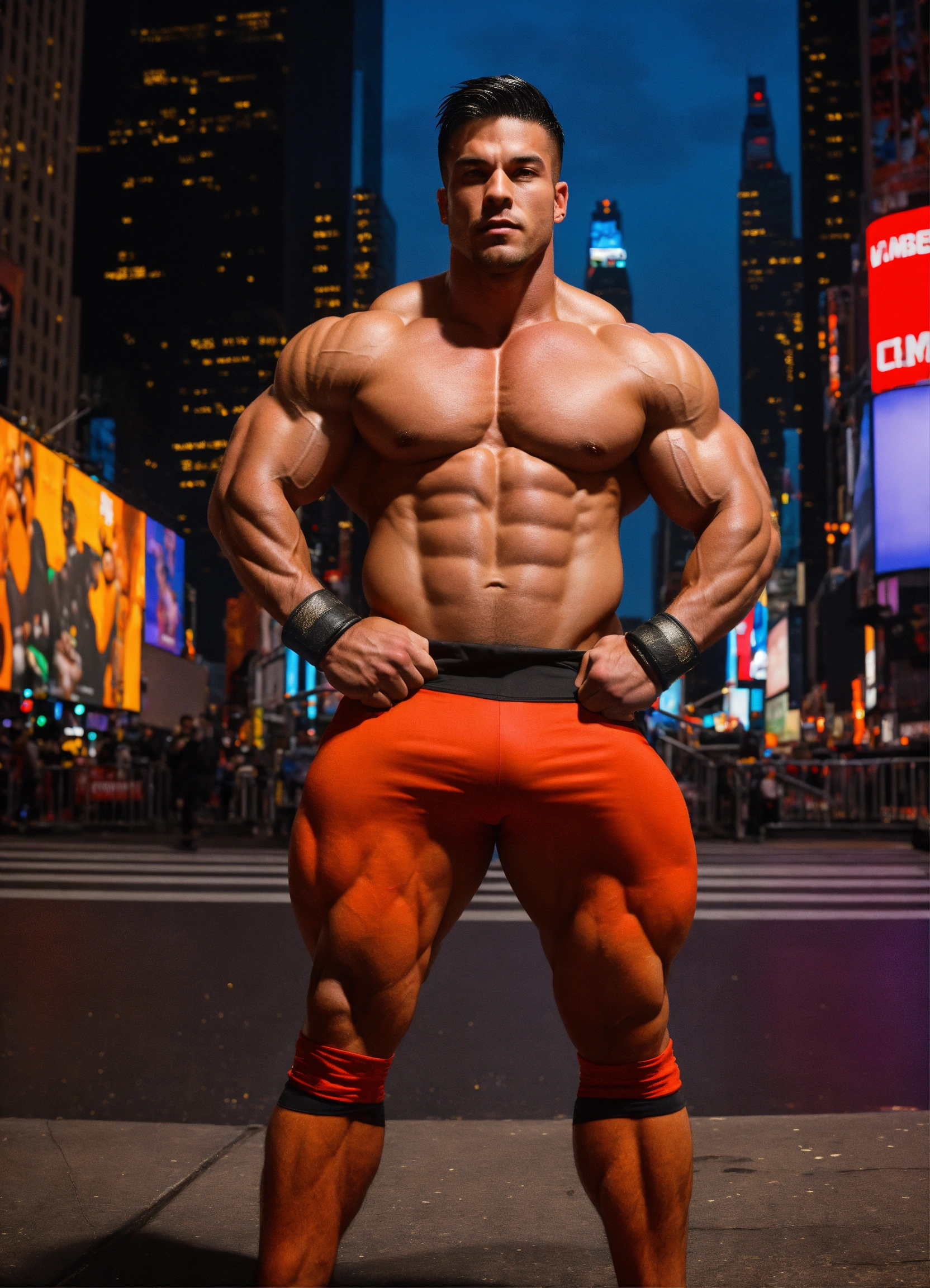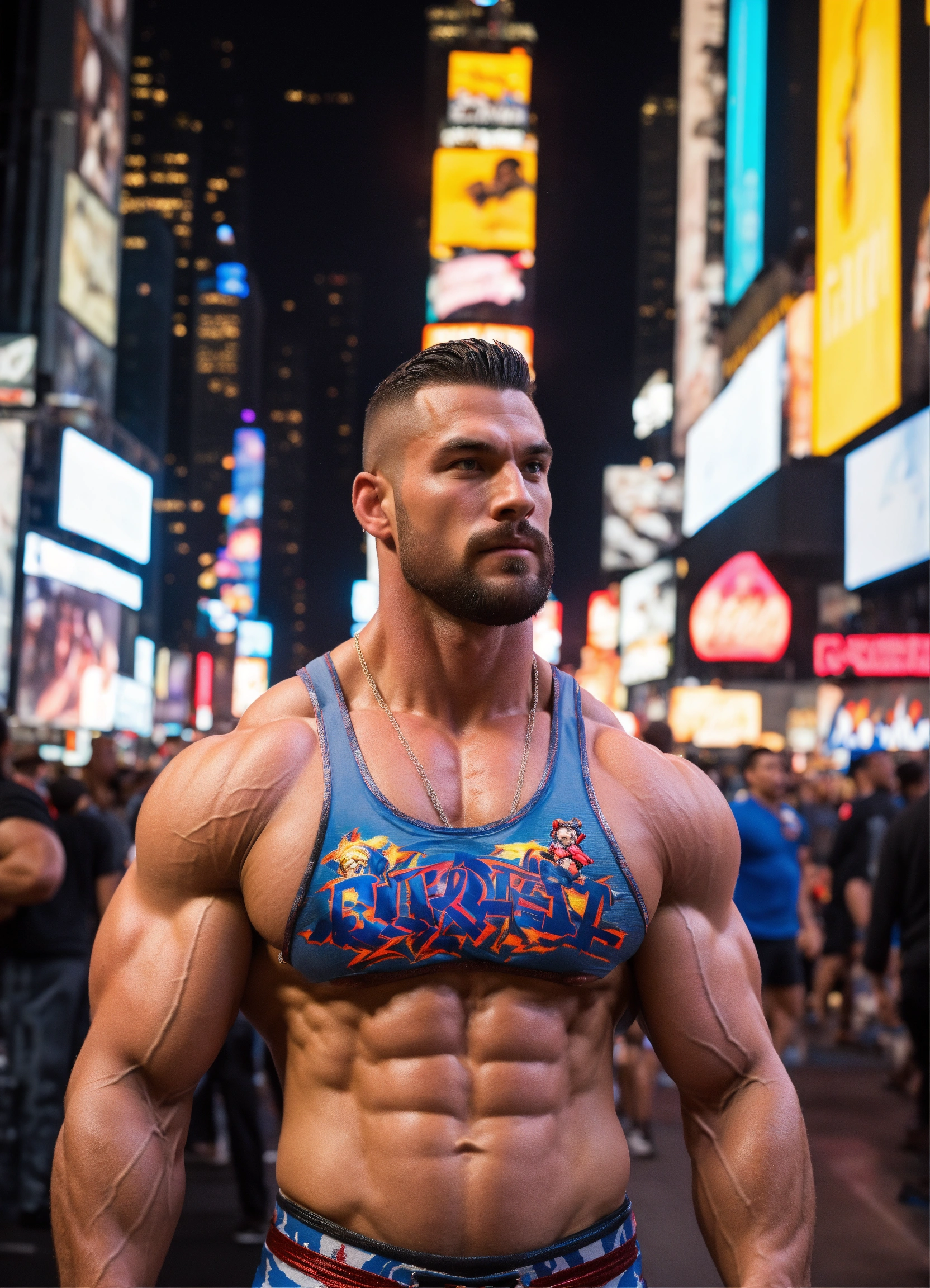 30-year-old man with big muscles, ken from street fighter, big bodybuilder, body like a wrestler, in times square at night