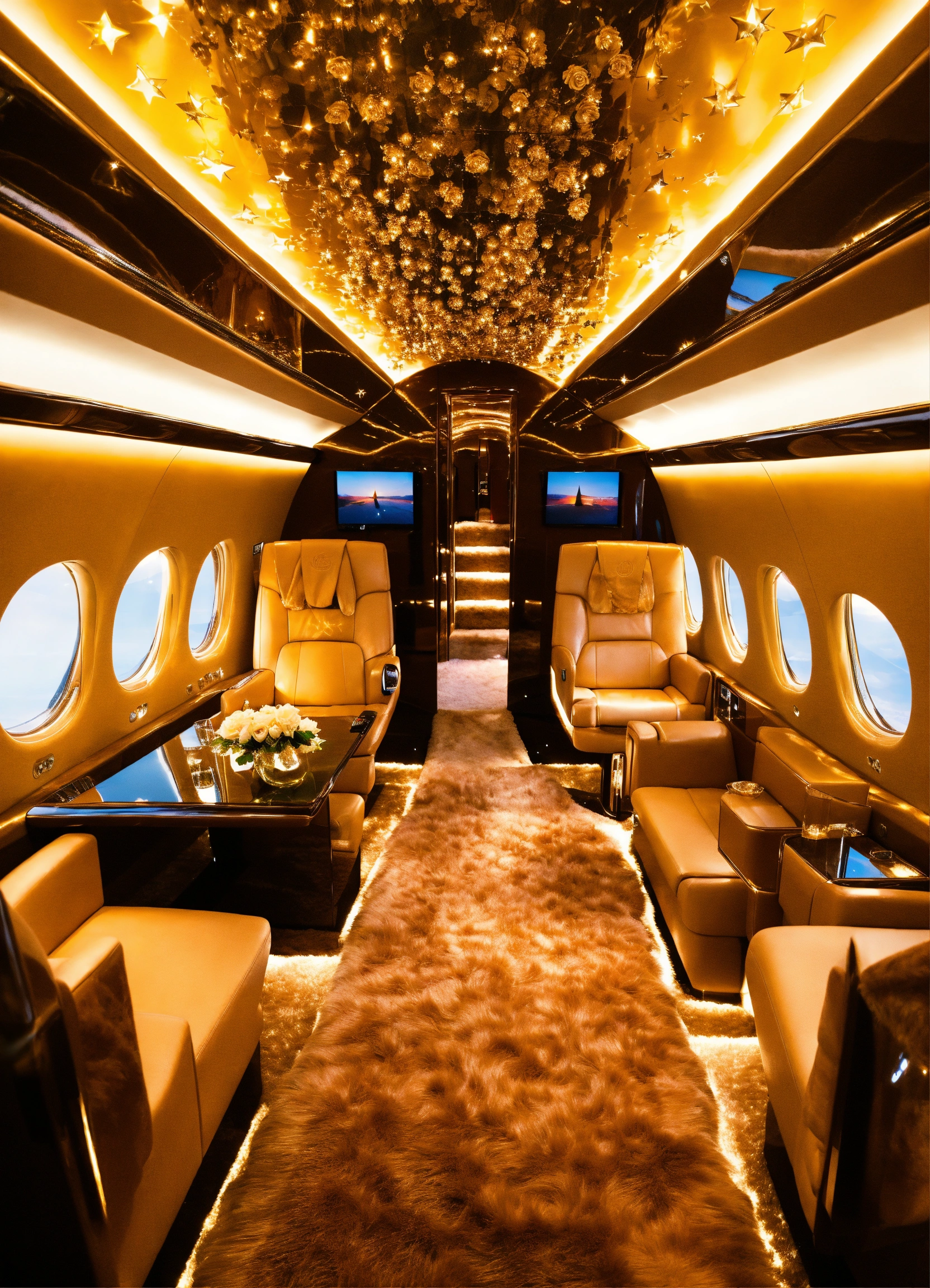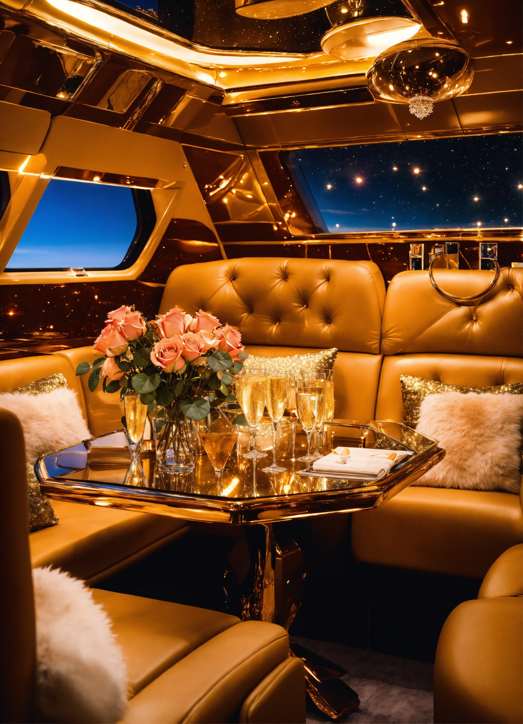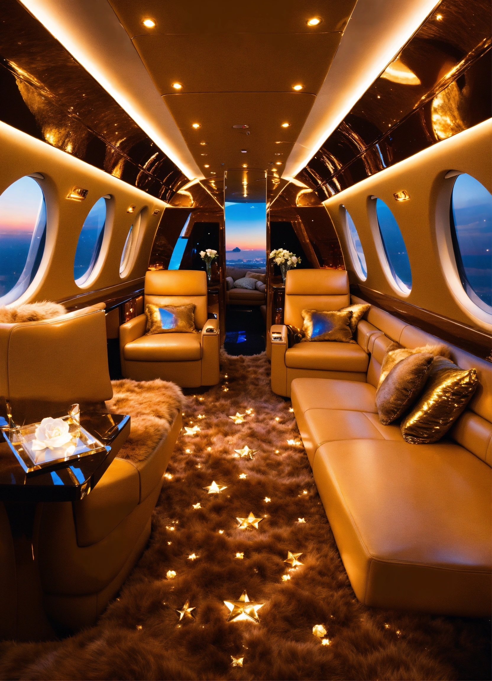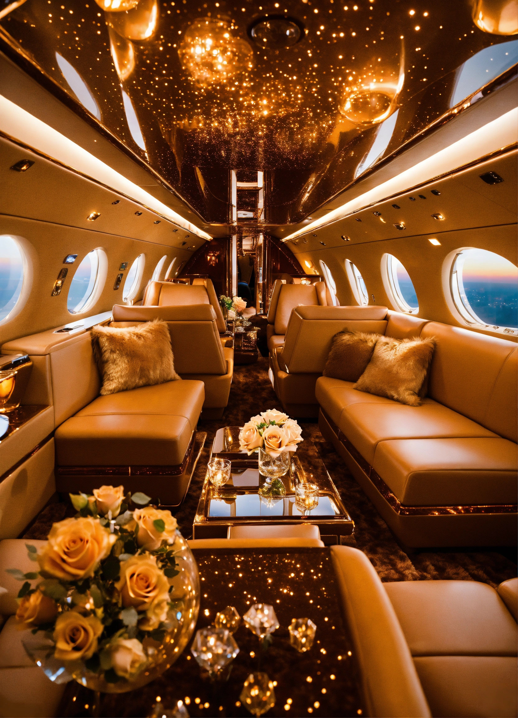 Sunset gold space private jet interior furry champaign roses plexiglass glass crystal gem geometry stars