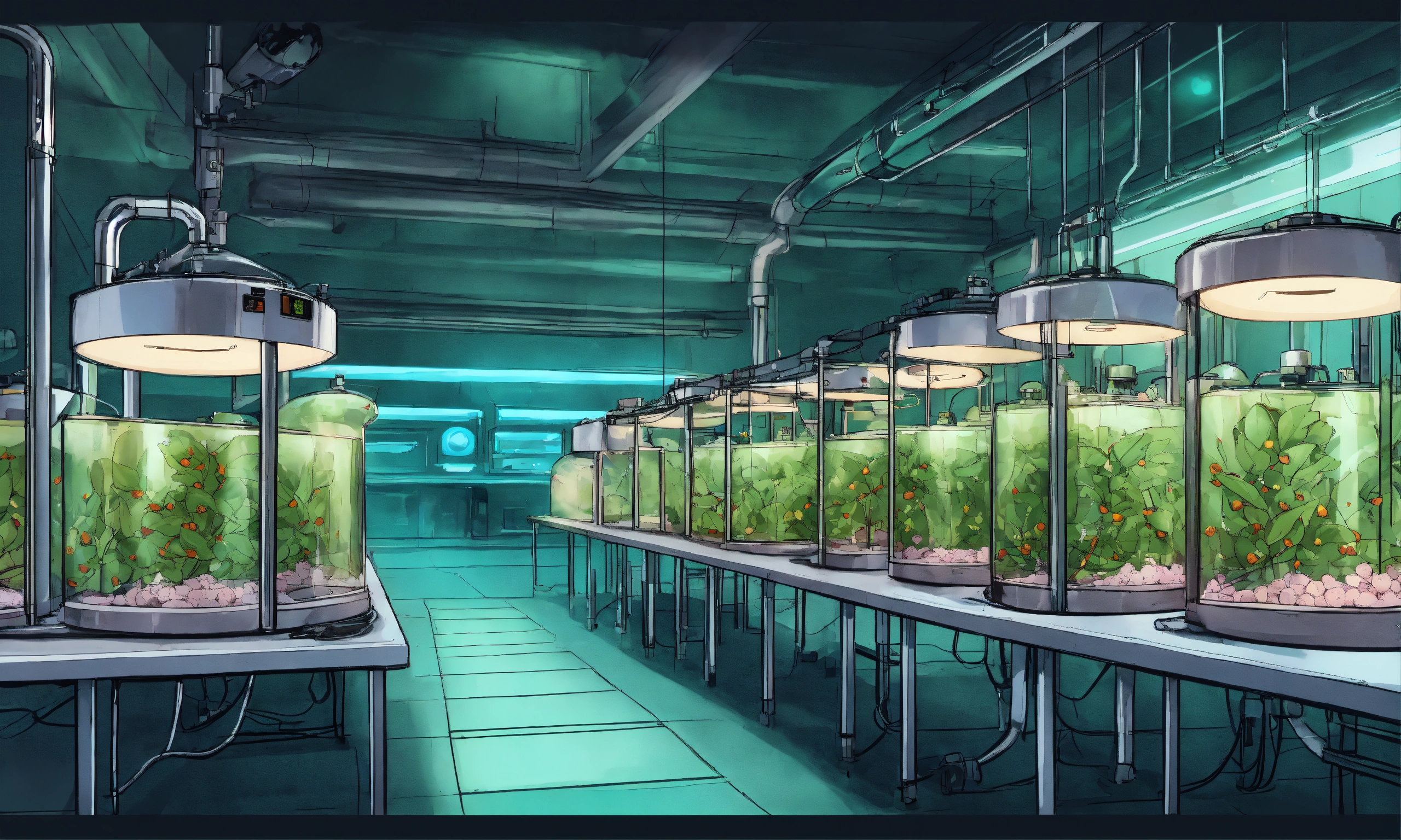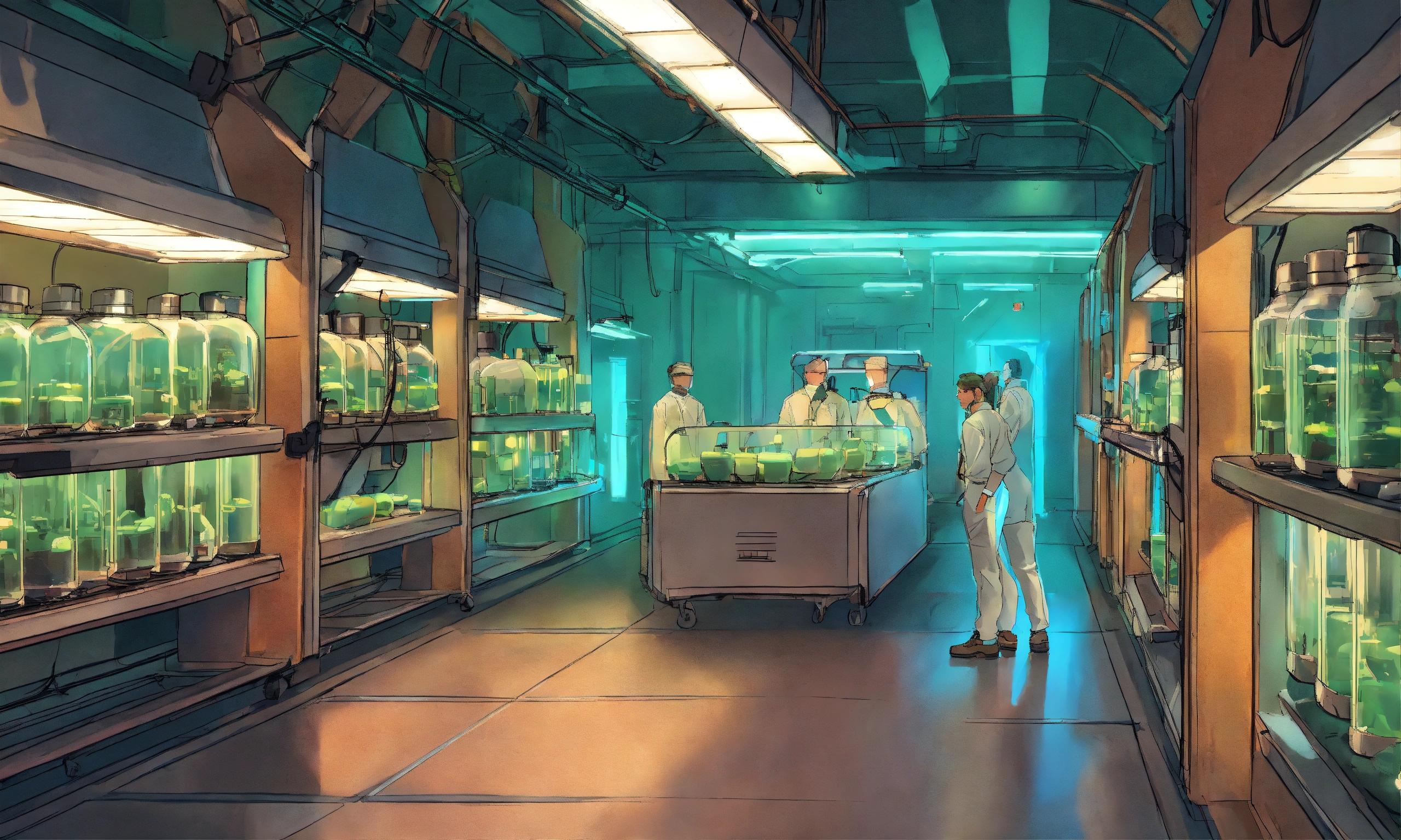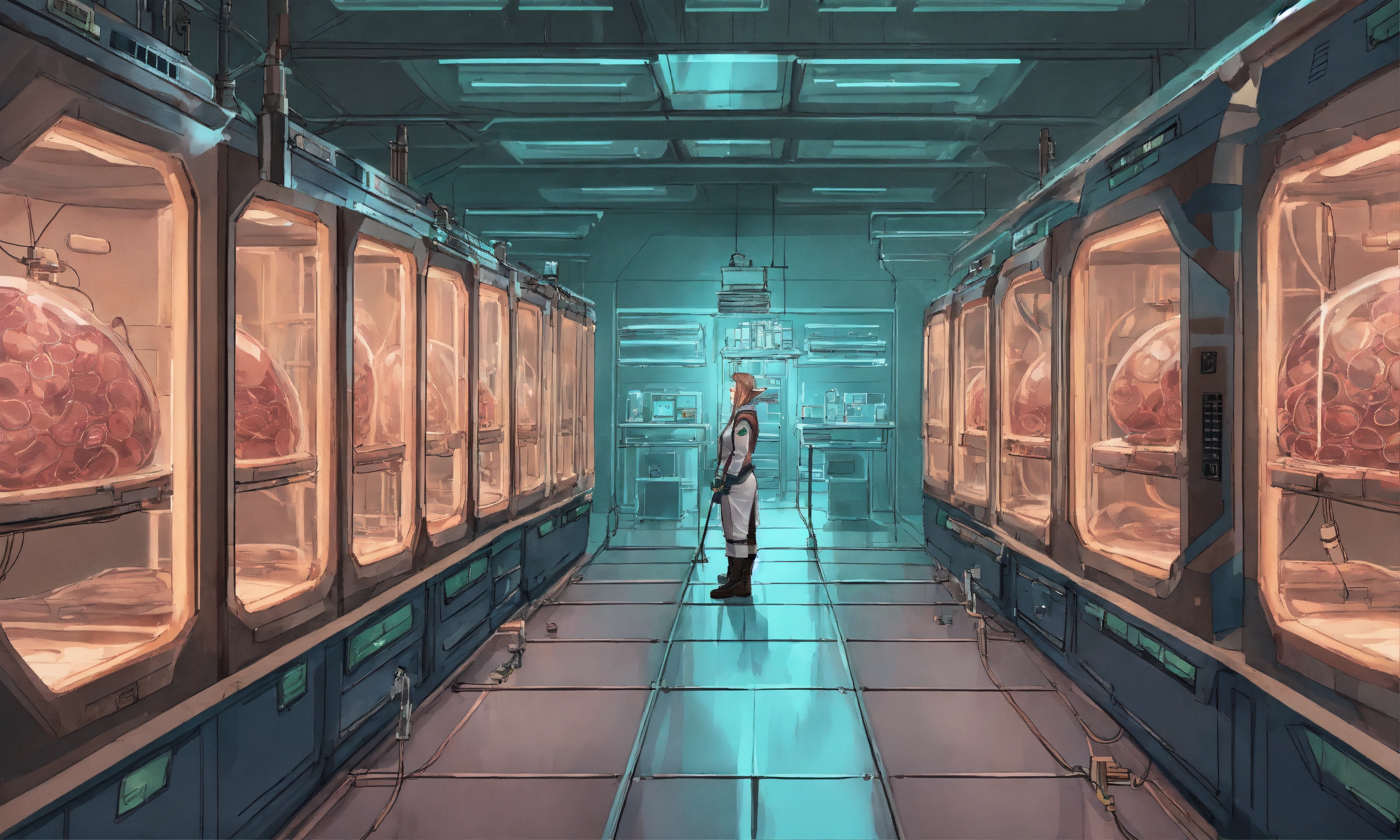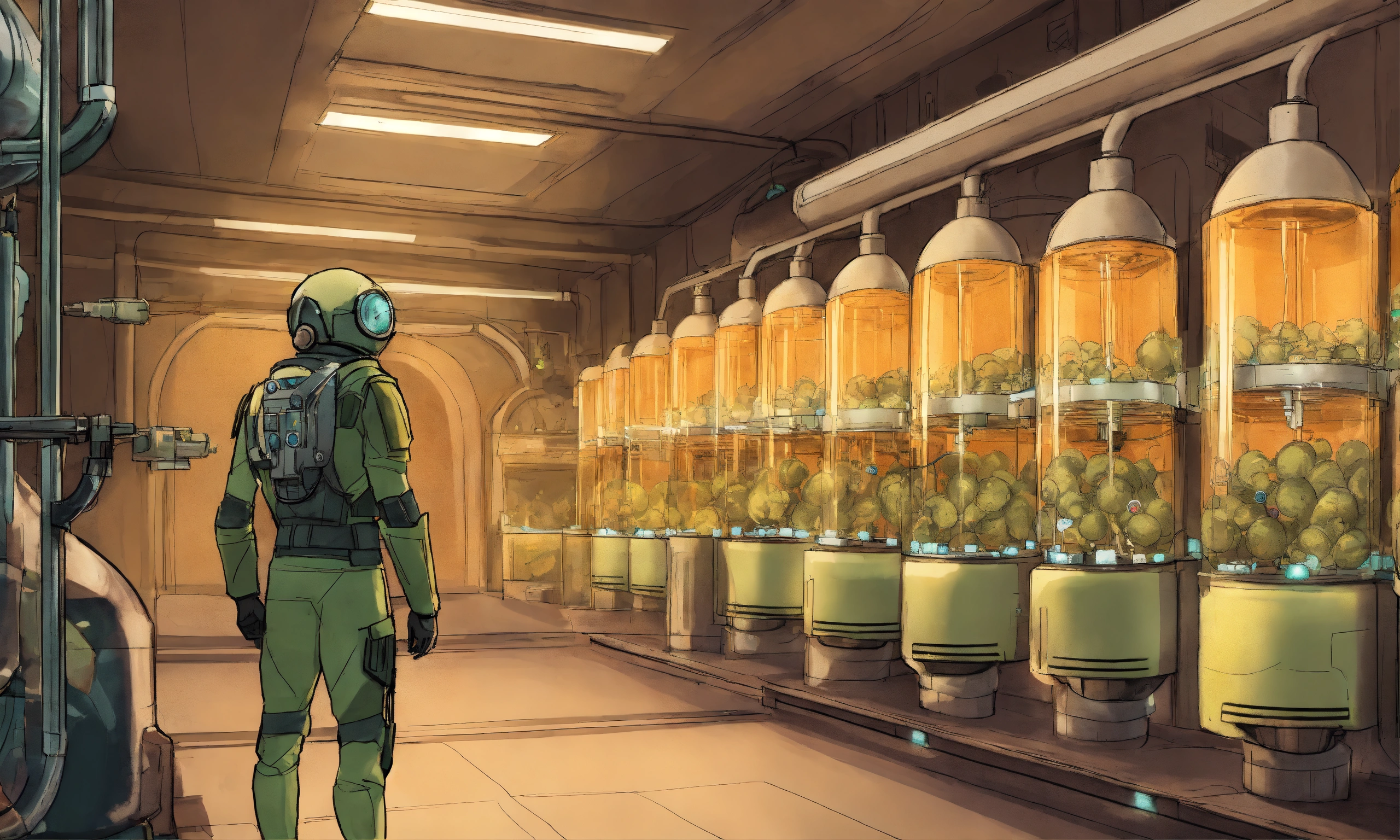 Drawing of the inside of a sci fi elf cloning laboratory with vats containing embryos of clones being made to become soldiers