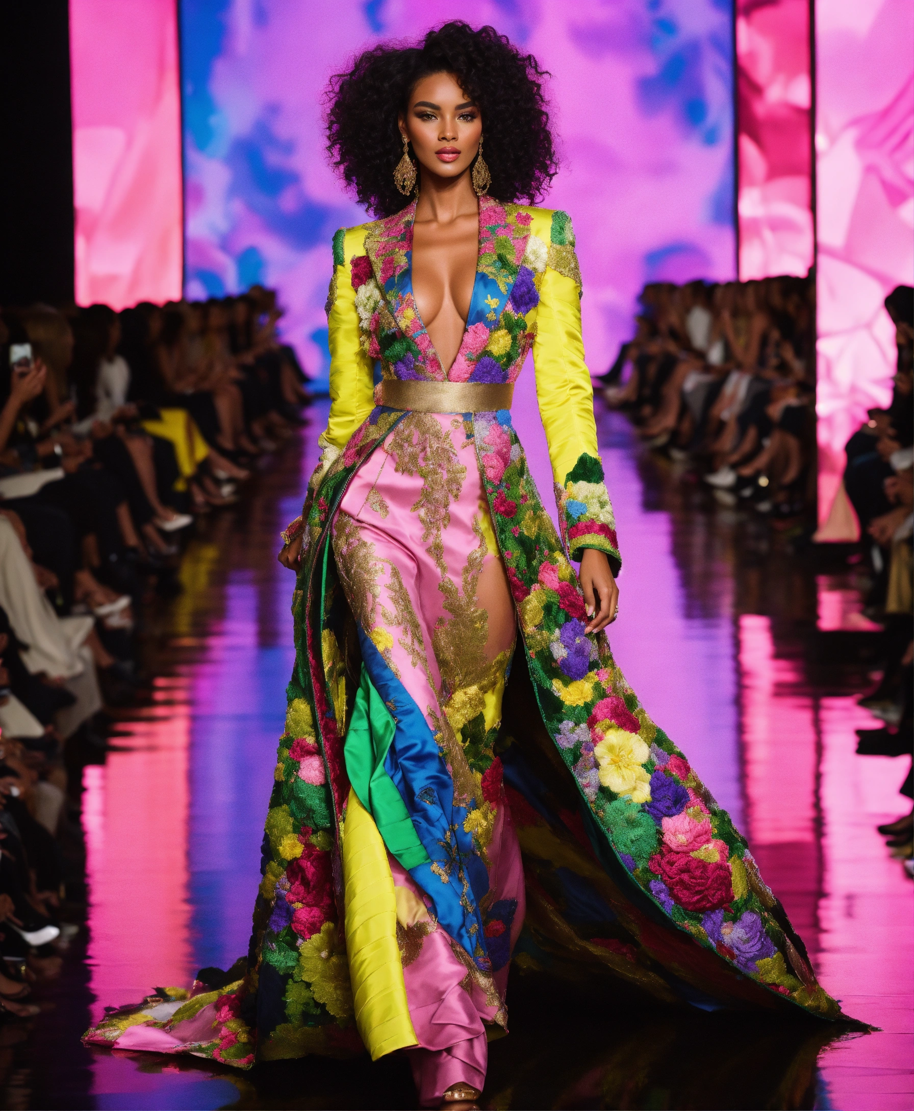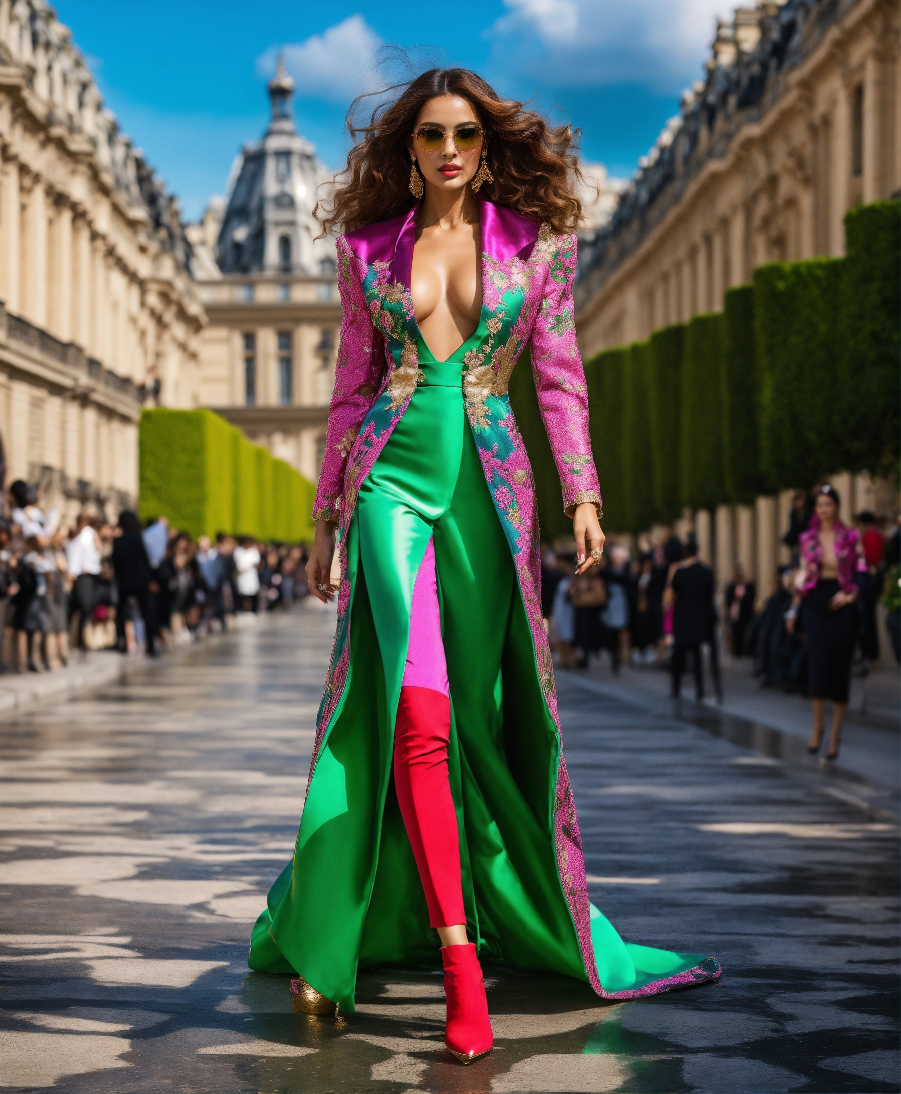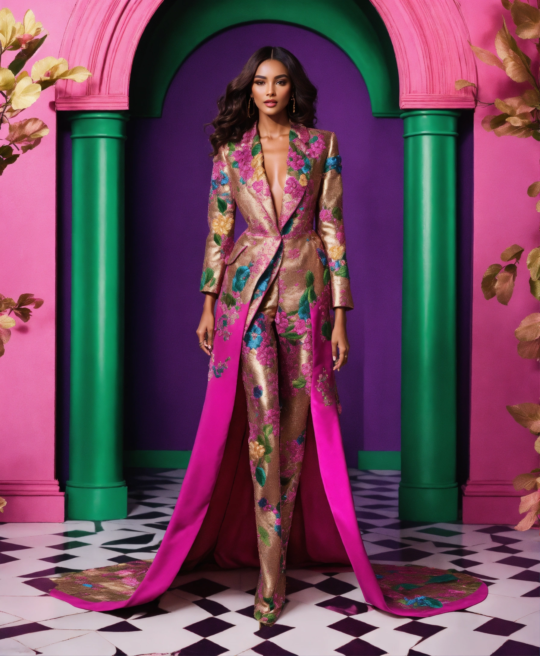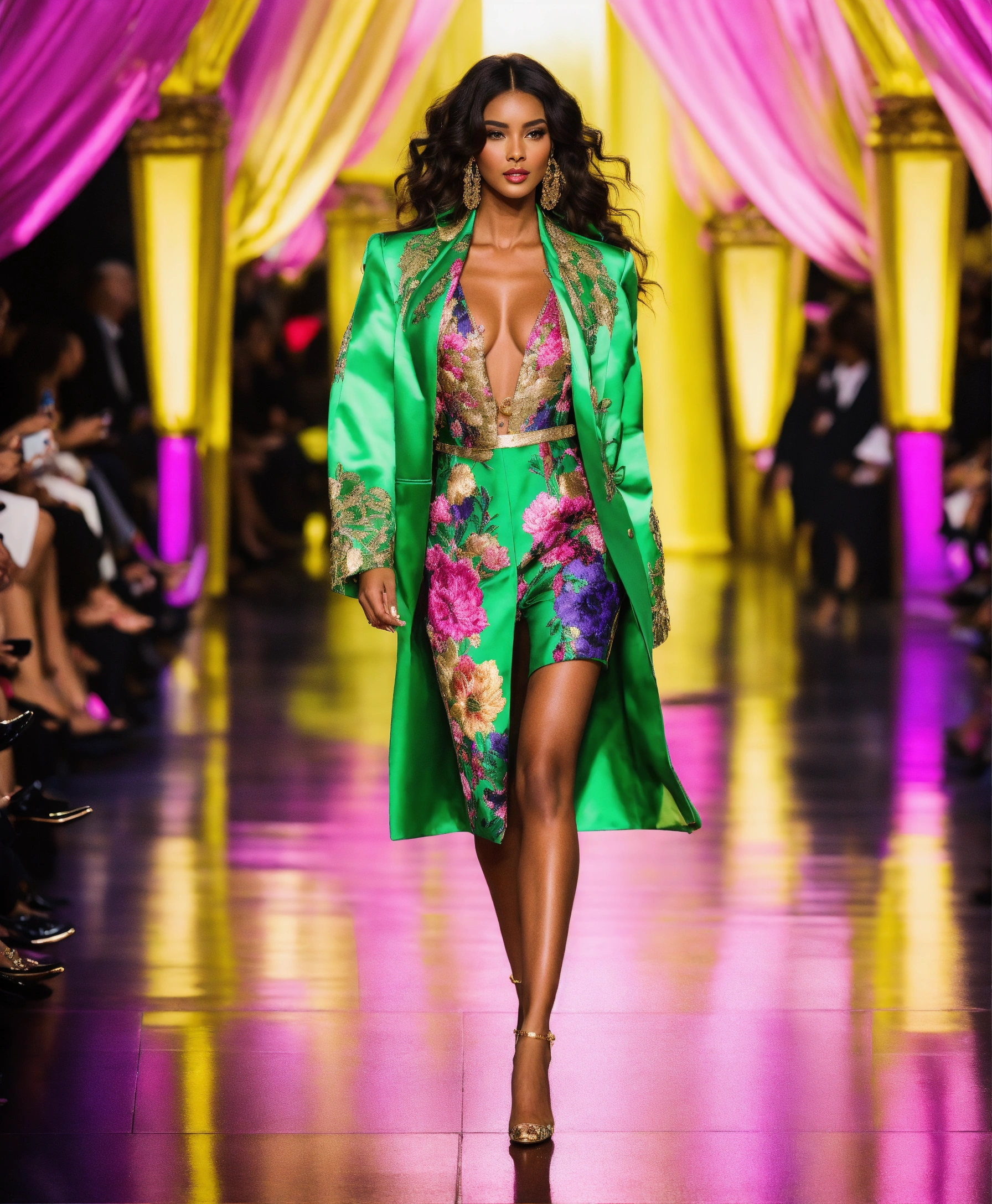 Ultra realistic full body photo of a stylish beautiful elegant supermodel voluminous wavy hair walking the runway modeling summer cruise designer wear brave, paris versailles details cutouts and gold geometric pattern floral structured tailored jacket pink gold green lilac peridot silver magenta lime fuchsia yellow blue black gray copper mauve bronze haute couture embroidered contrasting colors vivid intricate bold vibrant glamorous ultimate elegance beautiful luxurious awesome wealthy opulent exquisite resplendent sheen magnificent sublime 12k