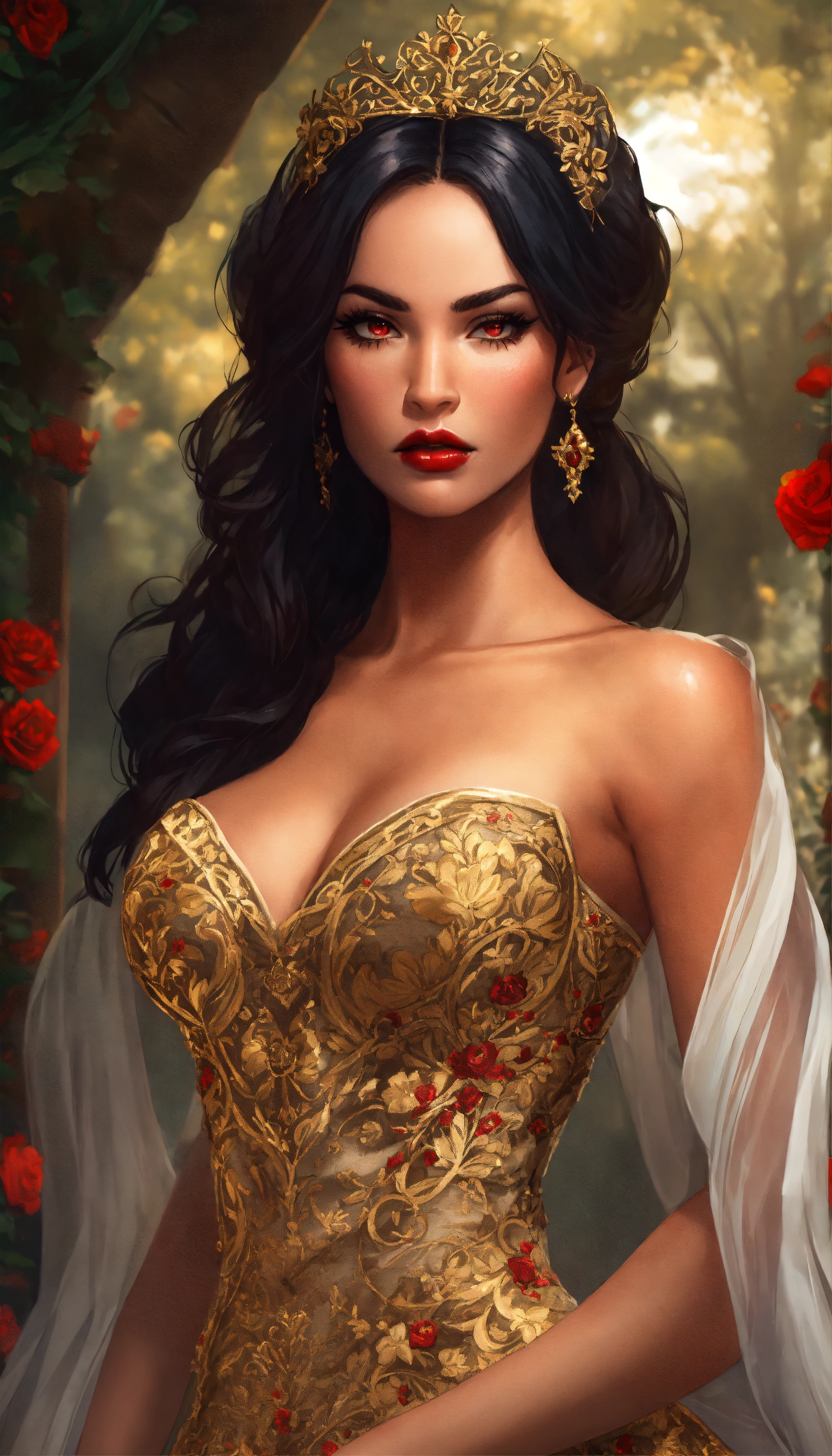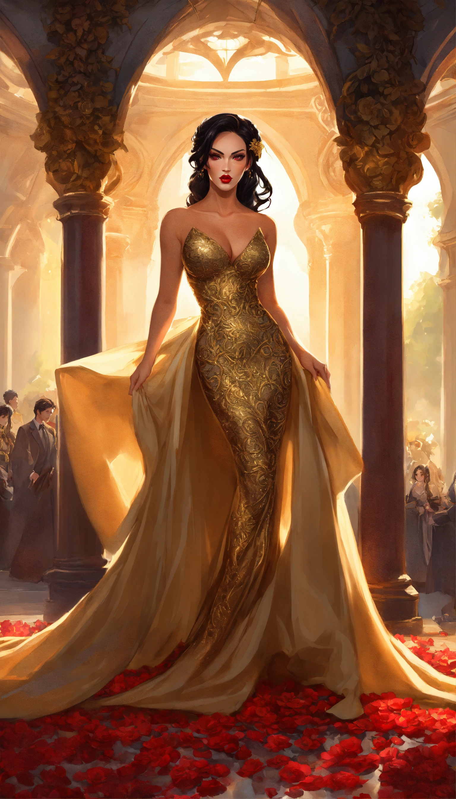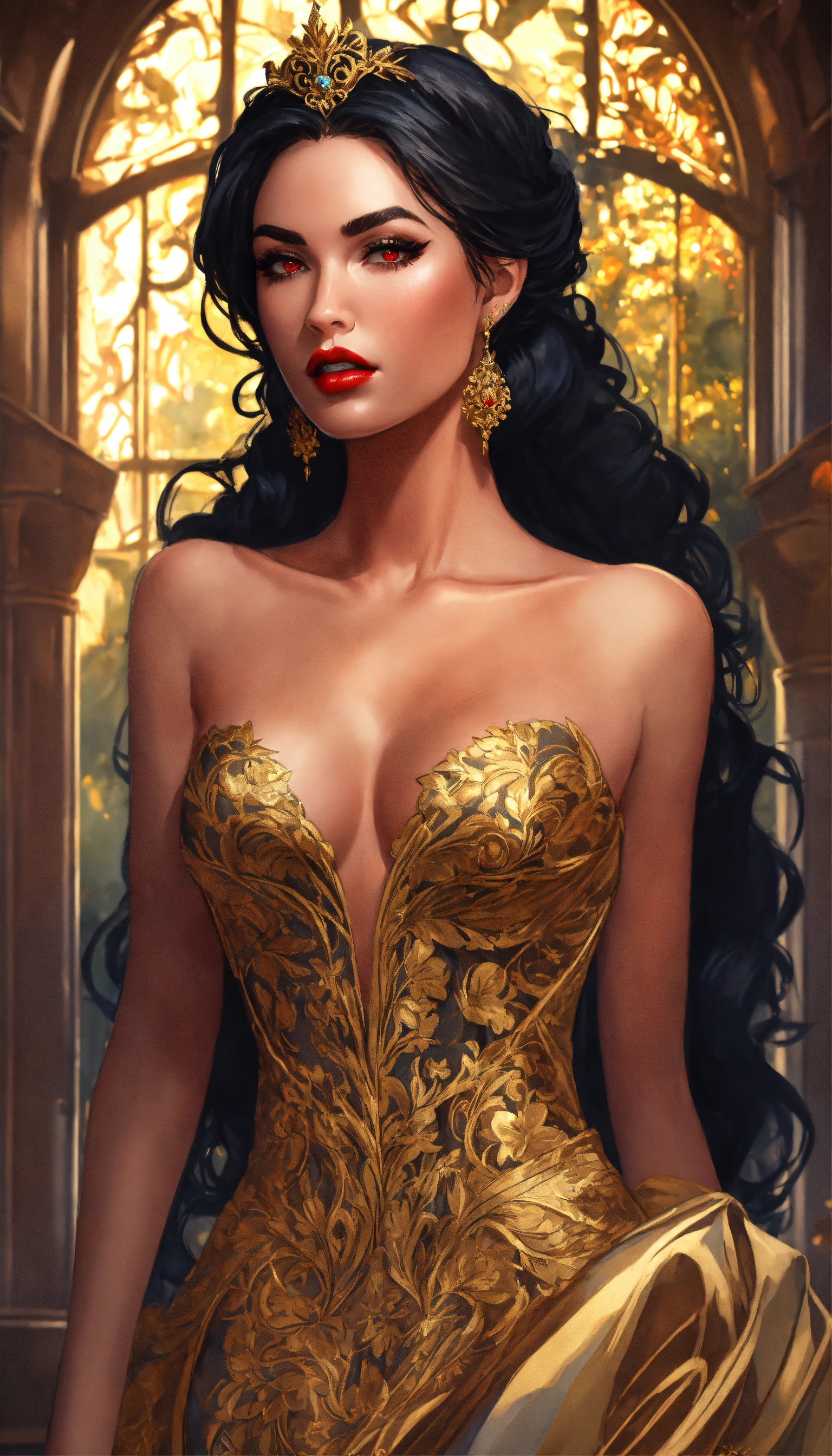 Concept art of ravenna, megan fox, glowing red eyes, curled voluminous flowing black hair in a formal wedding updo, hair in a bun, updo, bun, curled black hair tied up in a wedding bun, beautiful, tan skin, realistic, sabine rich, artgerm, j scott campbell, artgerm, perfect body, detailed, intricate, round face, slim nose, long black eyelashes, red lips, sharp jawline, perfect detailed face, realistic, gold veil, full body view, evil sorceress, dark sorceress, gloomy grey castle background, gloomy dark flowers forest castle, gold floor length tight fitted full skirts bridal gown, low cut neckline, gold high heels, voluminous curled long hair, gold long veil, gold wedding gown, very long transparent golden veil and hair tied up, golden fitted bridal gown, big voluminous long train full skirt gown, forest, yennefer, zuhair murad bridal, zuhair murad bridal ball gown, gold pattern textured shimmer fabric embroidered dress, extravagant gold long train wedding dress, walking, sleeves