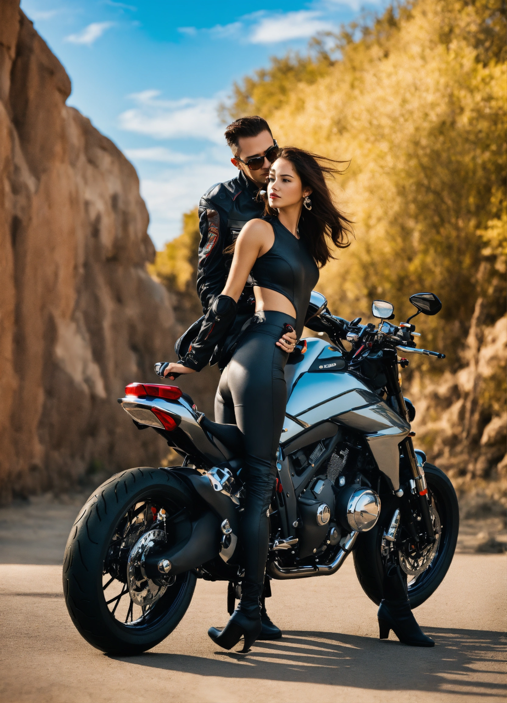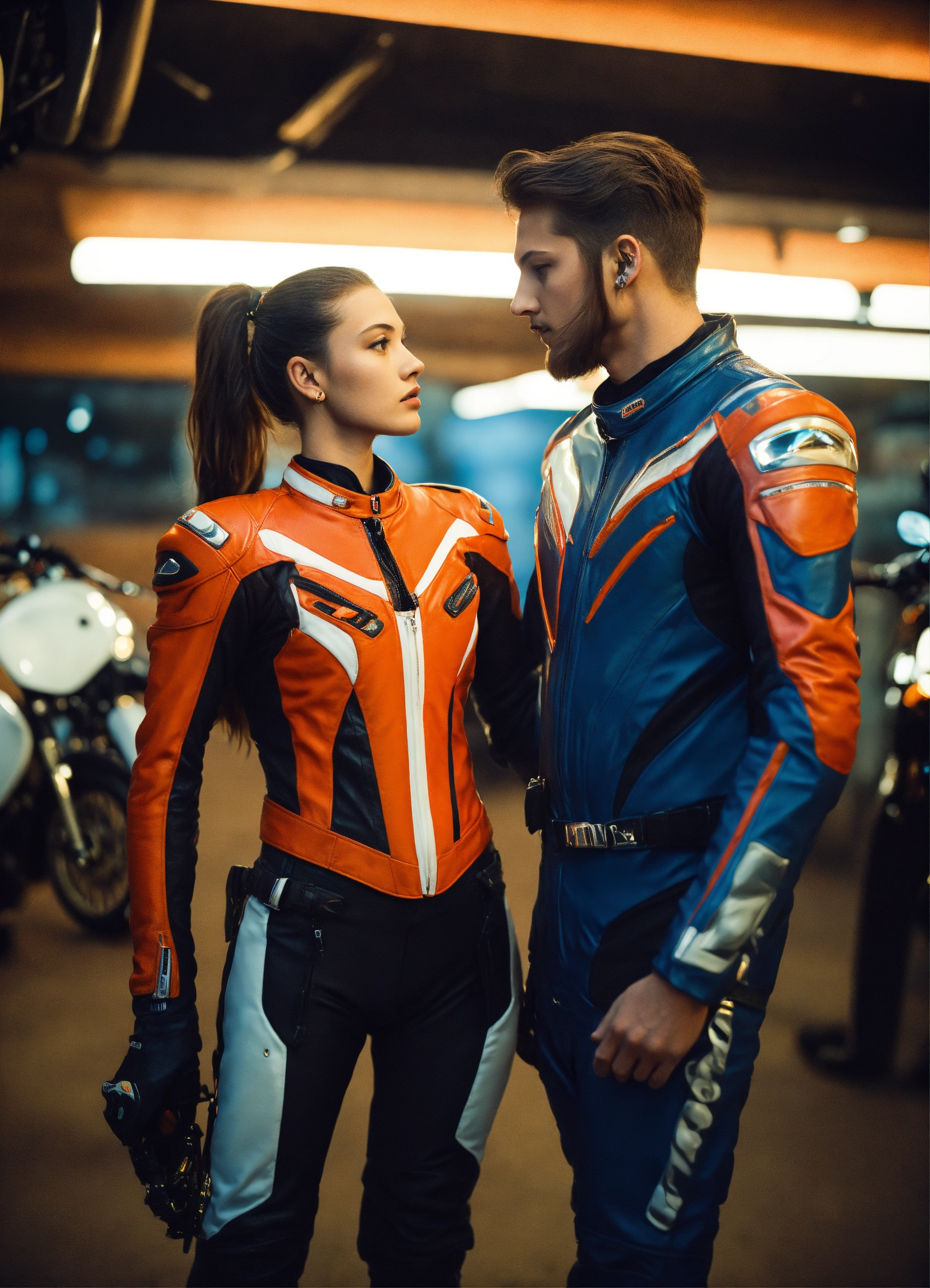 The man is tall, broad-shouldered, courageous, the girl is slender, beautiful, in a motorcycle suit. space