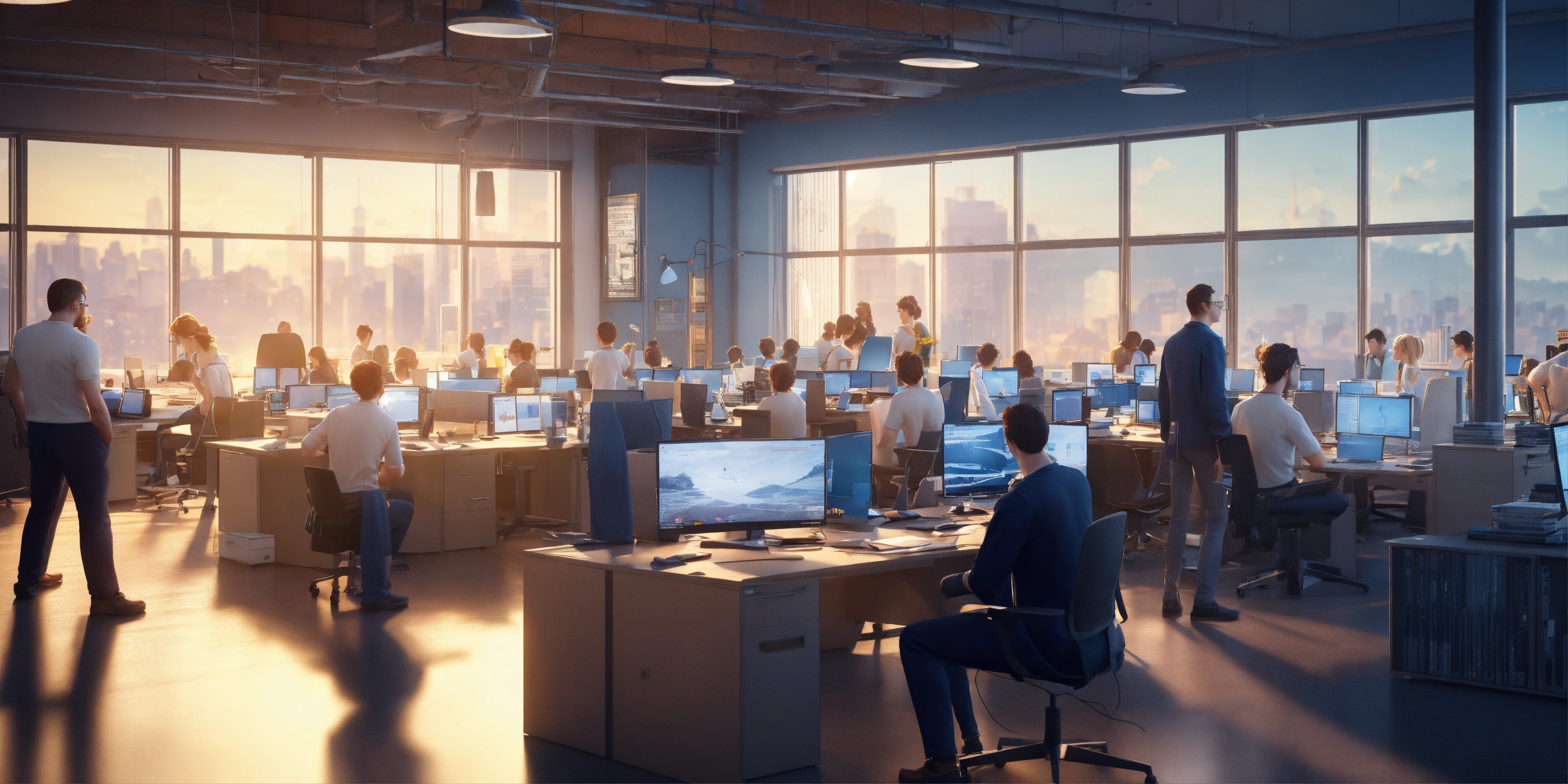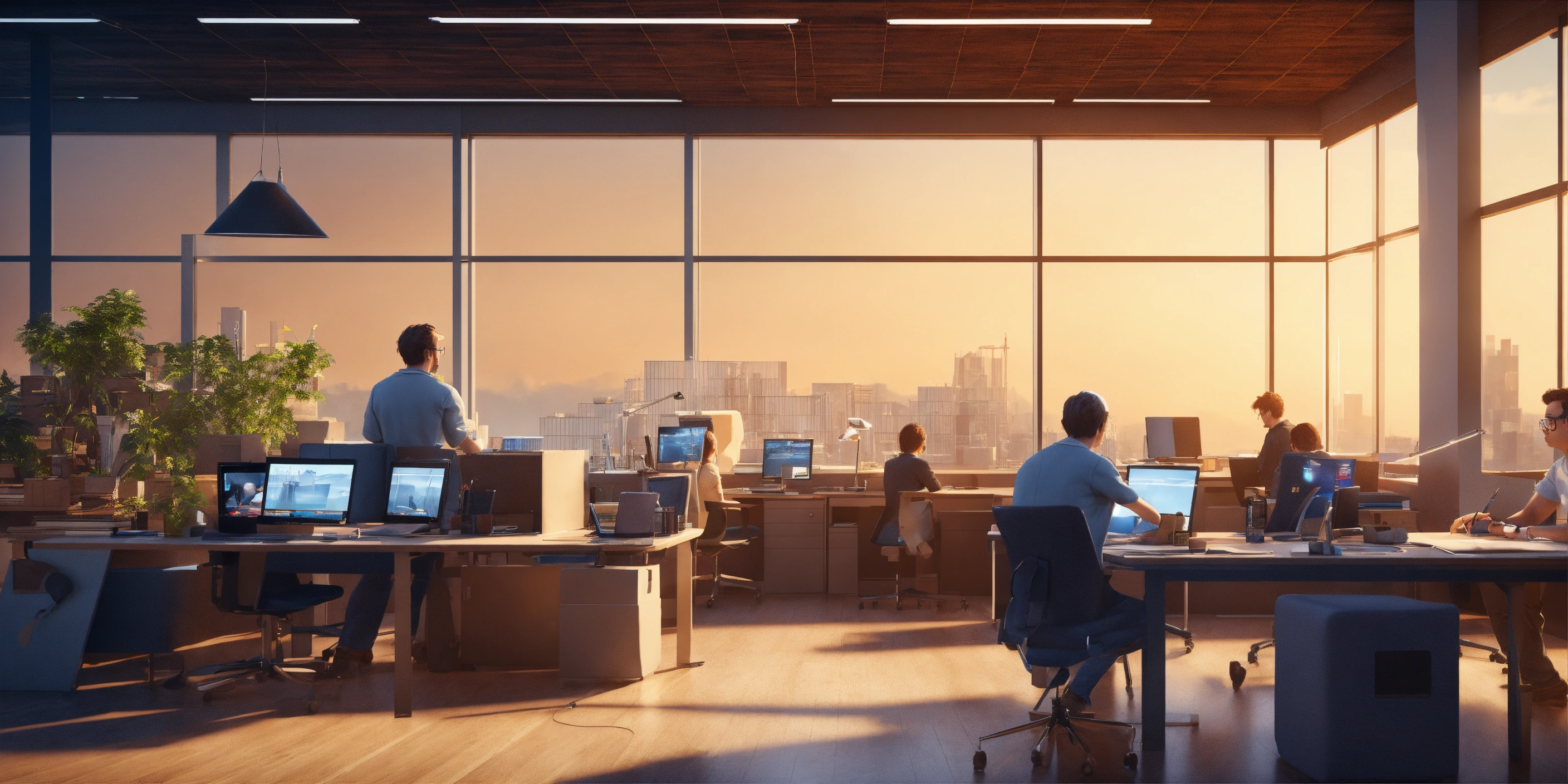 Office, many white people in glasses, dark blue jacket, white t-shirt, working developers, sitting on workplace, desk, coding, 3d render, pixar style, detailed digital art, stylized 3d render, c4d, full height, high quality, ((highly detailed)), composition, masterpiece, ((panoramic view)), ((many people)), side view, 0.5 mm, artstation, wide angle, low angle, solid background