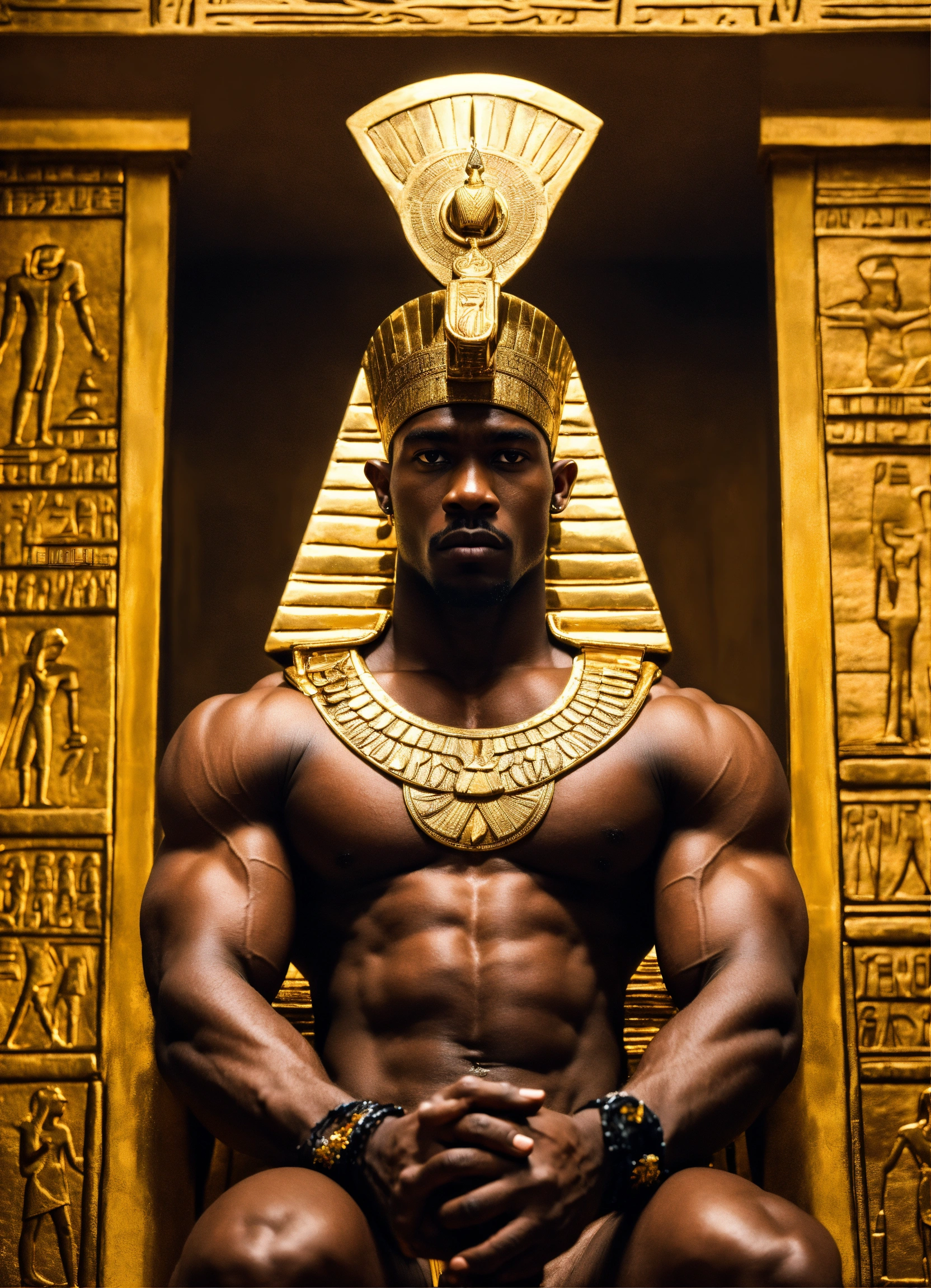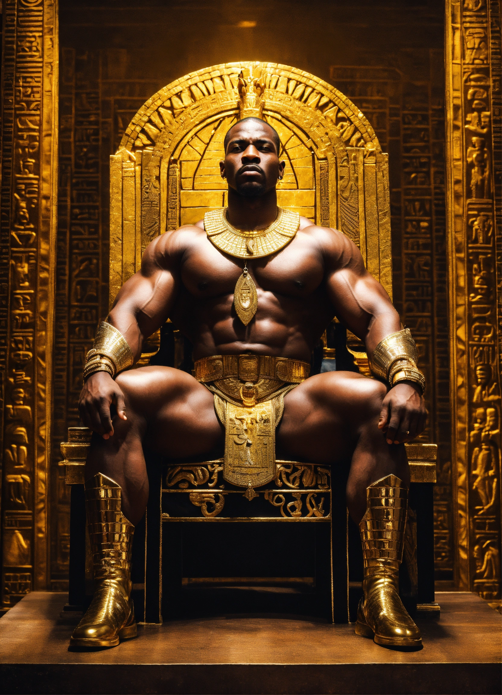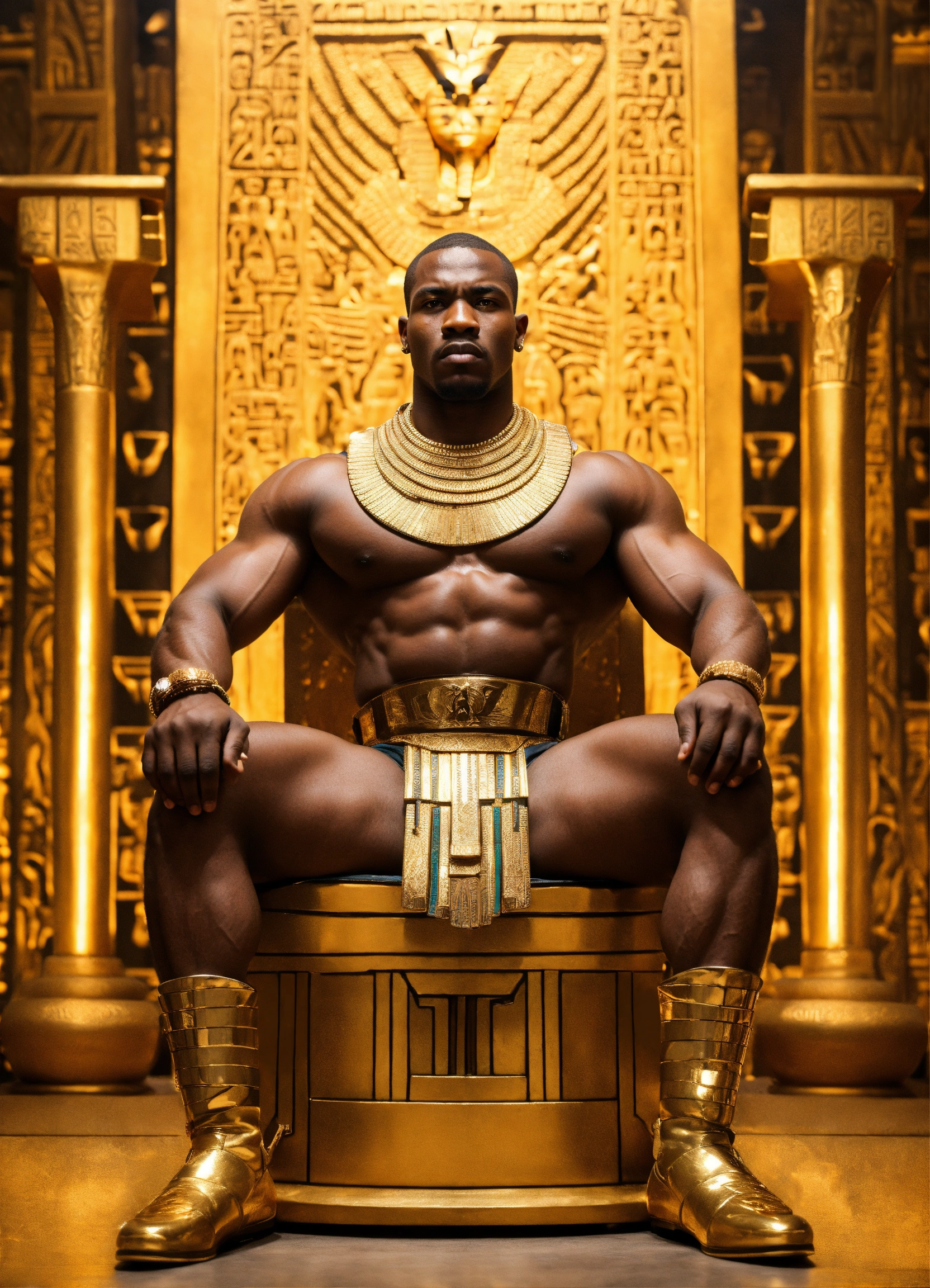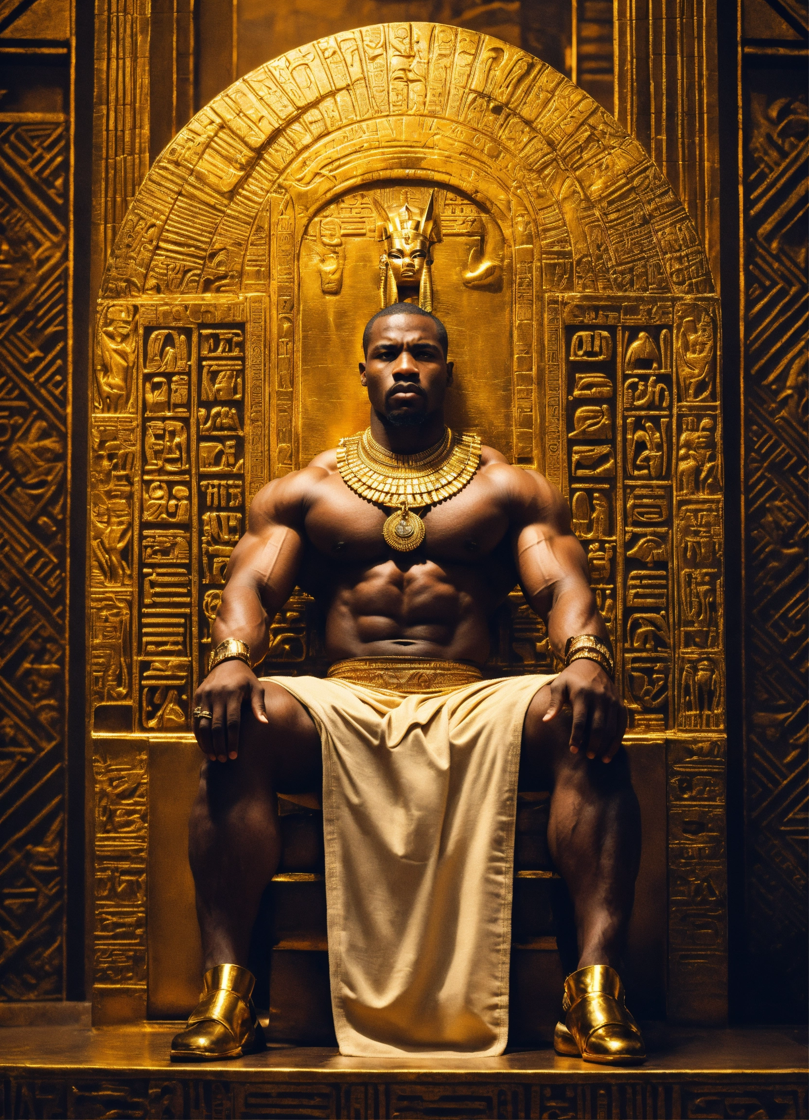 A symmetrical huge bodybuilder close-up of an african male egyptian pharaoh with a buzzcut, dark-skin, with a powerful look to him, and a calculating expression, sitting on a golden throne with his hands up contemplating.