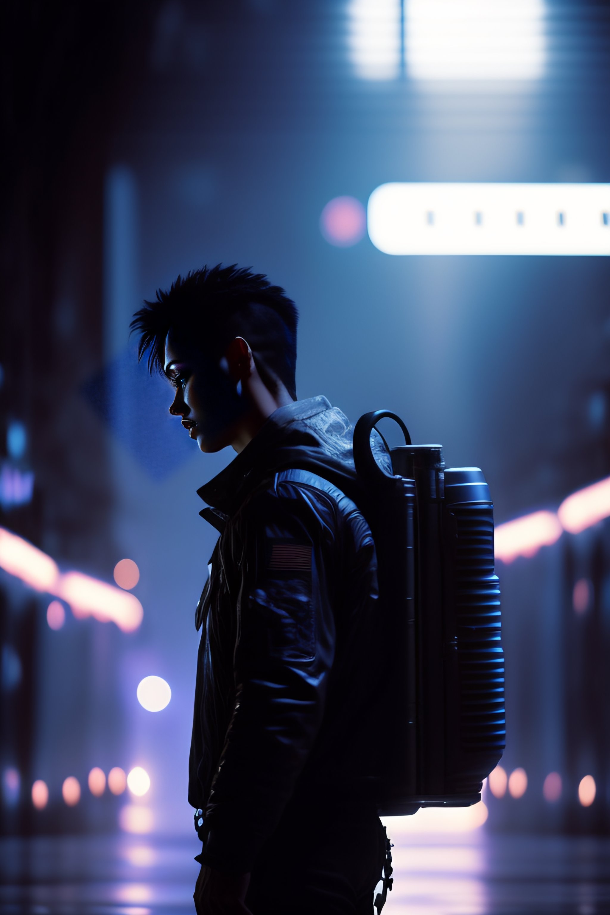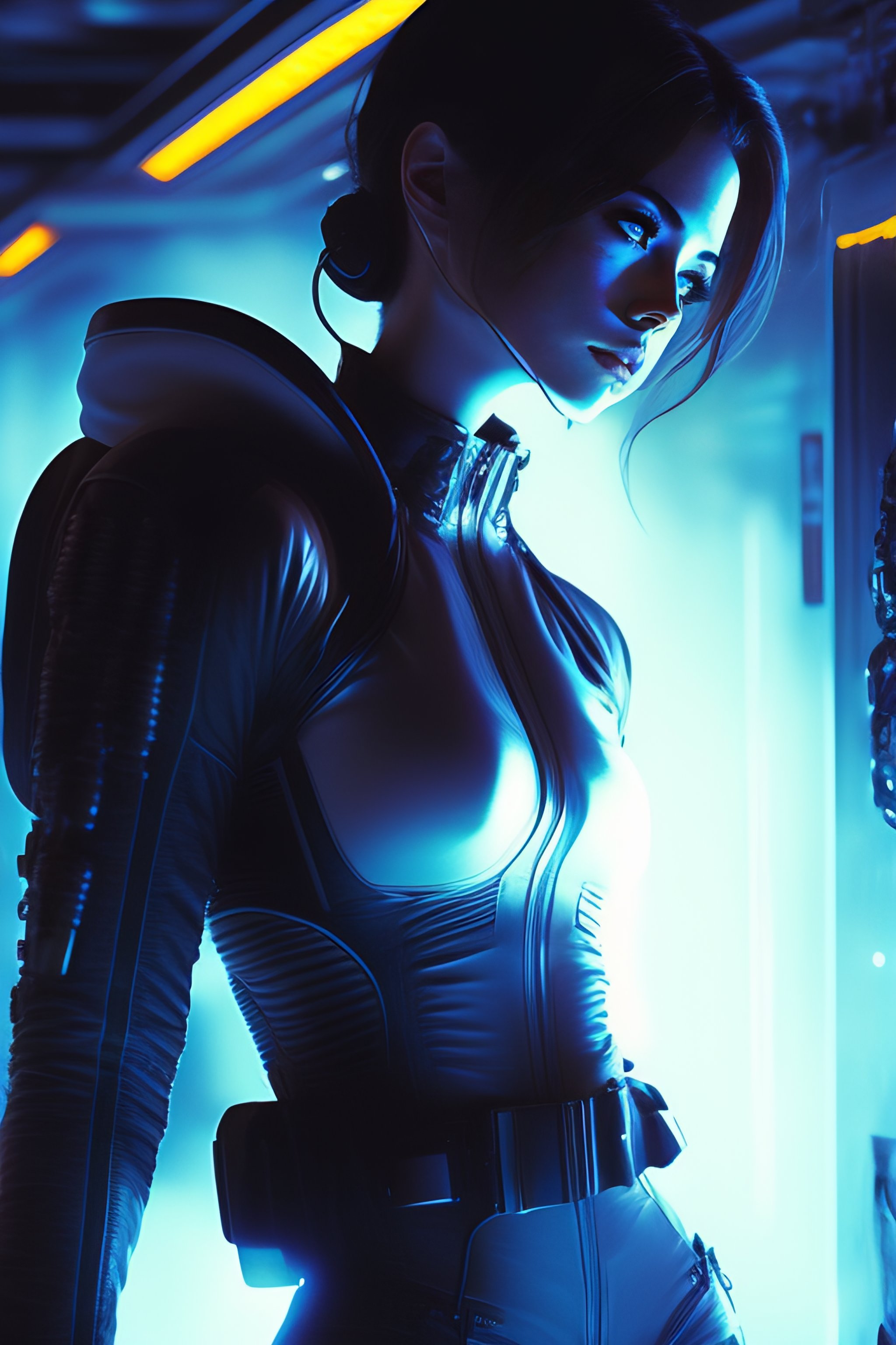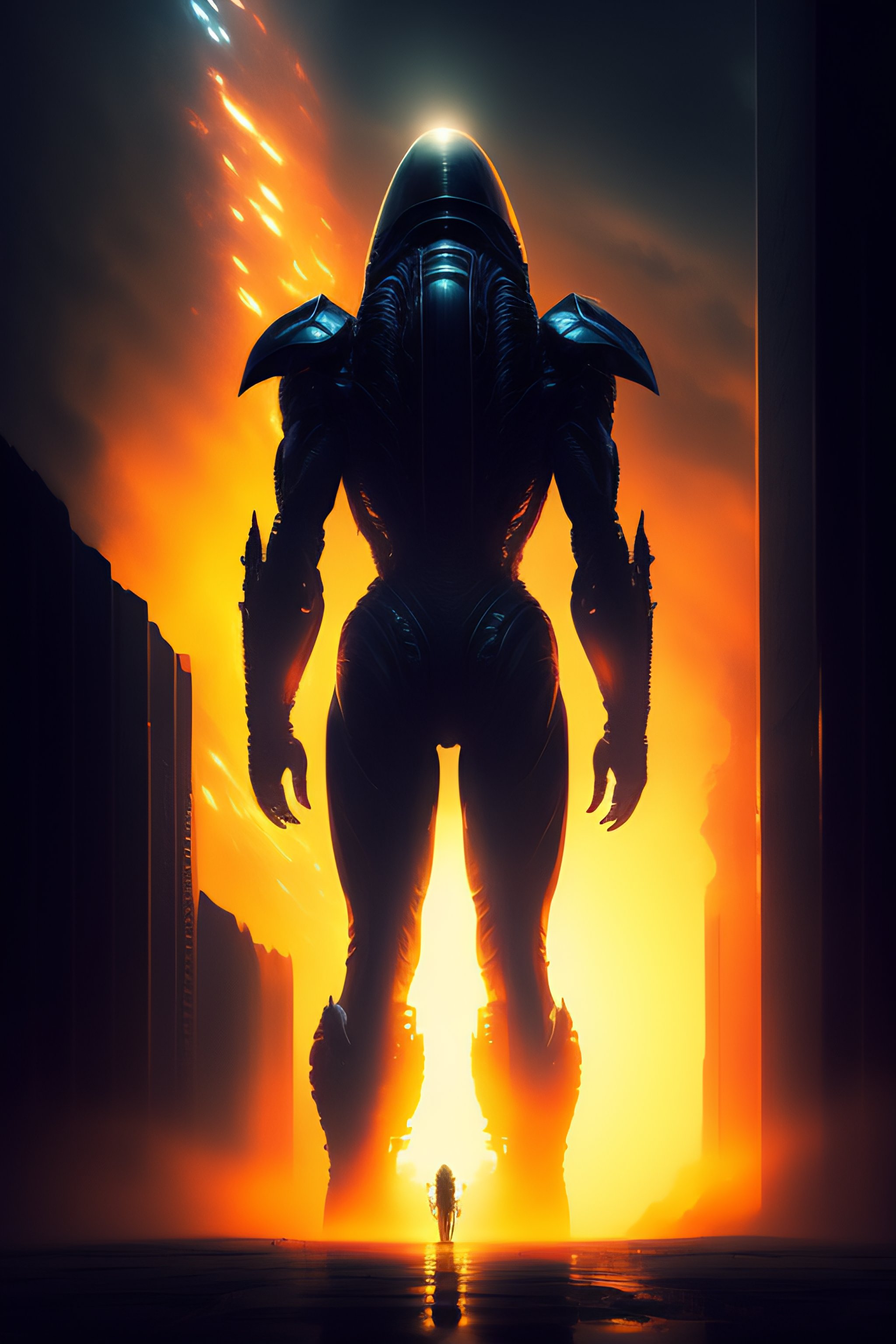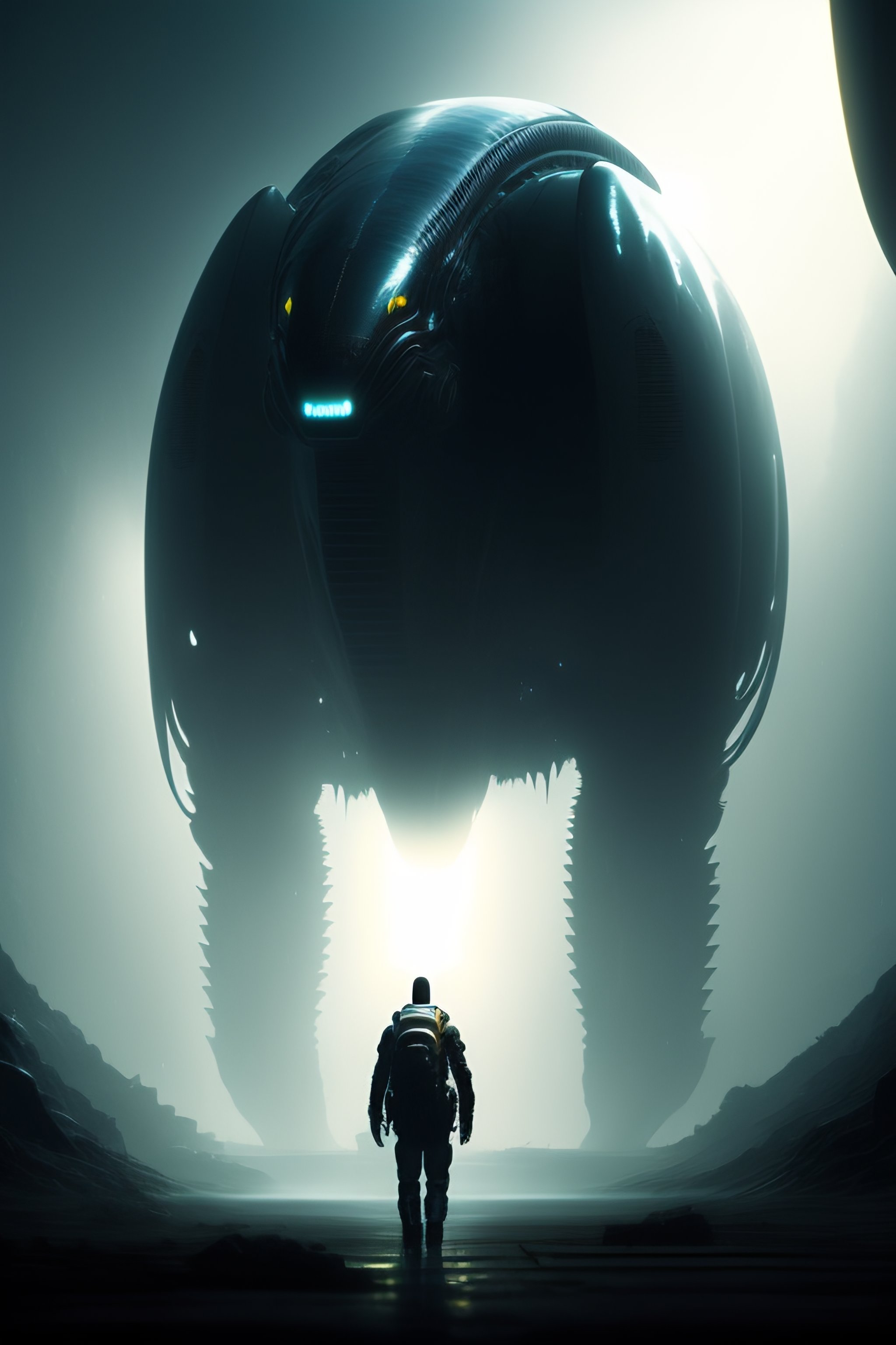 Alien, full body cinematic style digital art render, moody atmospheric lighting, techno horror, dangerous, art by yoshiyuki sadamoto and matt banning, batt, directed by roger deakins