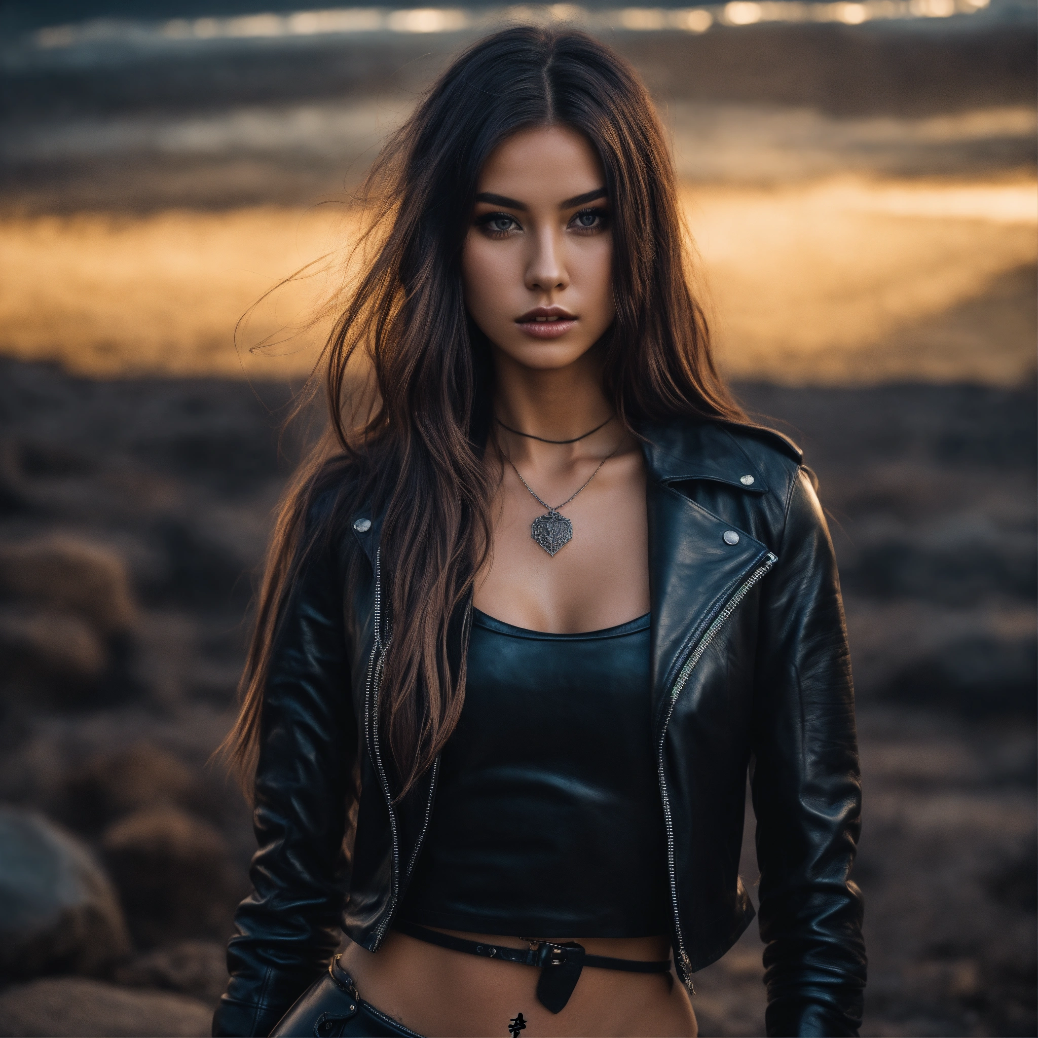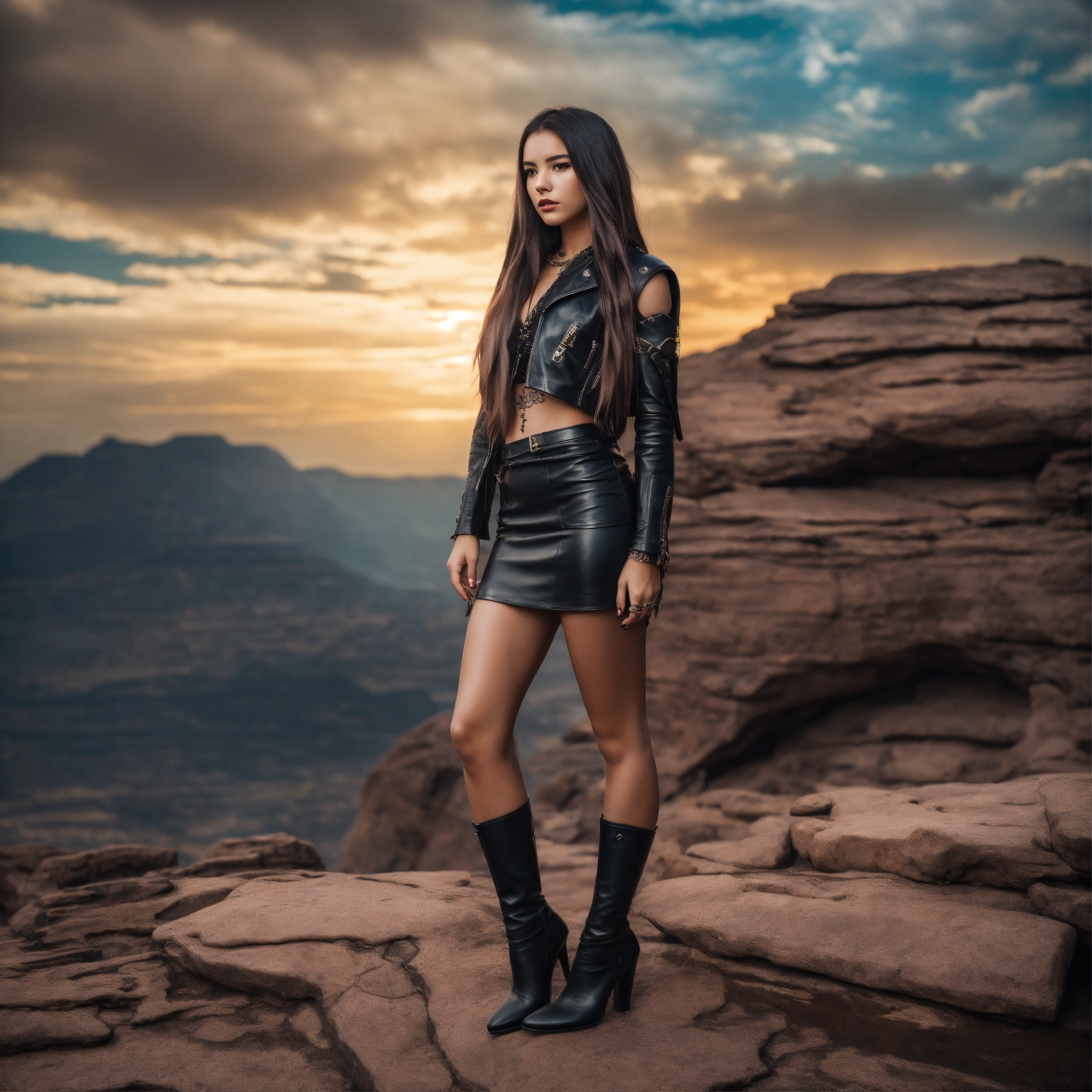 Beautiful rock model young girl in fantasy world, wearing black leather topic, short leather skirt, tatoo, hypnotizing, long hair, fit full body, 8k, dramatic light, super sharp