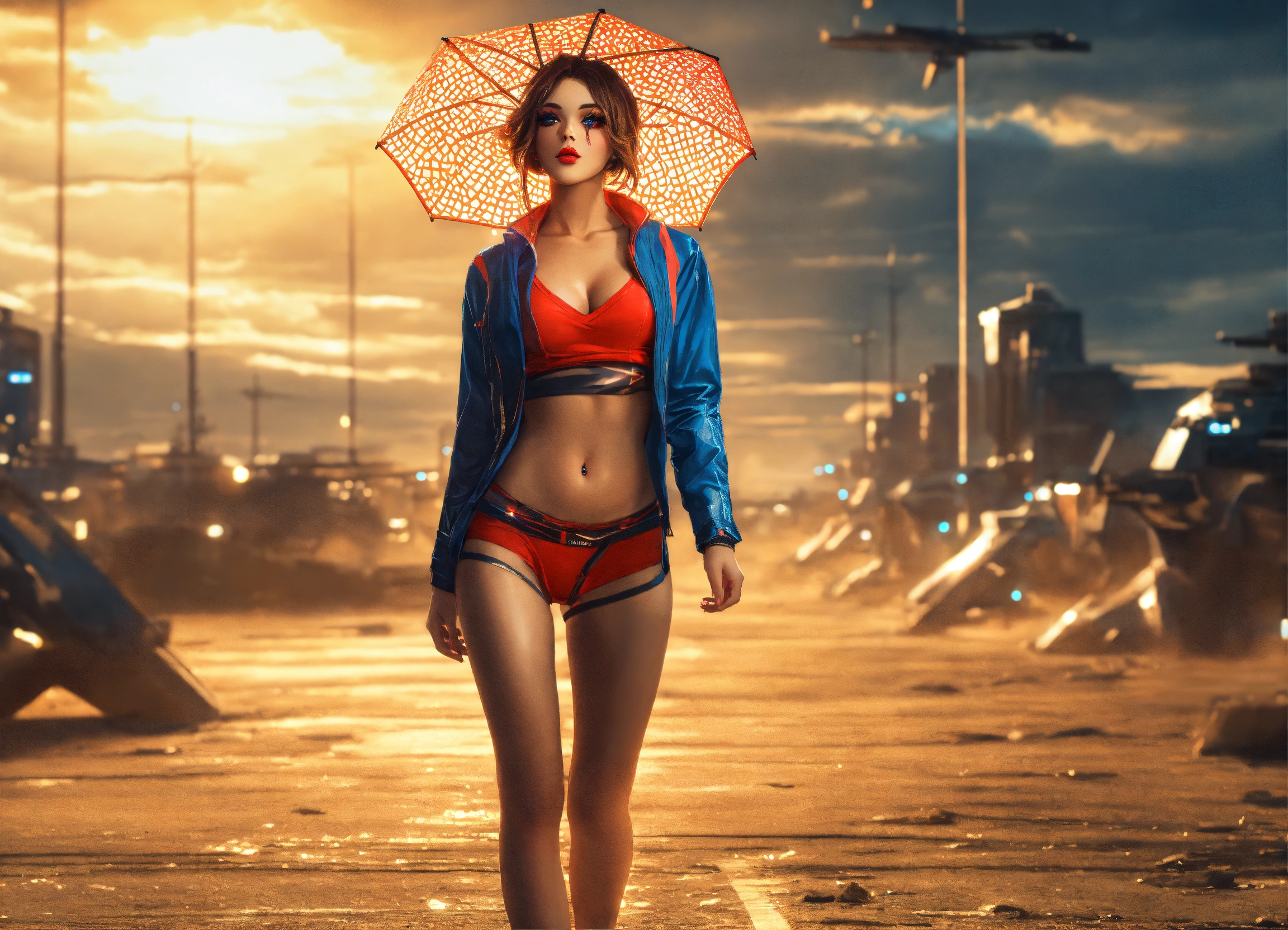 Full body, photo, sci-fi dream girl, futuristic, sunny weather, open shirt, wearing underwaee, 8k, extreme make-up, storm
