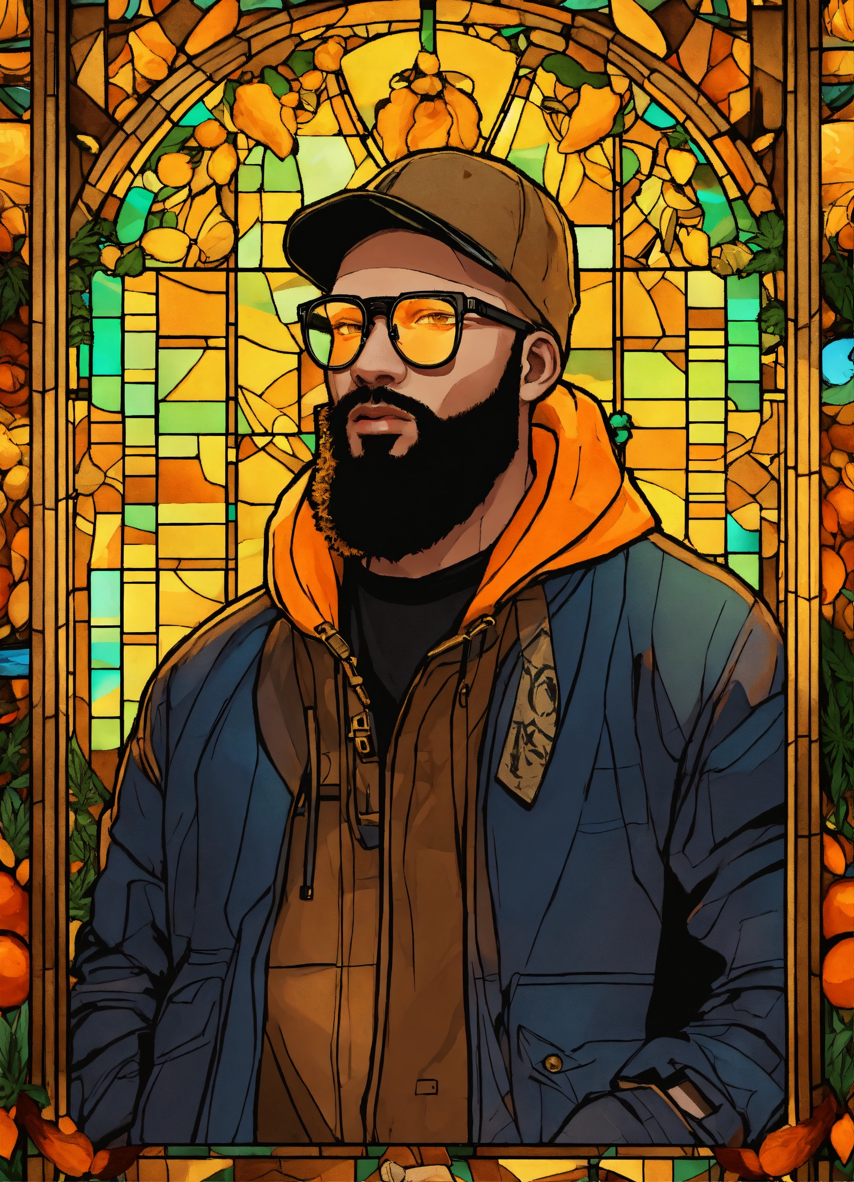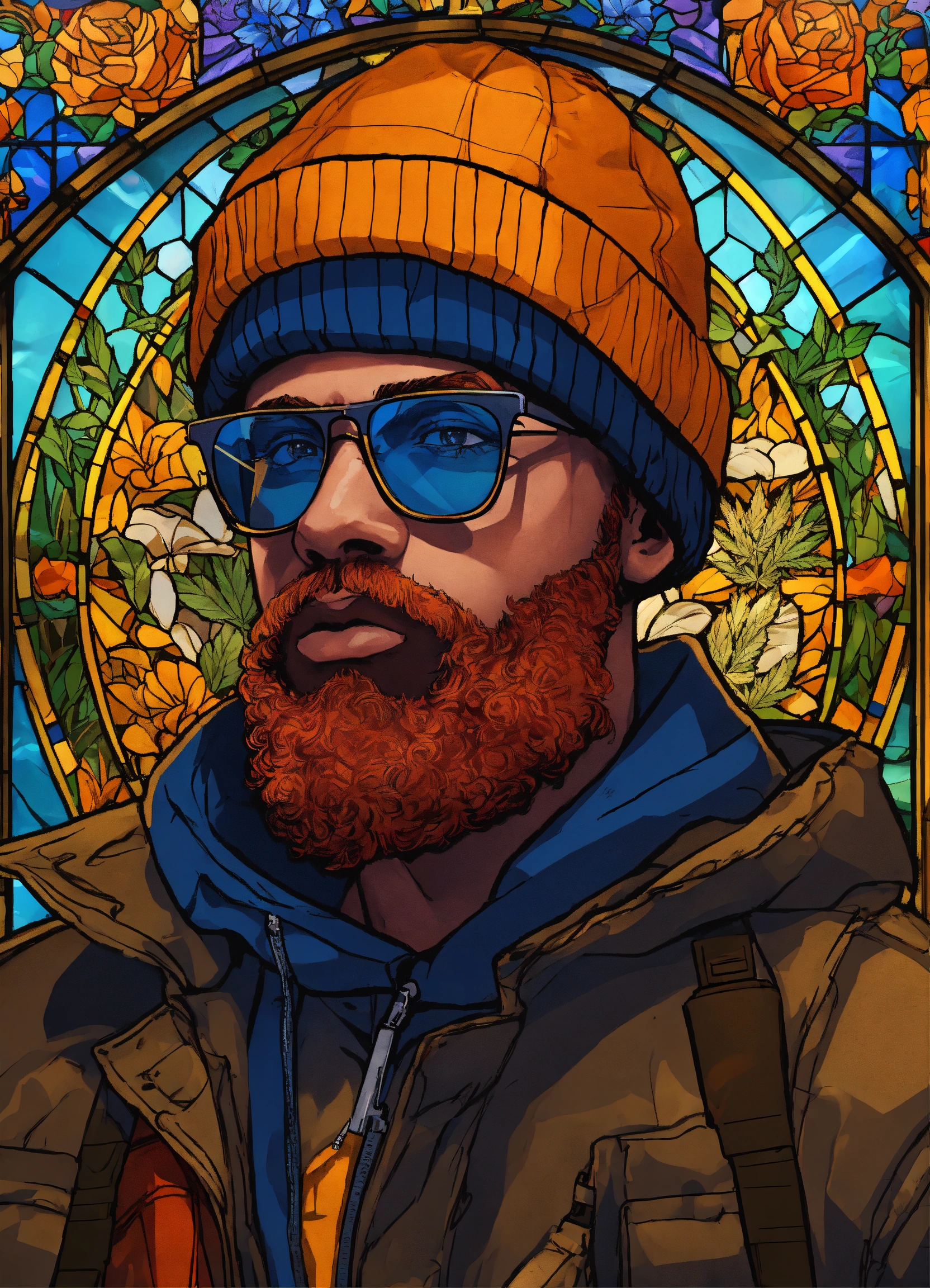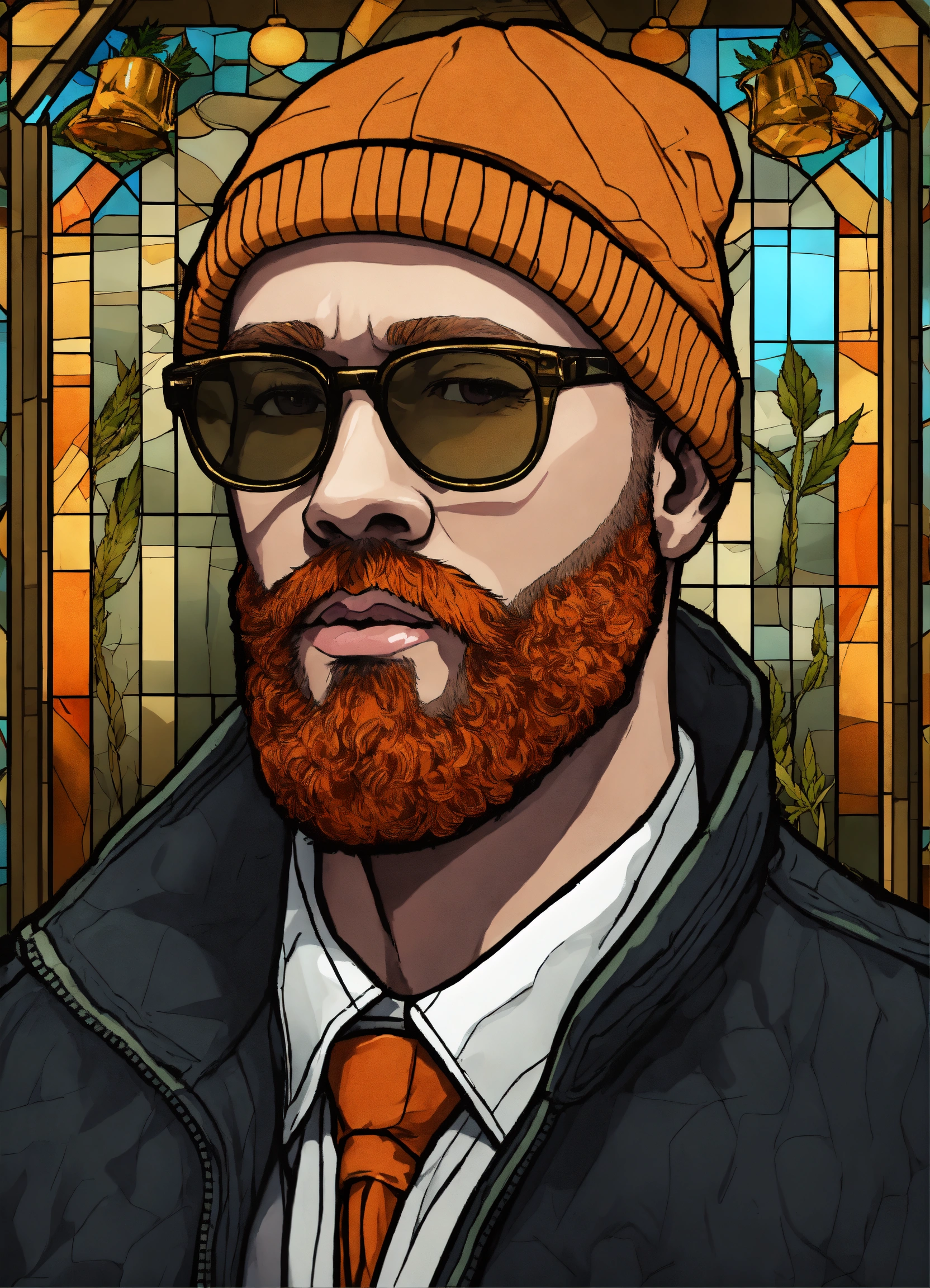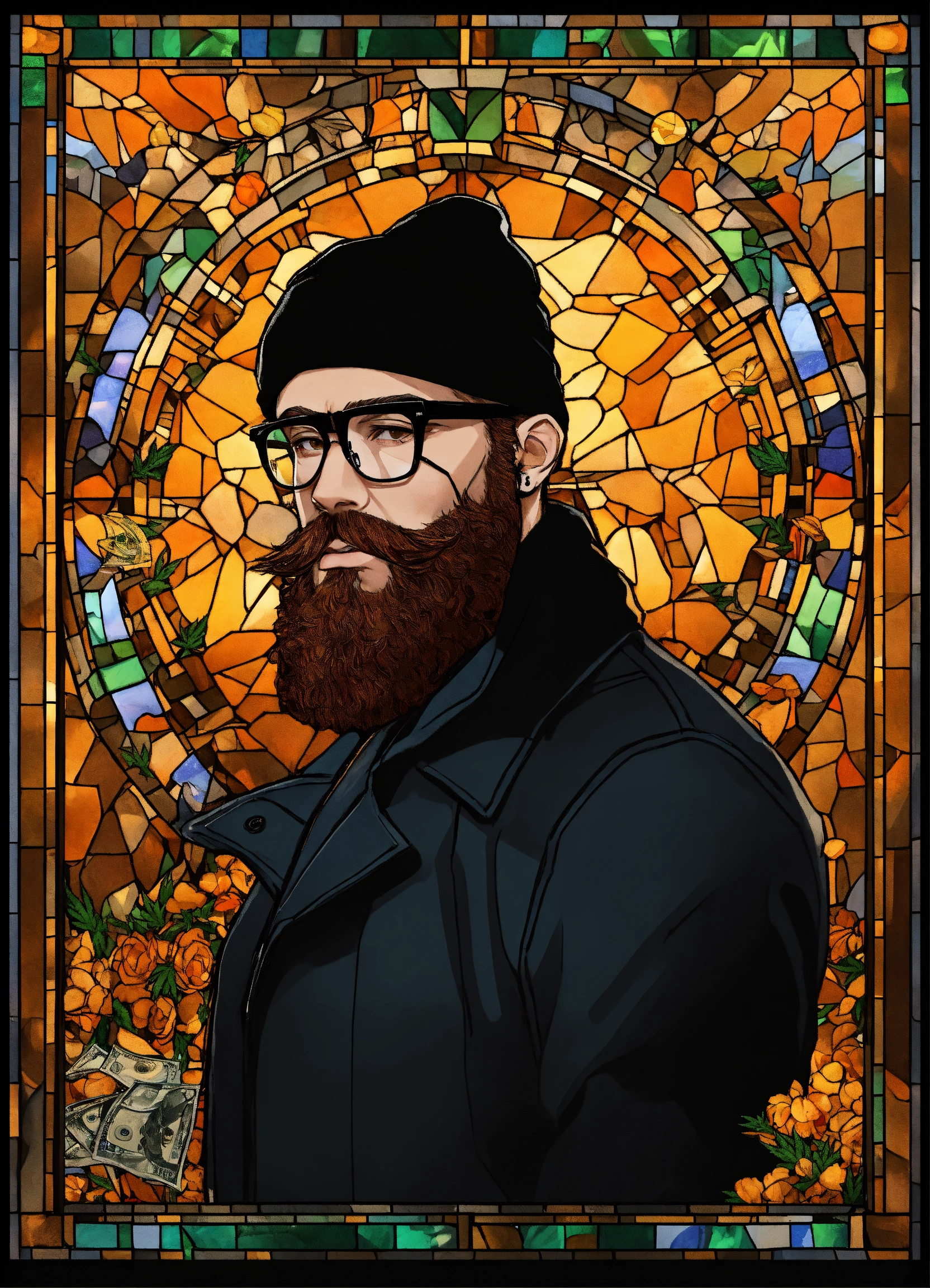Hd, 4k, background is a stained glass with images in the stained glass of tap rapper type images (guns & bullets, cough syrup, cash, weed, etc), the rapper os a caucasian man with a orange colored beard. black beanie on his head. gold framed glasses with clear lenses. light brown peacoat on.