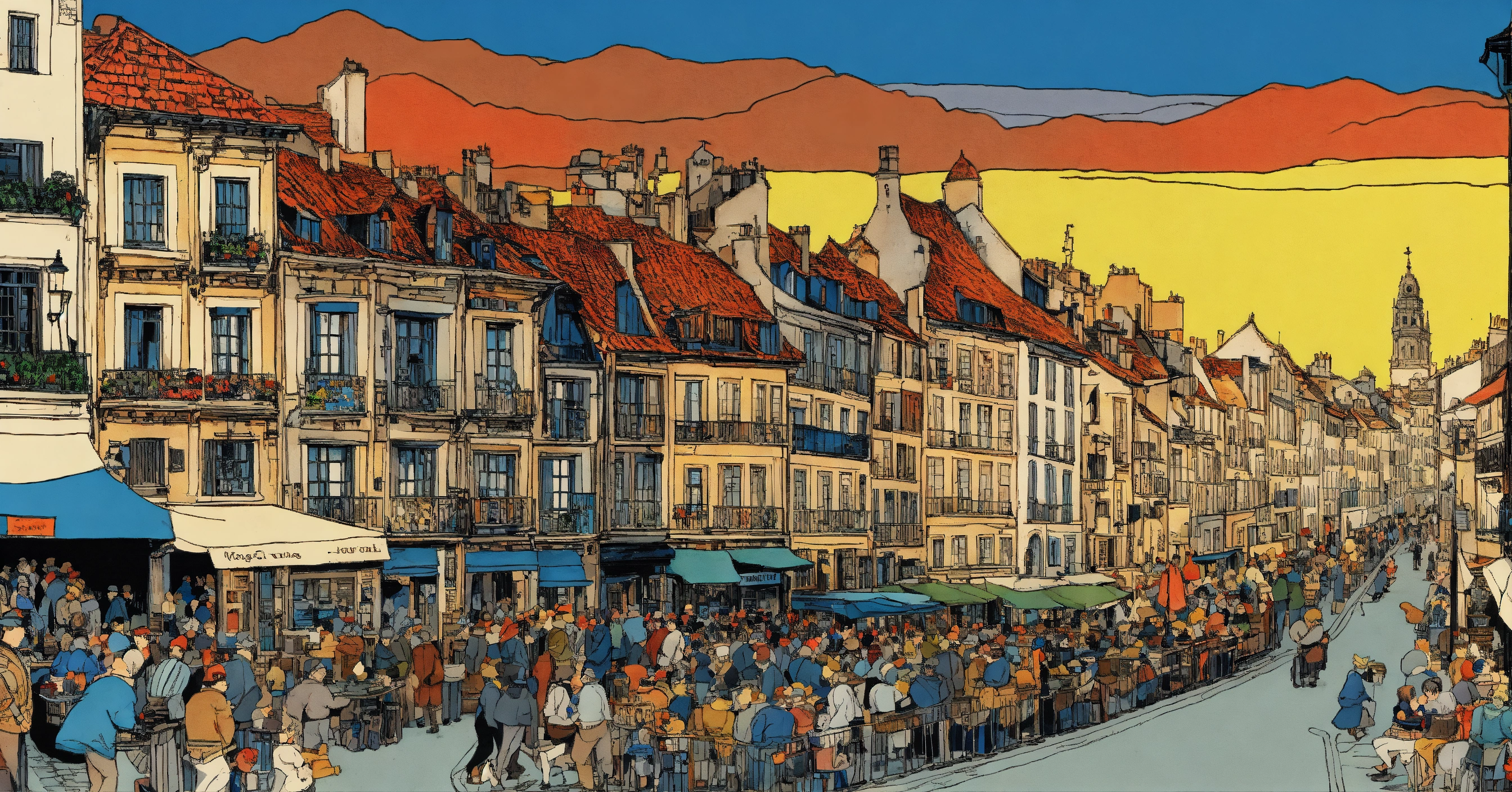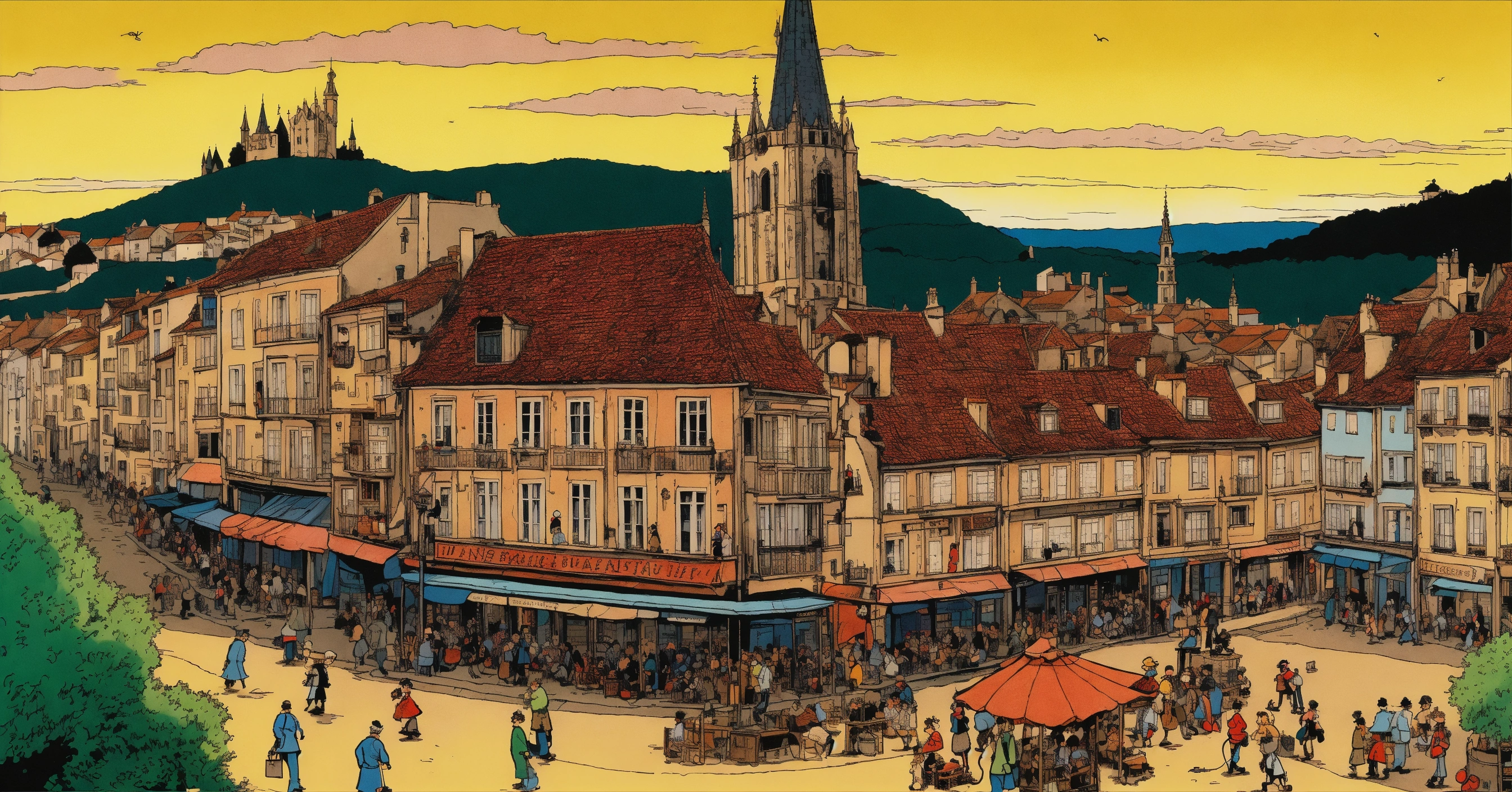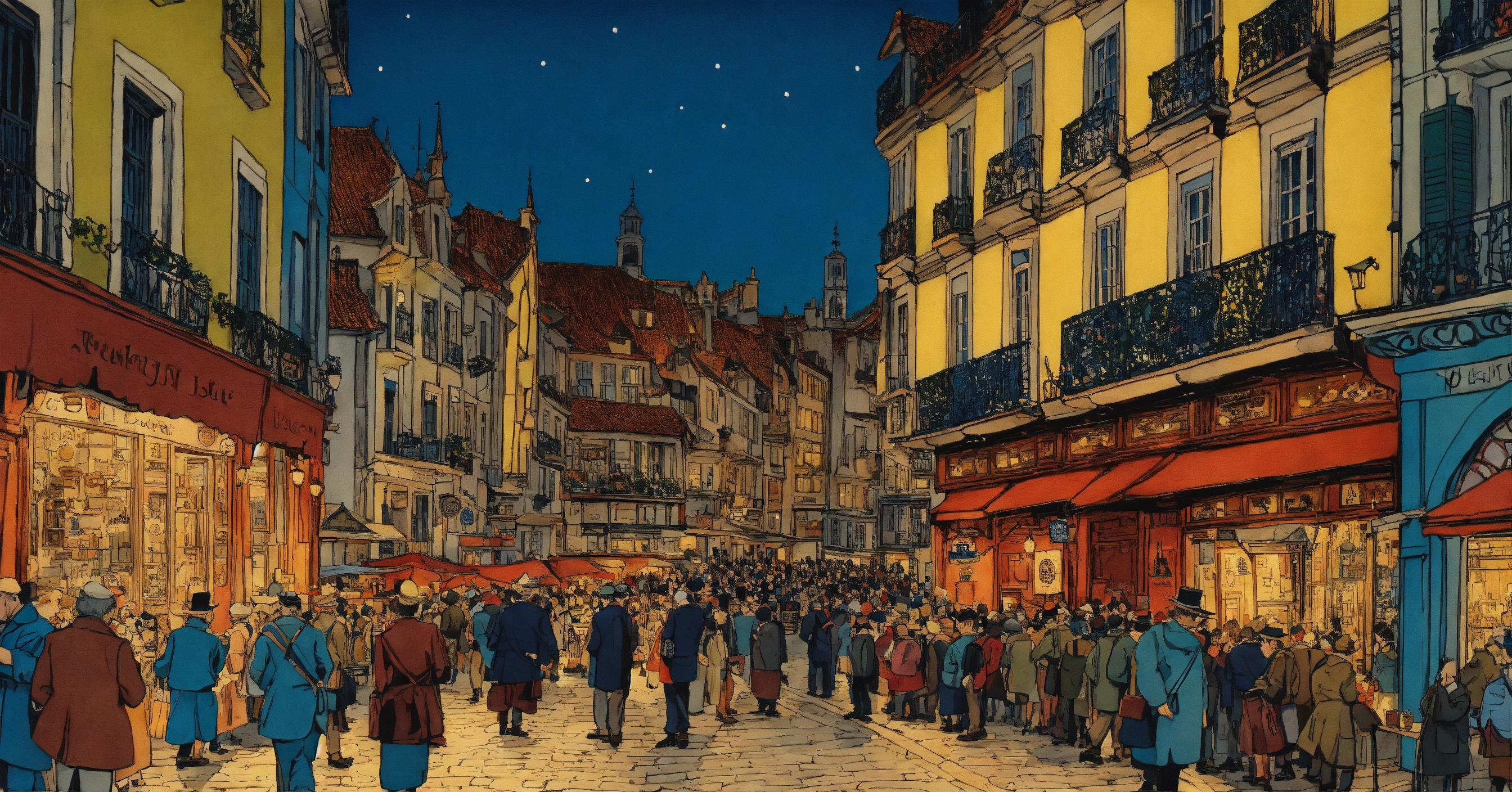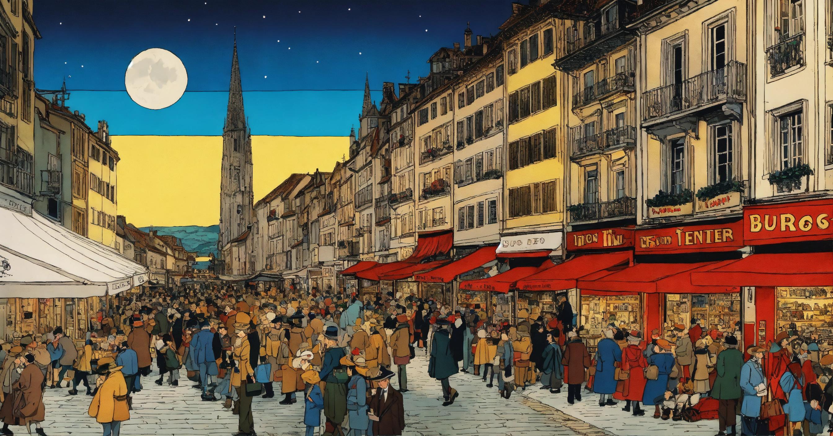 Detailed pen and ink illustration of historic tenter of burgos, by herge, in the style of tin-tin comics, vibrant colors, detailed, lots of people, night time, lots of people